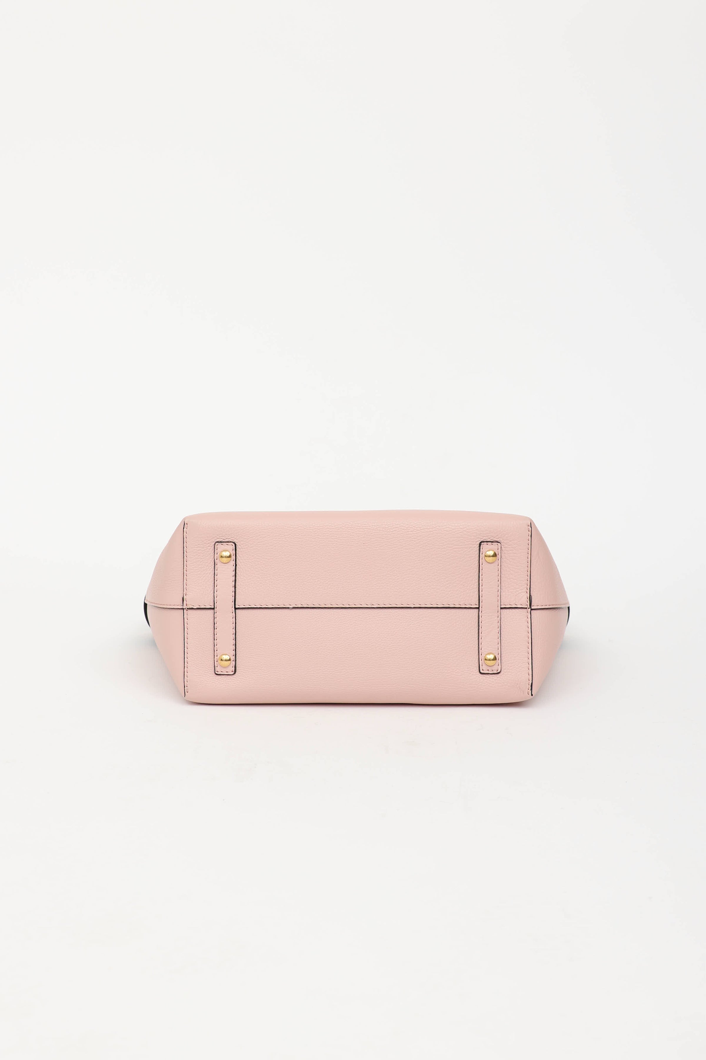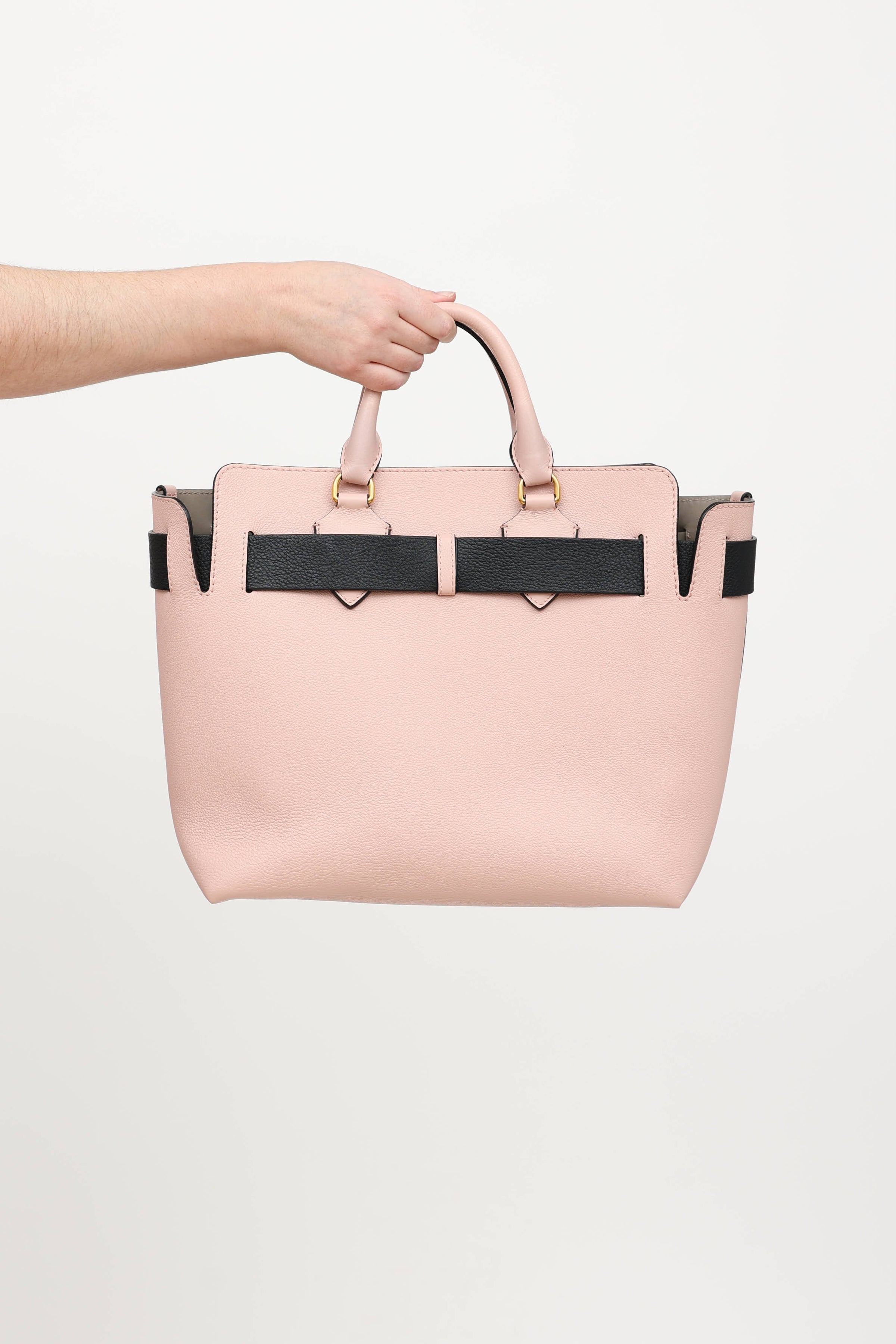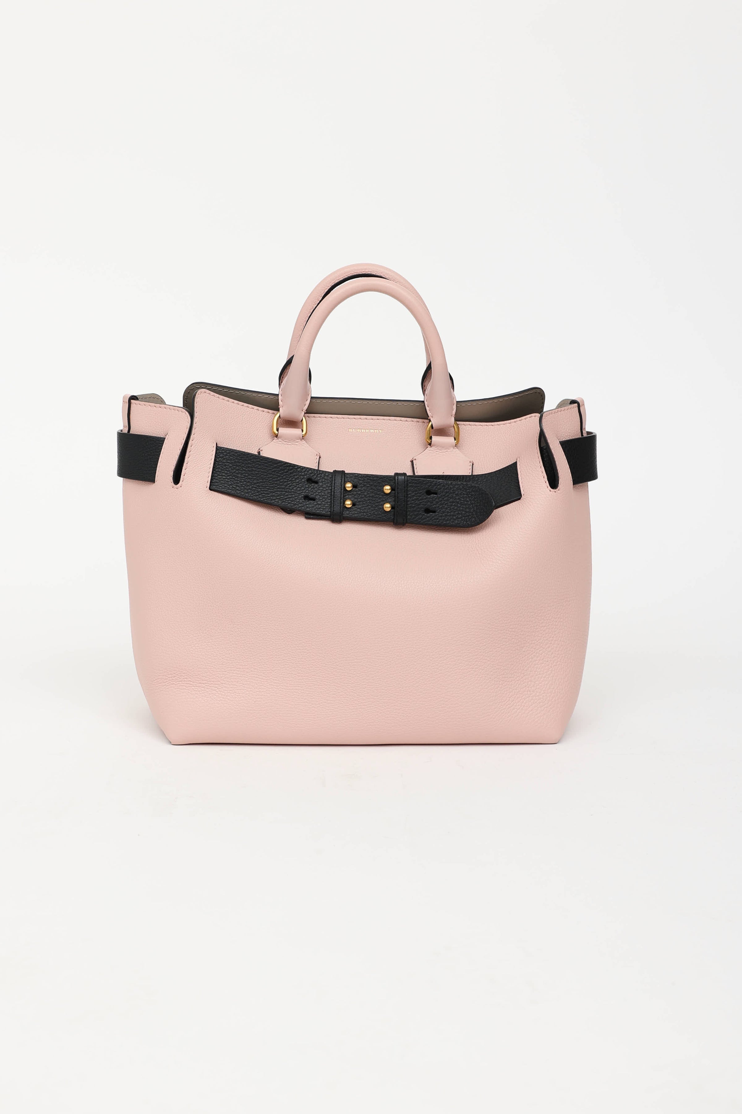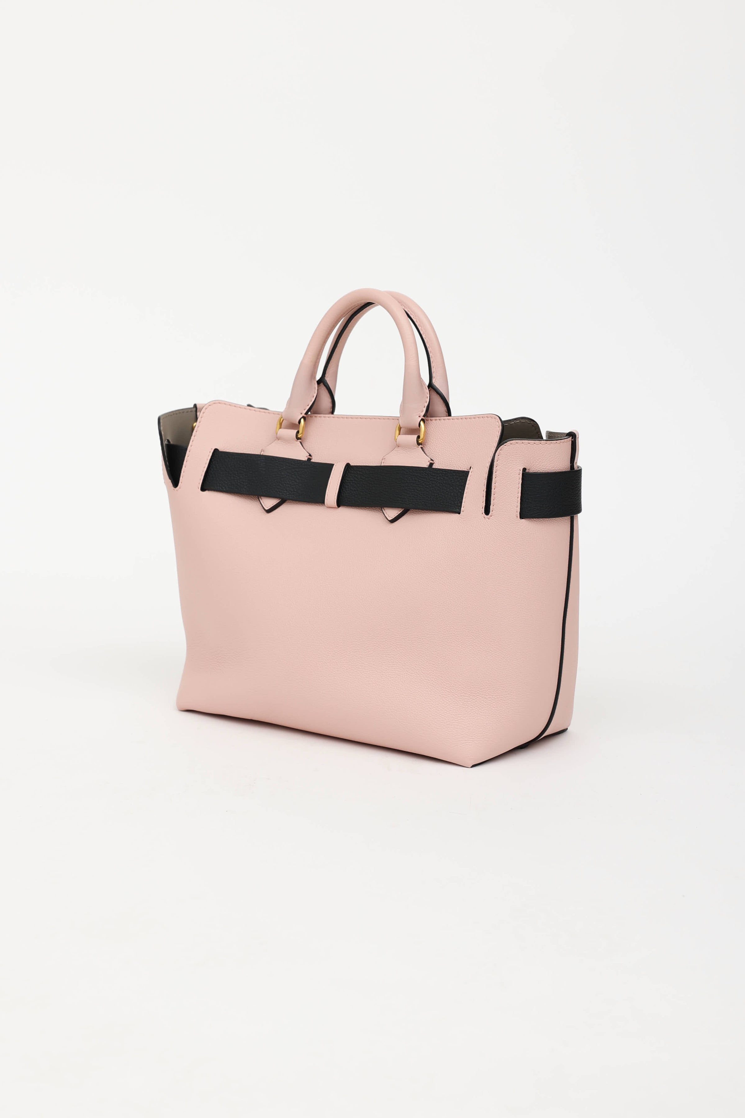 Pre-owned Burberry pink and black Marias belt bag featuring dual rolled top handle, gold tone hardware, interchangeable pink and black adjustable belt, structured base with metal feet, detachable crossbody strap, open top with one main compartment, and two slip pockets.