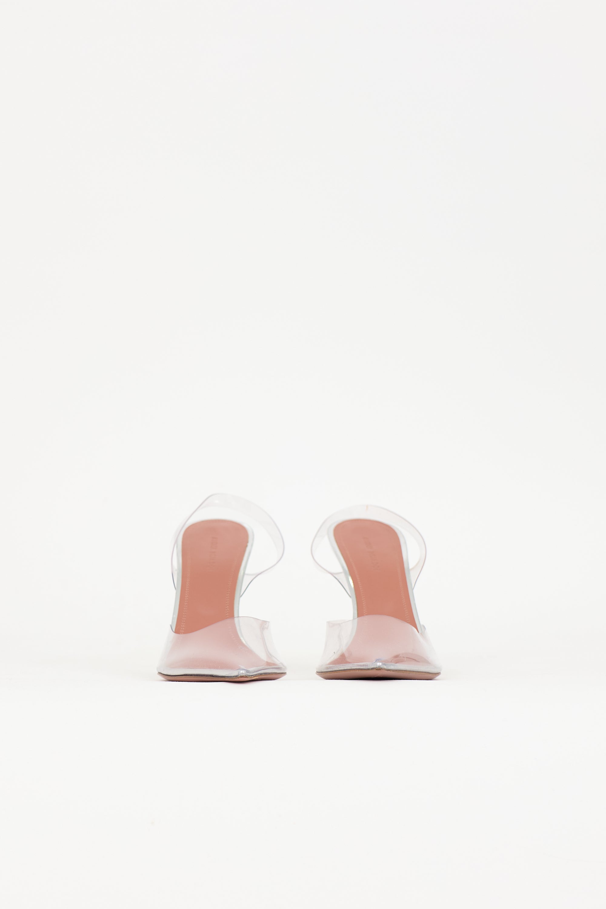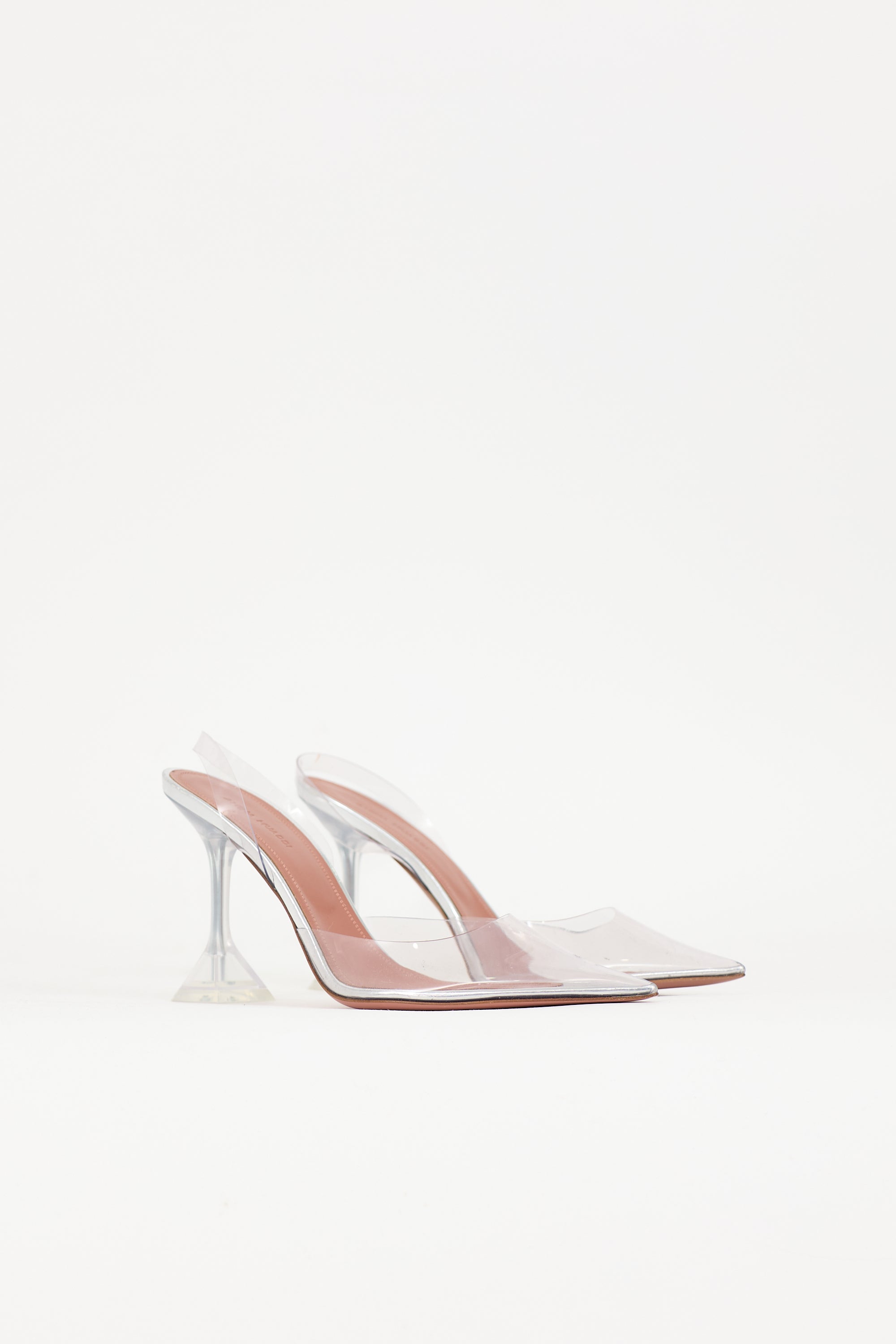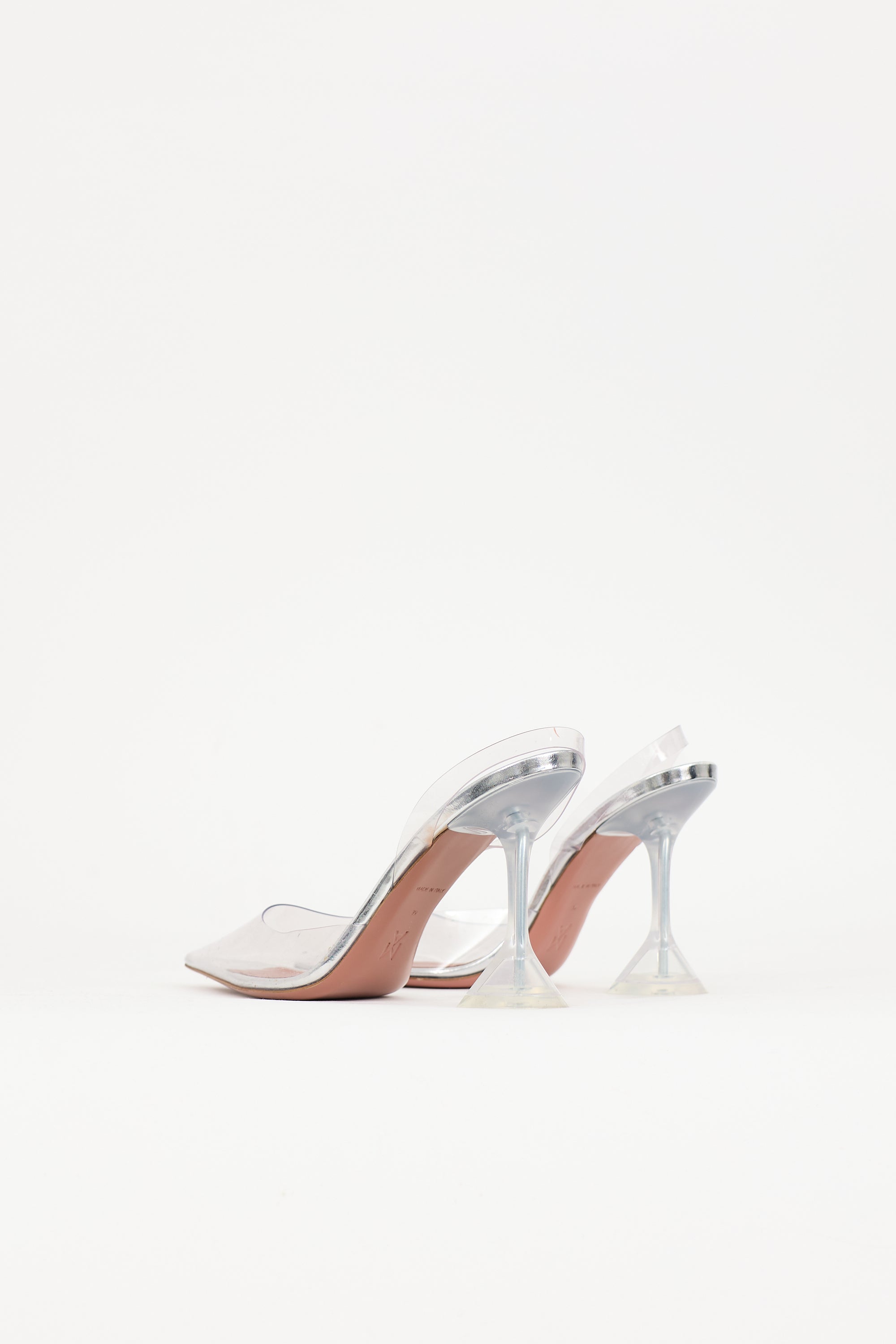 Pre-owned Amina Muaddi silver leather and clear PVC Holli heels featuring pointed toe, slingback strap, and martini heel. Includes original dust bag.