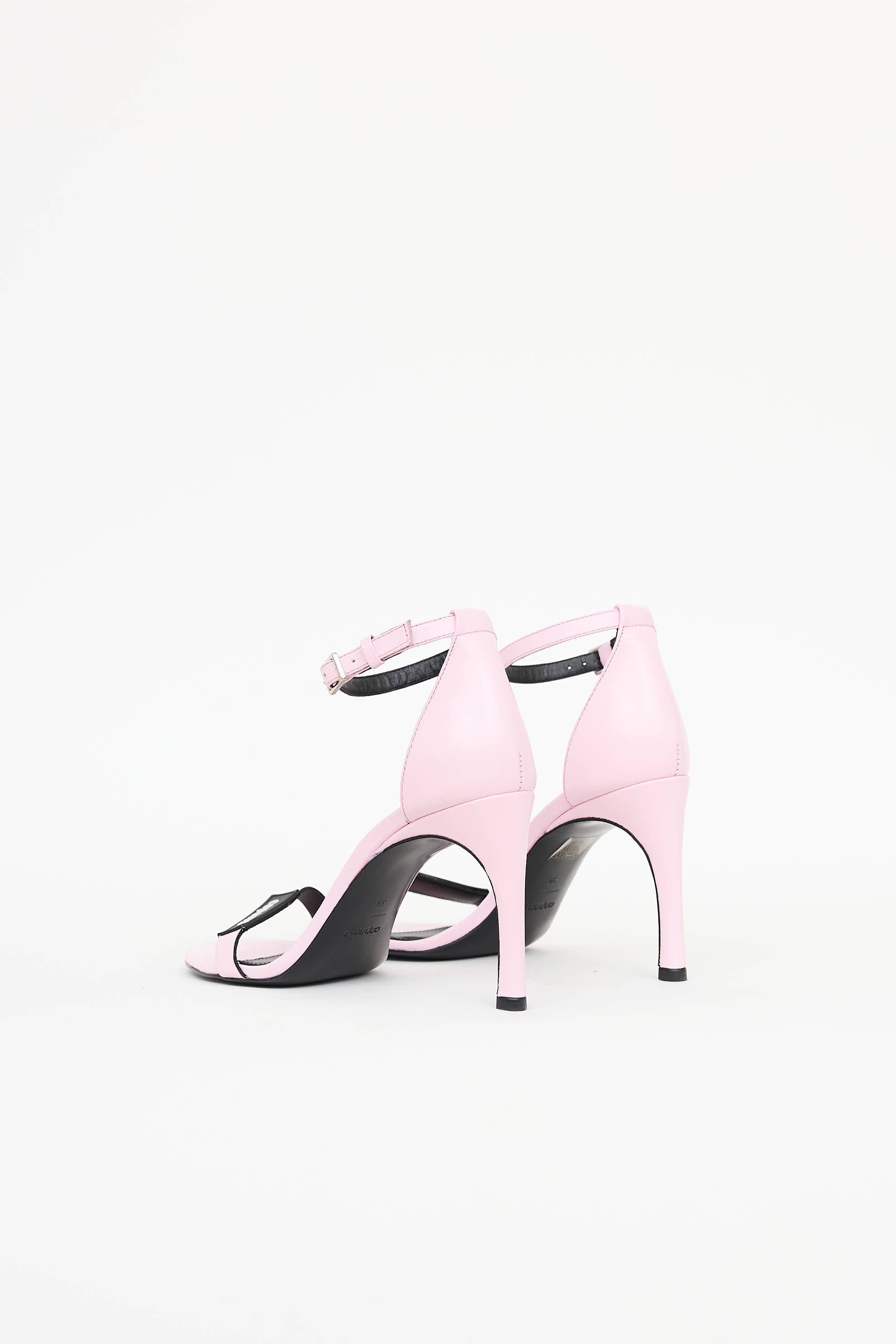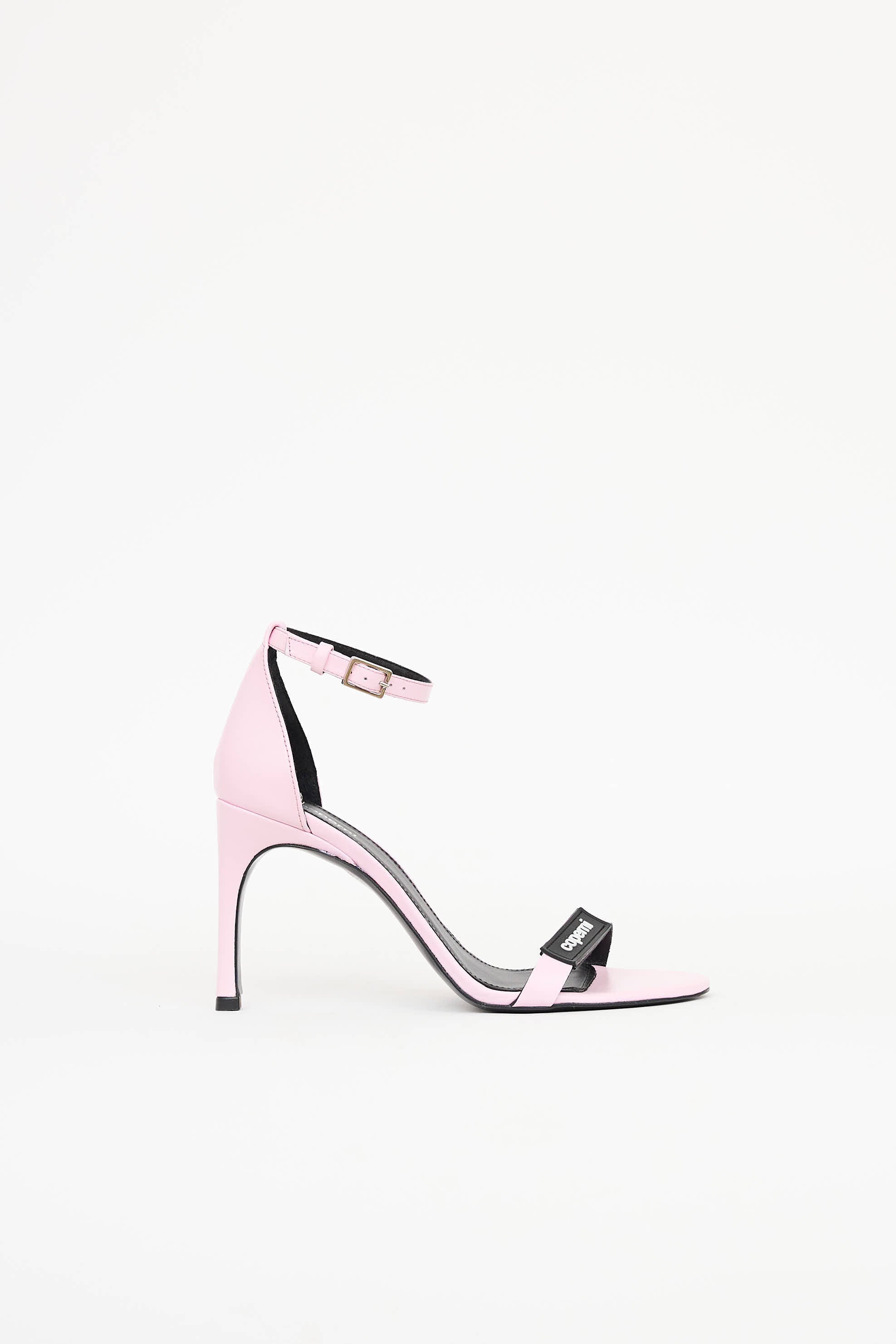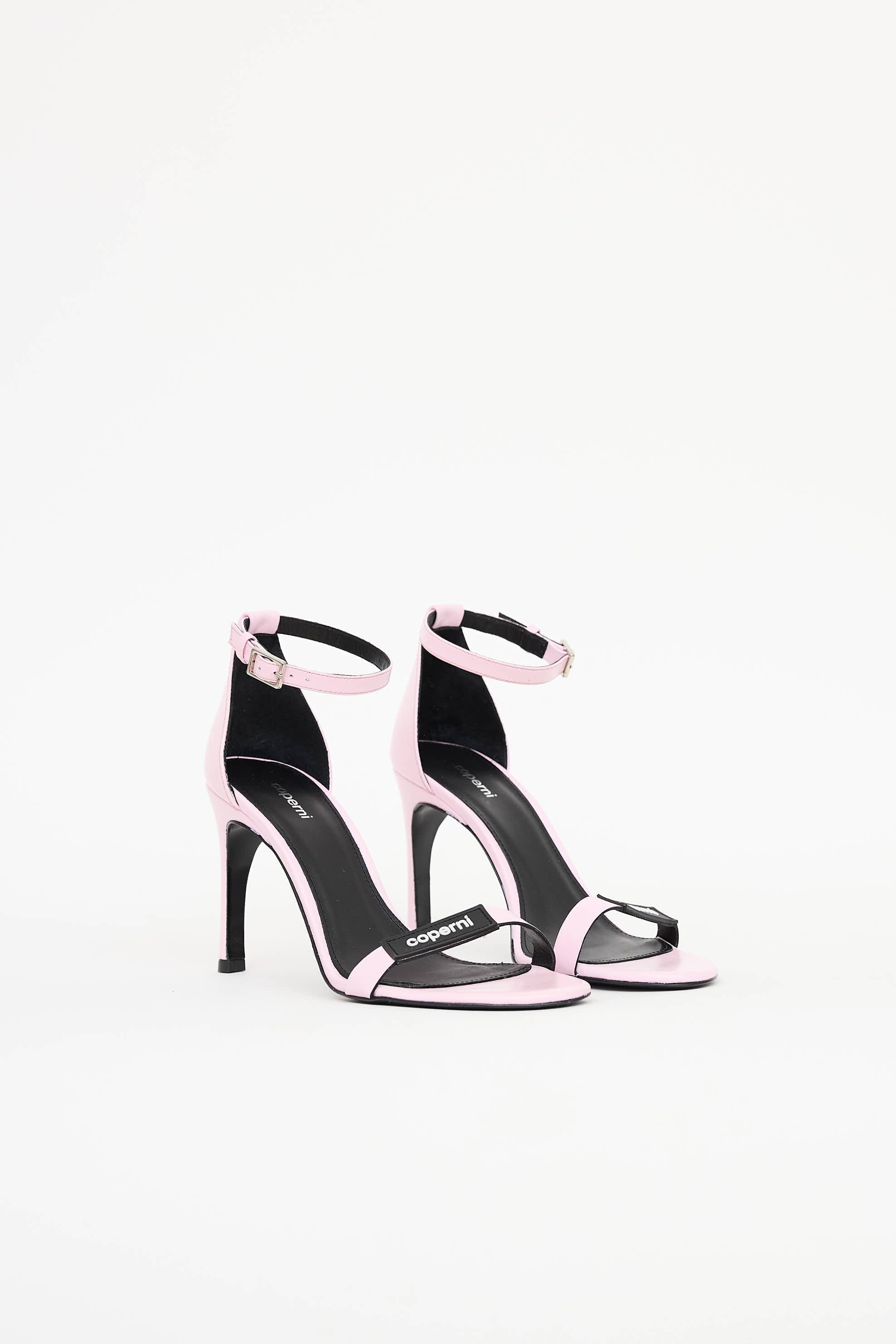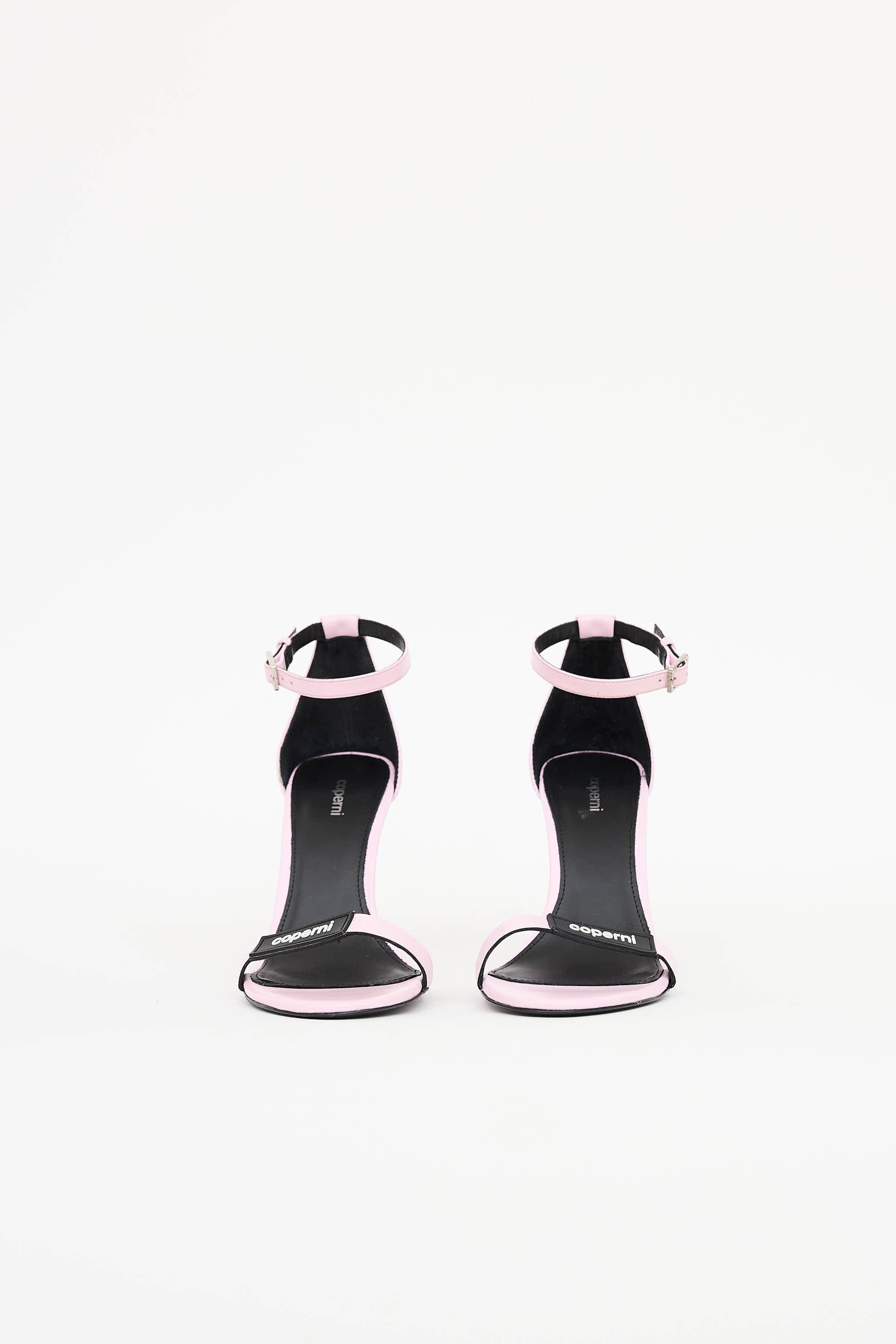 Pre-owned Coperni pink and black Skinny Strap Logo heel featuring a rounded open toe, toe strap with rubber logo text embossed patch, adjustable buckle ankle strap at counter, and a wrapped stiletto heel.