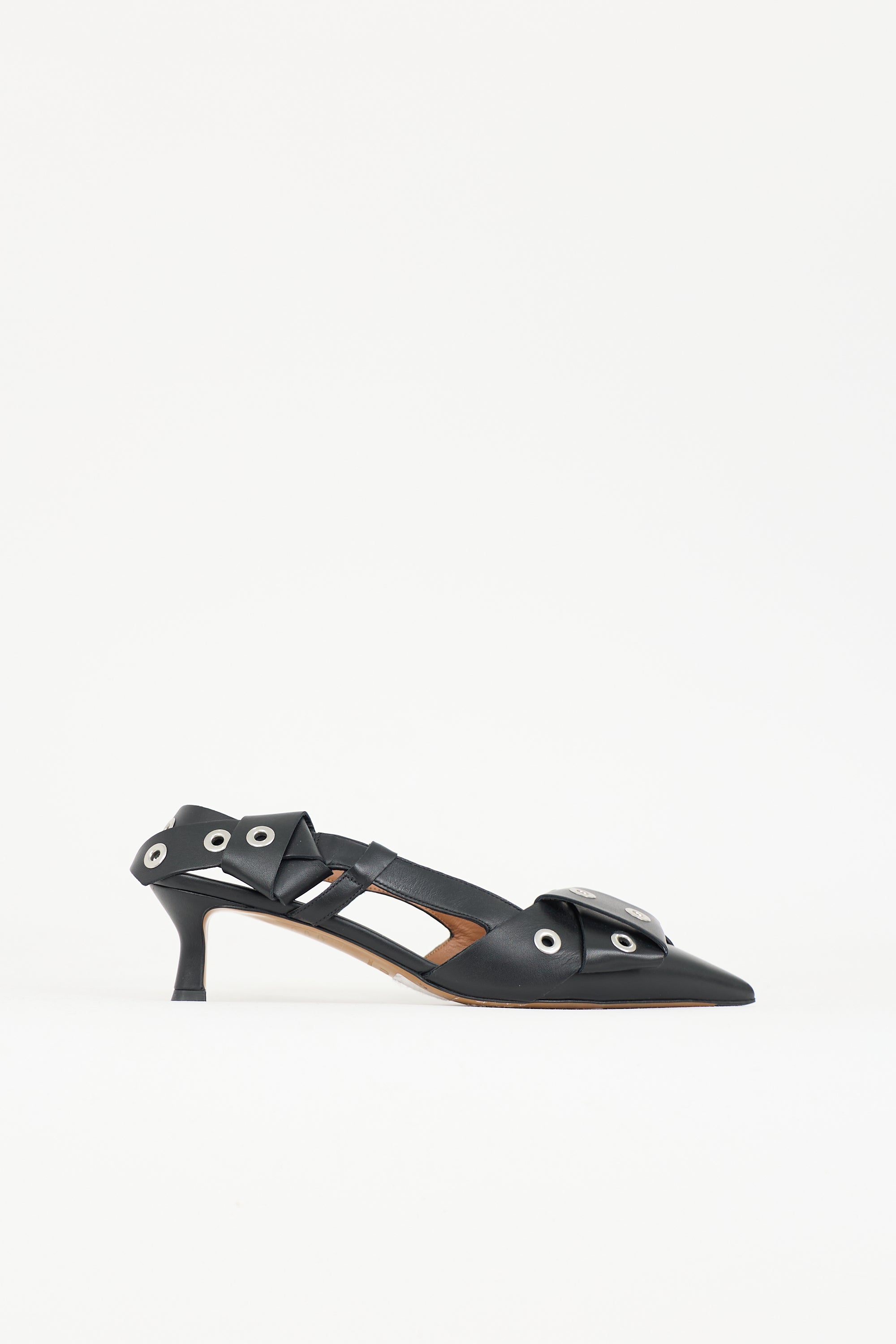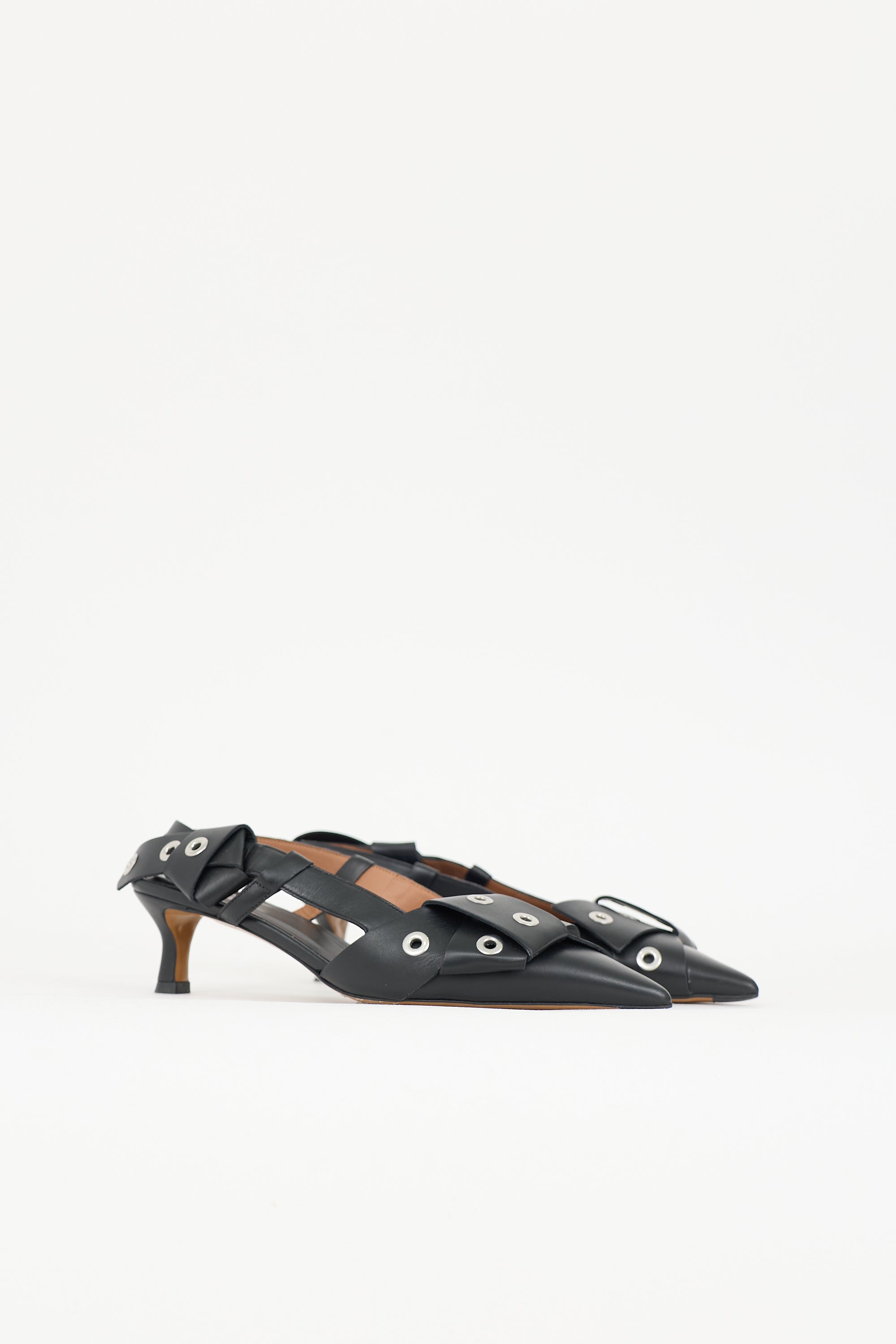 Pre-owned Maje black leather 124 Fayna Knot heels featuring pointed toe, silver tone stud embellishment, slingback strap, and kitten heel. Includes original dust bag.