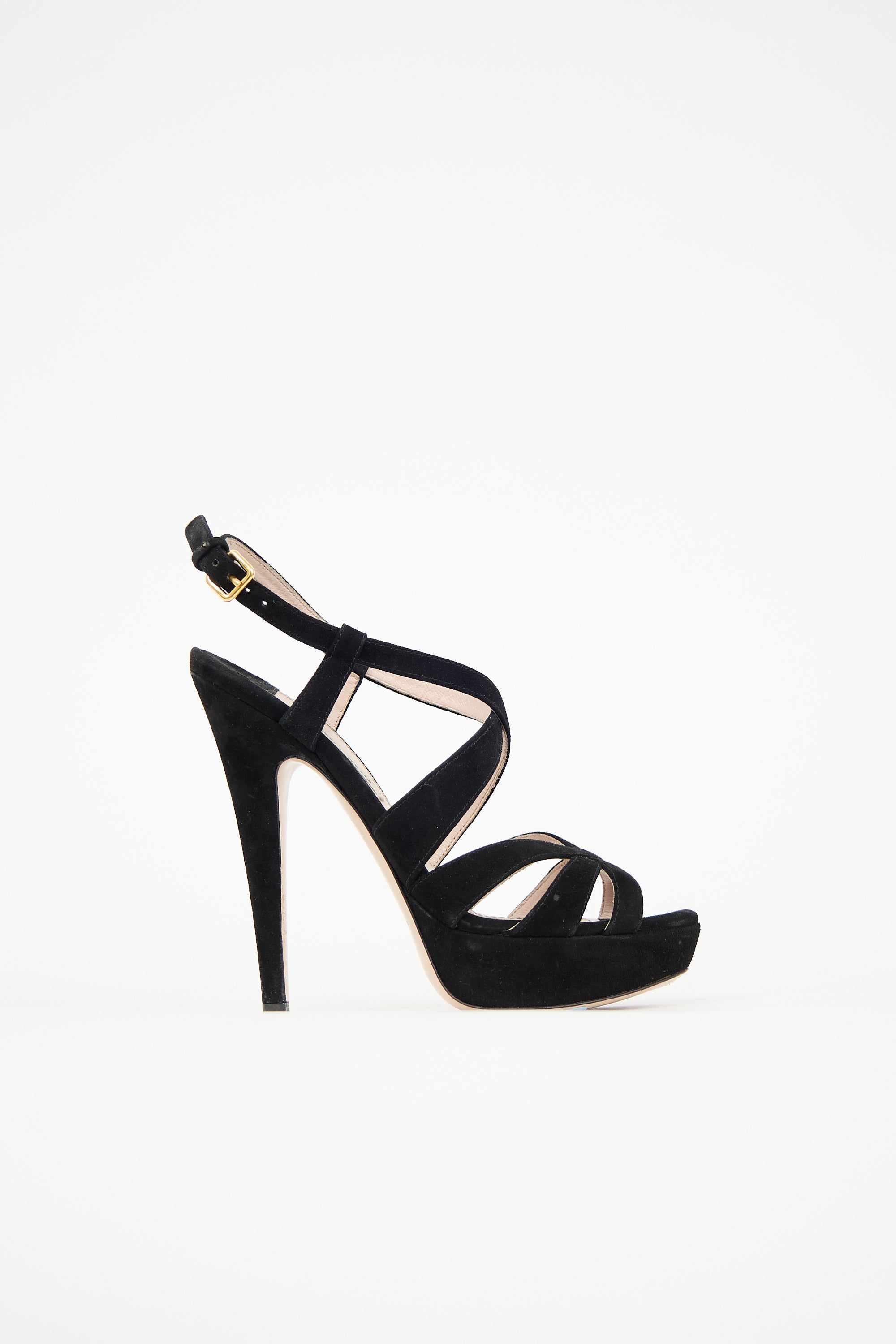 Pre-owned Miu Miu black suede heels featuring almond toe, criss cross strappy upper, adjustable slingback strap, and covered platform and stiletto heel.