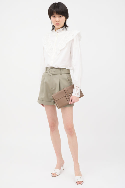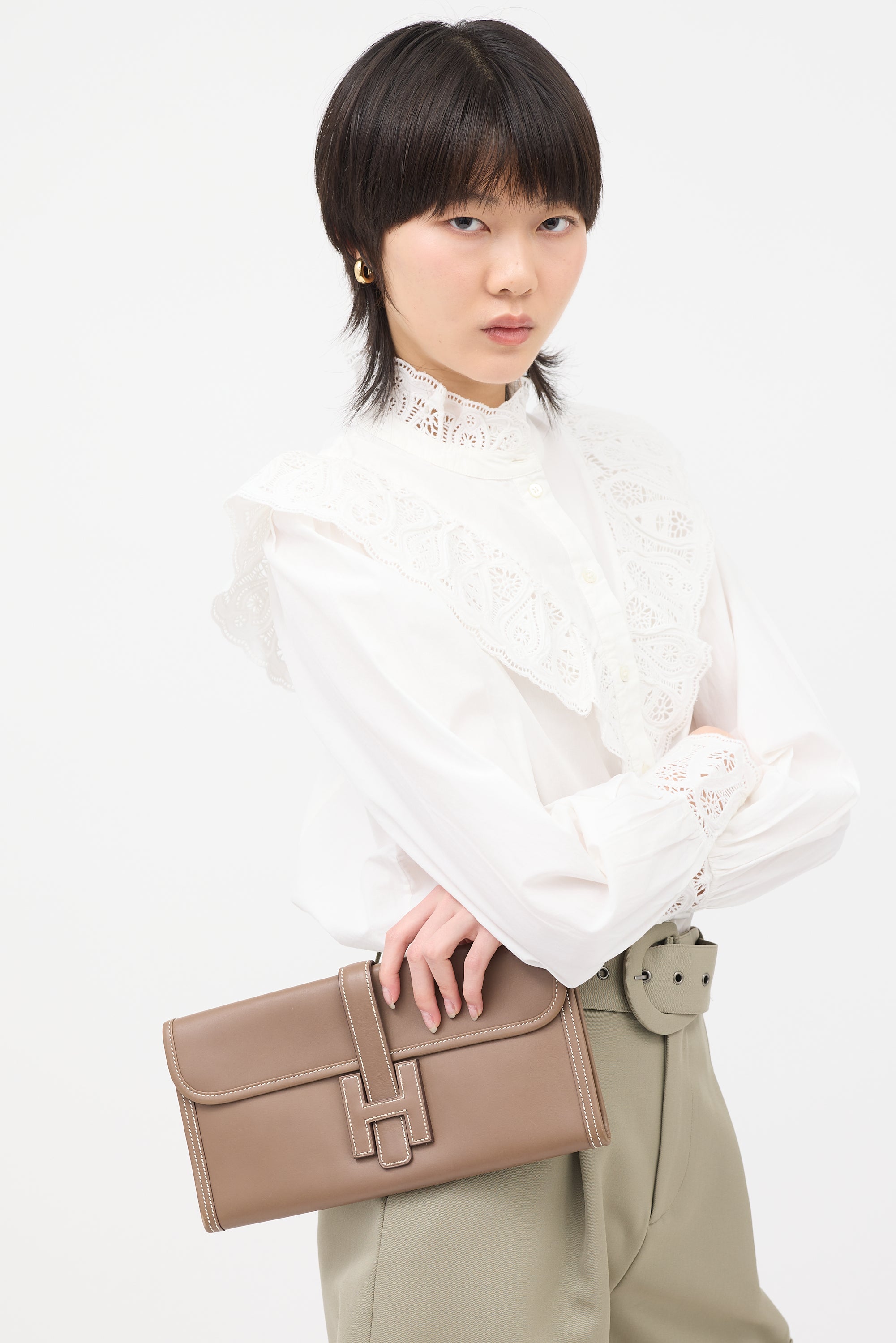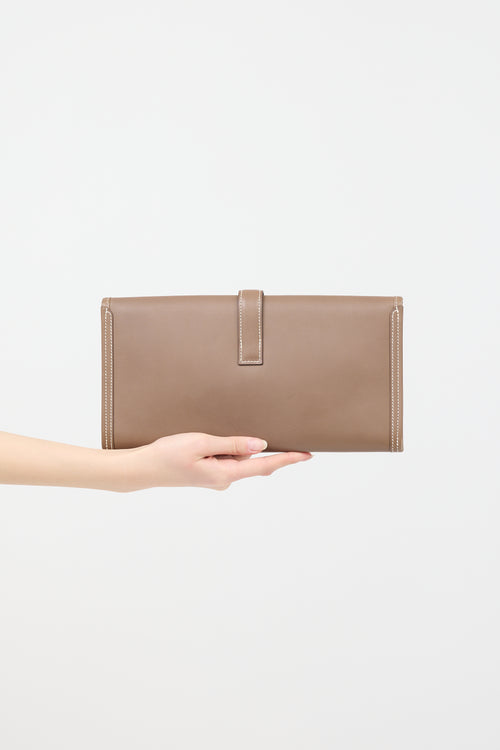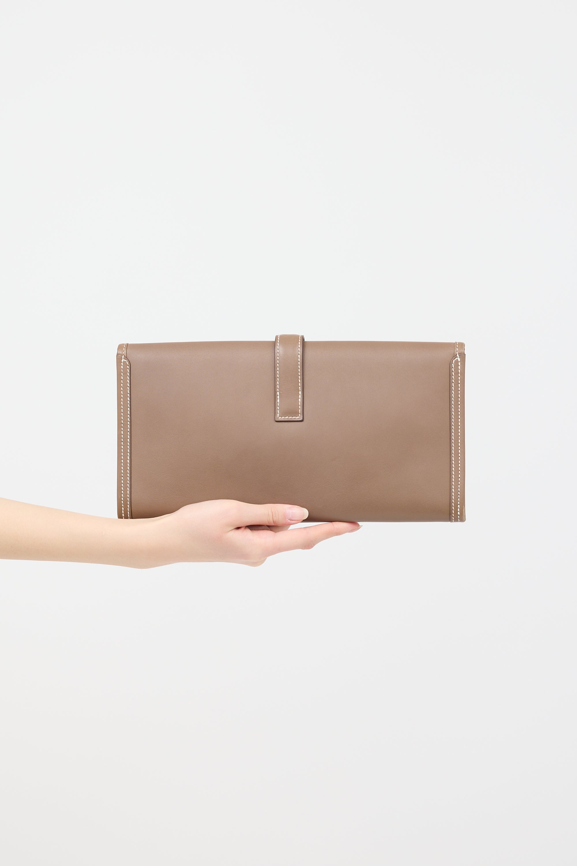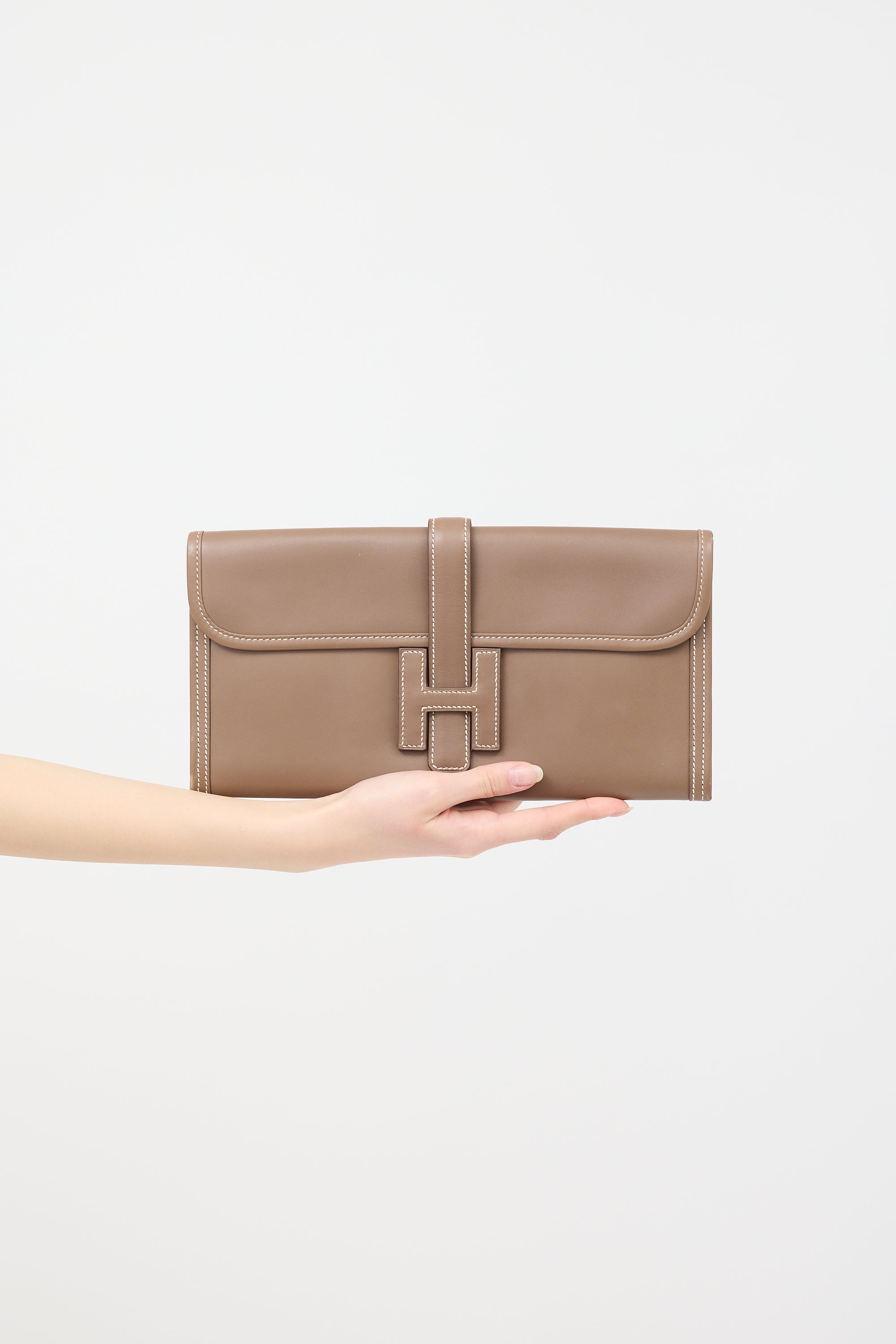 Pre-owned Hermès 2009 Jige Elan 29 clutch in Etoupe Swift leather featuring white contrast stitching, front flap with strap and H motif closure, brand stamp under flap, and one lined main compartment.