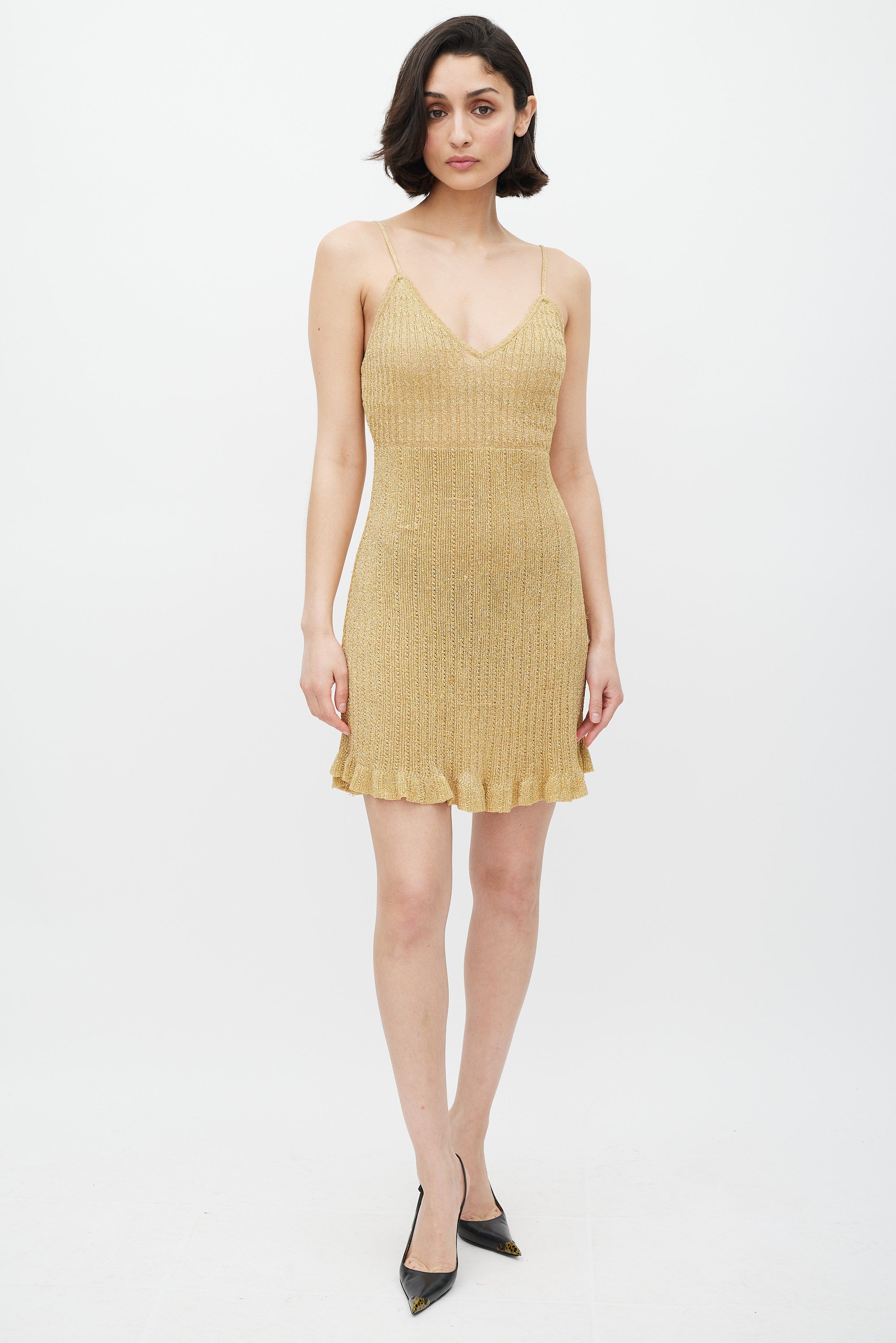 Pre-owned Blumarine Anna Molinari gold knit dress featuring metallic threads throughout, V-neckline, scalloped trim, and ruffled hem.