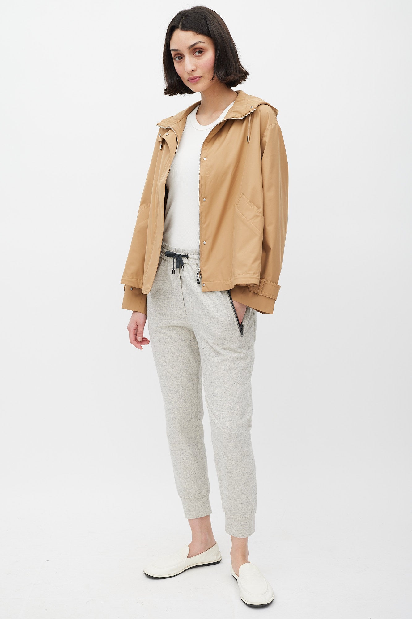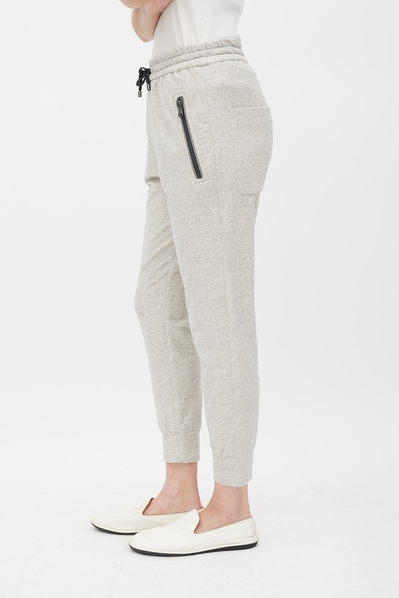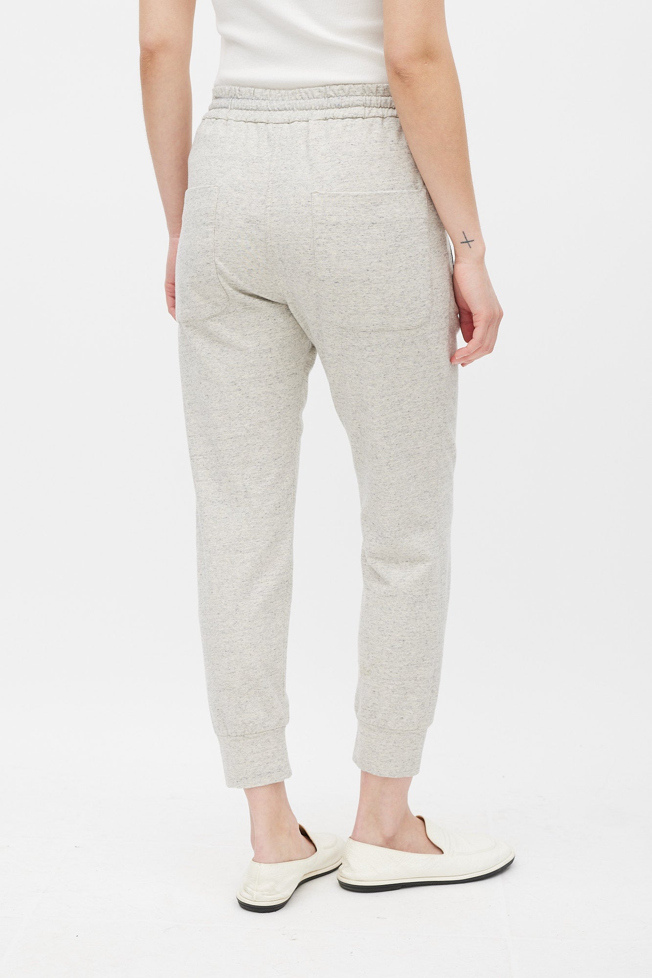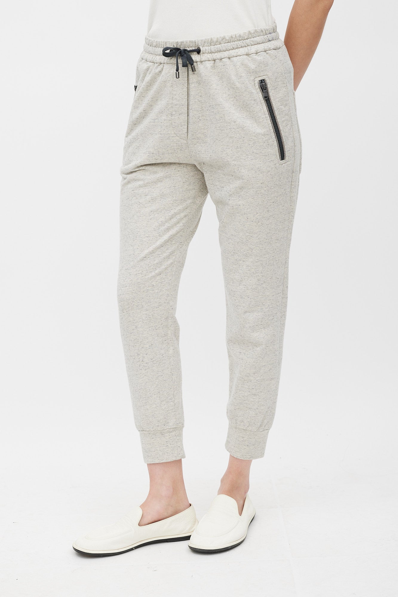 Pre-owned Brunello Cucinelli grey joggers featuring an elasticized waist, two zip pockets at hip with monili bead trim, two patch pockets at back, tapered leg, faux fly, and elasticized hem.