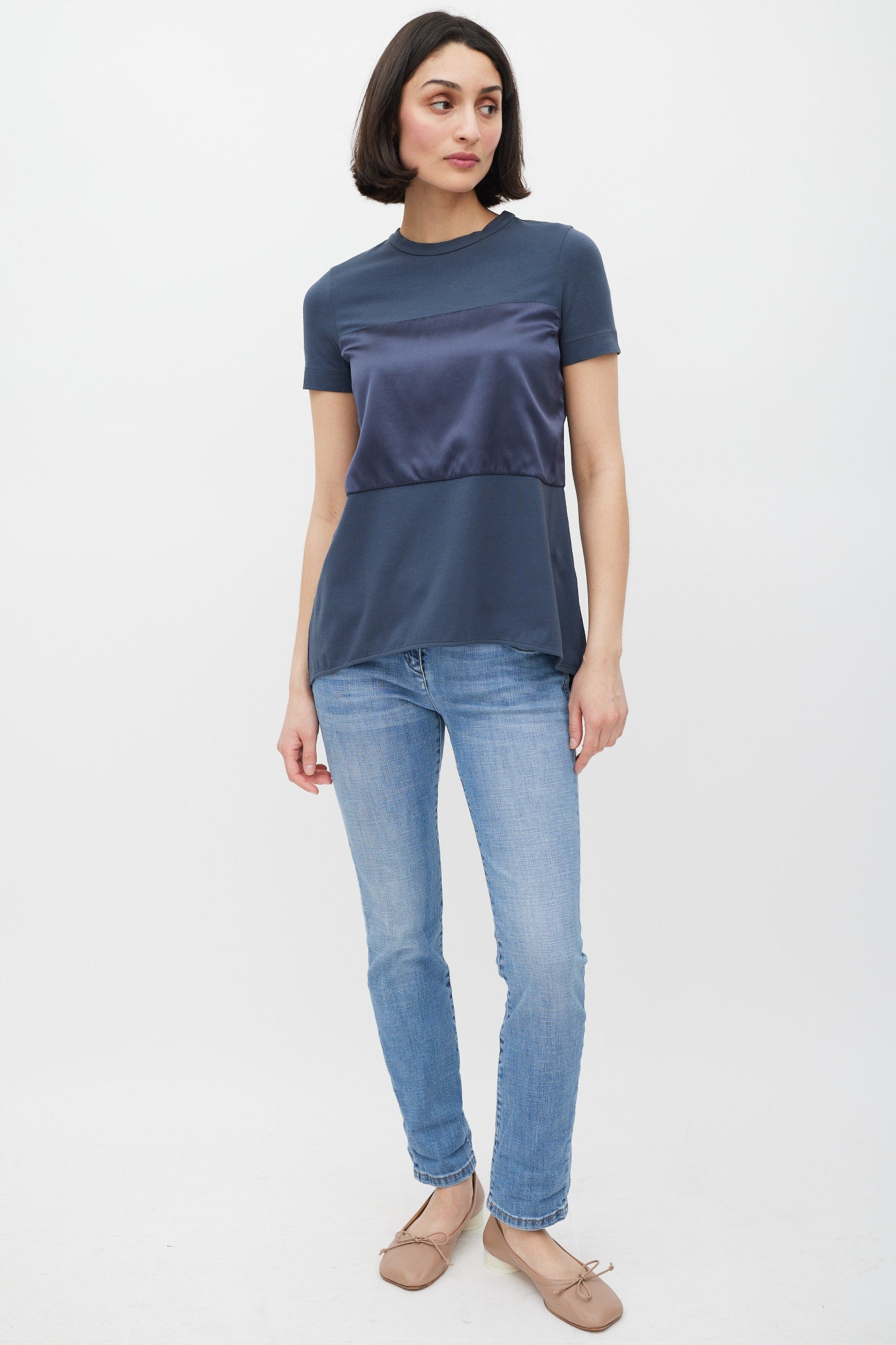 Pre-owned Brunello Cucinelli navy T-shirt featuring a satin panel at chest, round neckline, short sleeves, and high low hem.