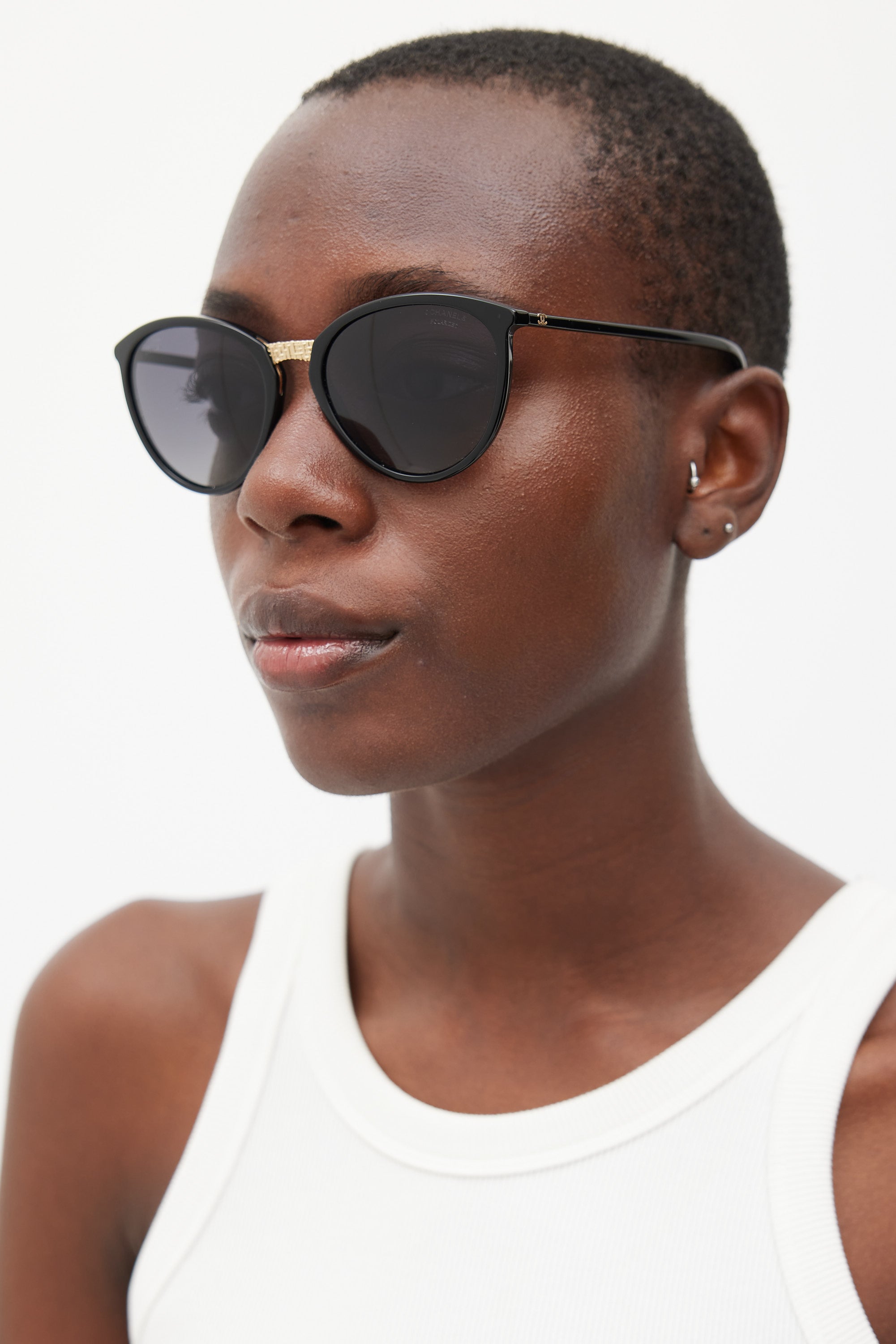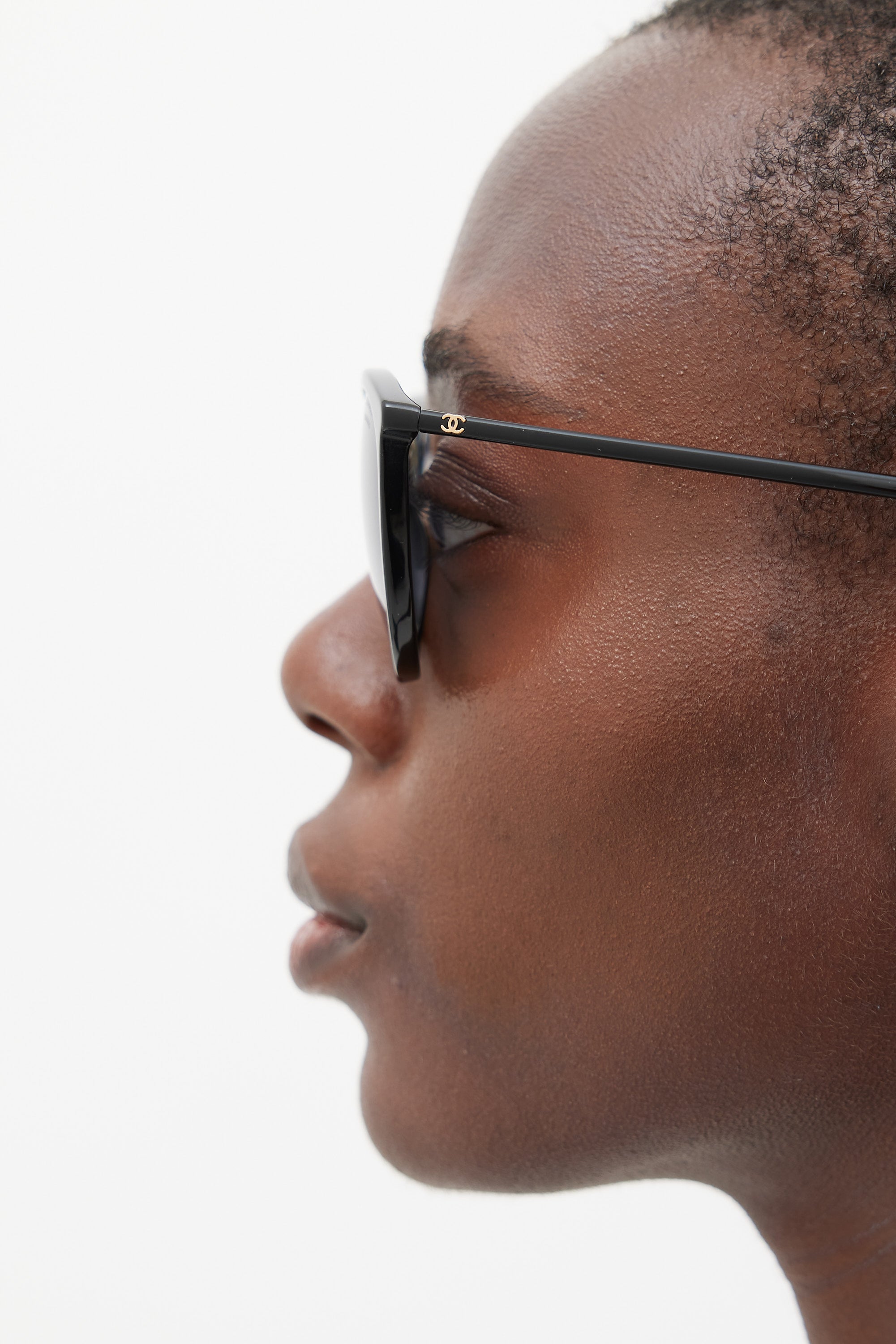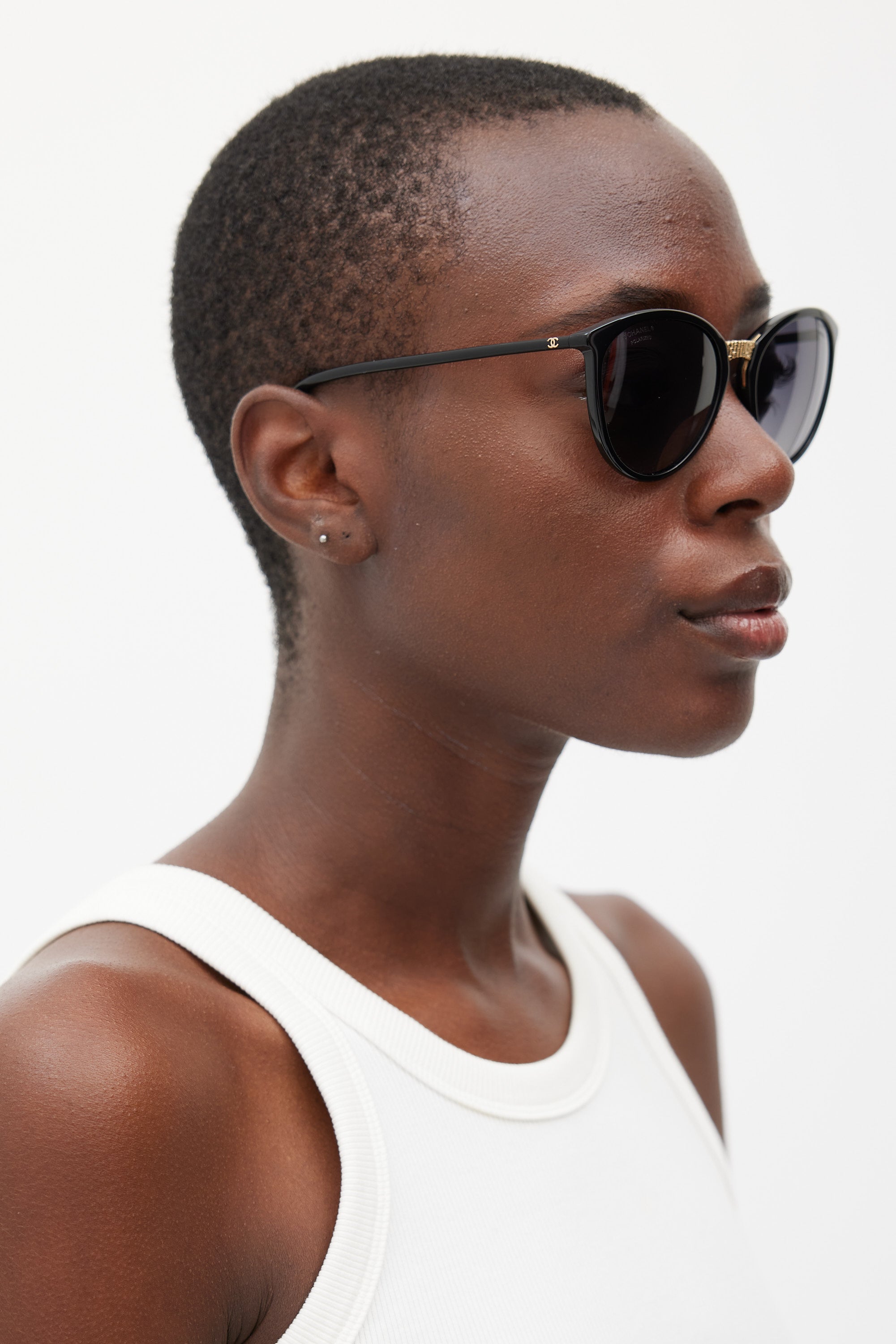 Pre-owned Chanel black 5382 sunglasses featuring a circular frame, tinted lenses, gold tone textured nose bridge, nose pads, and CC logo hardware at temple. Comes with original case.