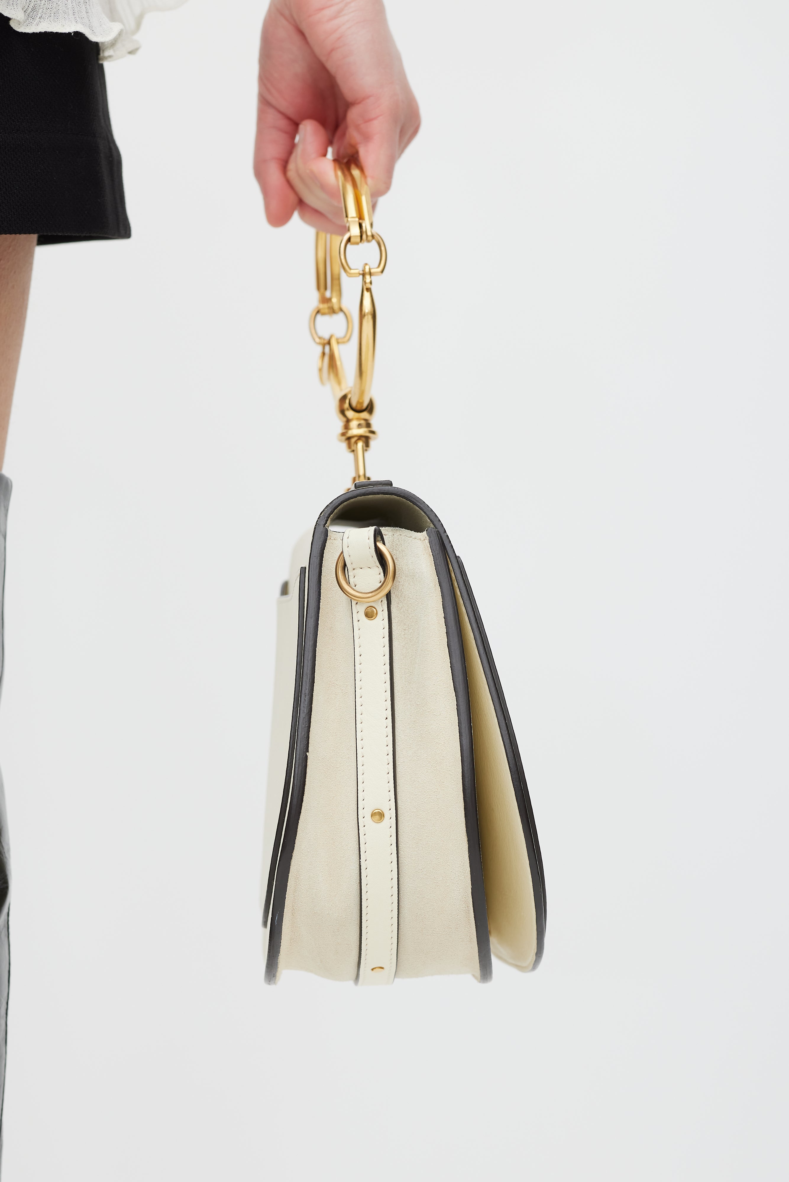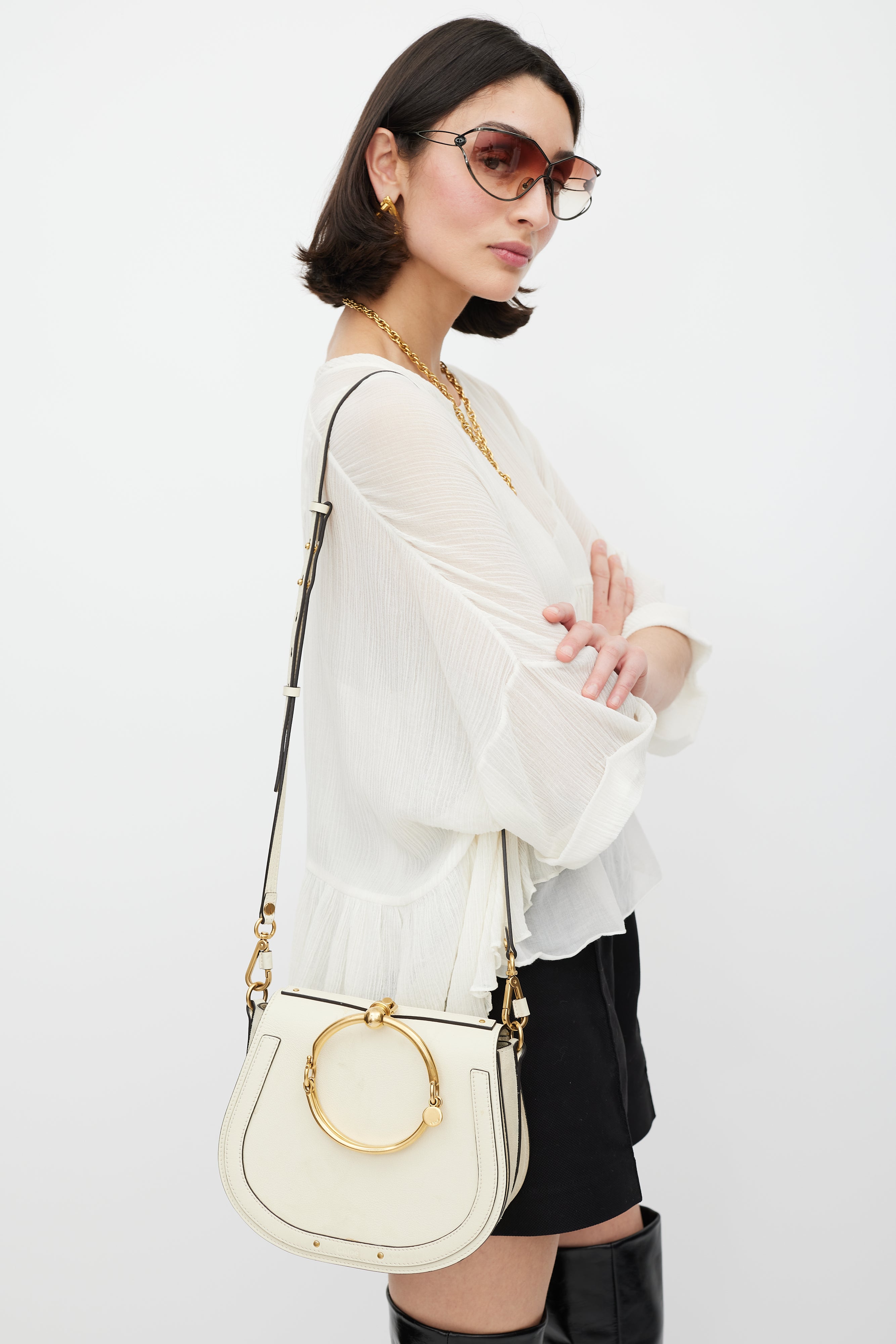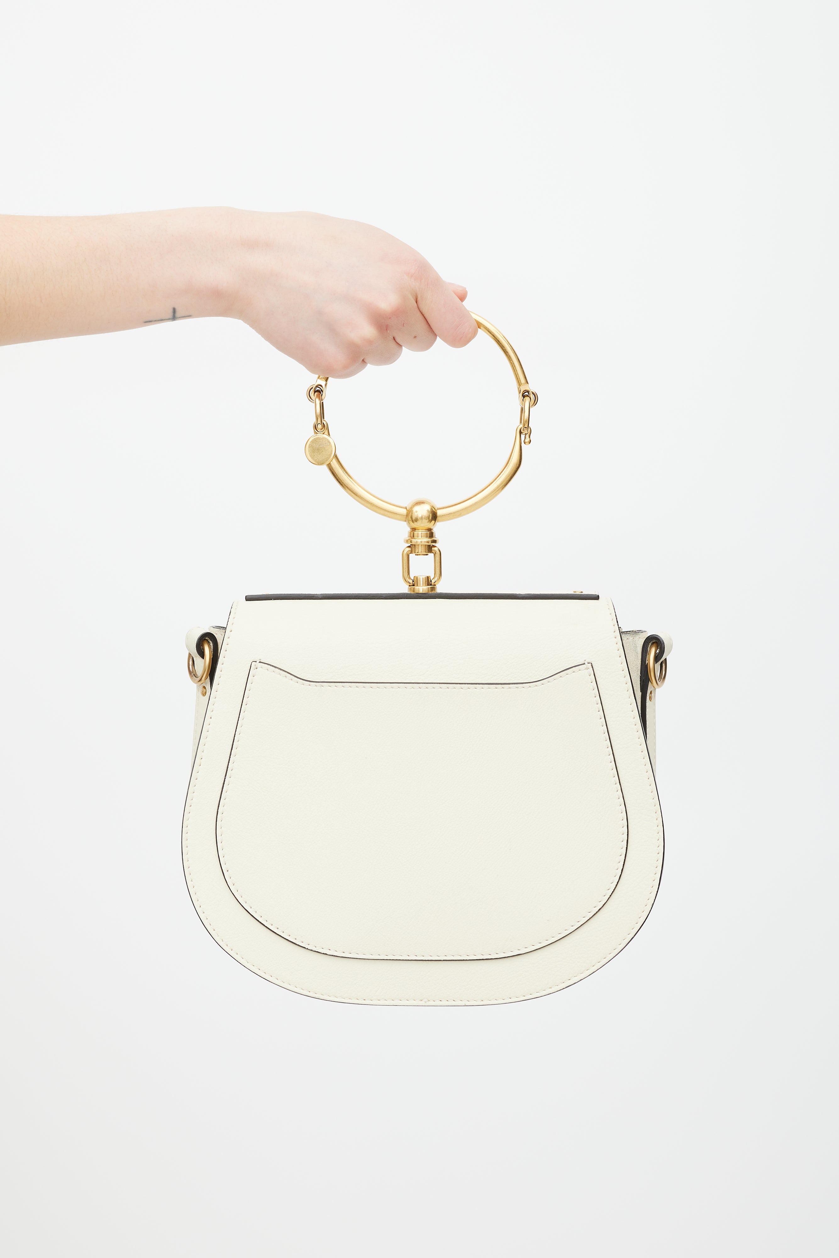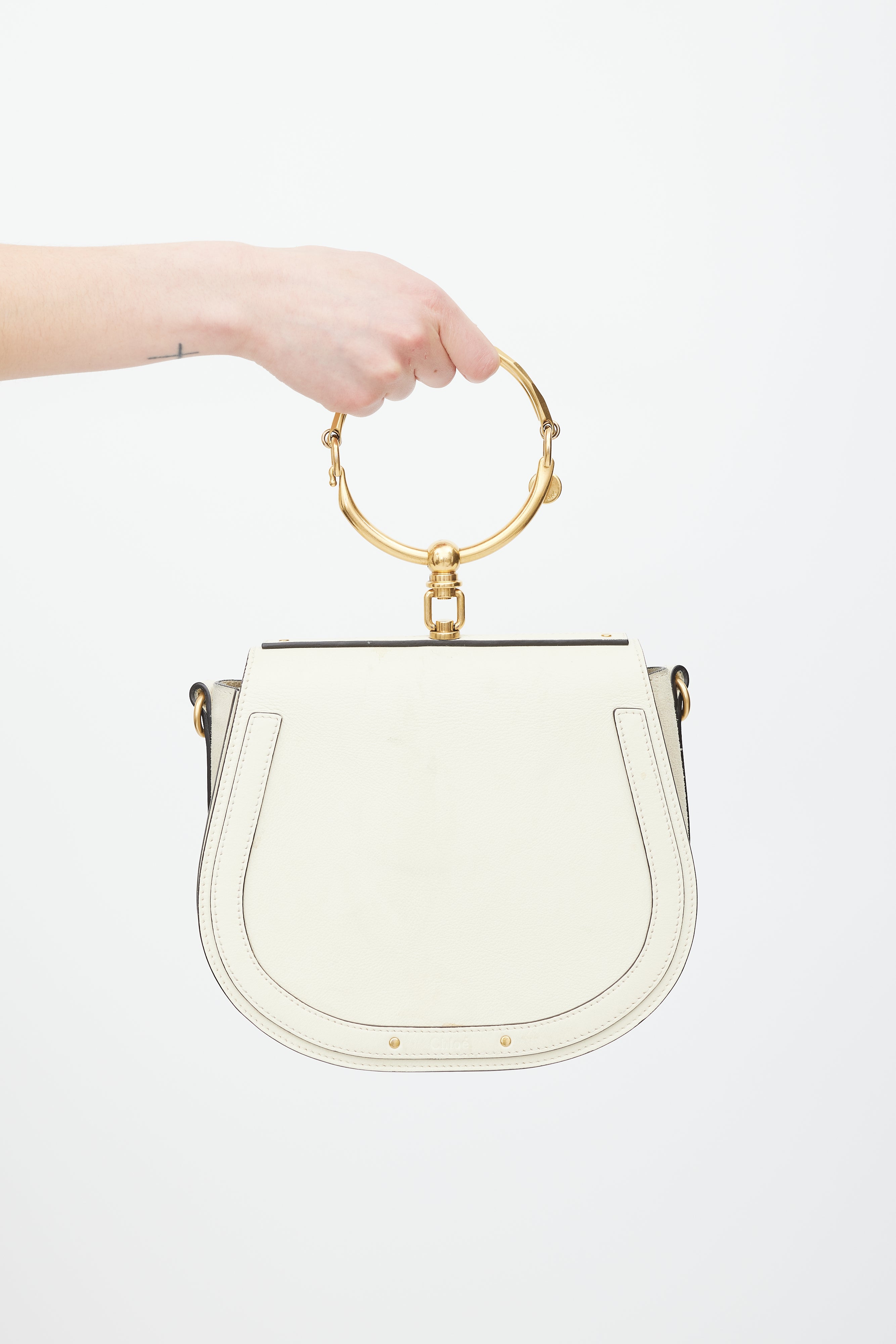 Pre-owned Chloé cream Nile leather bag featuring an embossed logo at front, top flap, gold tone circular top handle, one main compartment with one slip pocket, removable shoulder strap, one slip pocket at back, and magnetic snap closure. Comes with original dust bag.