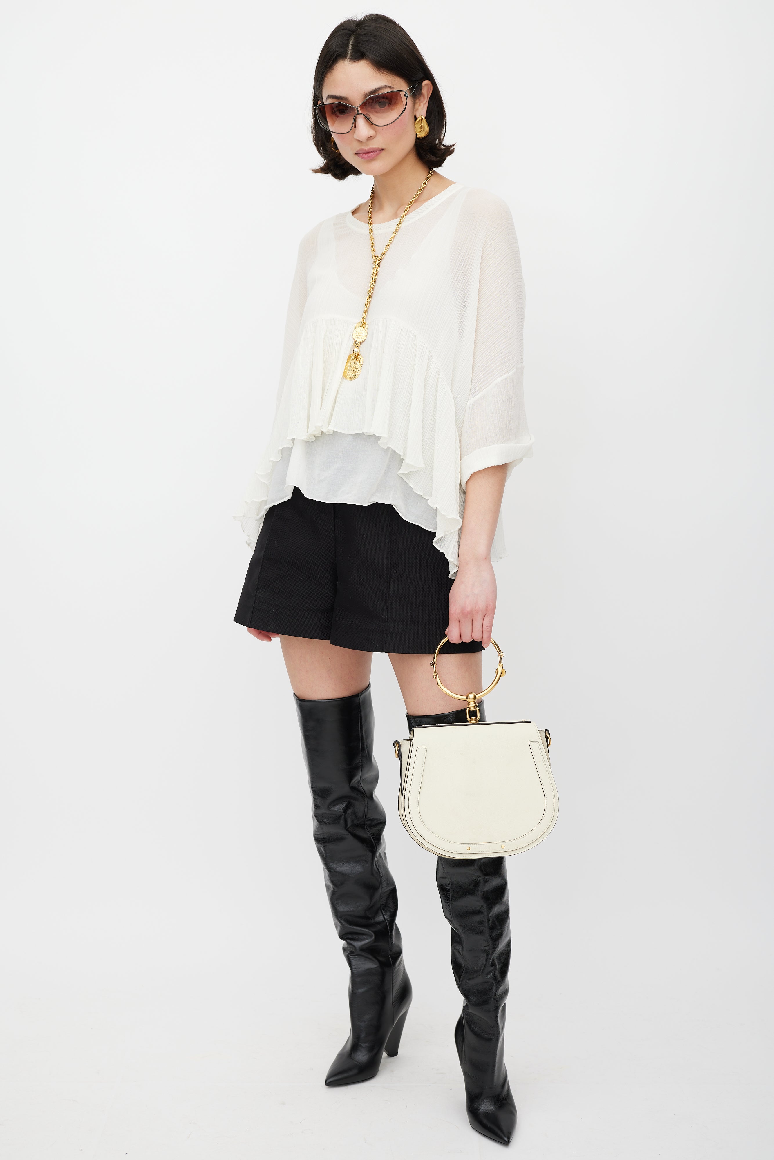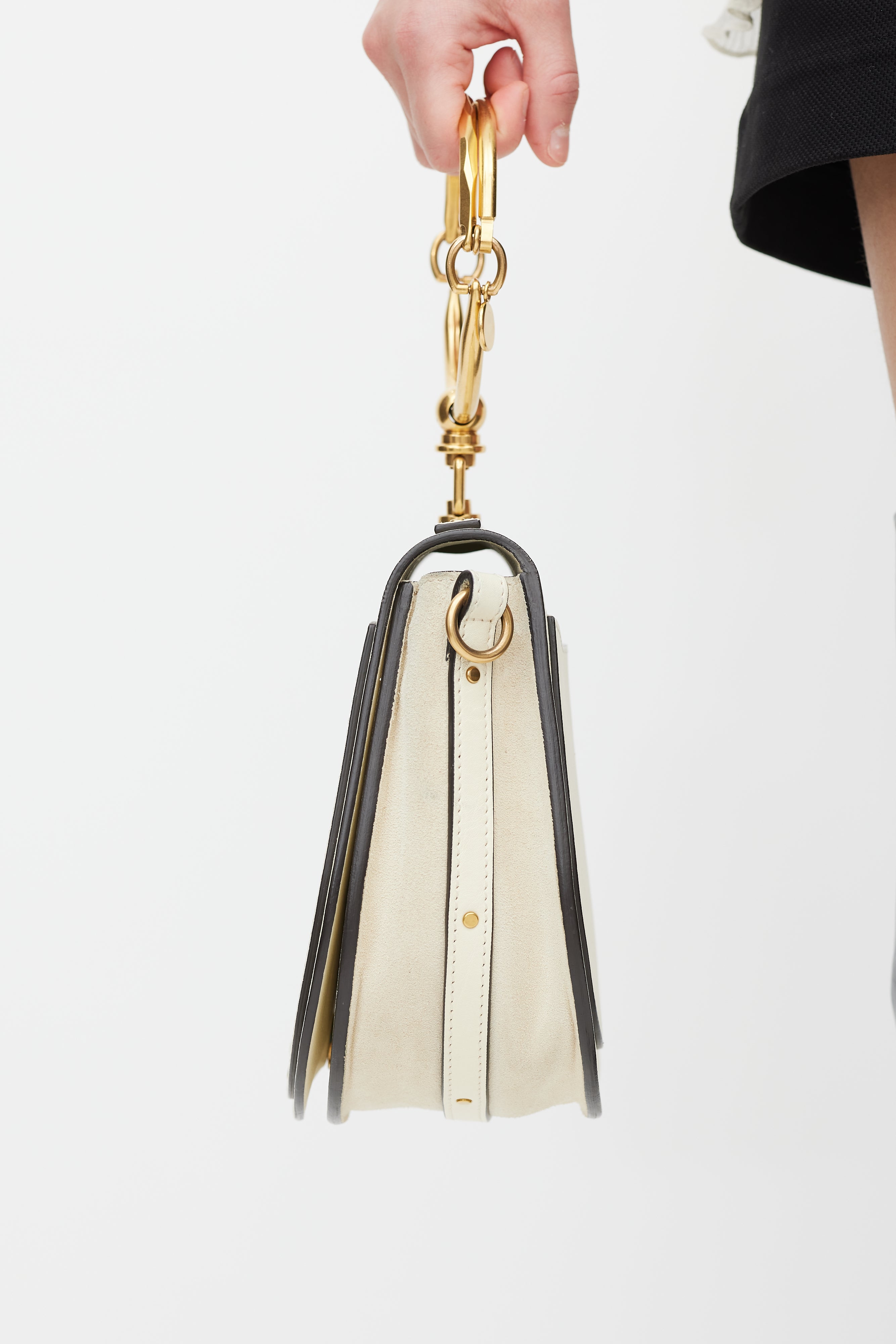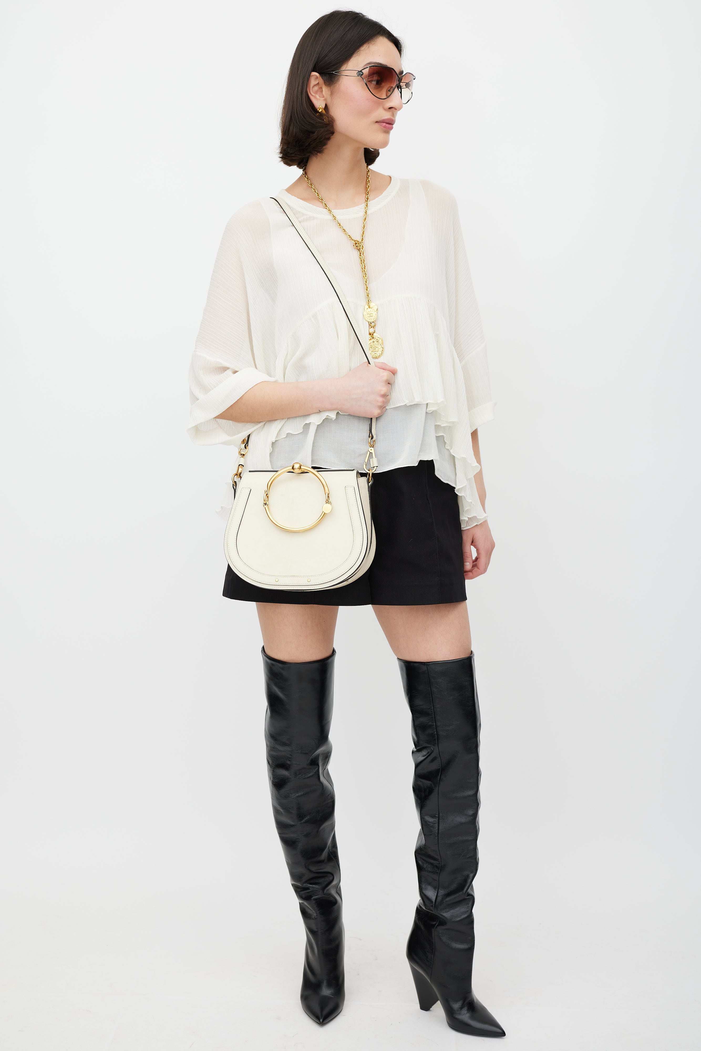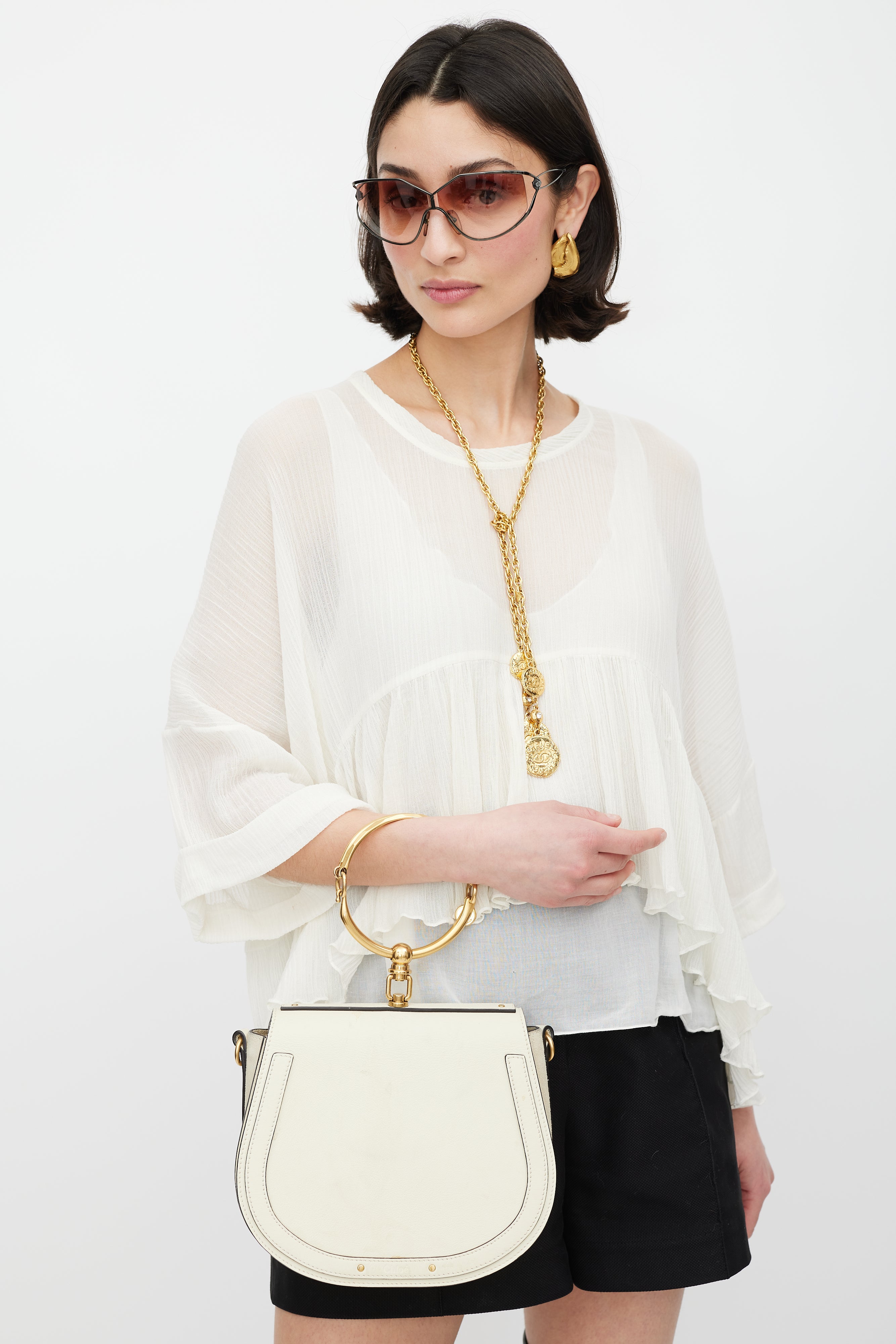 Pre-owned Chloé cream Nile leather bag featuring an embossed logo at front, top flap, gold tone circular top handle, one main compartment with one slip pocket, removable shoulder strap, one slip pocket at back, and magnetic snap closure. Comes with original dust bag.