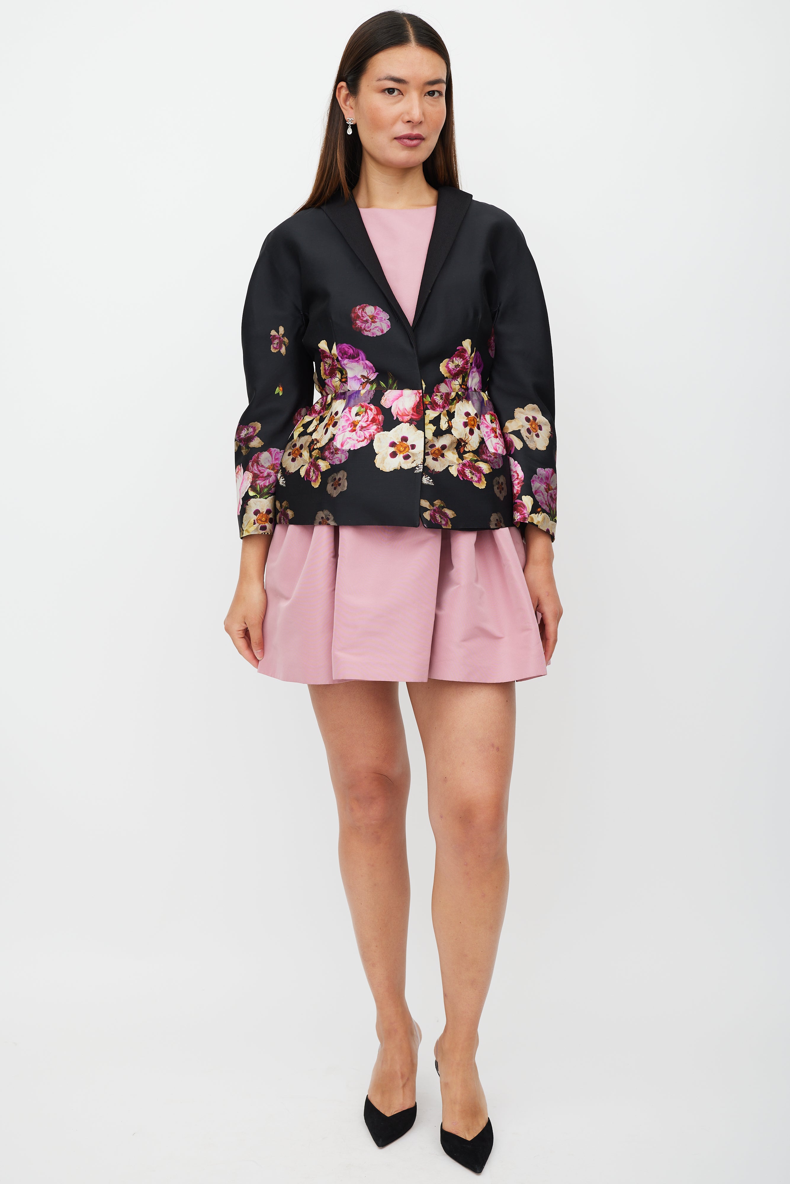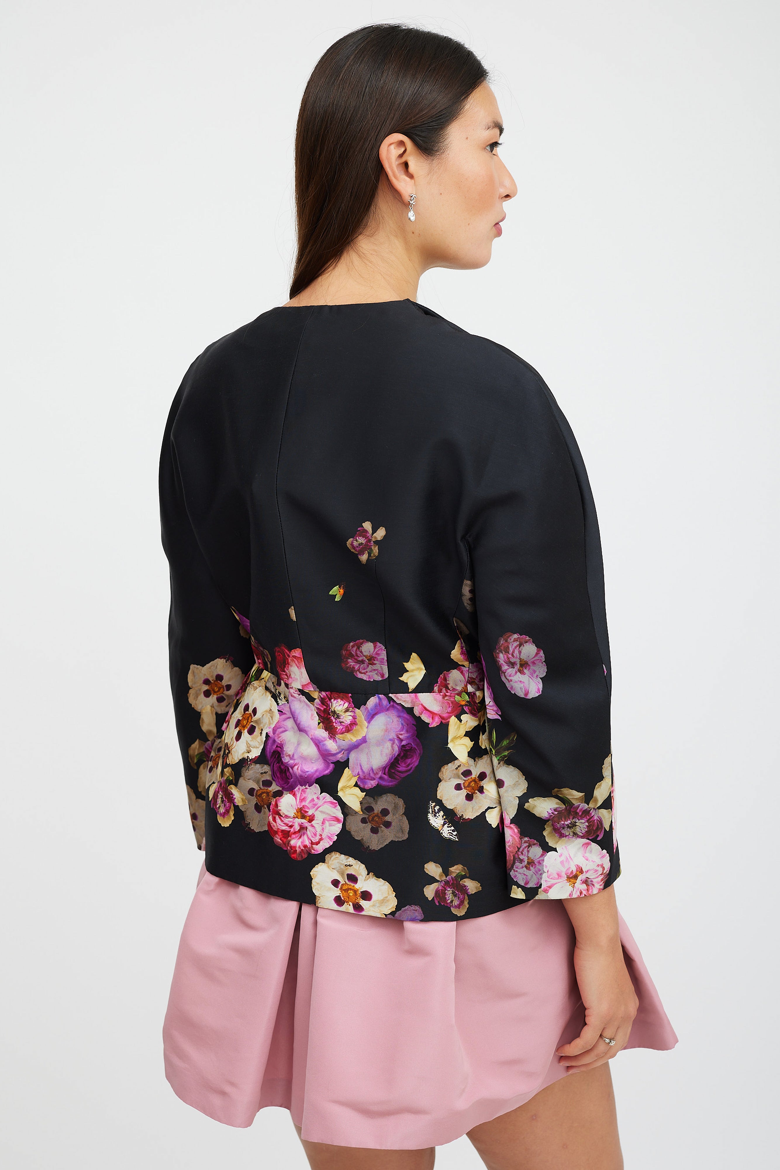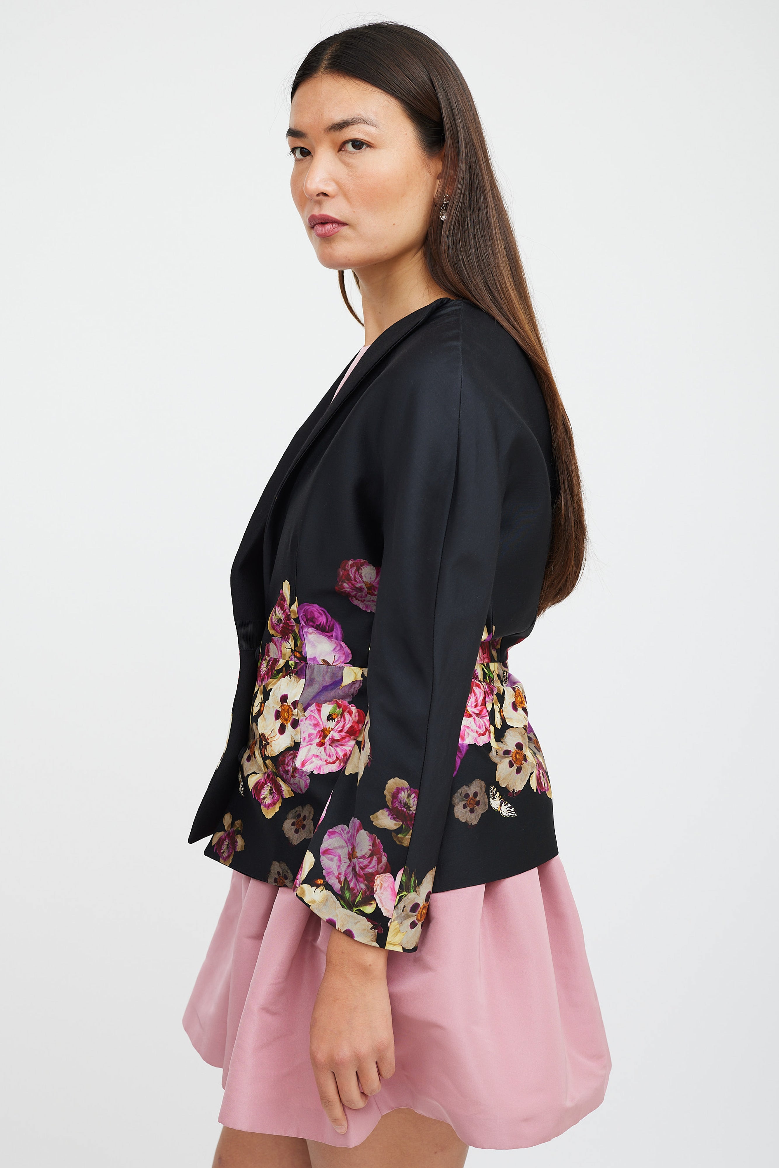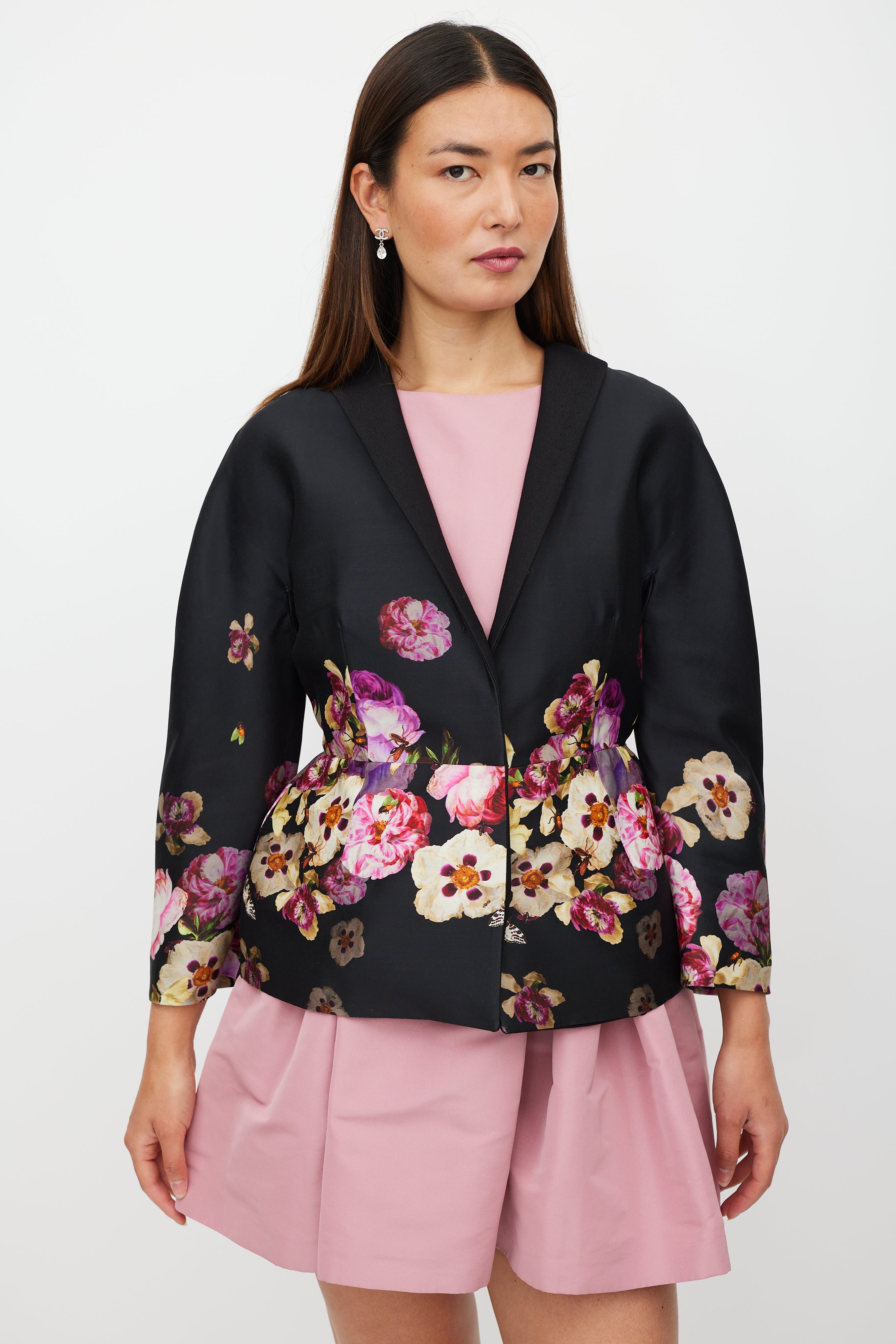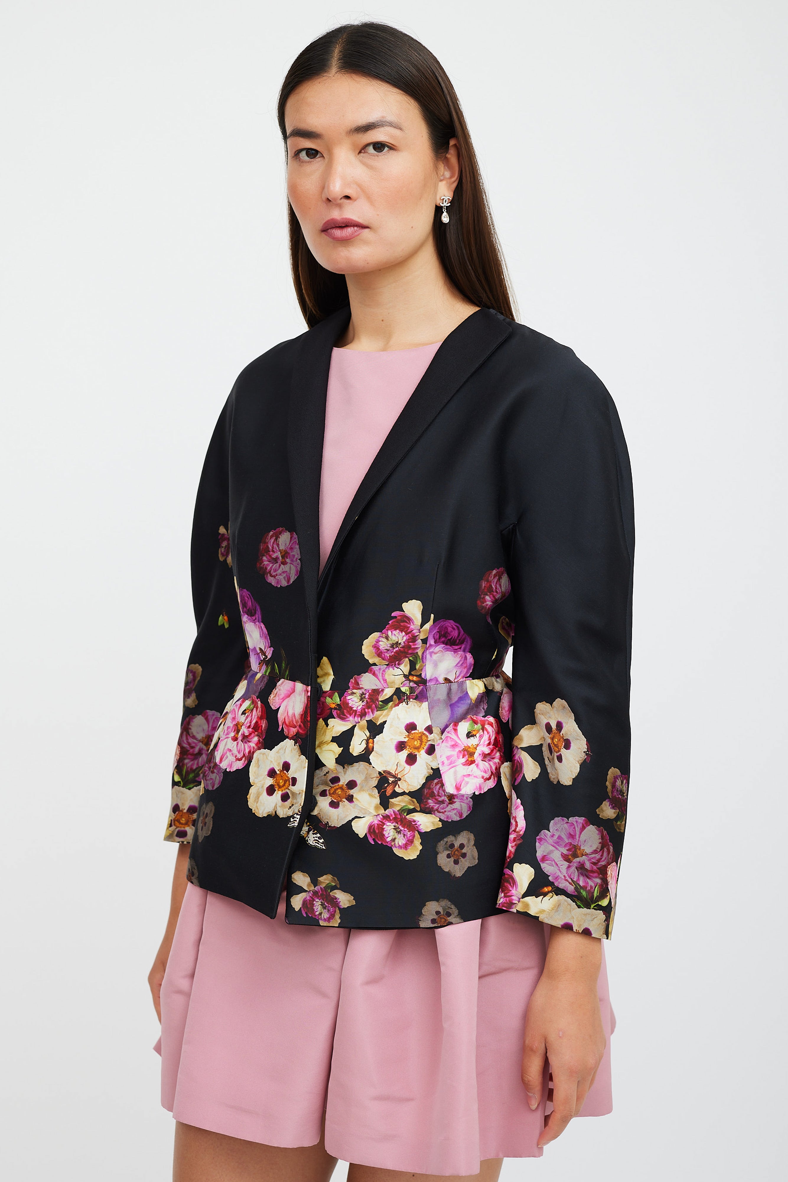 Pre-owned Giambattista Valli black silk blazer featuring a multicolour floral pattern throughout, pointed collar, long sleeves, and snap button closure. Lined.