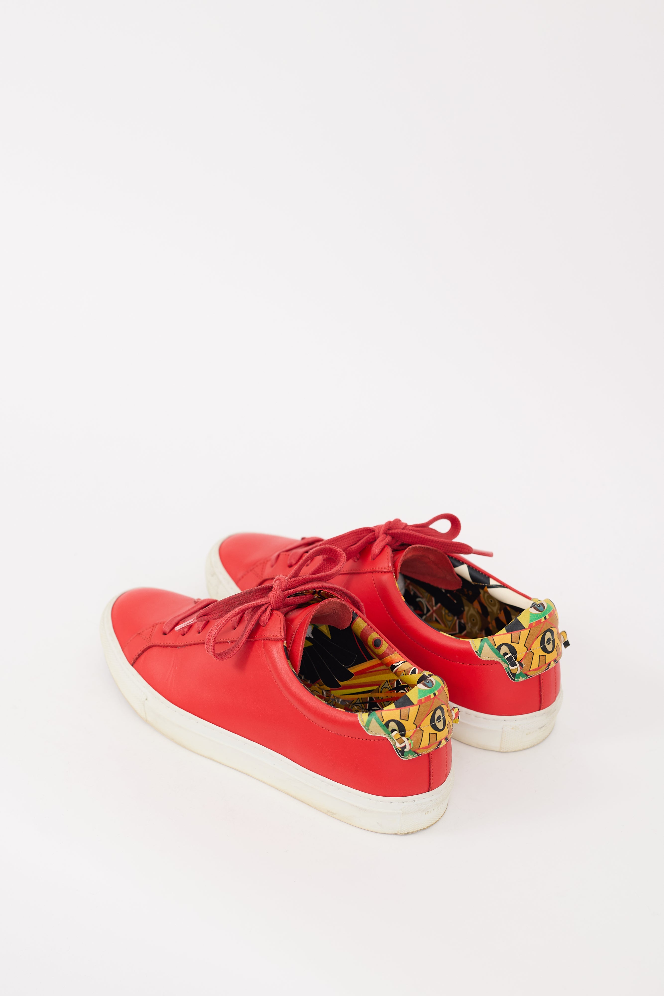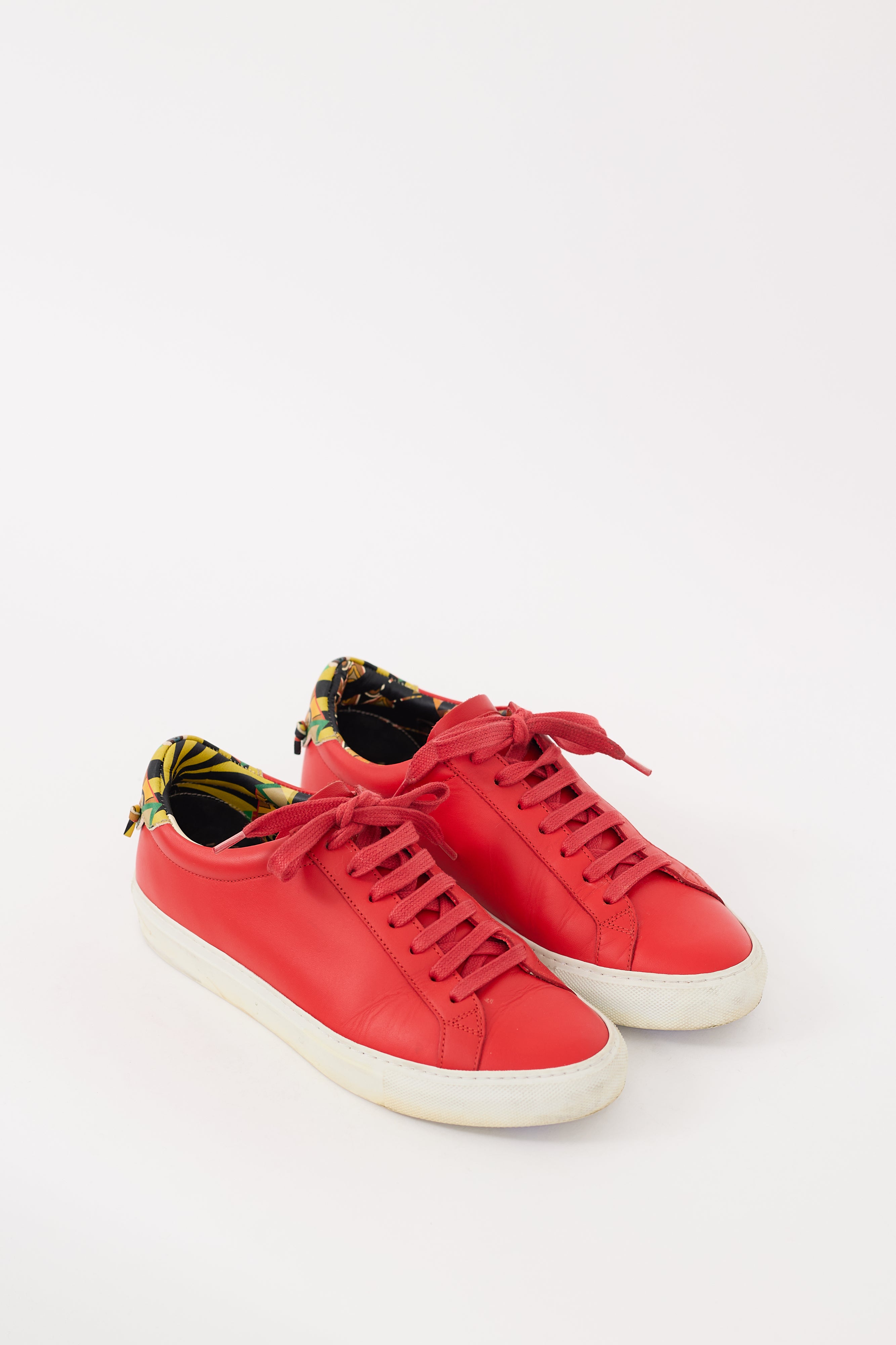 Pre-owned Givenchy red leather Urban Street low sneakers featuring a rounded toe, lace up front, gold tone stamped logo at tongue, multicolour eye motif printed interior and counter panel with knot detail, and white rubber sole with debossed logo at heel. Comes with original dust bags.