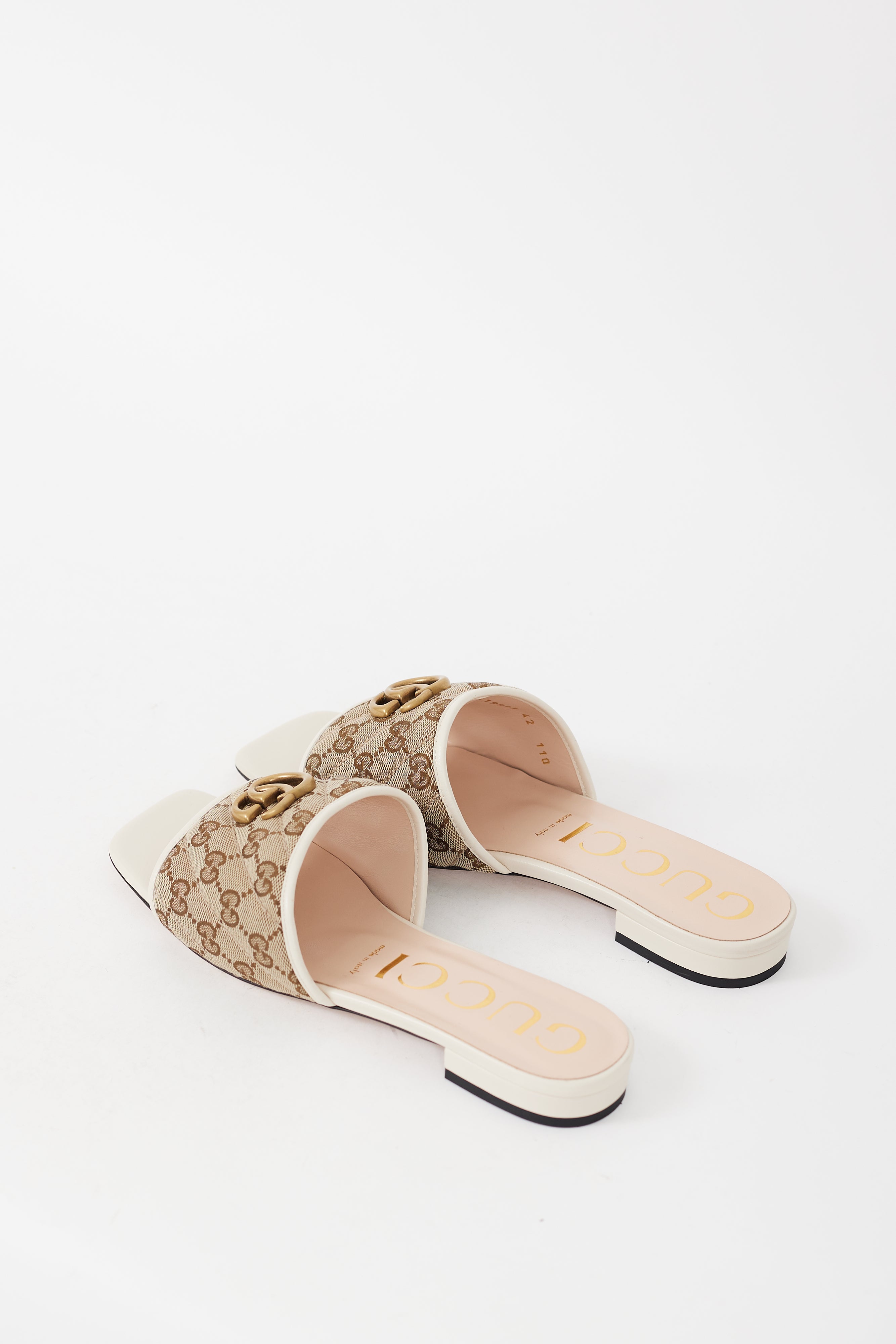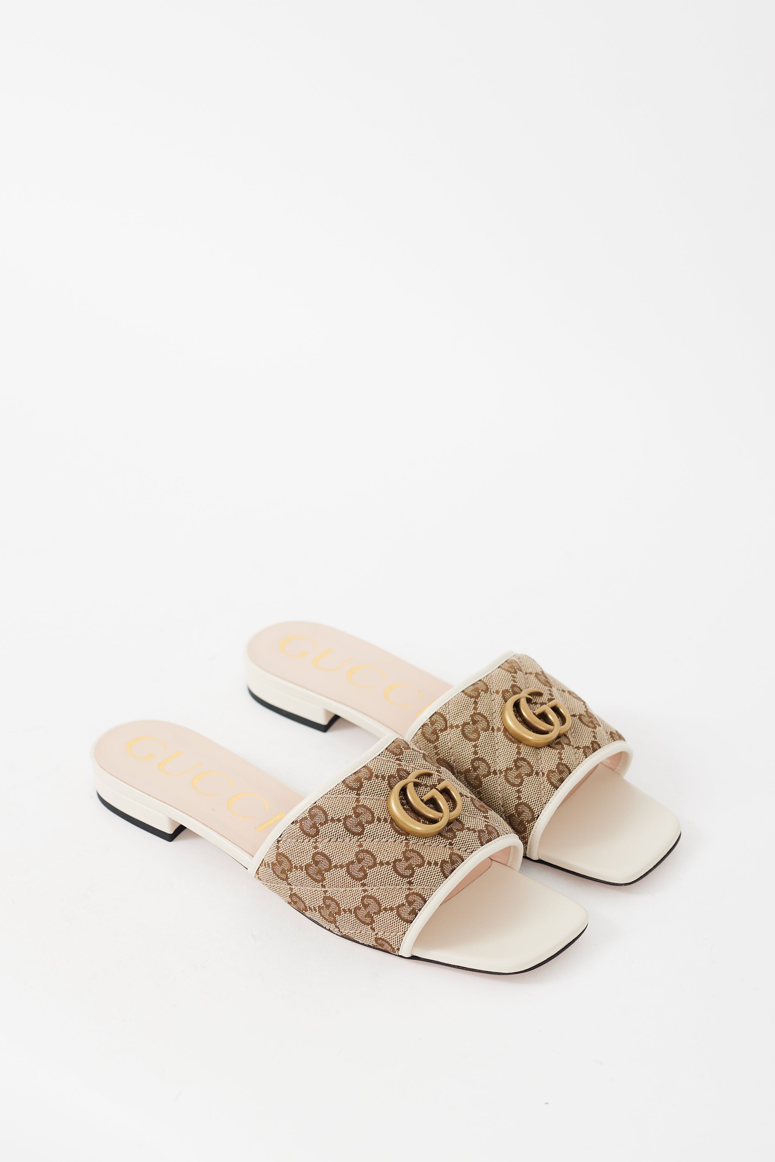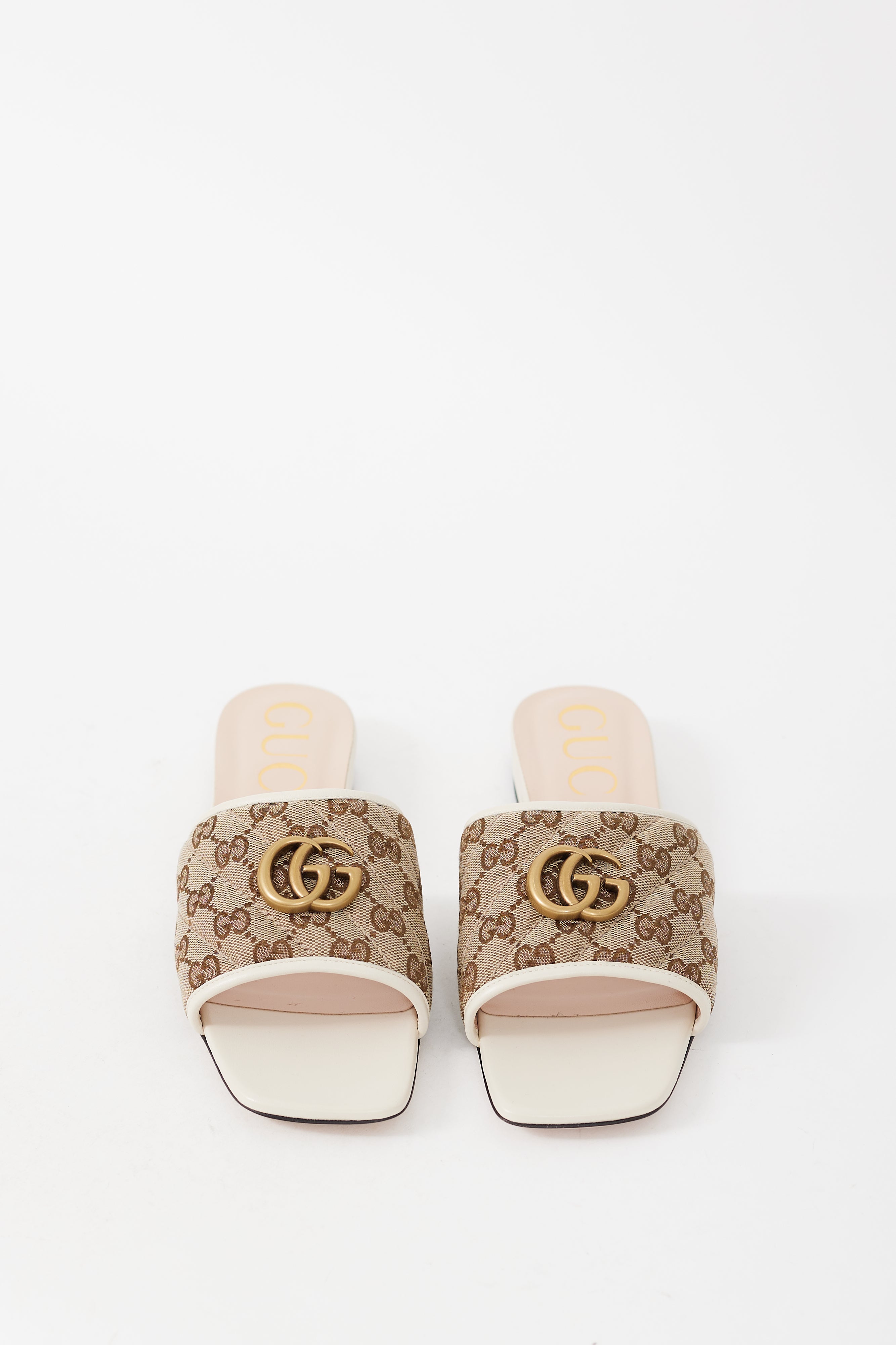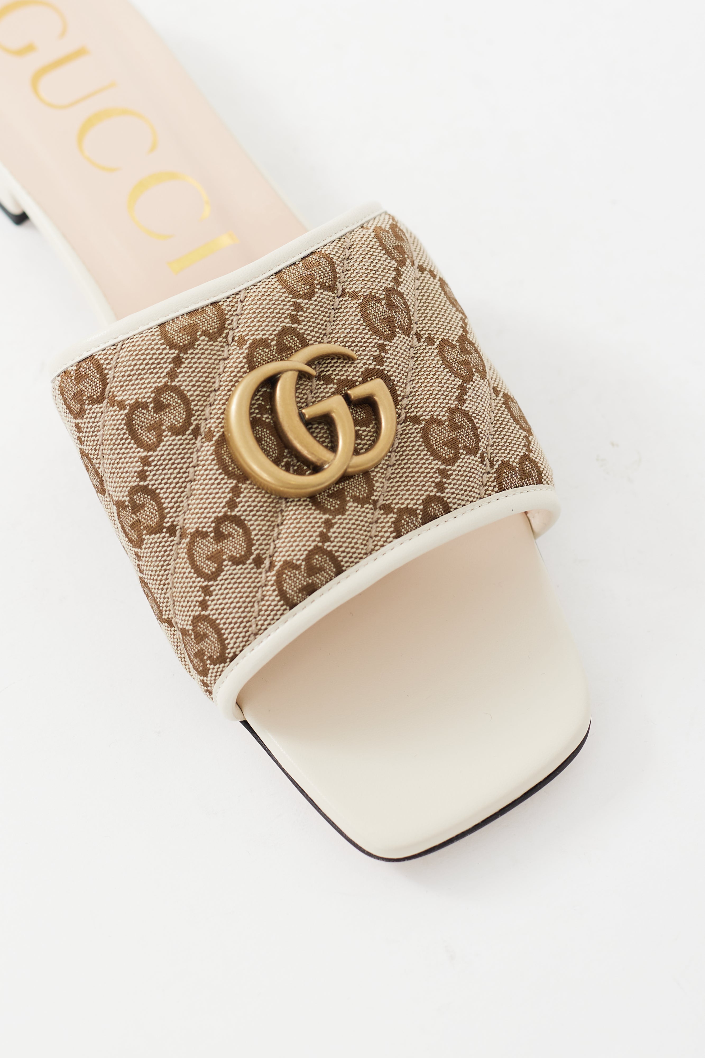Pre-owned Gucci cream and beige slides featuring an open square toe, beige and brown GG monogram canvas strap across vamp with gold tone GG Marmont hardware, leather trim and insole, and short covered heel. Comes with original box and dust bag.
