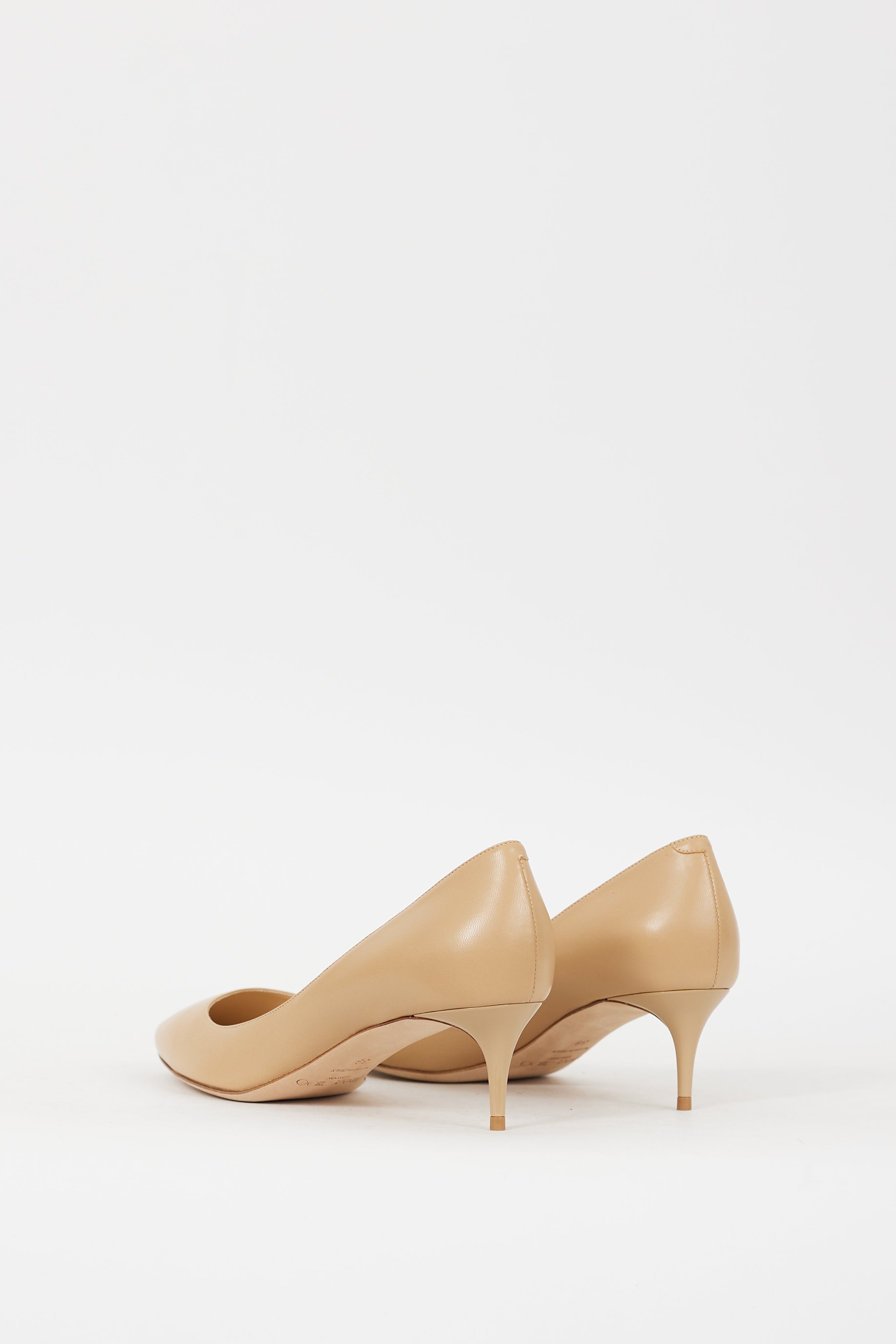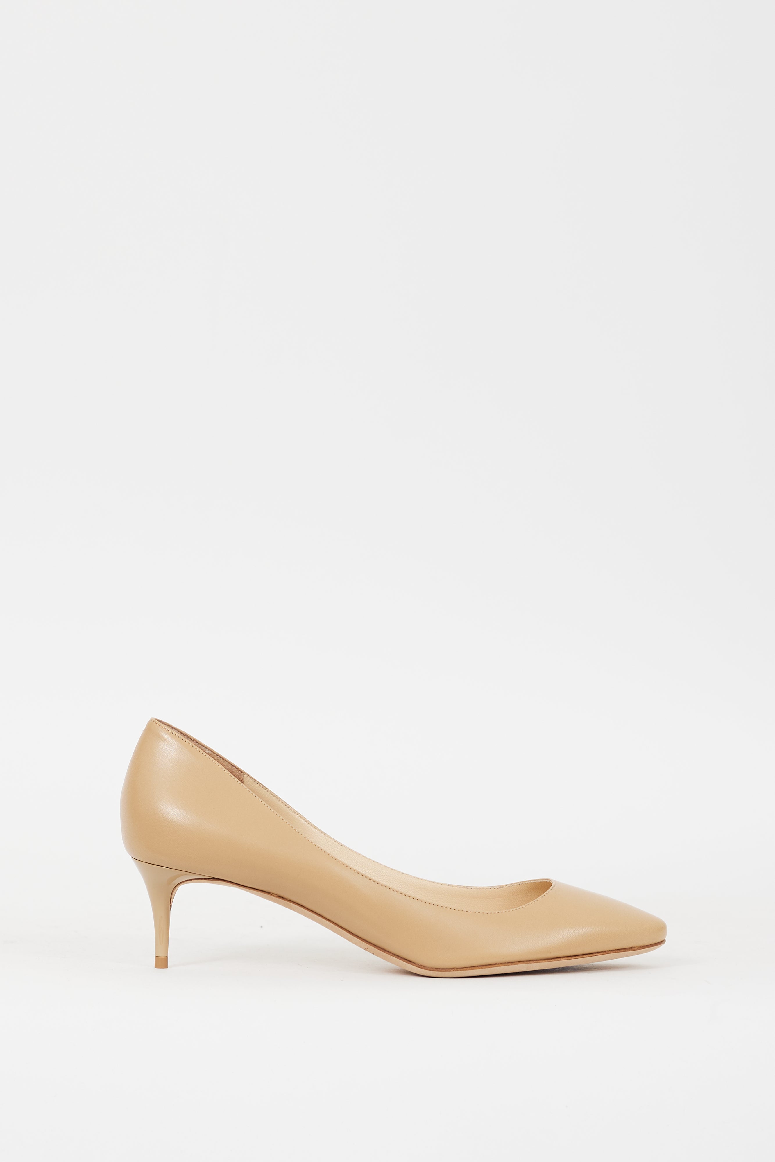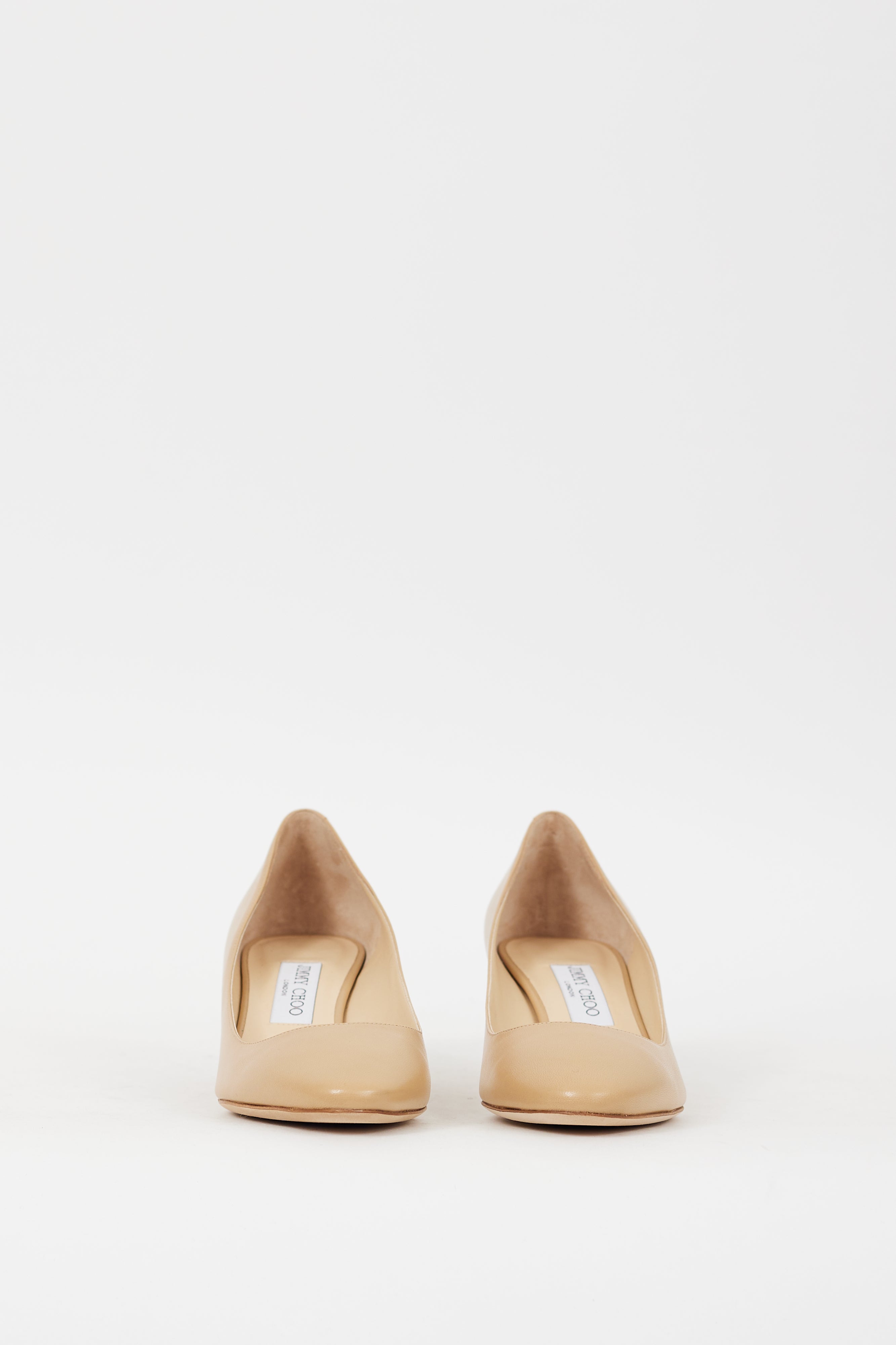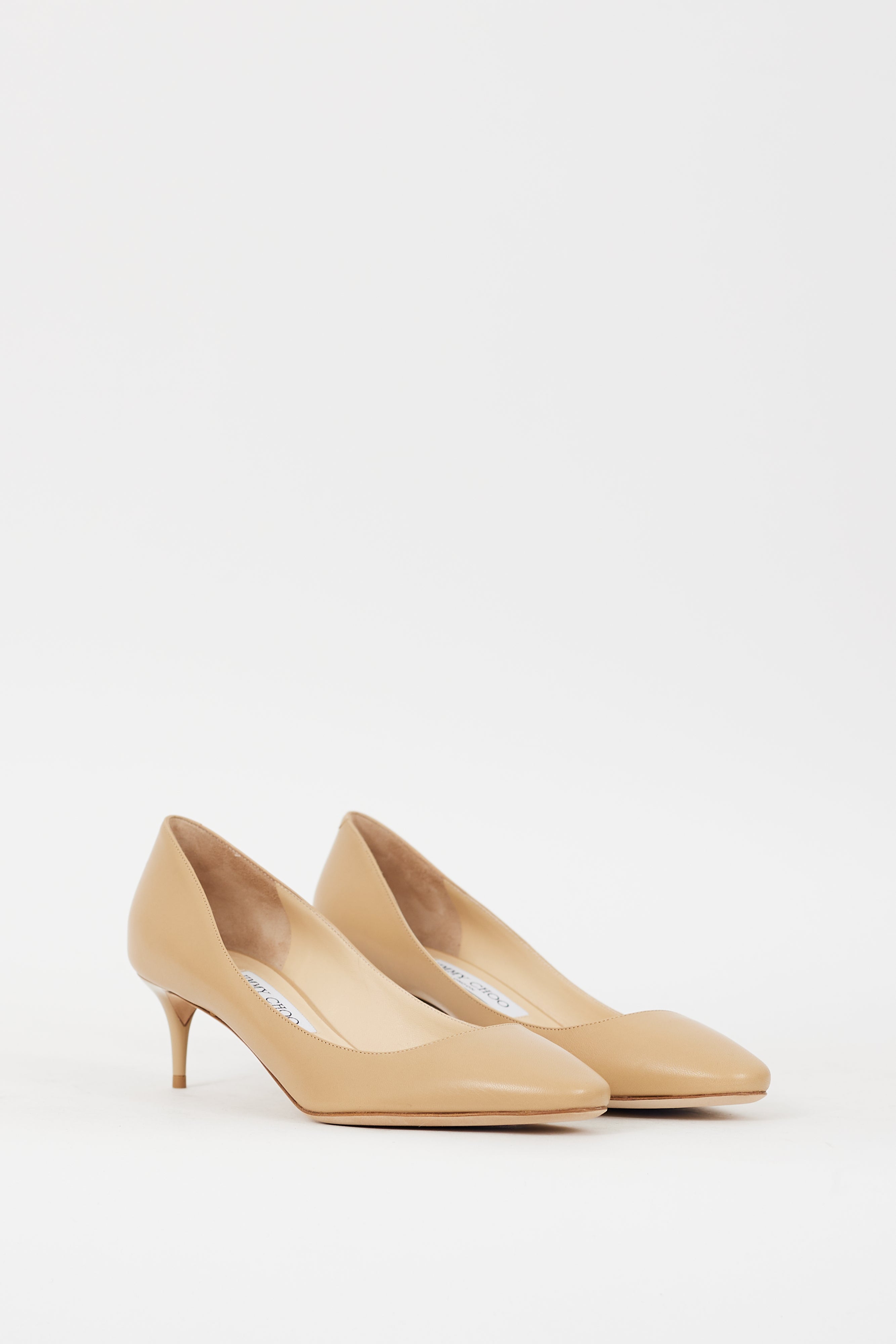Pre-owned Jimmy Choo beige leather pumps featuring an almond toe, slip on entry, and lacquered kitten heel.