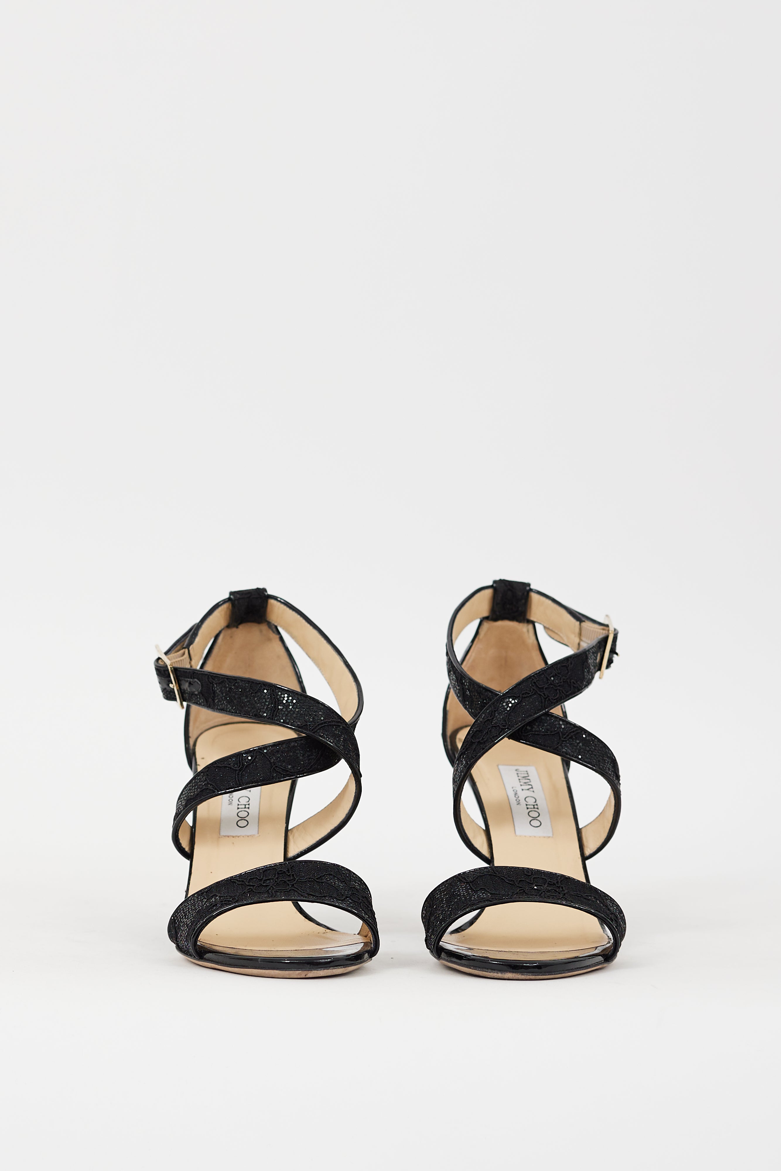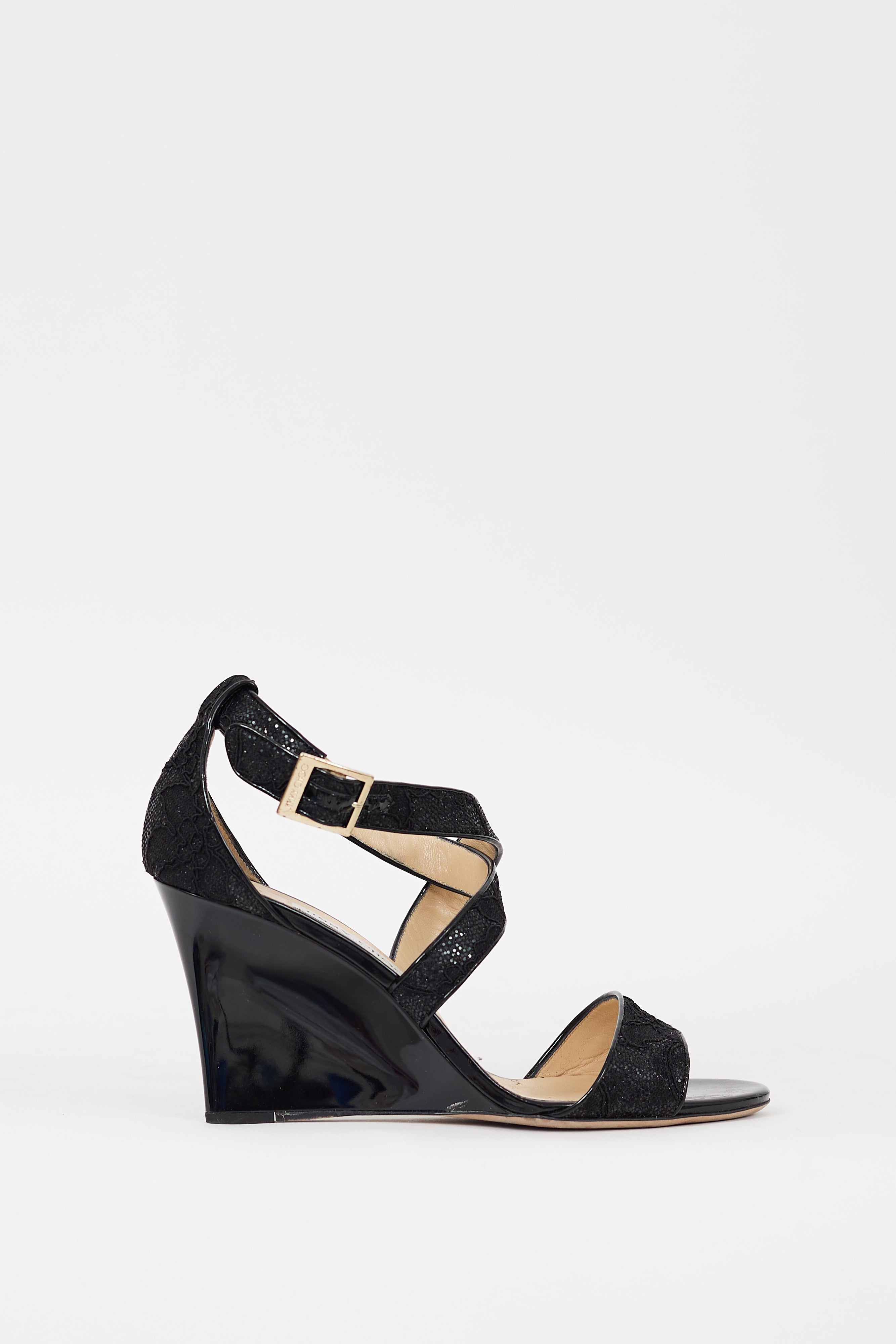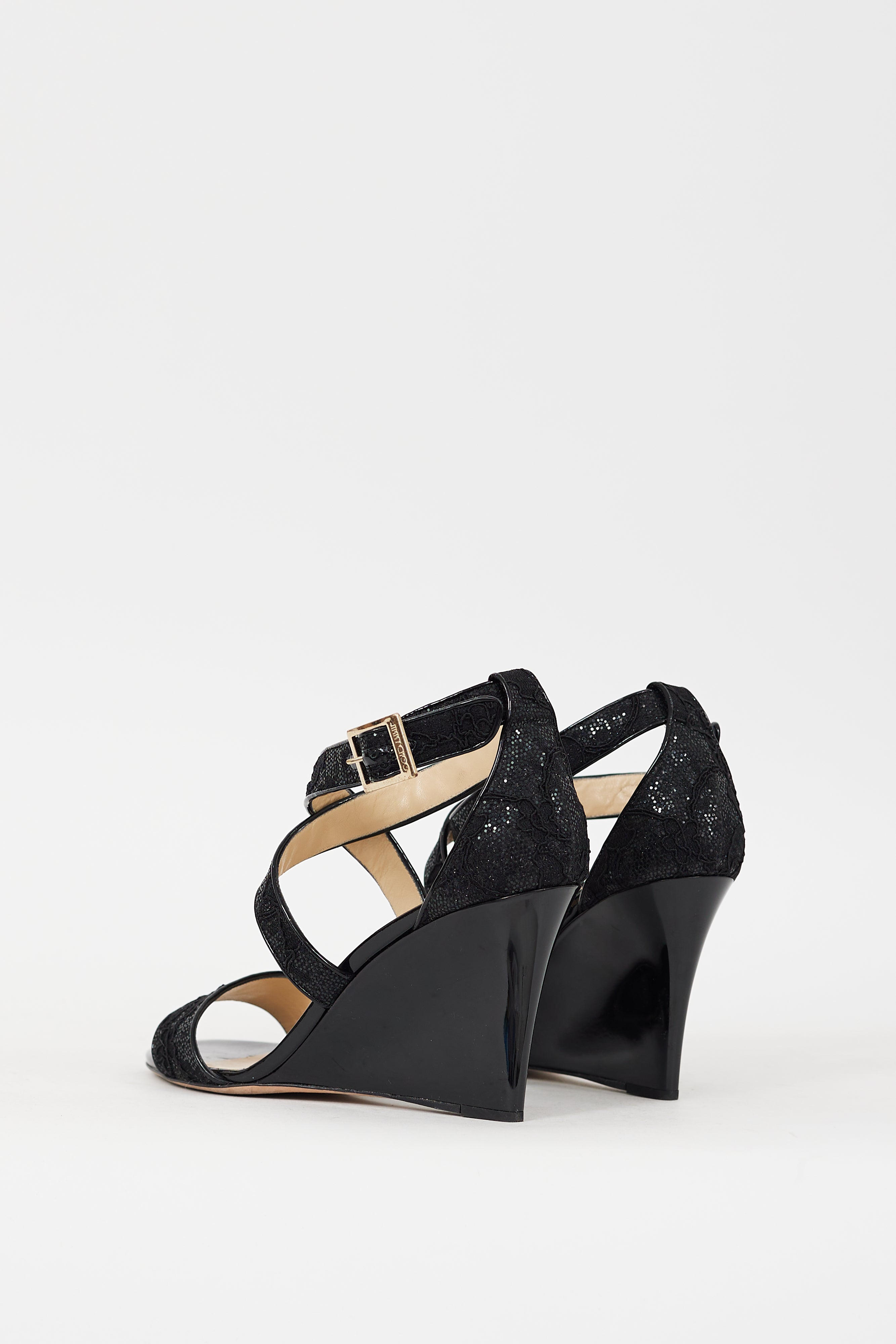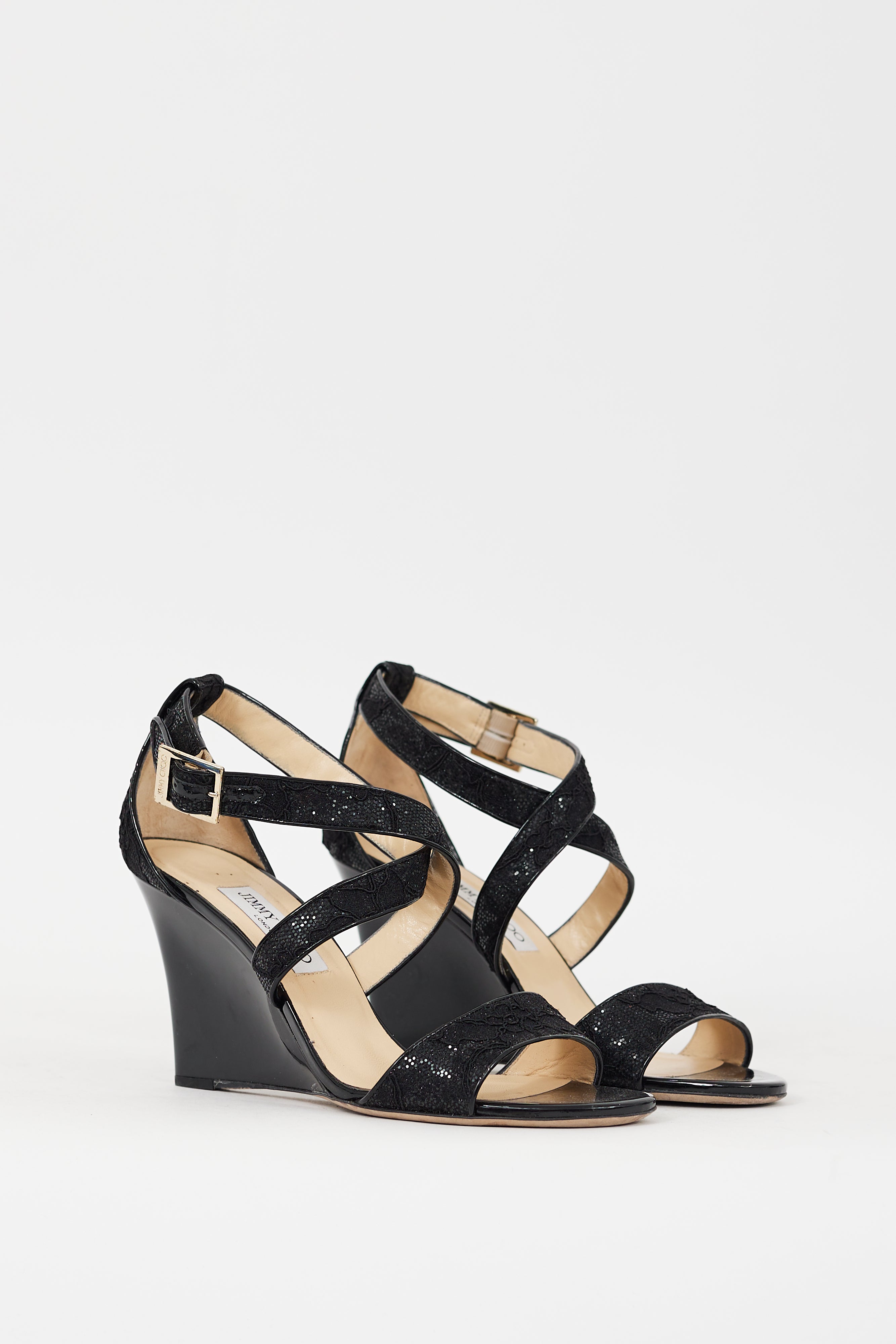 Pre-owned Jimmy Choo black Fearne wedges featuring an open round toe, glitter and floral lace upper, strap across vamp, adjustable criss cross ankle cage, and patent leather covered wedge heel.