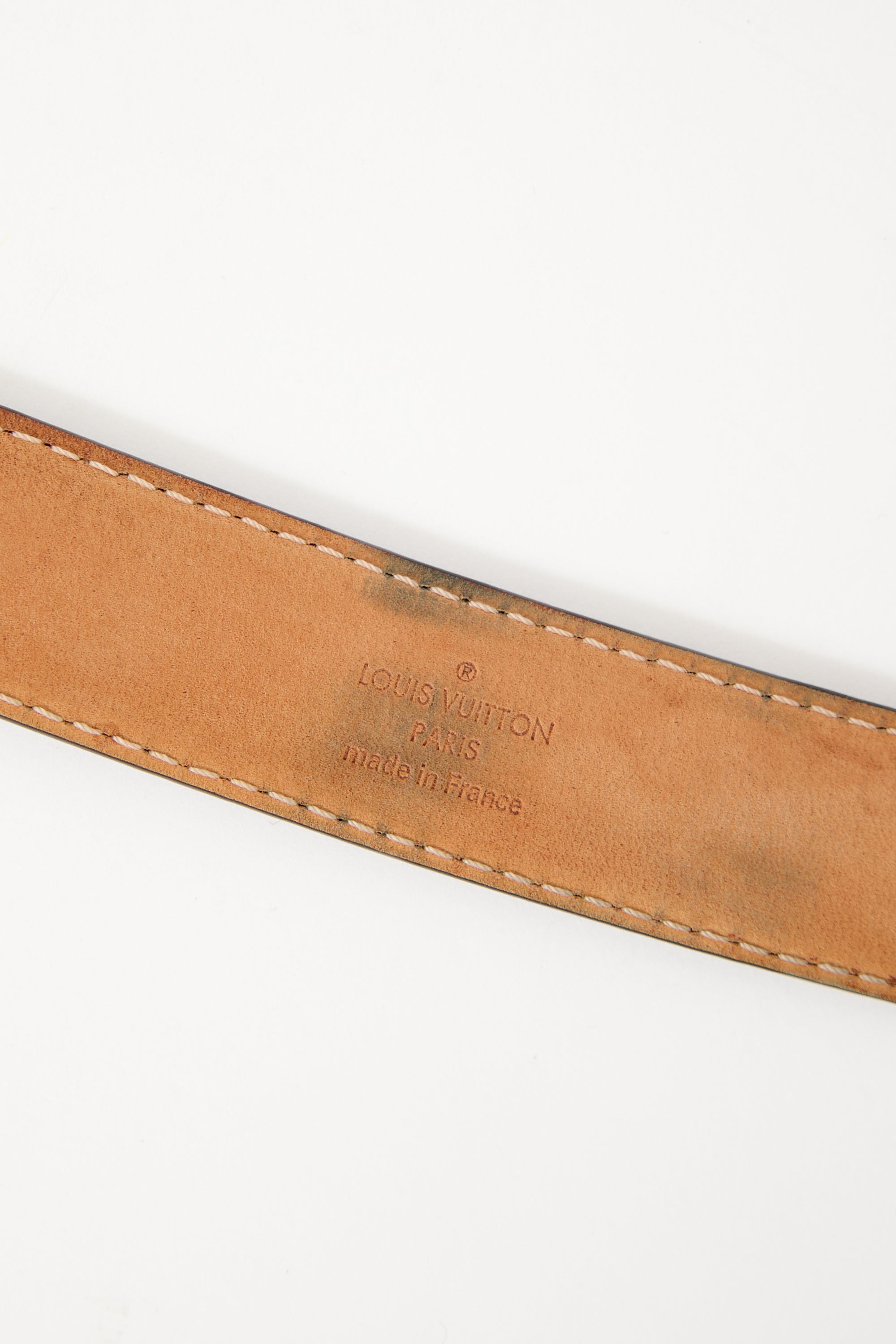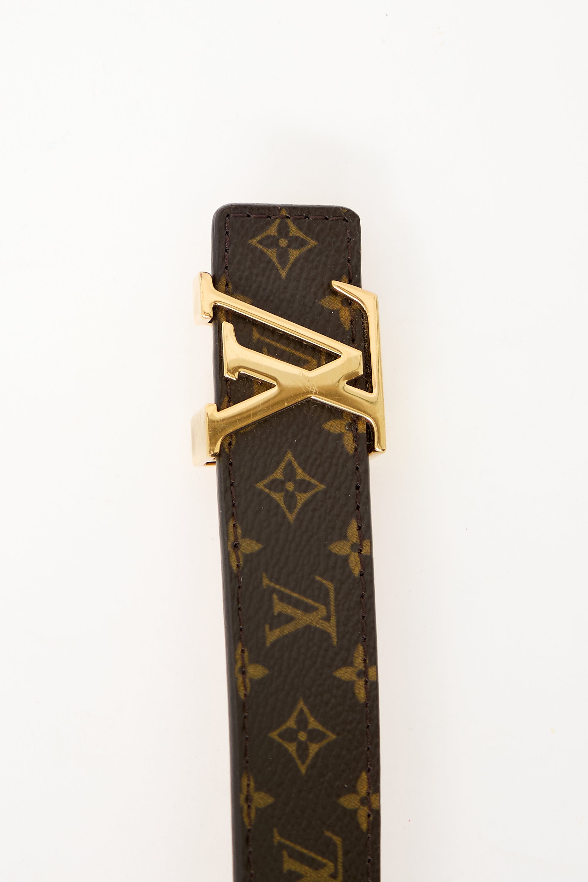 Pre-owned Louis Vuitton 2013 Iconic reversible belt in brown coated canvas monogram featuring gold tone hardware, LV push pin buckle, and a Vachetta leather reverse.