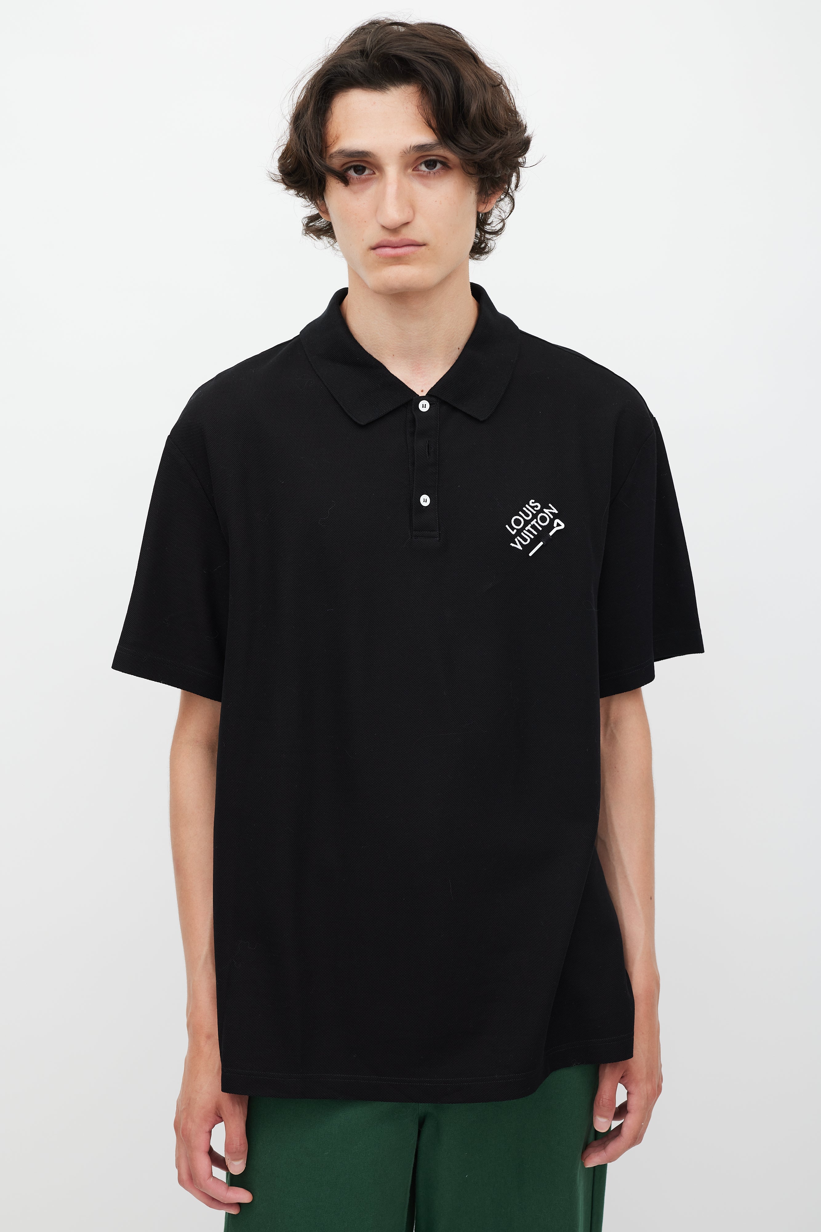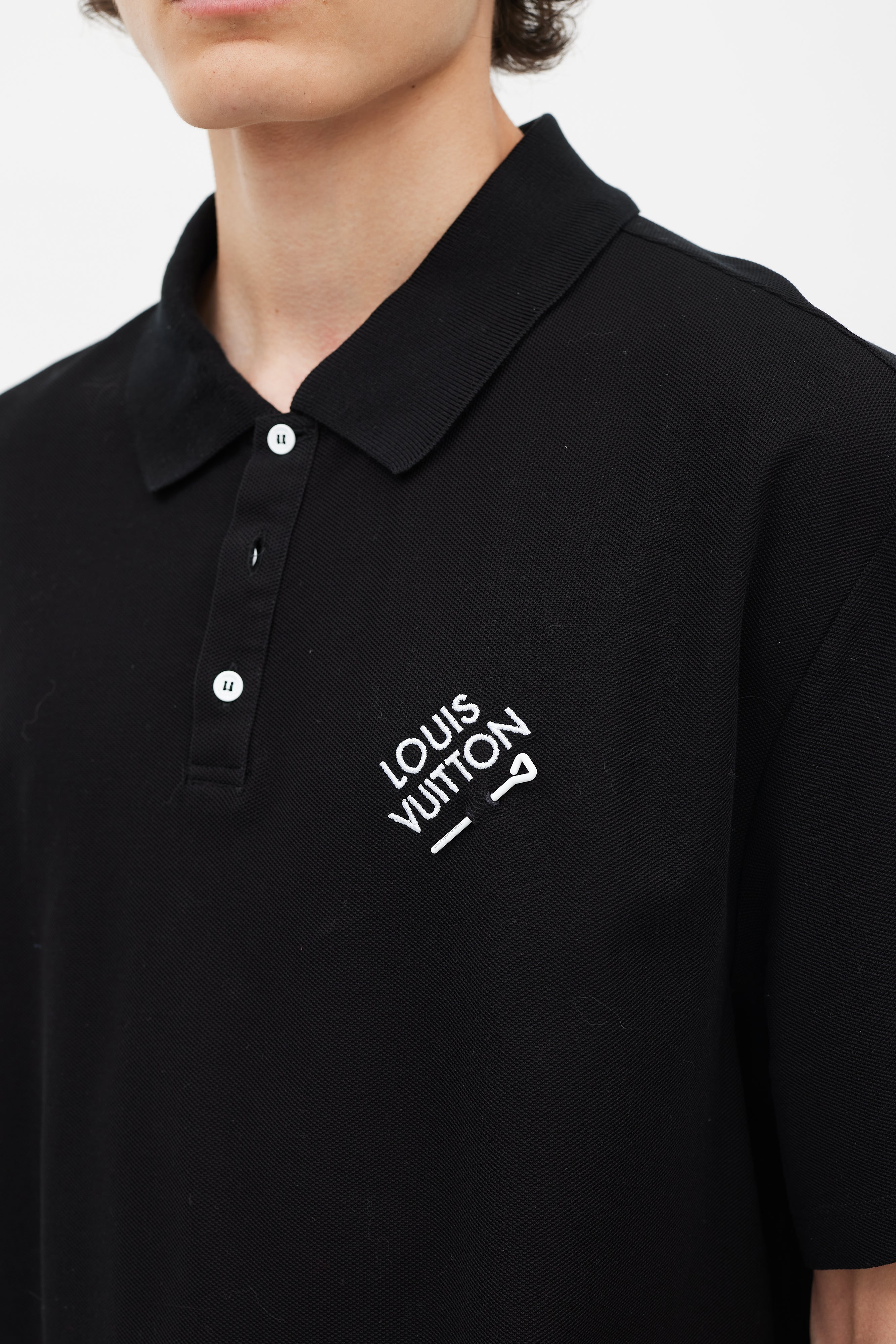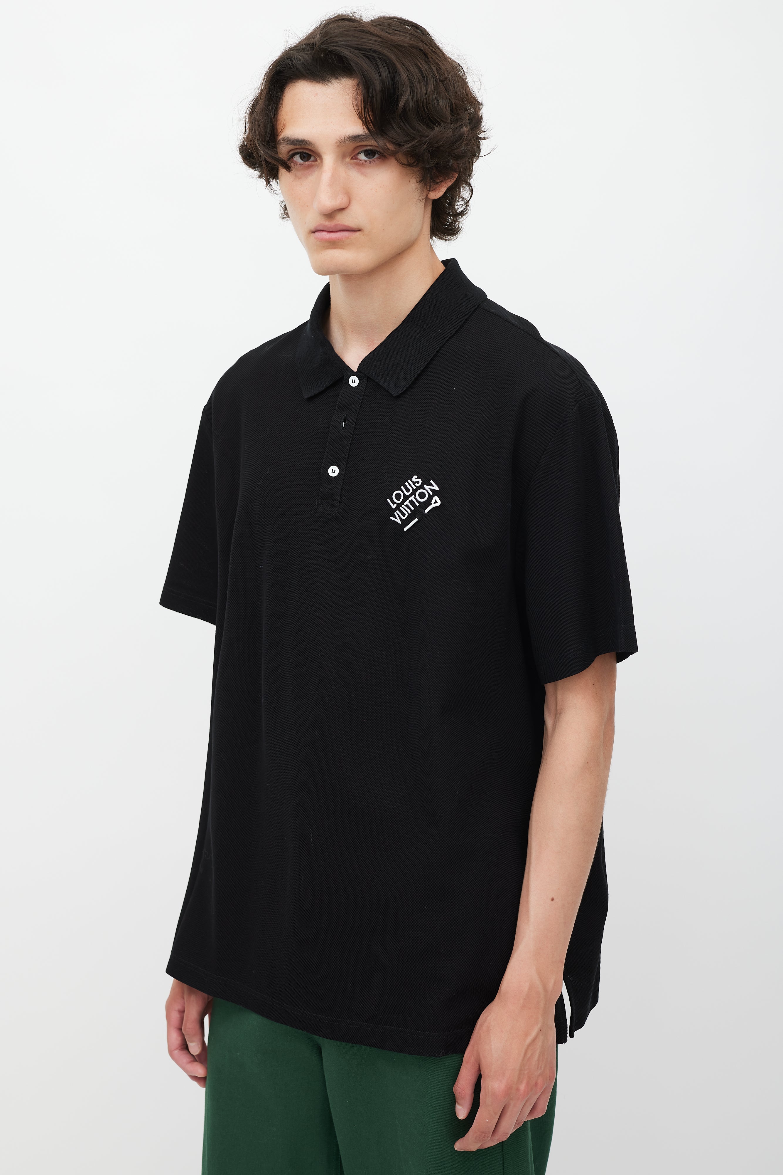 Pre-owned Louis Vuitton black polo shirt featuring a white embroidered logo at chest with removable tonal hardware, pointed collar, short sleeves, and quarter button up closure.