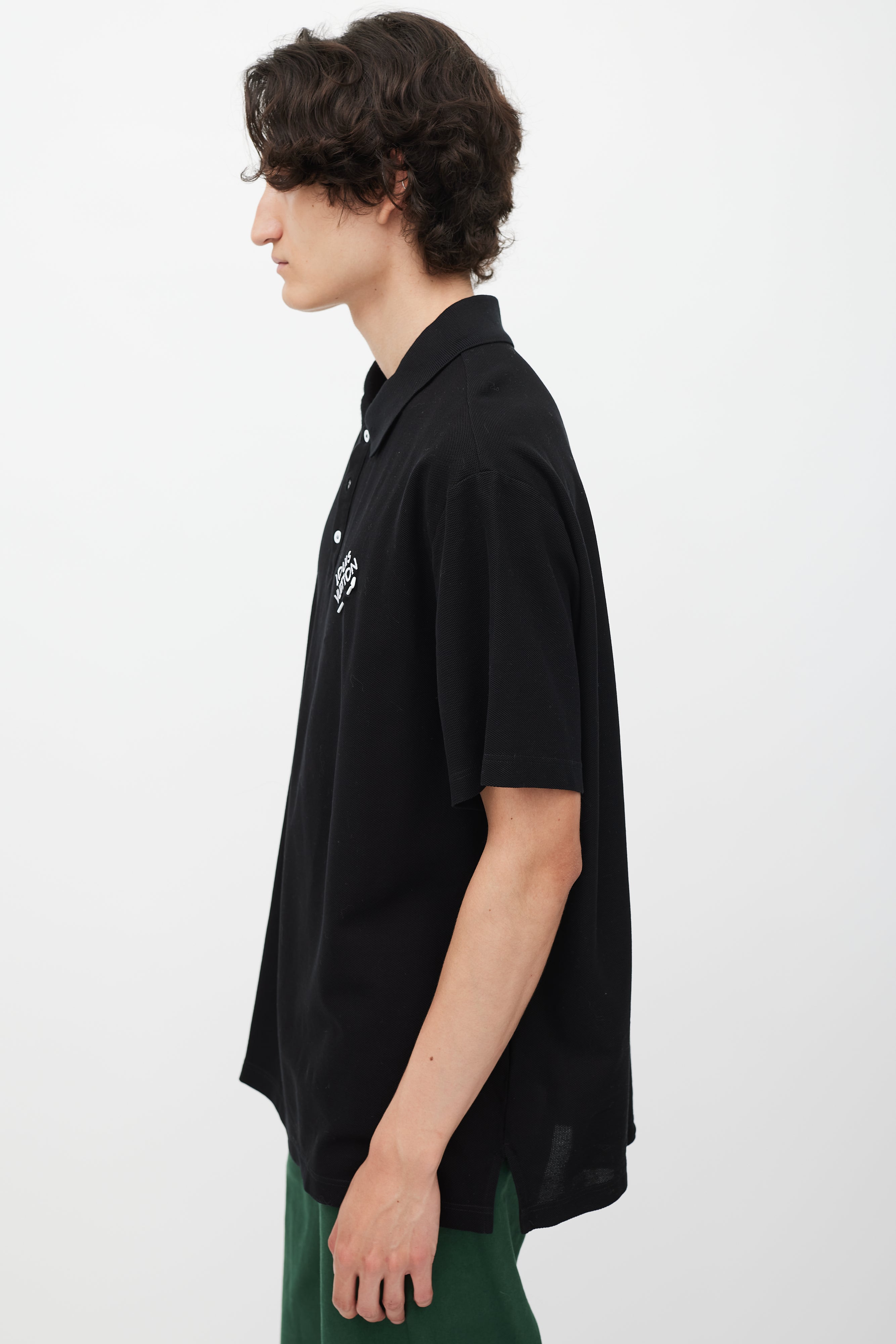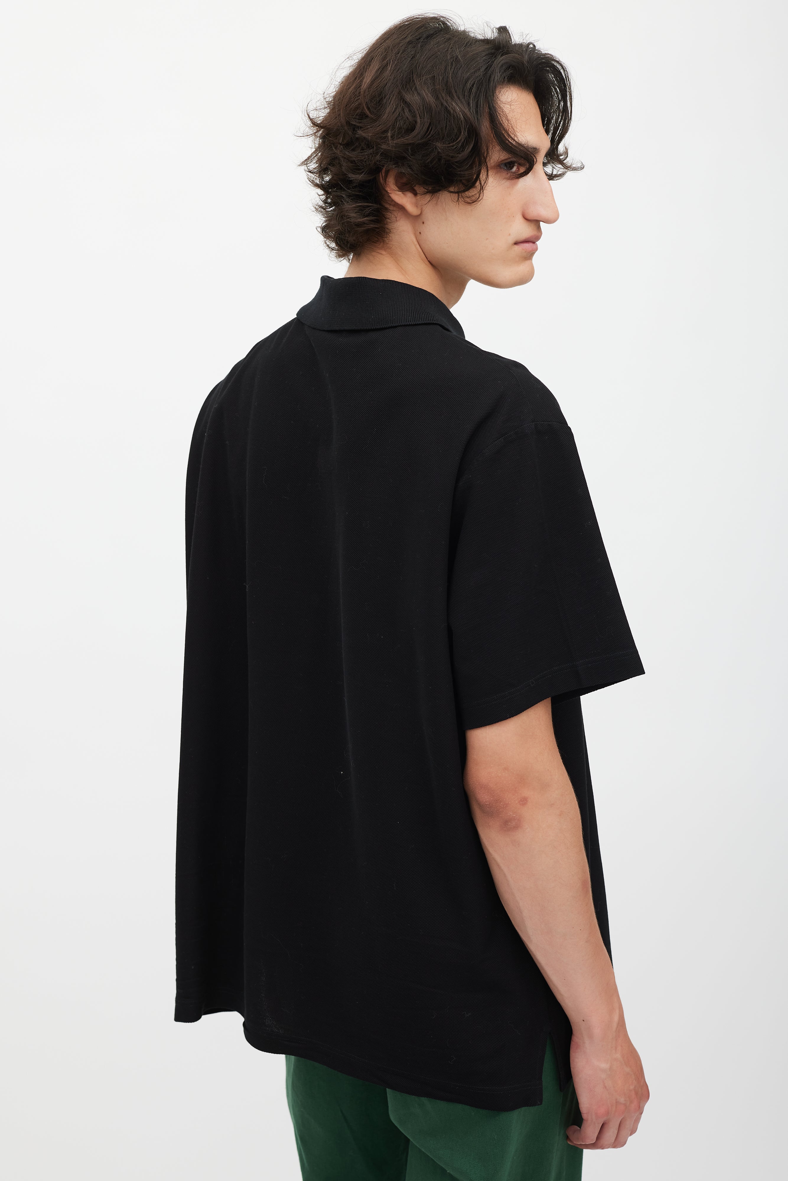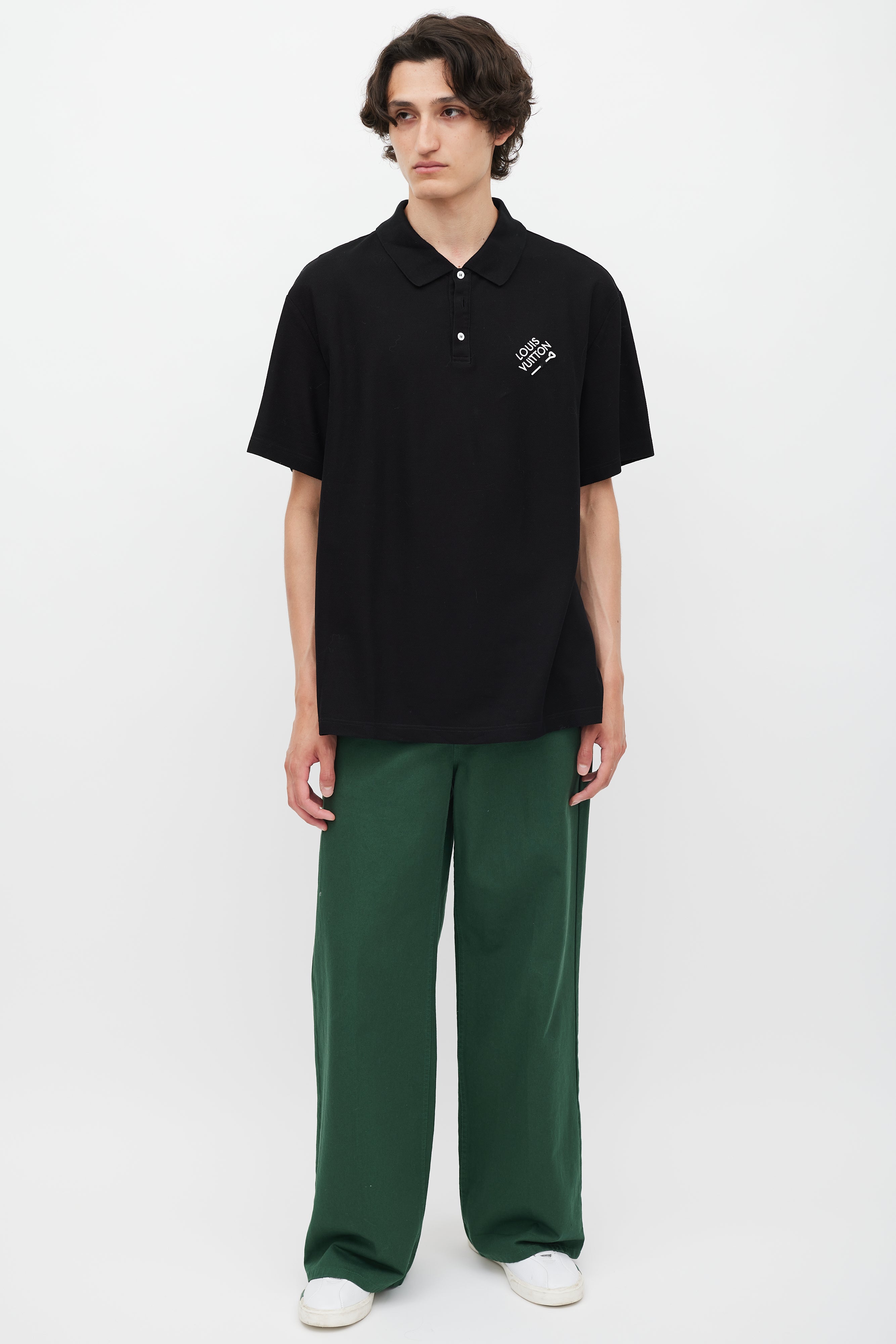 Pre-owned Louis Vuitton black polo shirt featuring a white embroidered logo at chest with removable tonal hardware, pointed collar, short sleeves, and quarter button up closure.