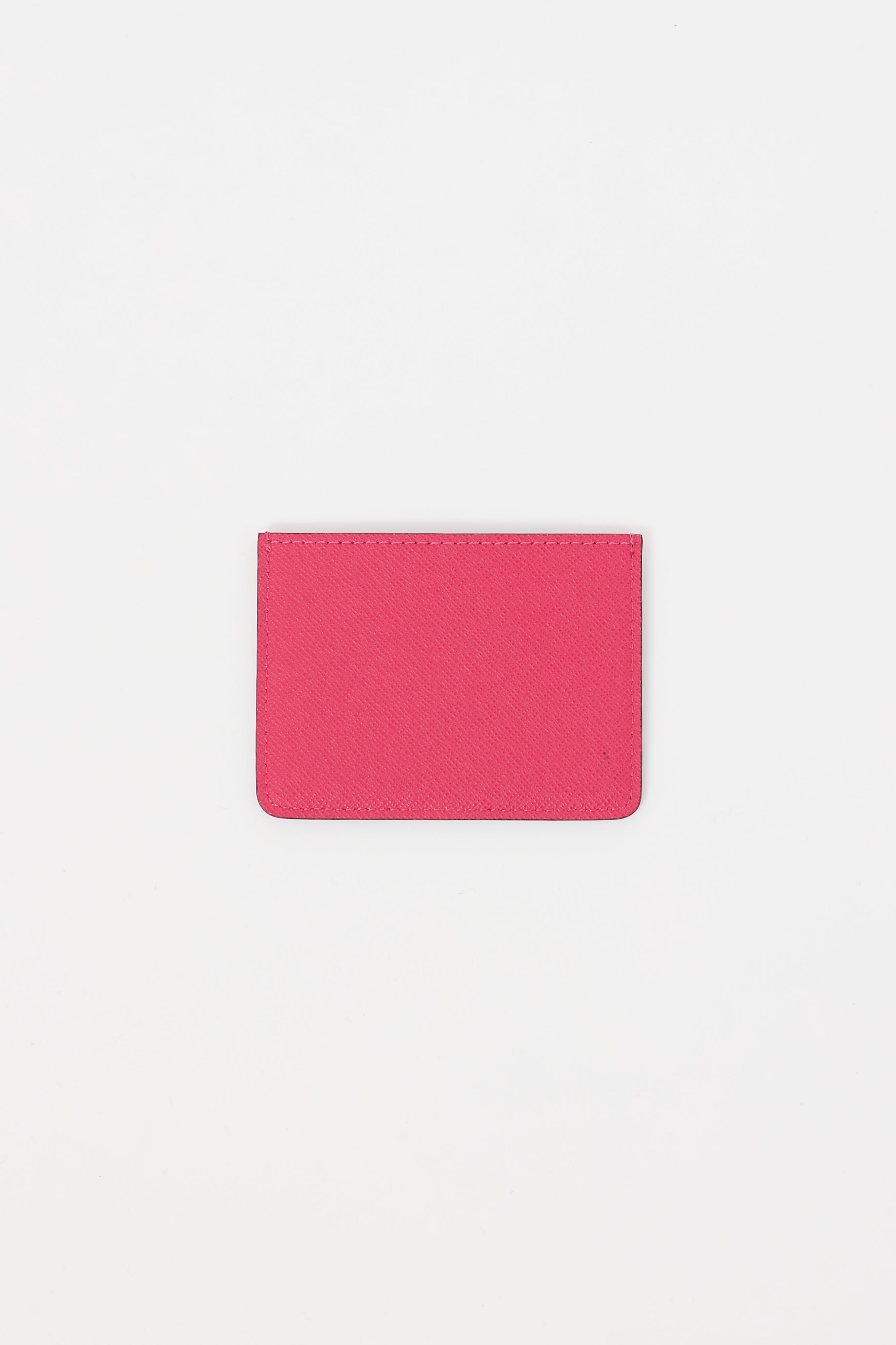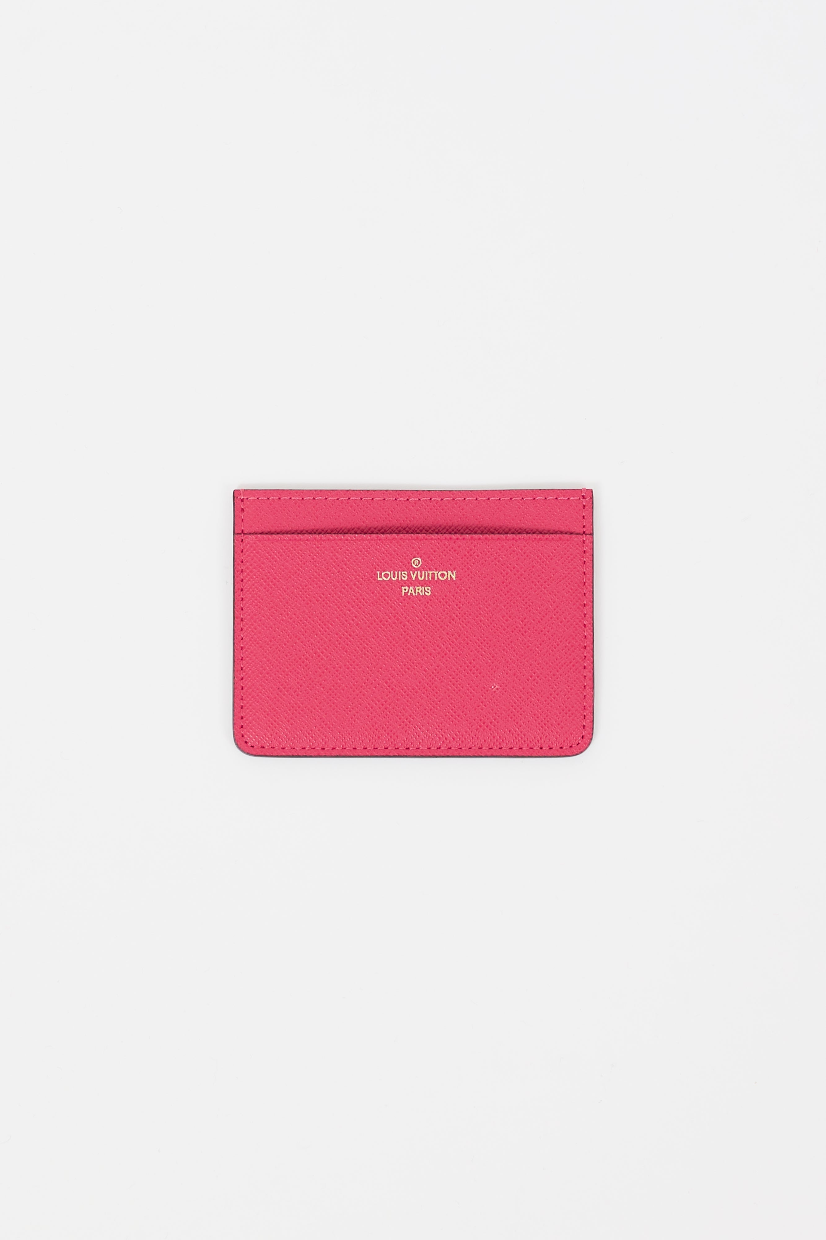 Pre-owned Louis Vuitton fuchsia grained leather cardholder featuring gold stamped logo at front, one slip pocket at front, and one slip pocket at centre. Hand authenticated by VSP.