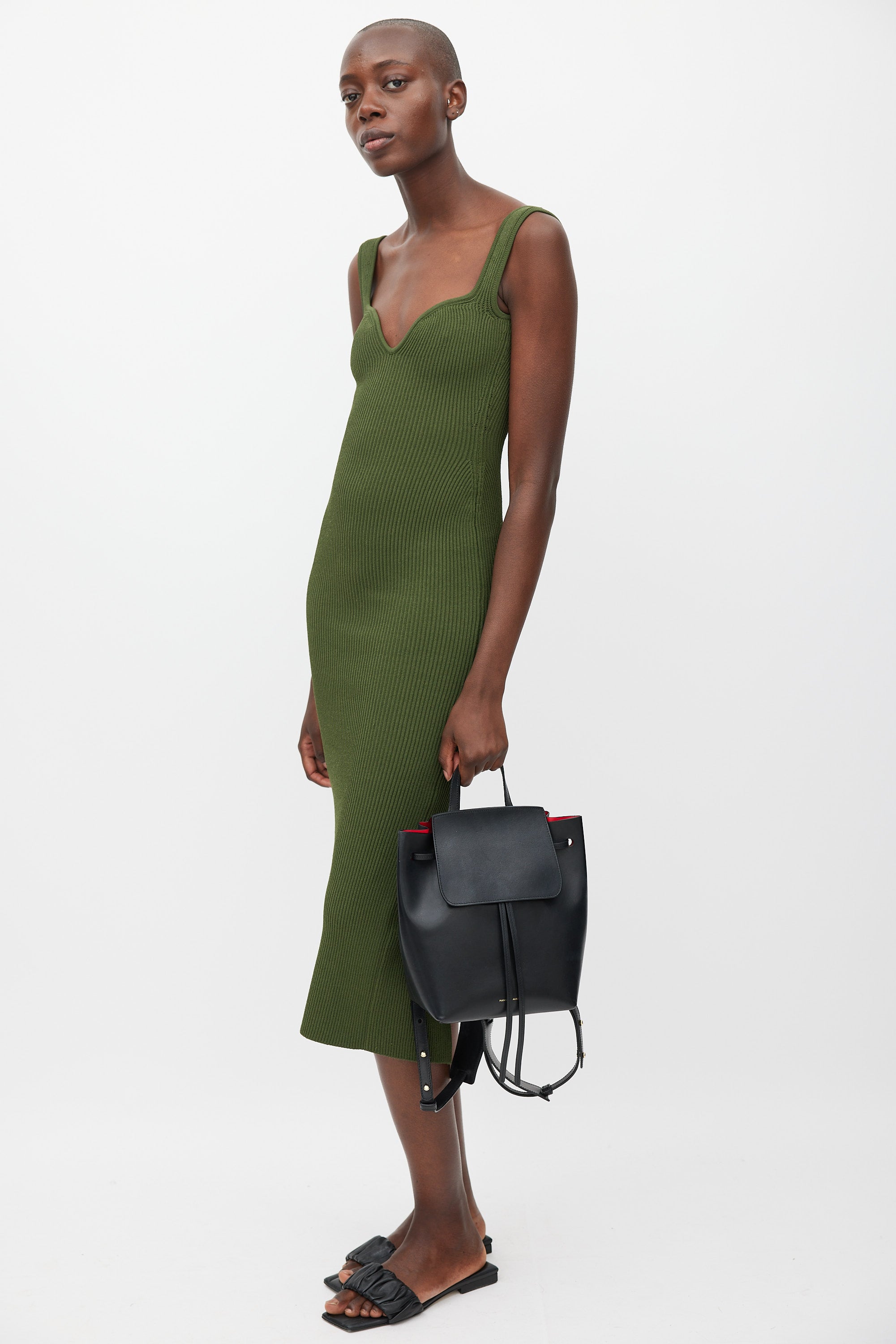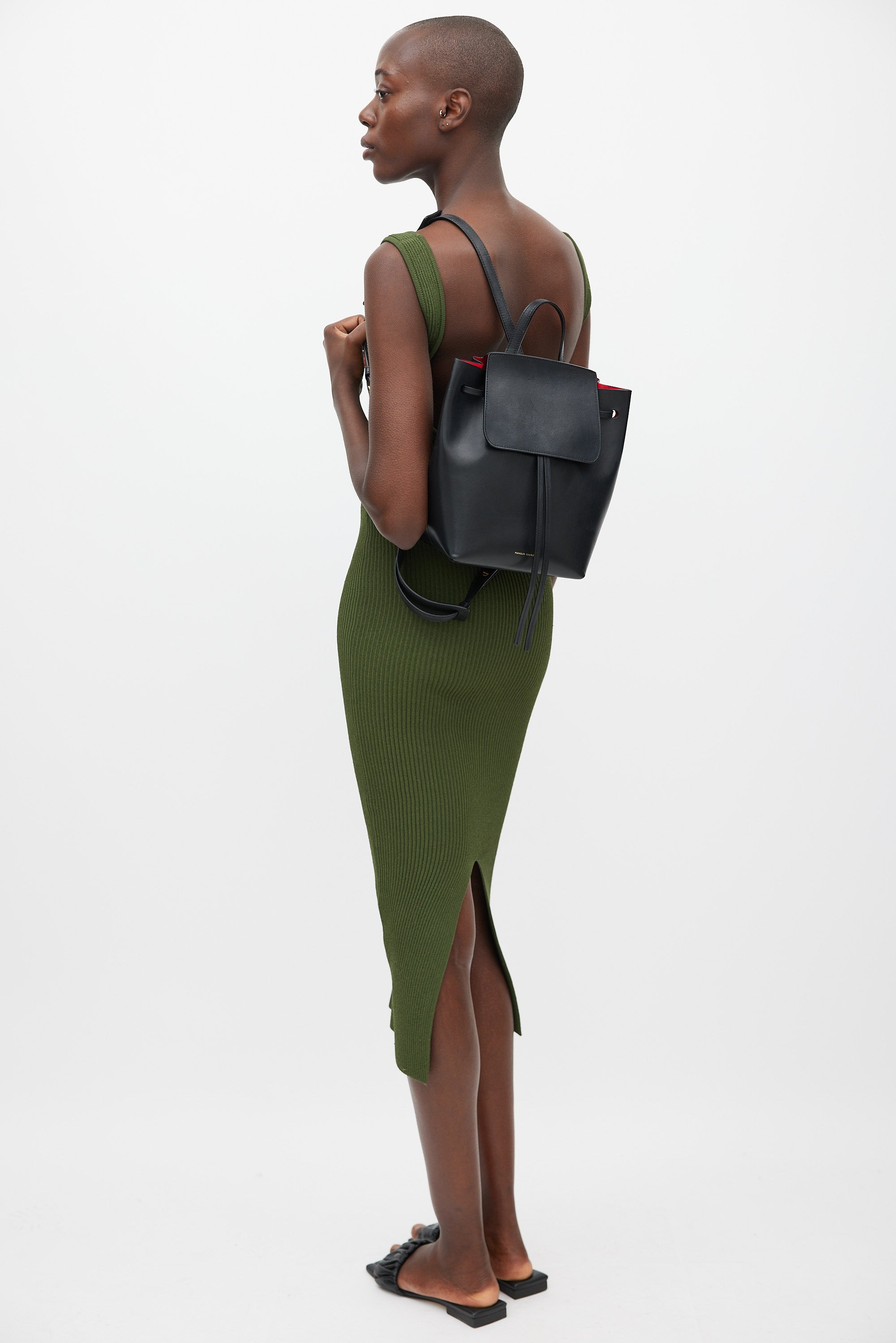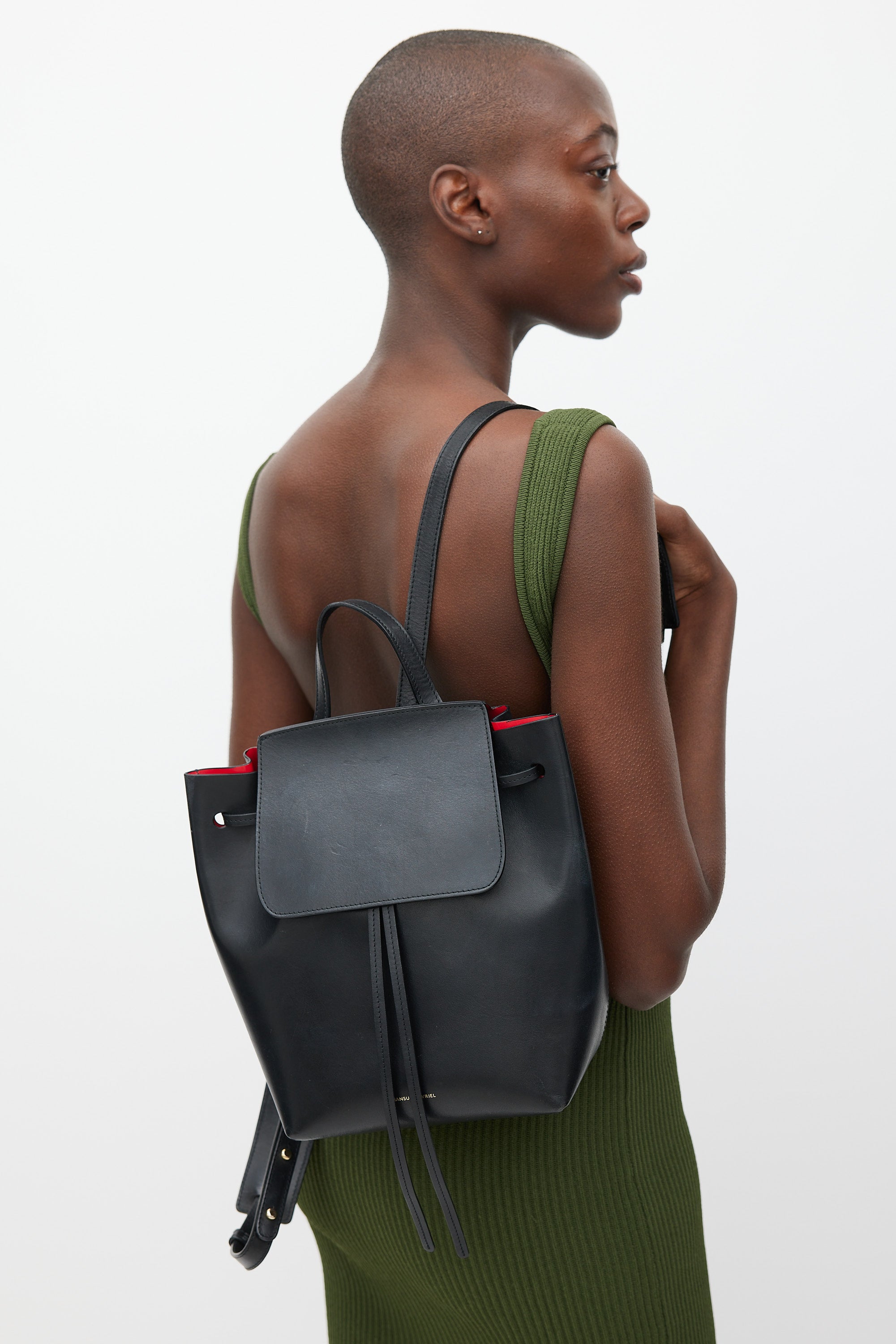 Pre-owned Mansur Gavriel black leather backpack featuring an embossed logo at front, top flap, one top handle, one main compartment with one zip pocket, adjustable shoulder straps, and front cinch closure. Comes with original dust bag.