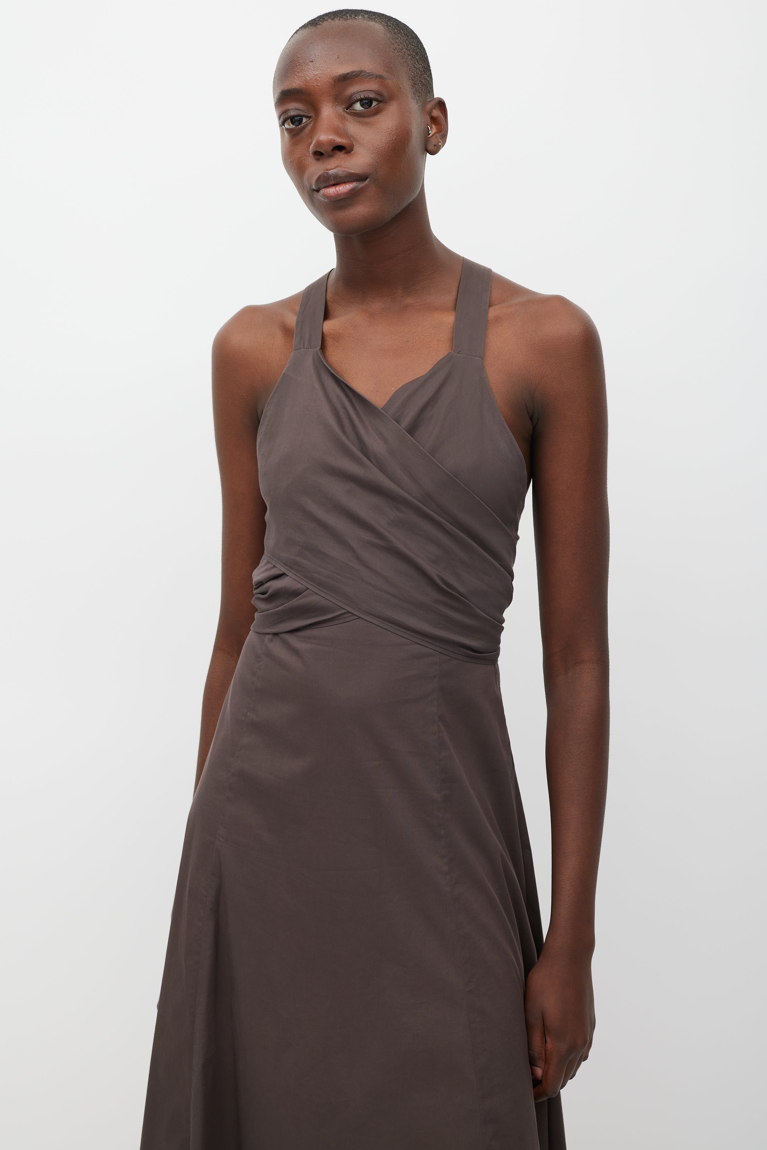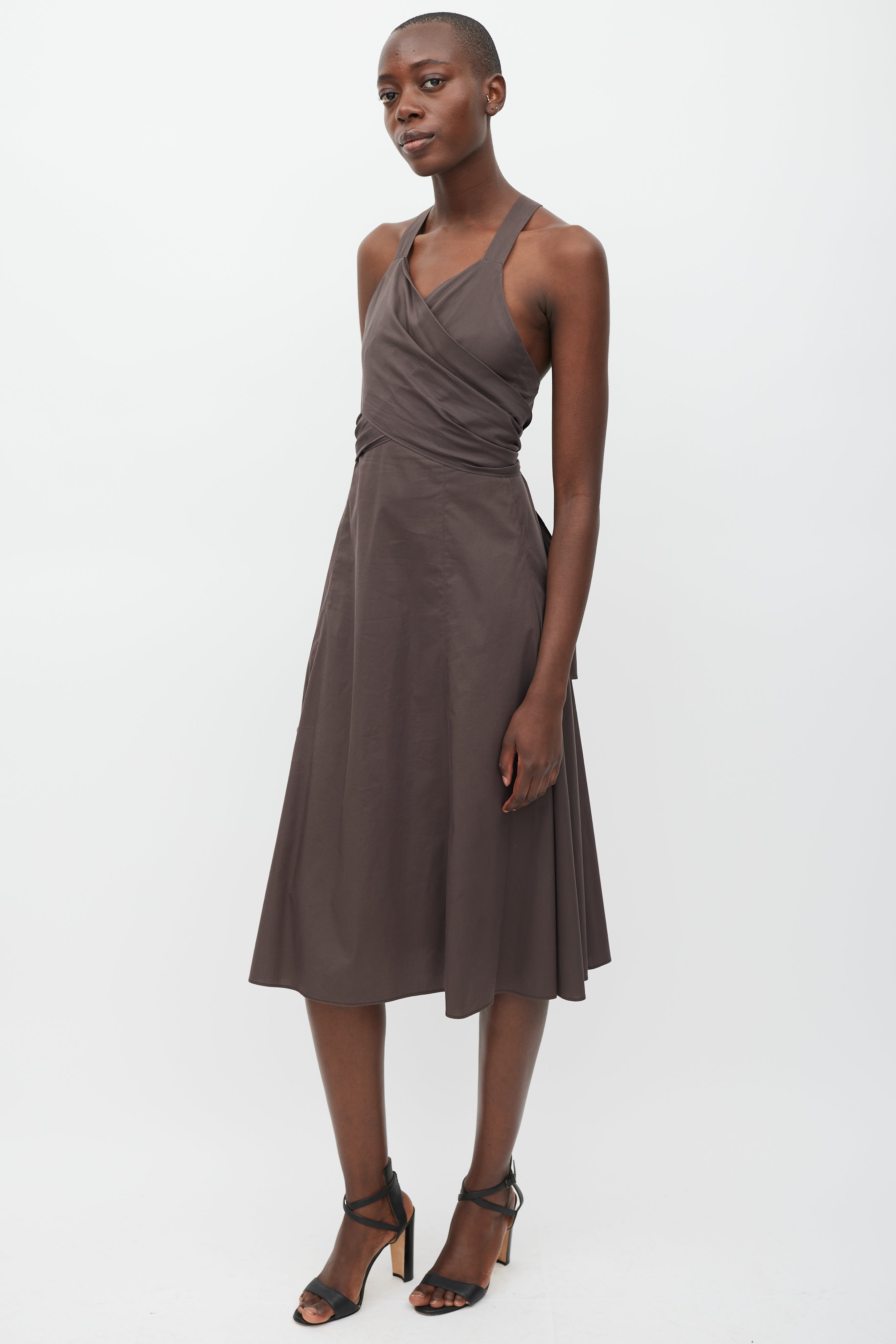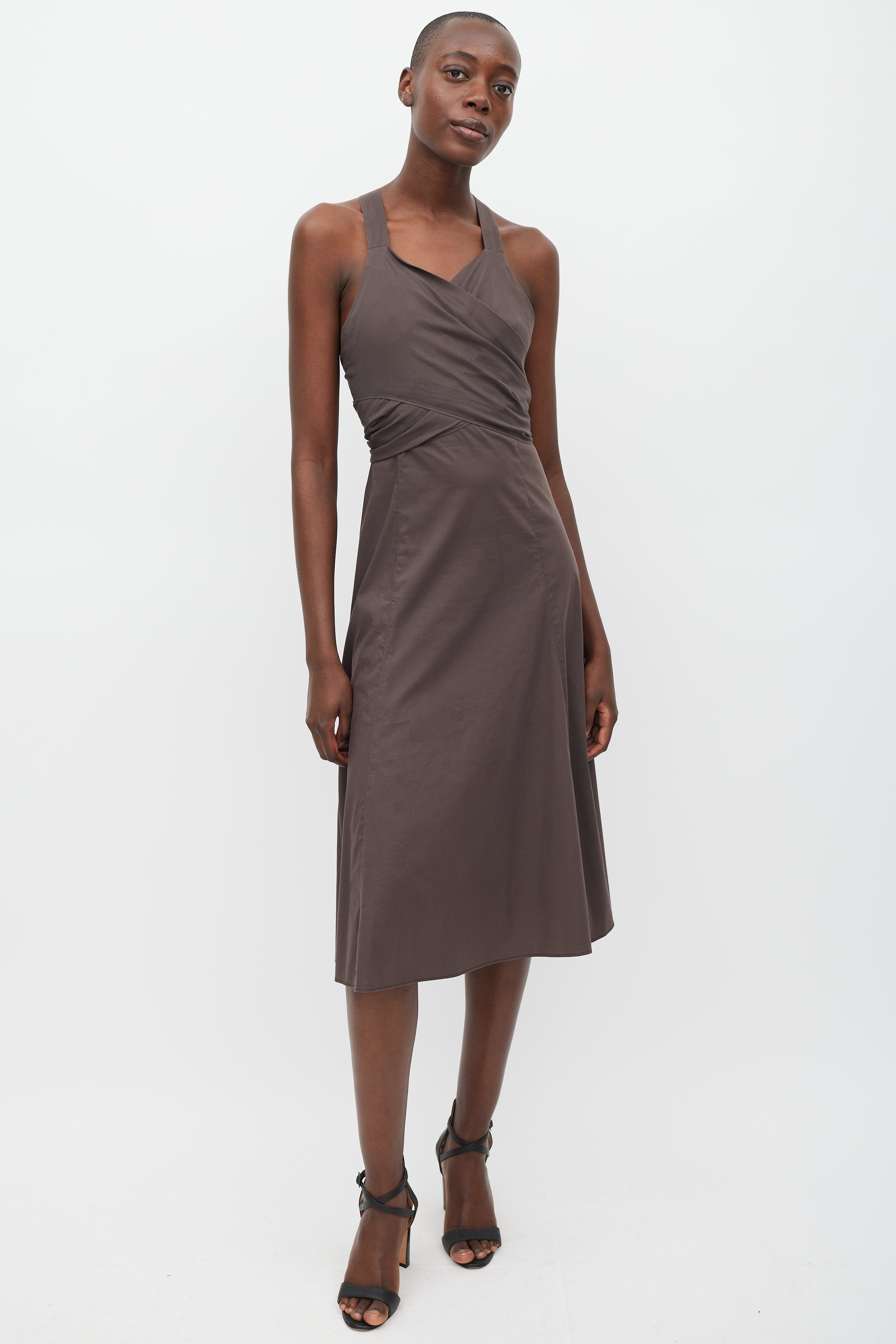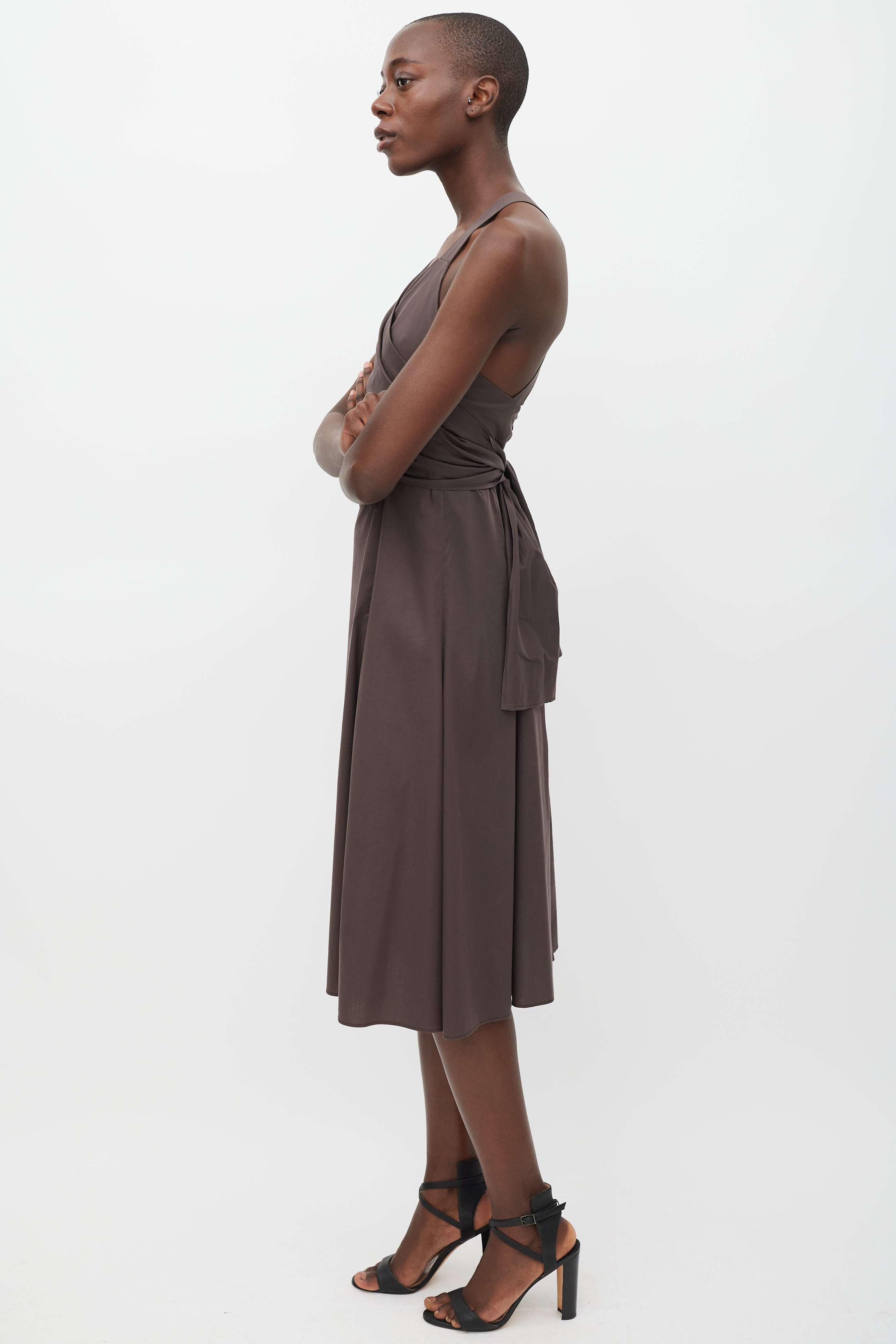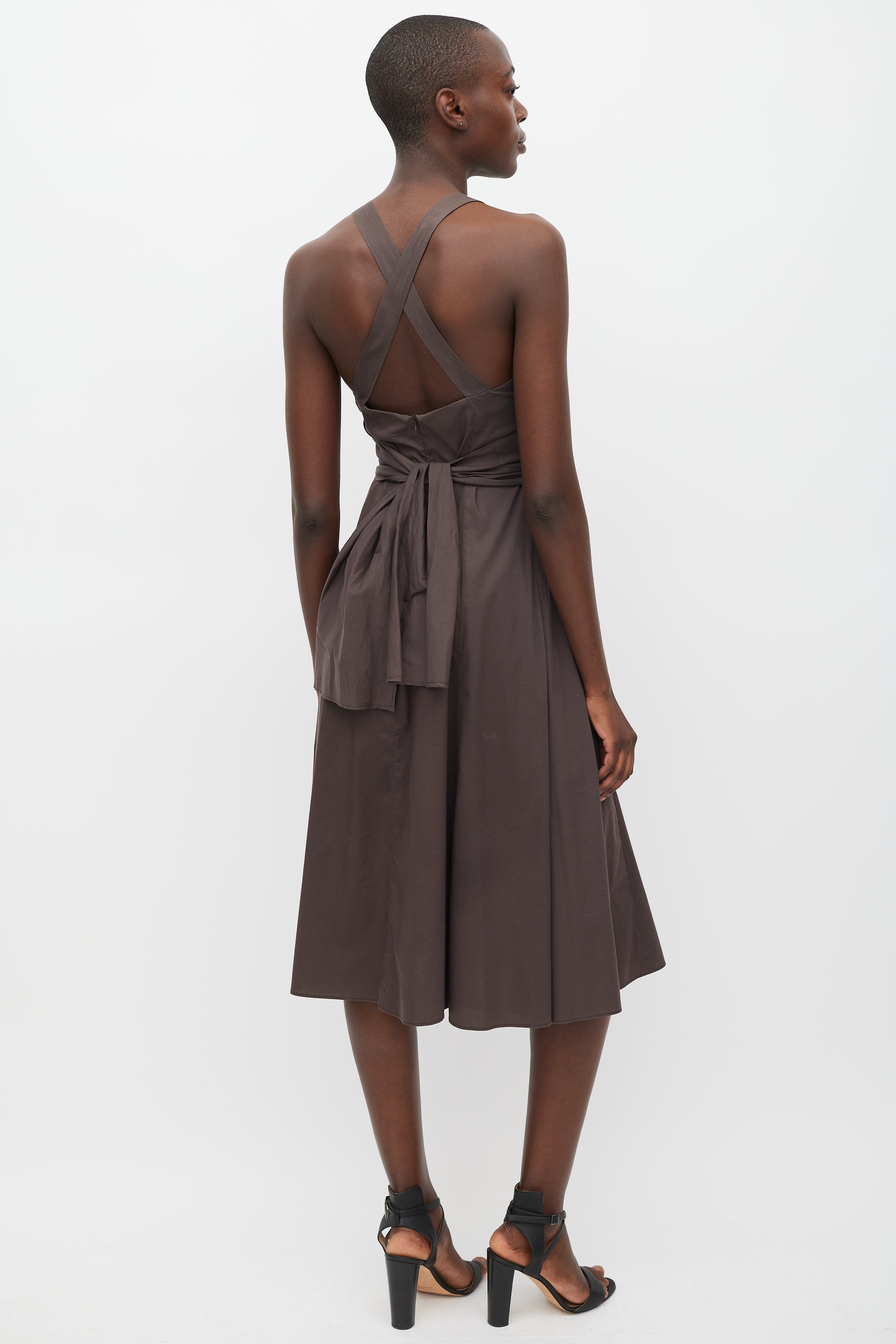 Pre-owned Max Mara brown cotton blend sleeveless midi dress featuring a V-neckline, tie front, panelled construction, A-line design, crossed straps, and concealed back zip closure.
