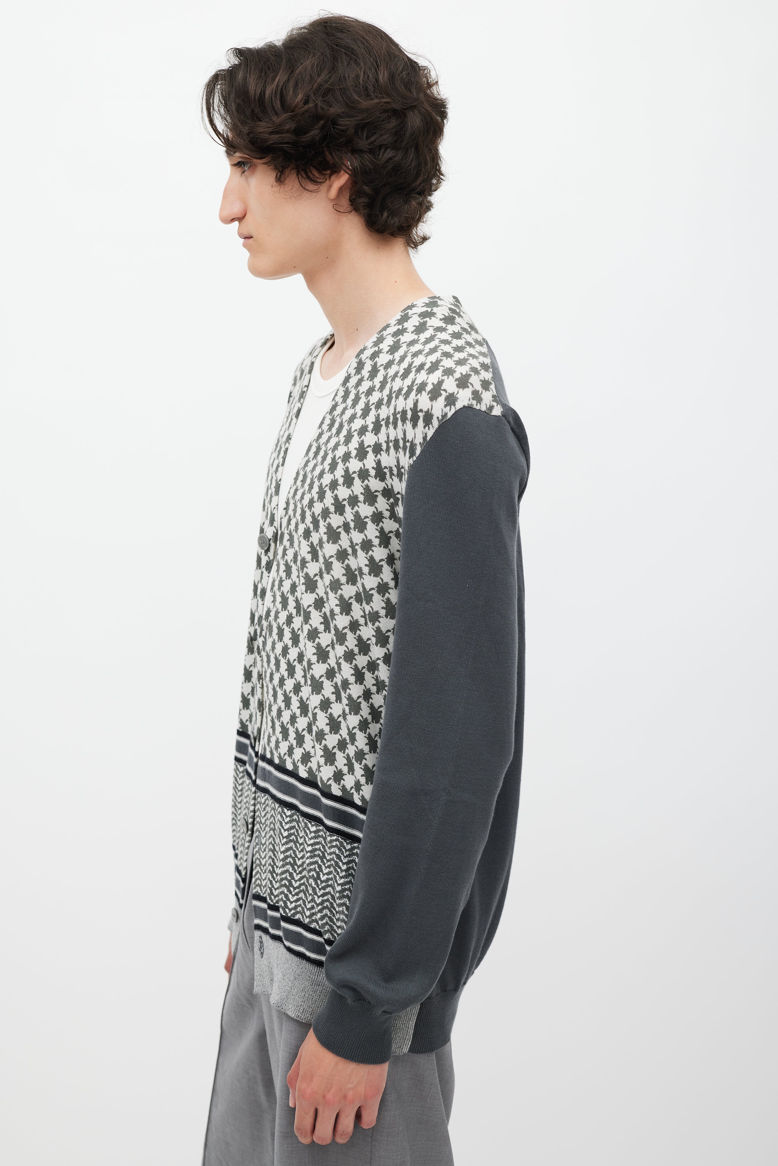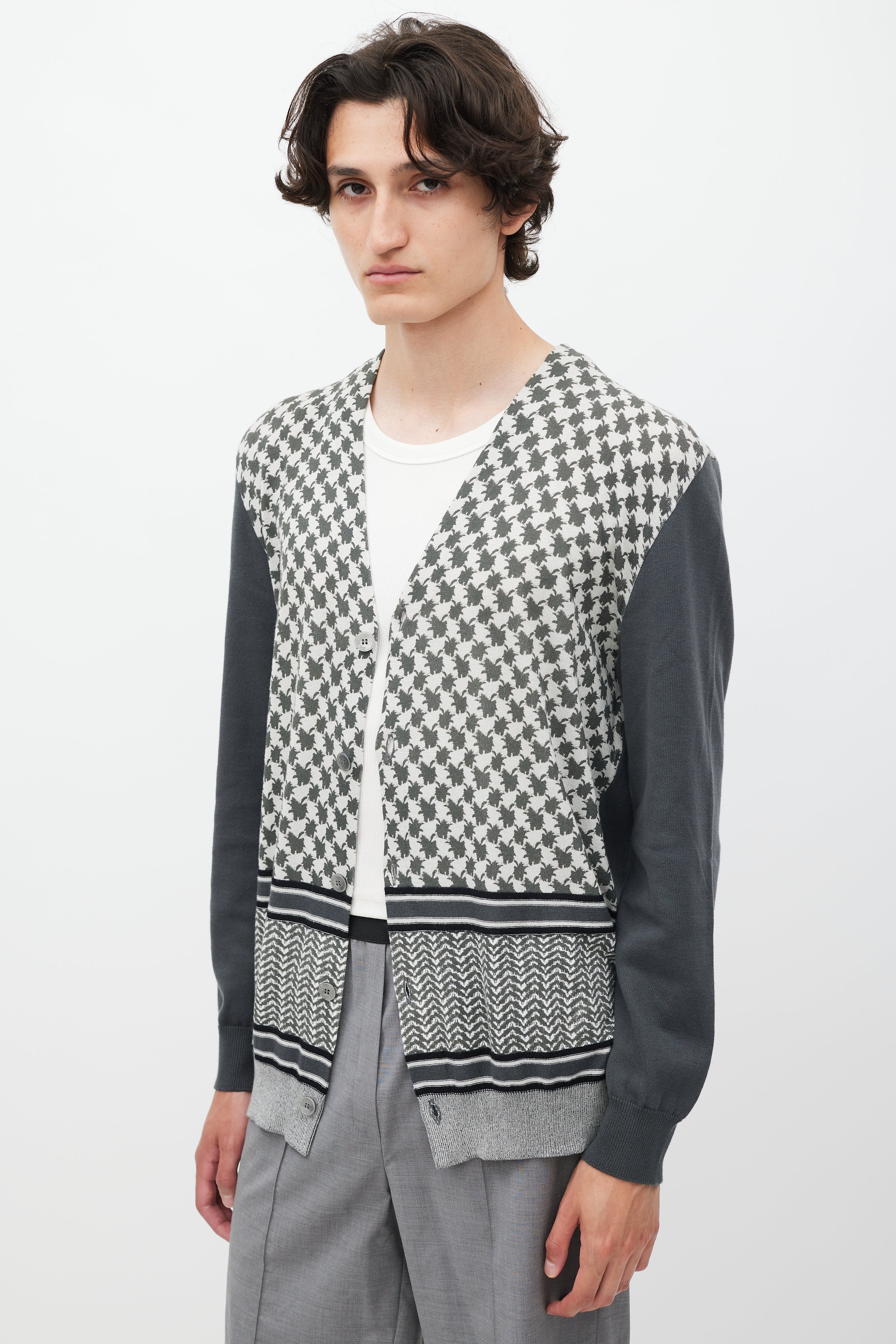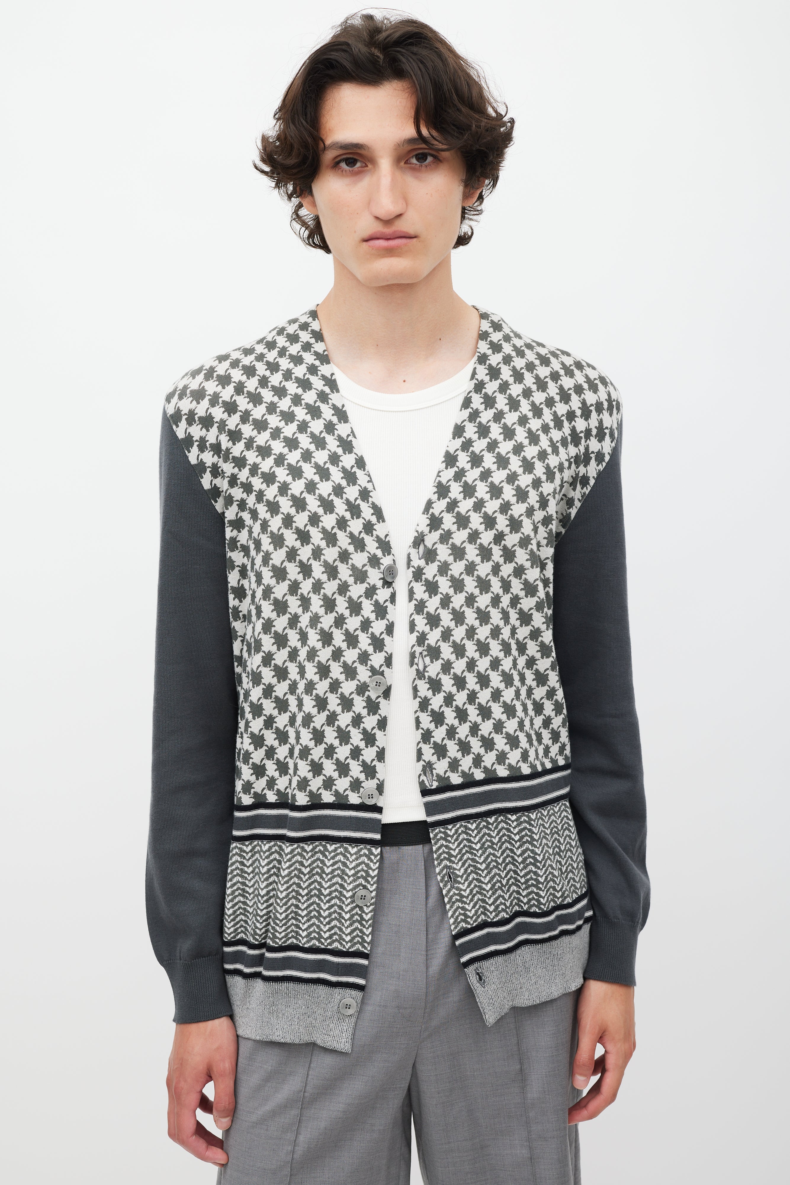 Pre-owned Just Cavalli grey knit cardigan featuring a cream pattern throughout, V-neckline, long sleeves, ribbed hem, silver tone logo hardware at back, and button up closure.