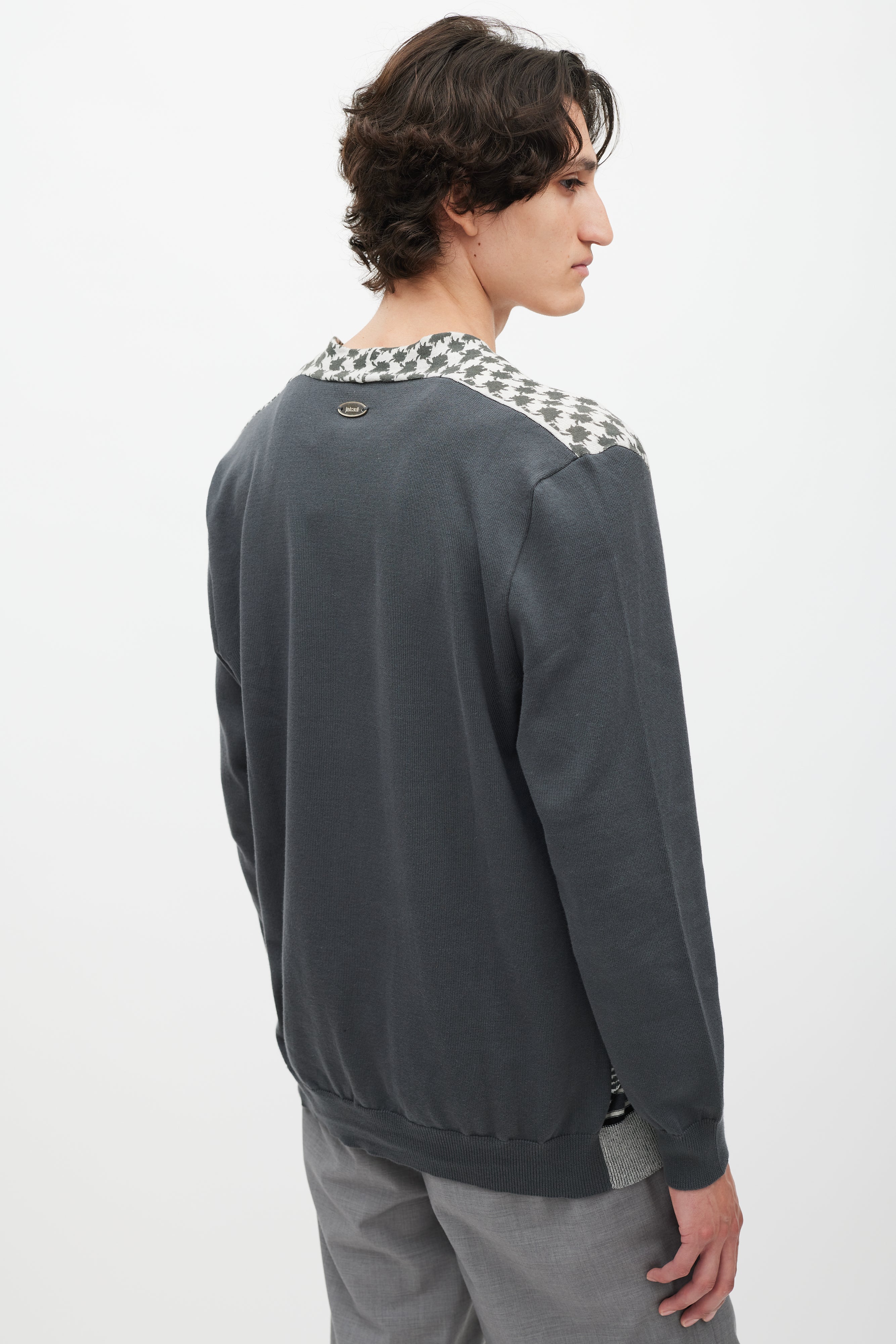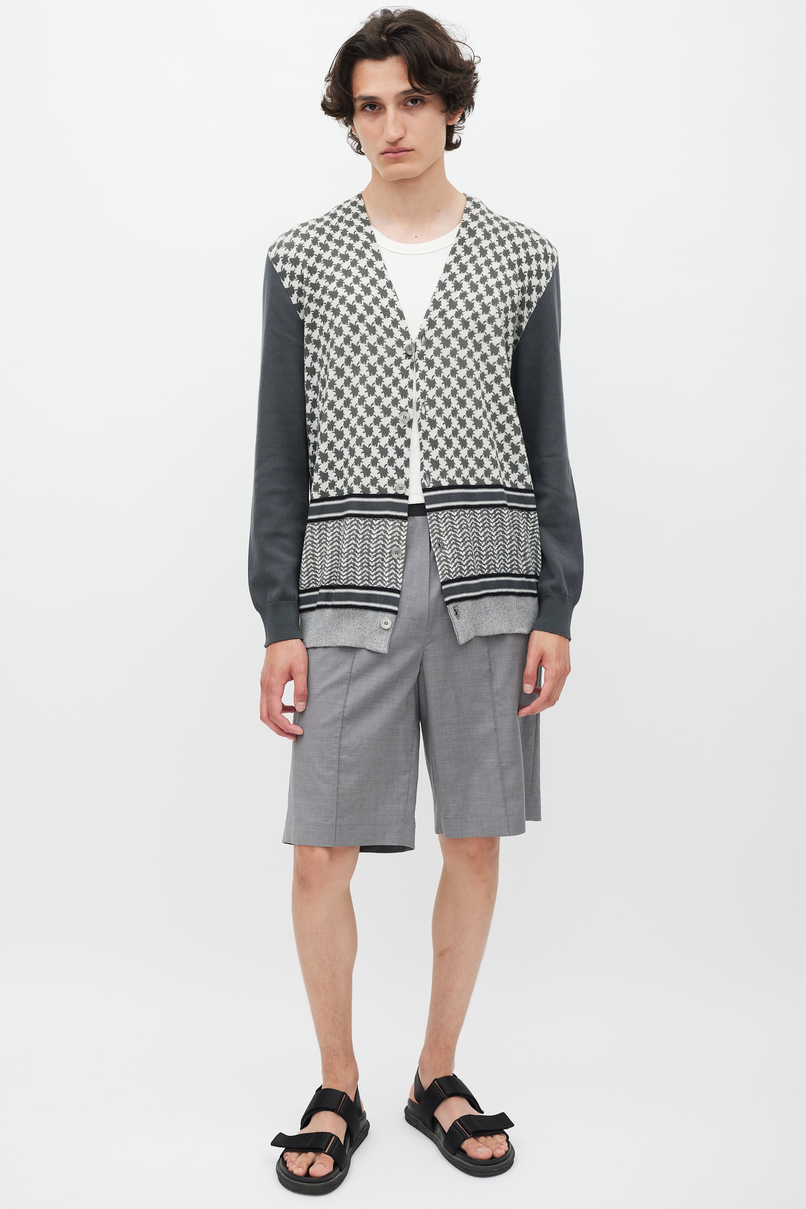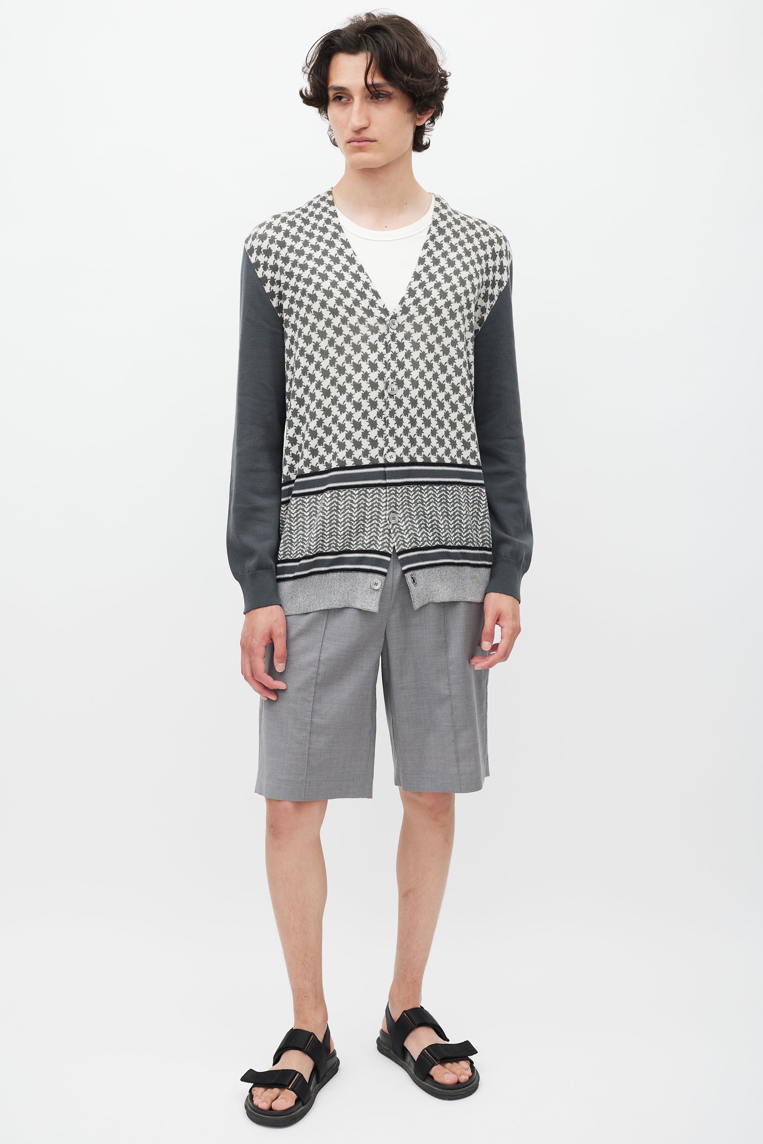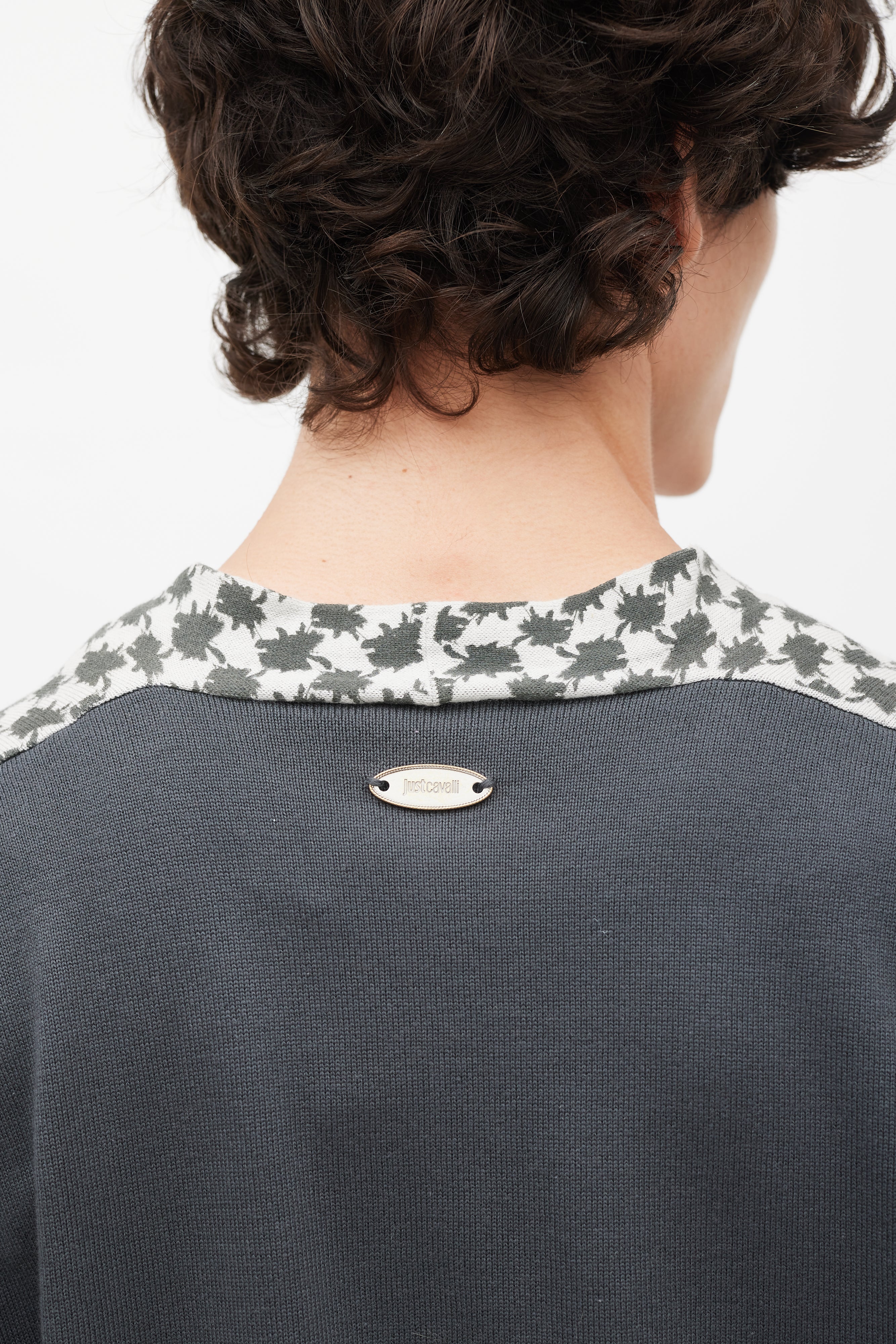 Pre-owned Just Cavalli grey knit cardigan featuring a cream pattern throughout, V-neckline, long sleeves, ribbed hem, silver tone logo hardware at back, and button up closure.