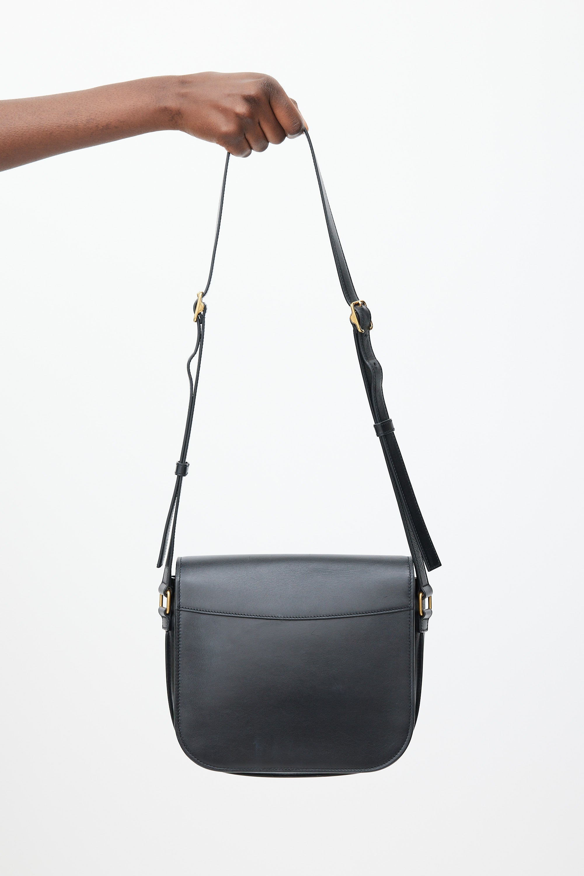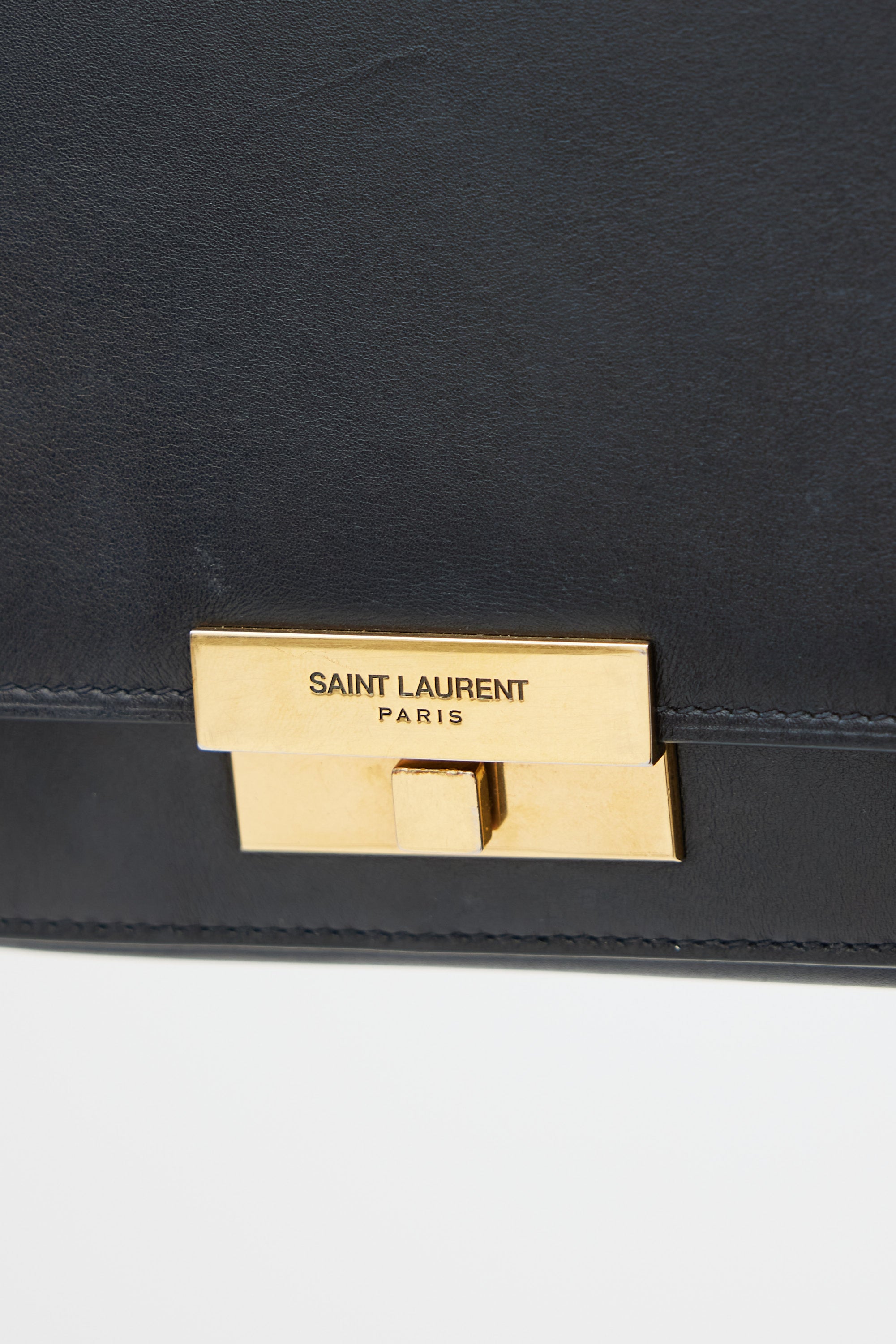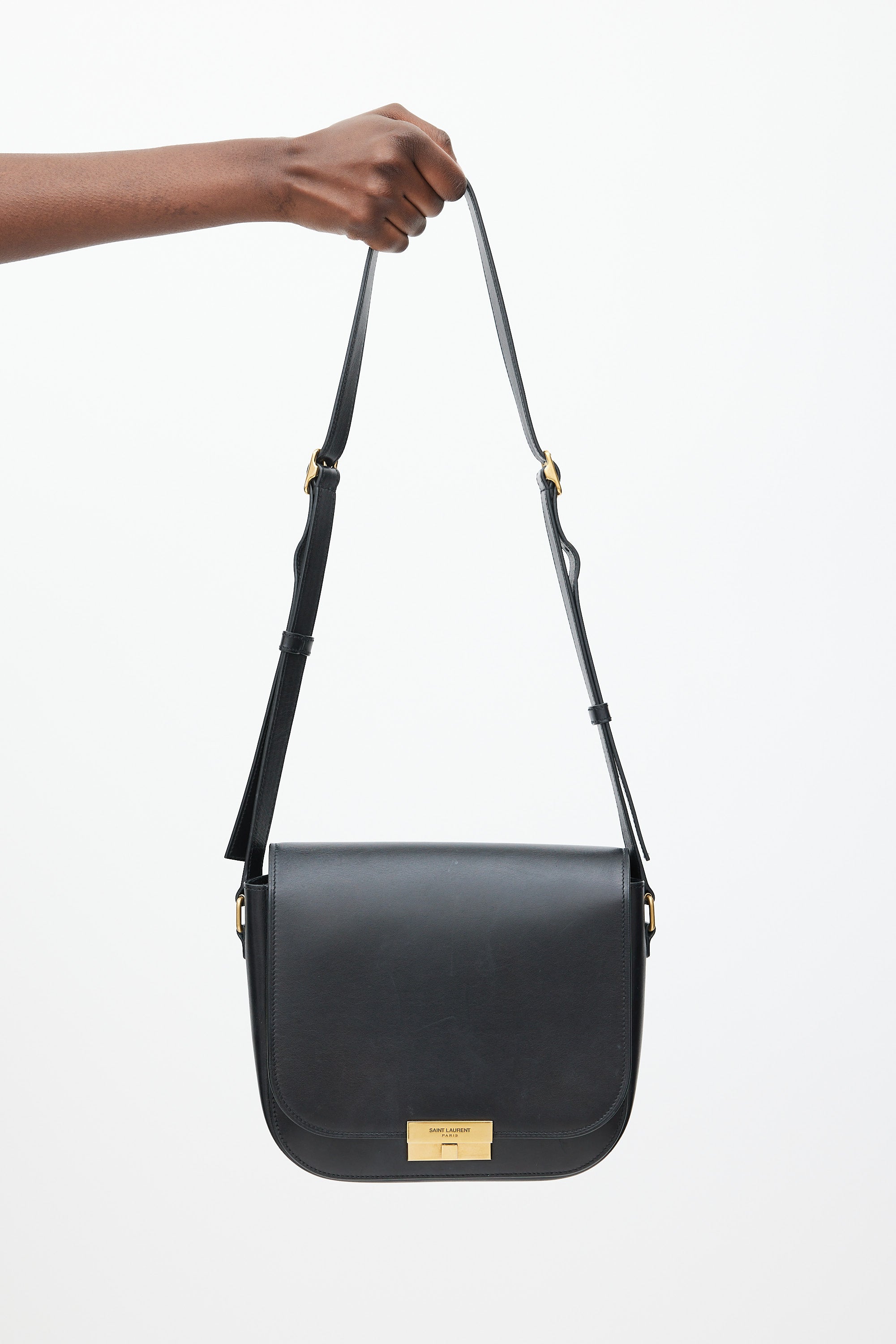 Pre-owned Saint Laurent black Betty leather bag featuring a top flap, one main compartment with one slip pocket, one slip pocket at front, adjustable shoulder strap, and gold tone logo latch closure.