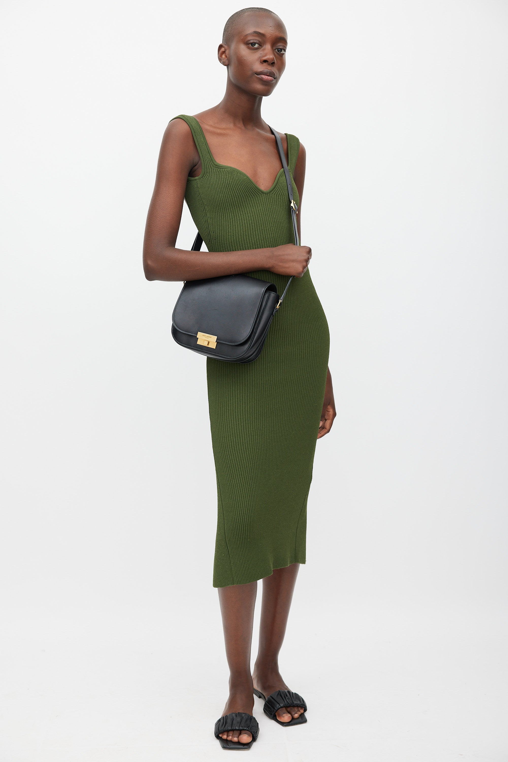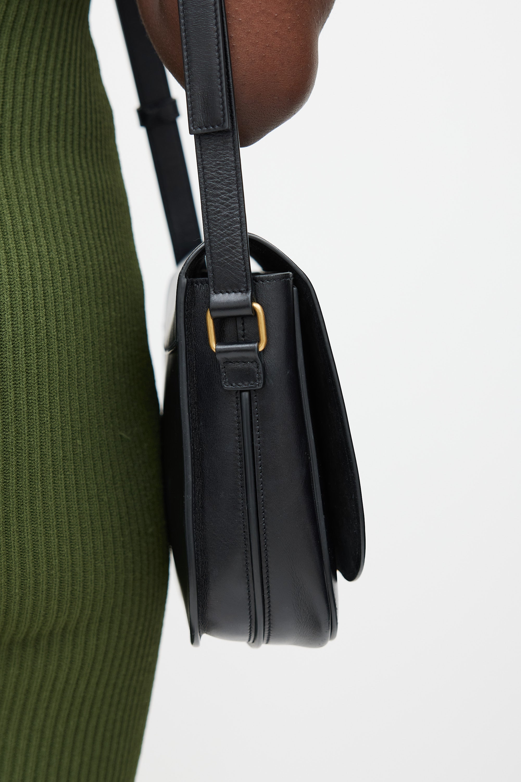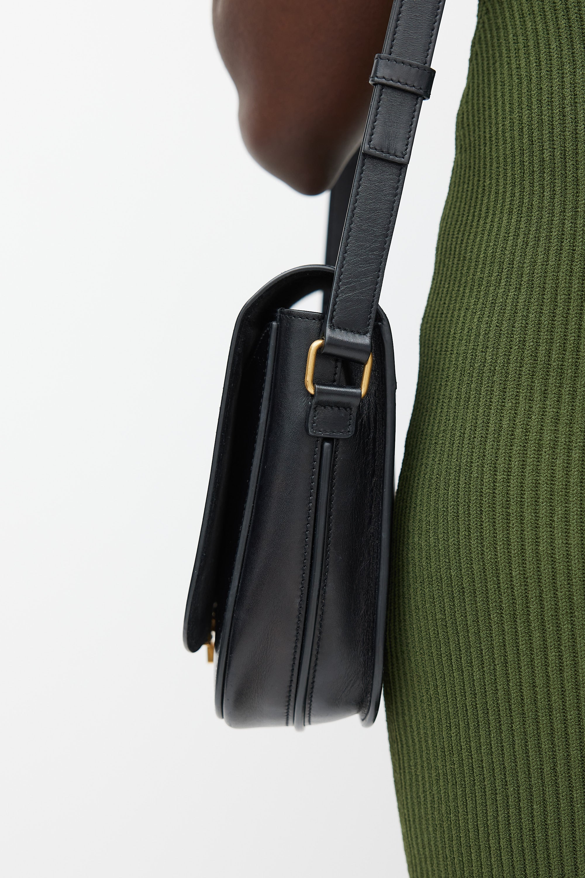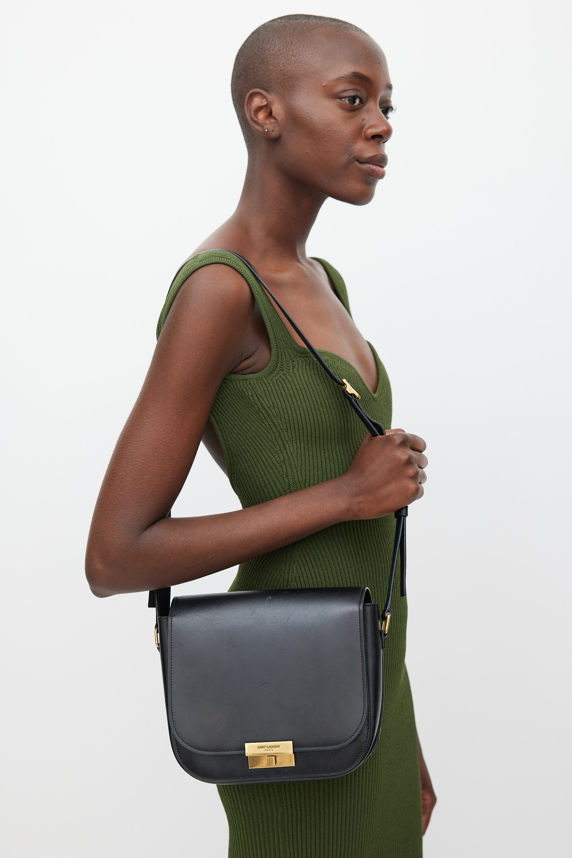 Pre-owned Saint Laurent black Betty leather bag featuring a top flap, one main compartment with one slip pocket, one slip pocket at front, adjustable shoulder strap, and gold tone logo latch closure.