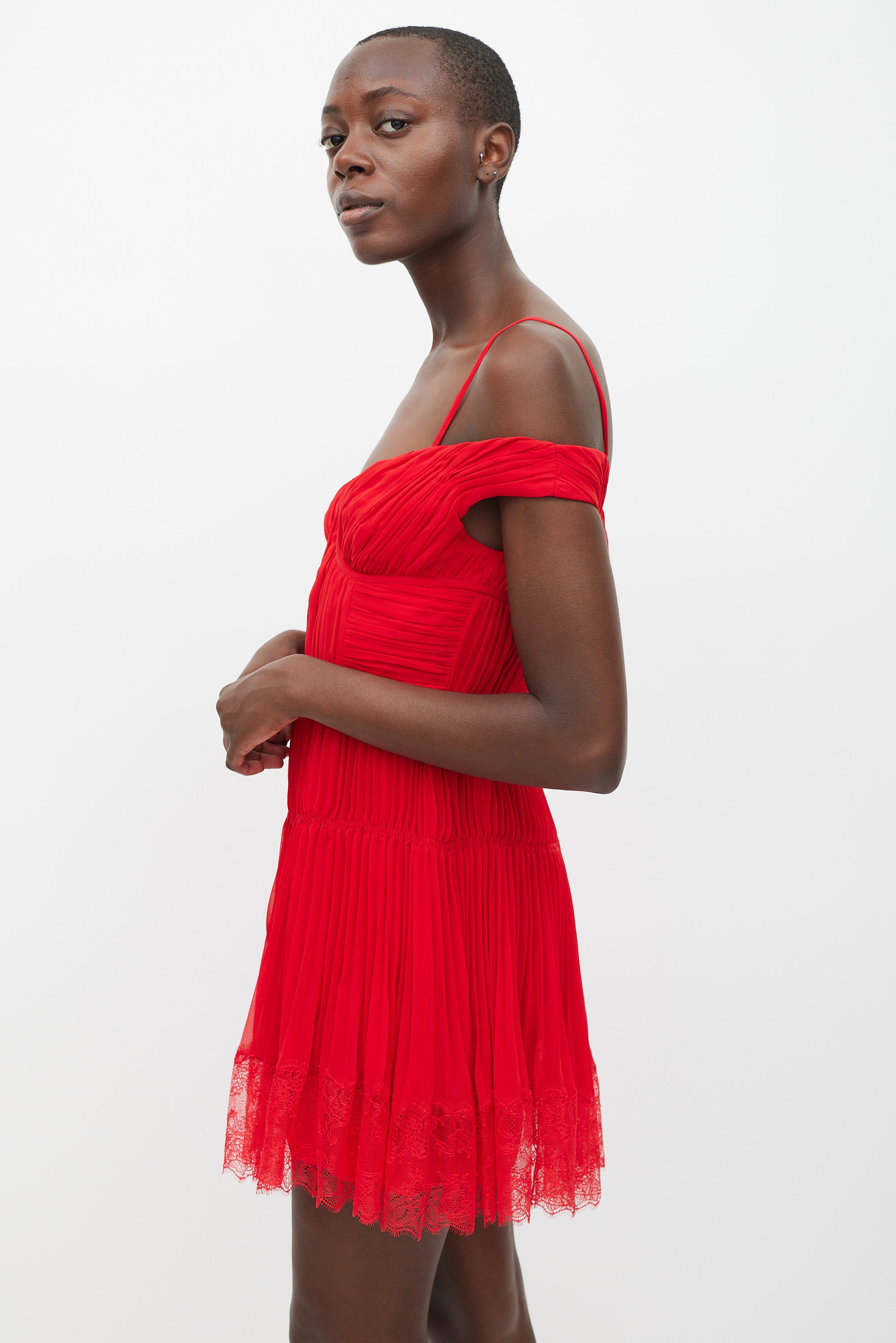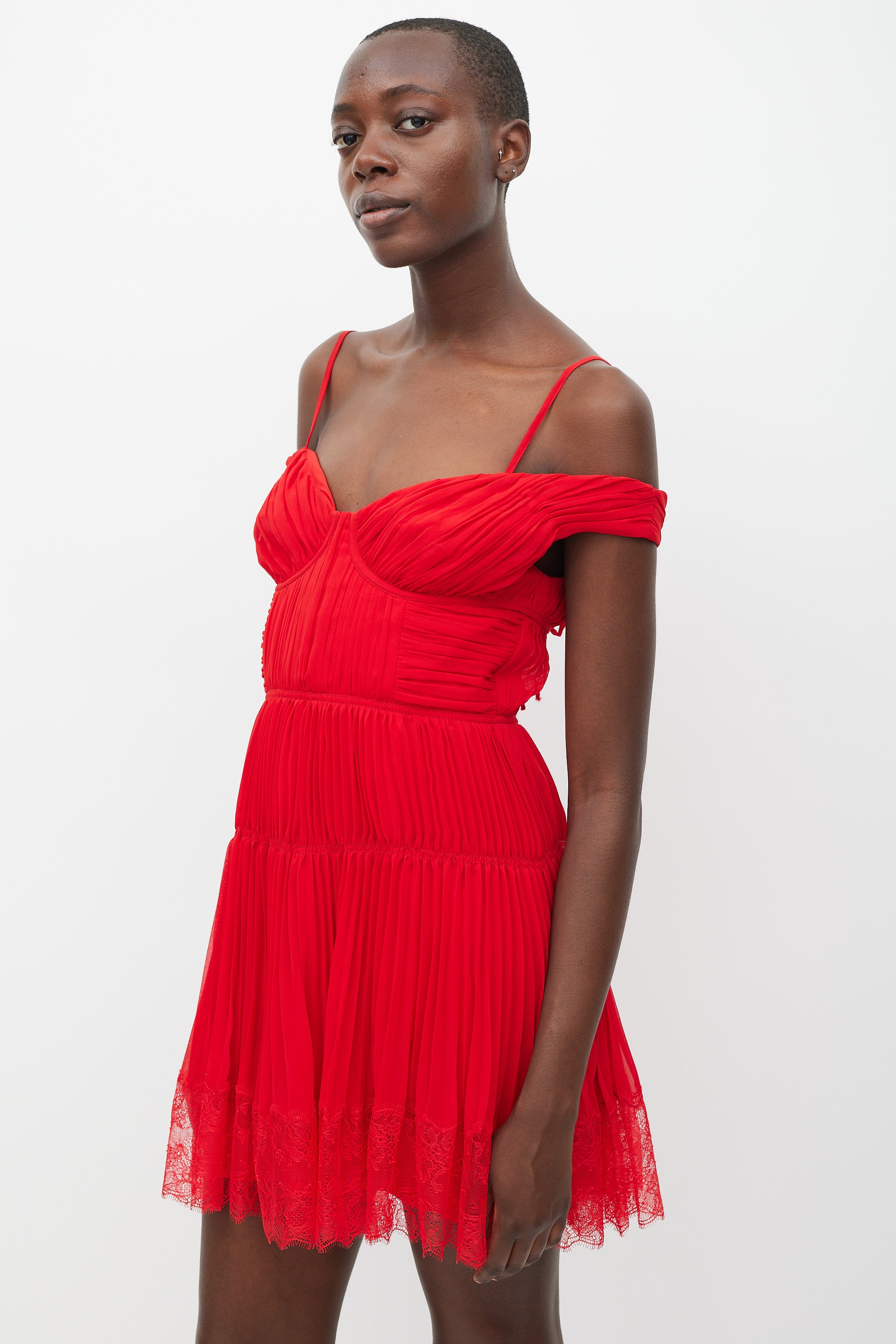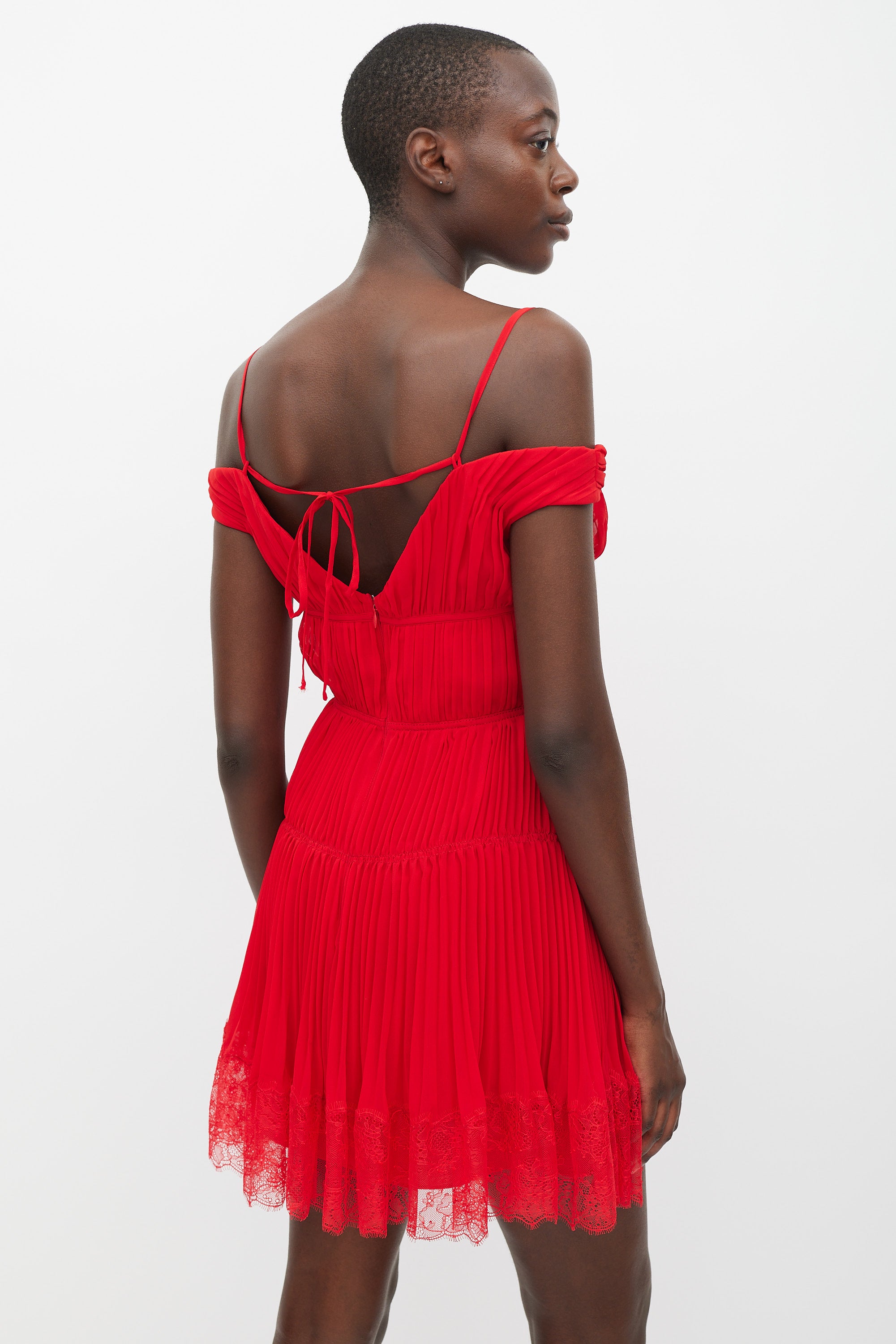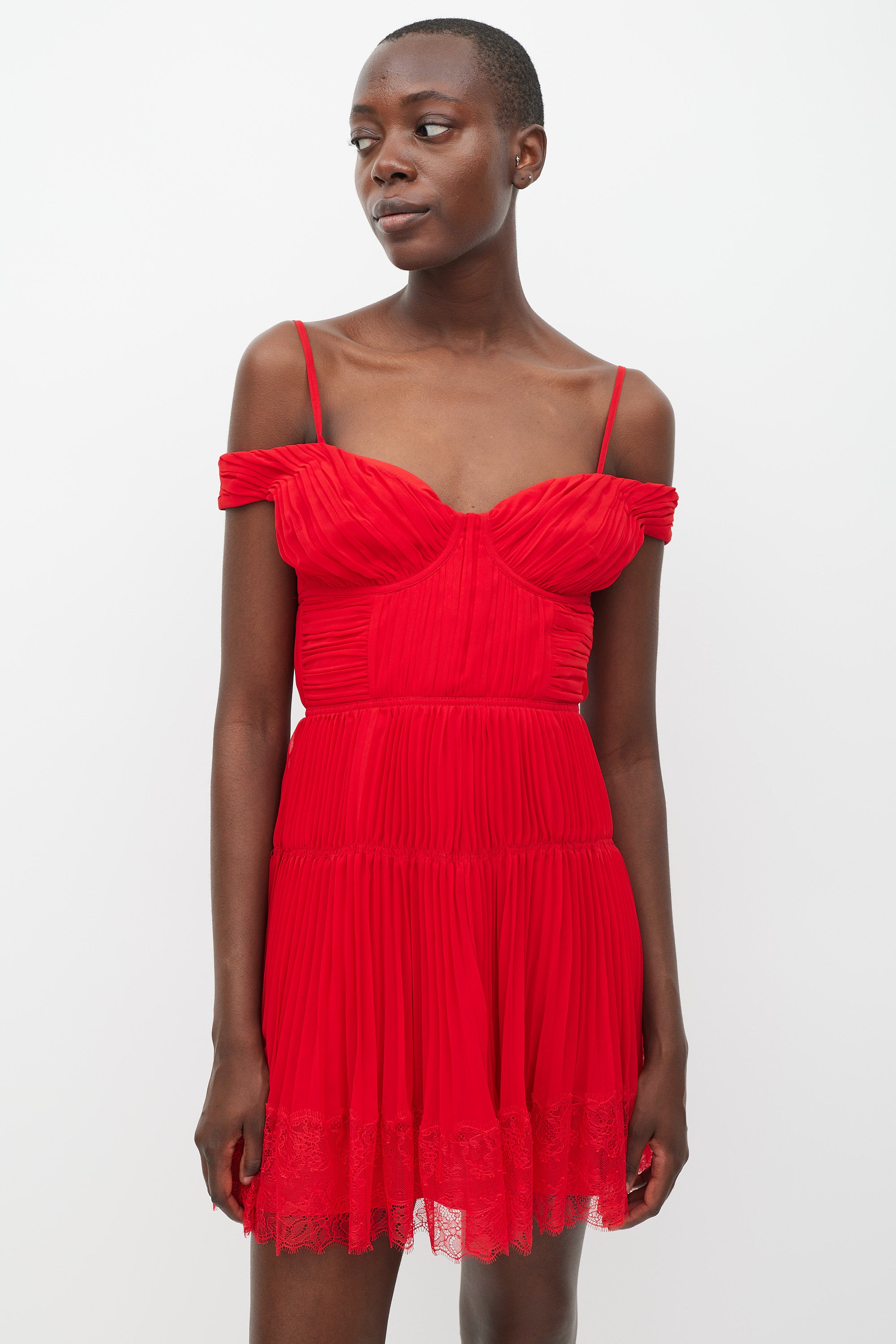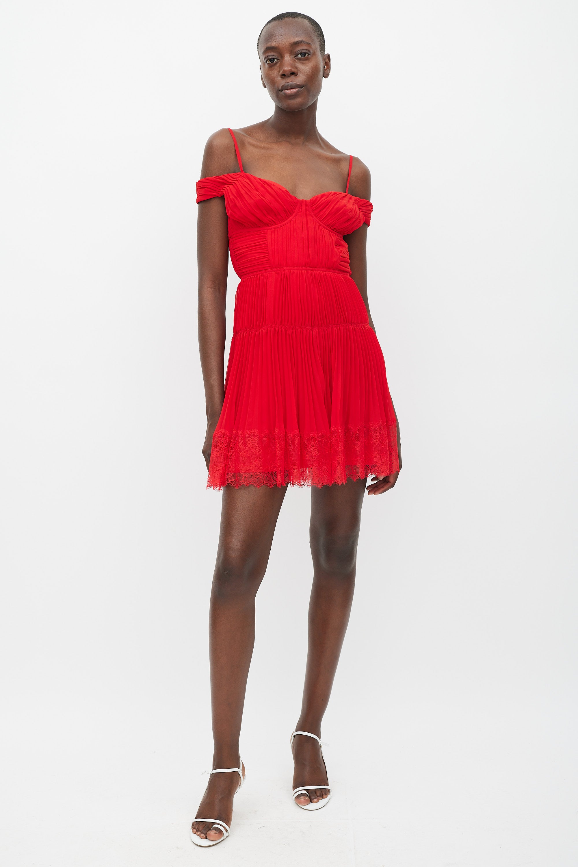 Pre-owned Self-Portrait red mini dress featuring a sweetheart neckline, off shoulder design, thin tie back straps, pleating throughout, tiered skirt, lace trimmed hem, and concealed back zip closure. Lined.