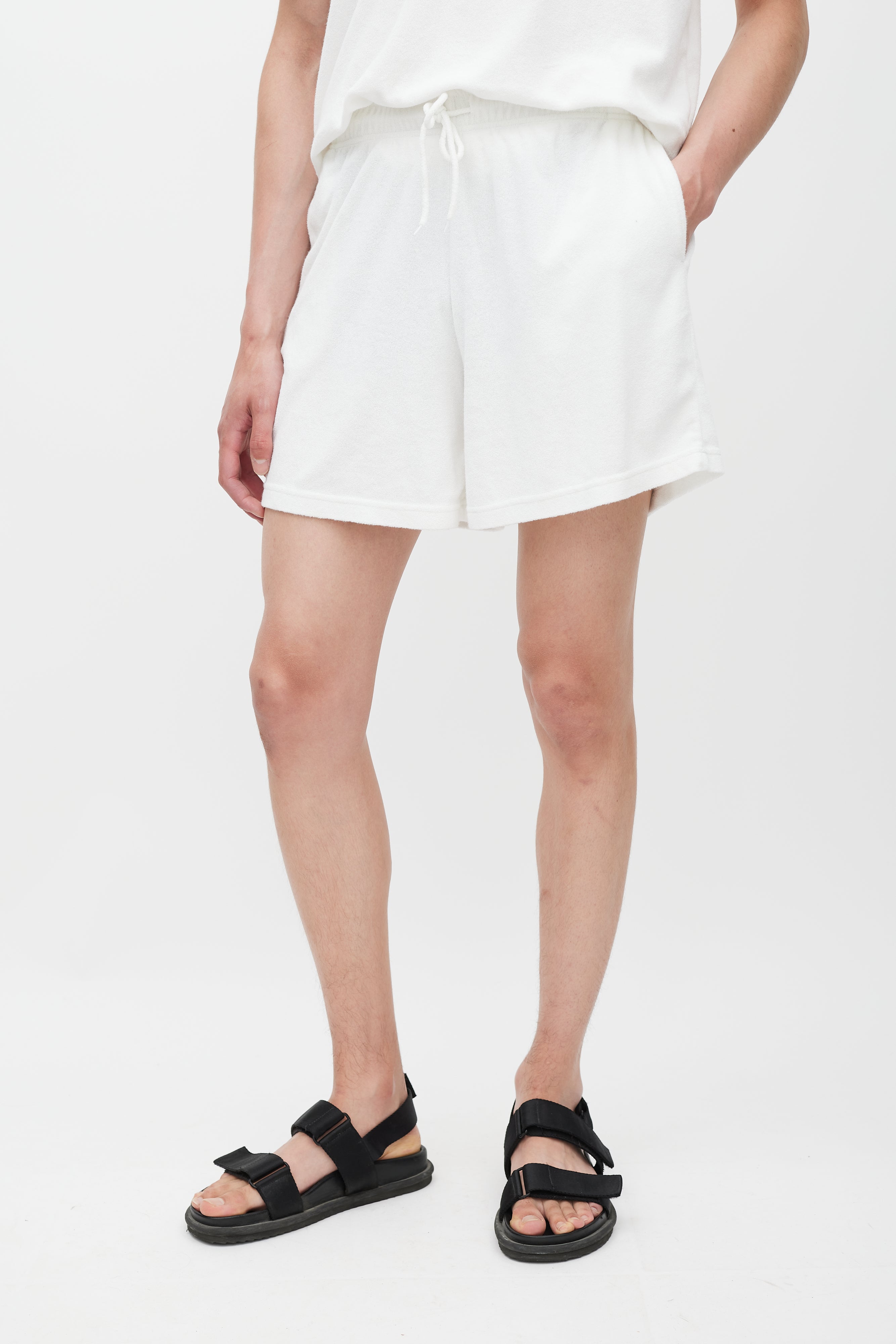 Pre-owned The Frankie shop white terry cotton co-ord set featuring polo with collared neck, front quarter button up, split sides, and short sleeves. Matching shorts feature high elasticized waist with drawstring, in seam pockets, and patch pocket at back right hip.