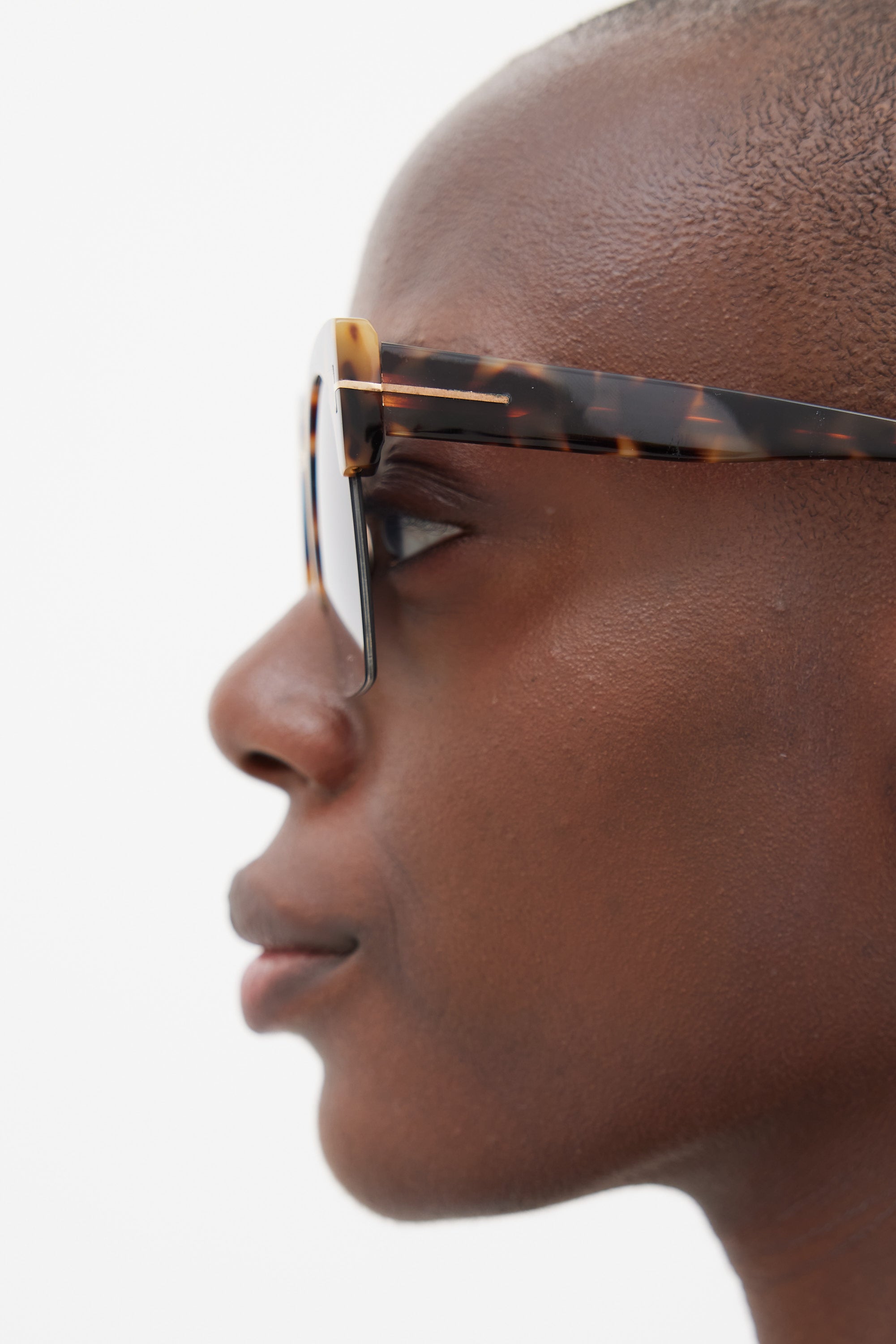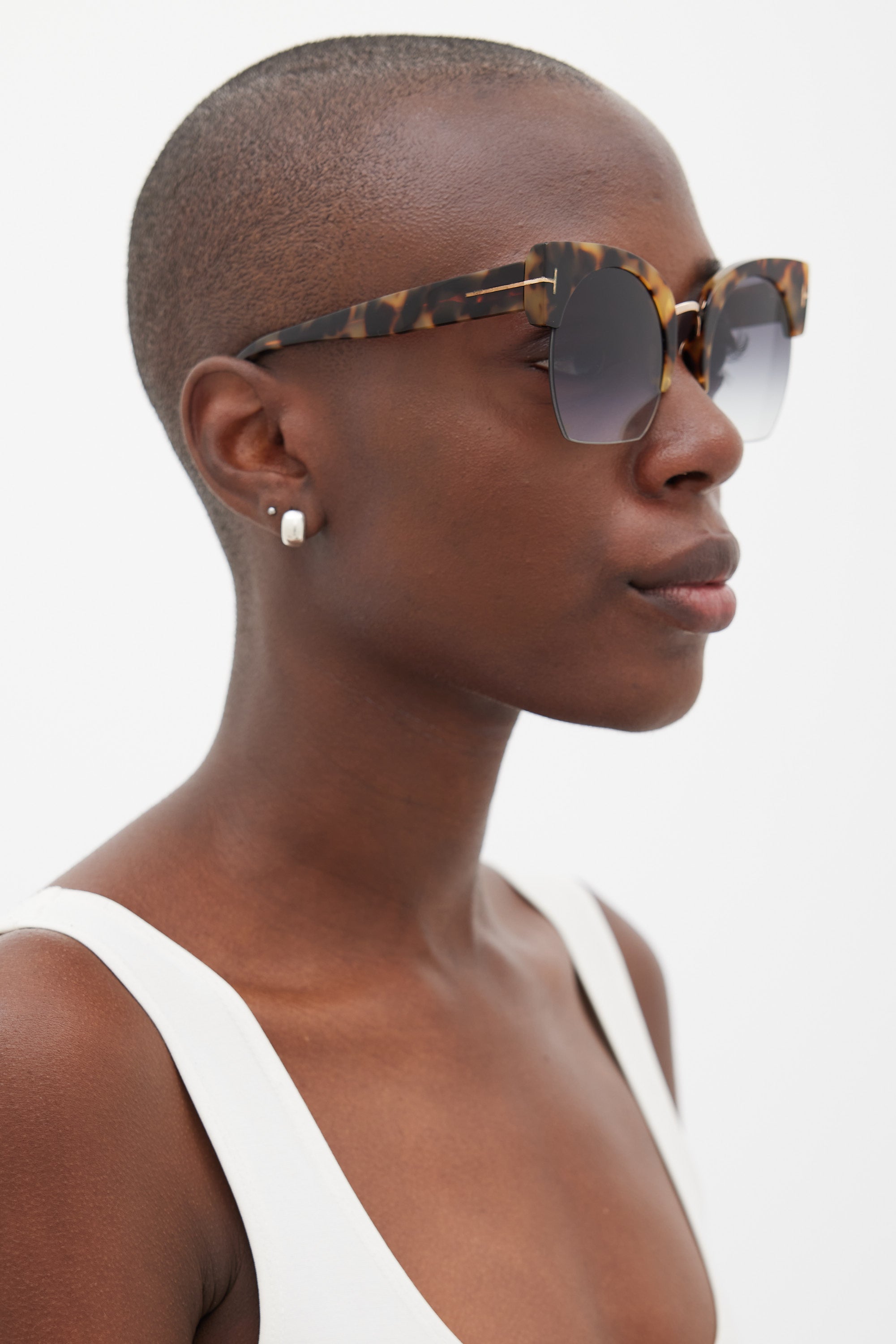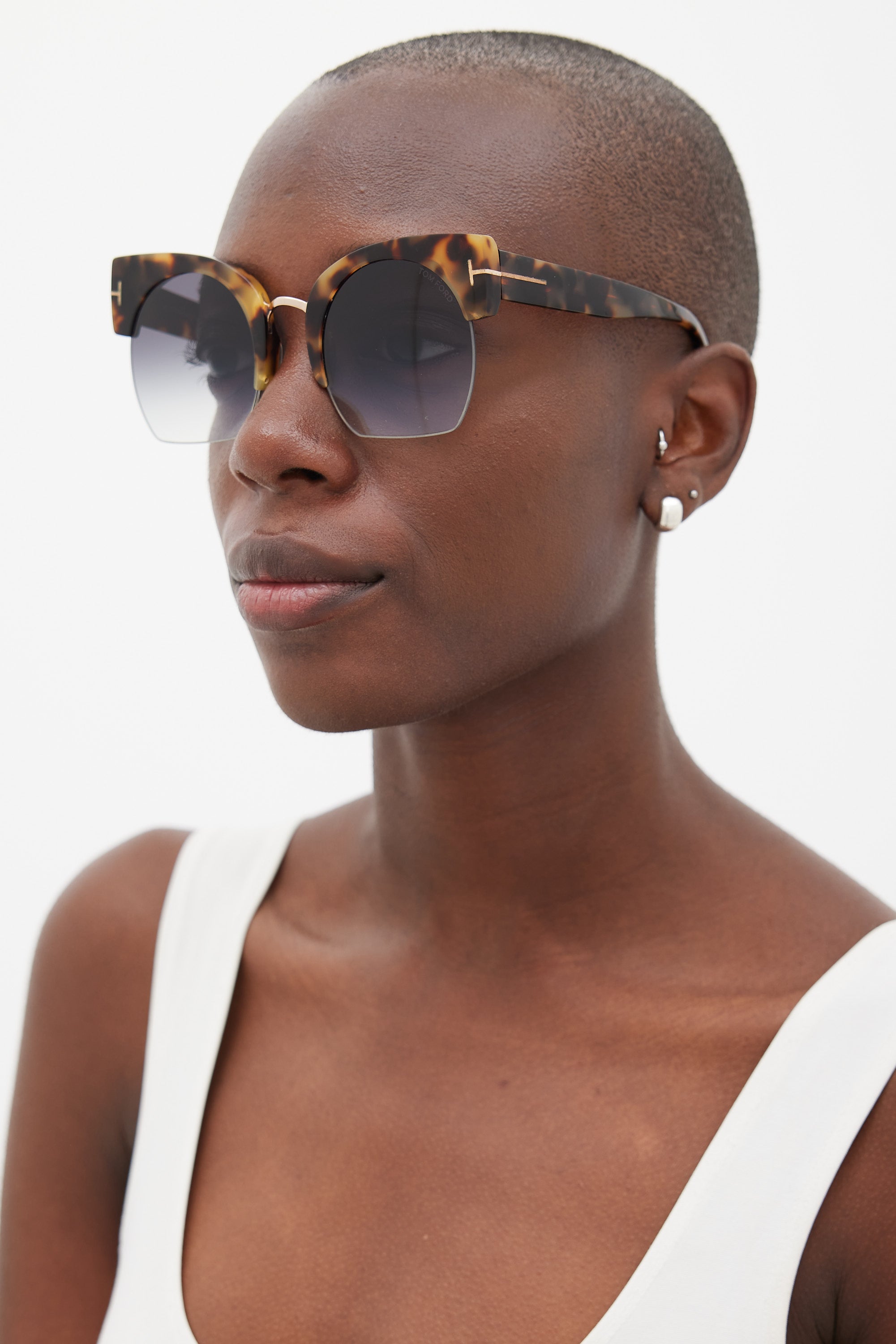 Pre-owned Tom Ford TF552 Savannah sunglasses featuring a brown and beige tortoiseshell acetate frame, partially rimless squared round grey lenses, gold tone bridge, gold tone T motif accents at temples, and gold tone engraved logo plaque at arm tips. Comes with original case.