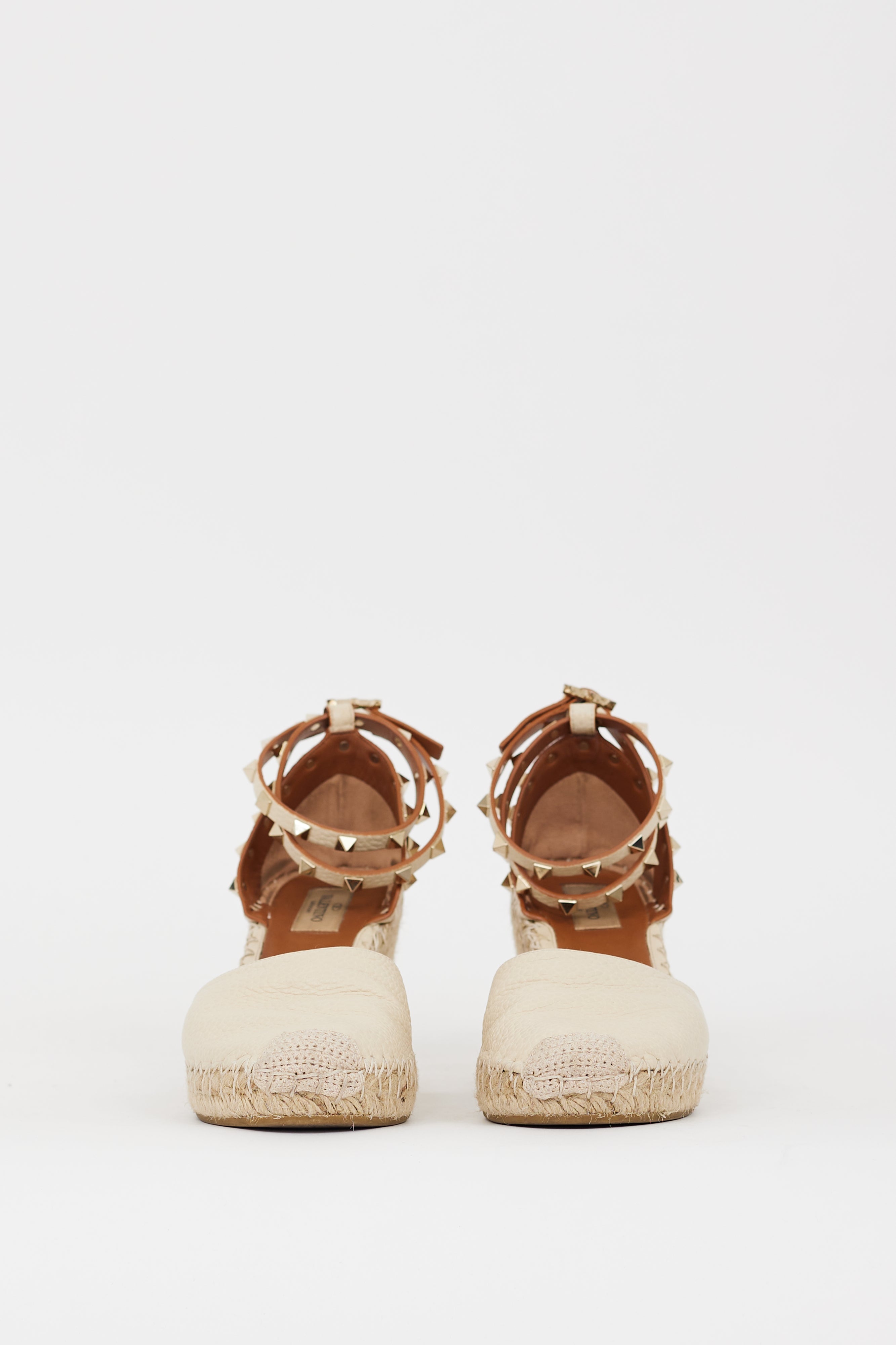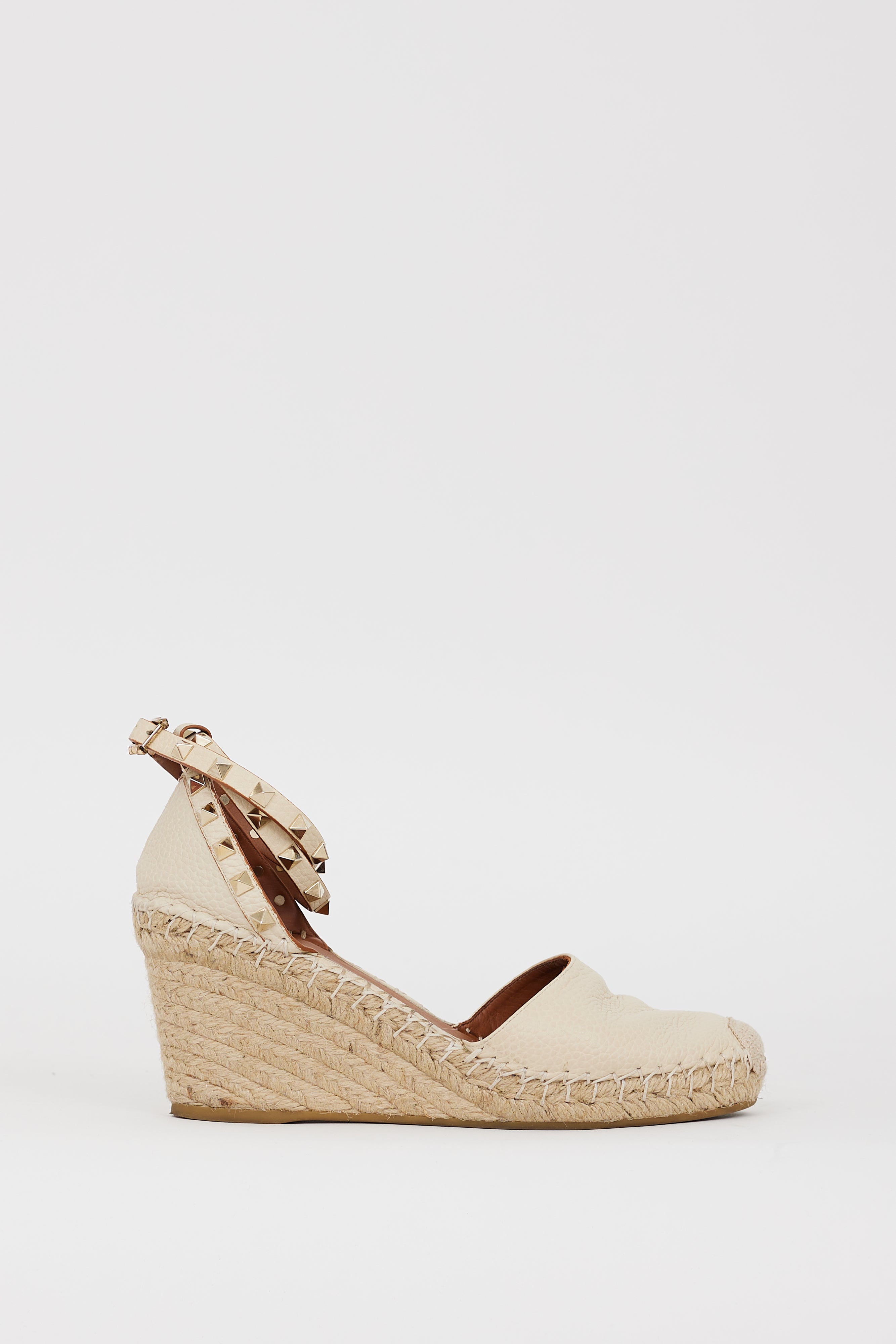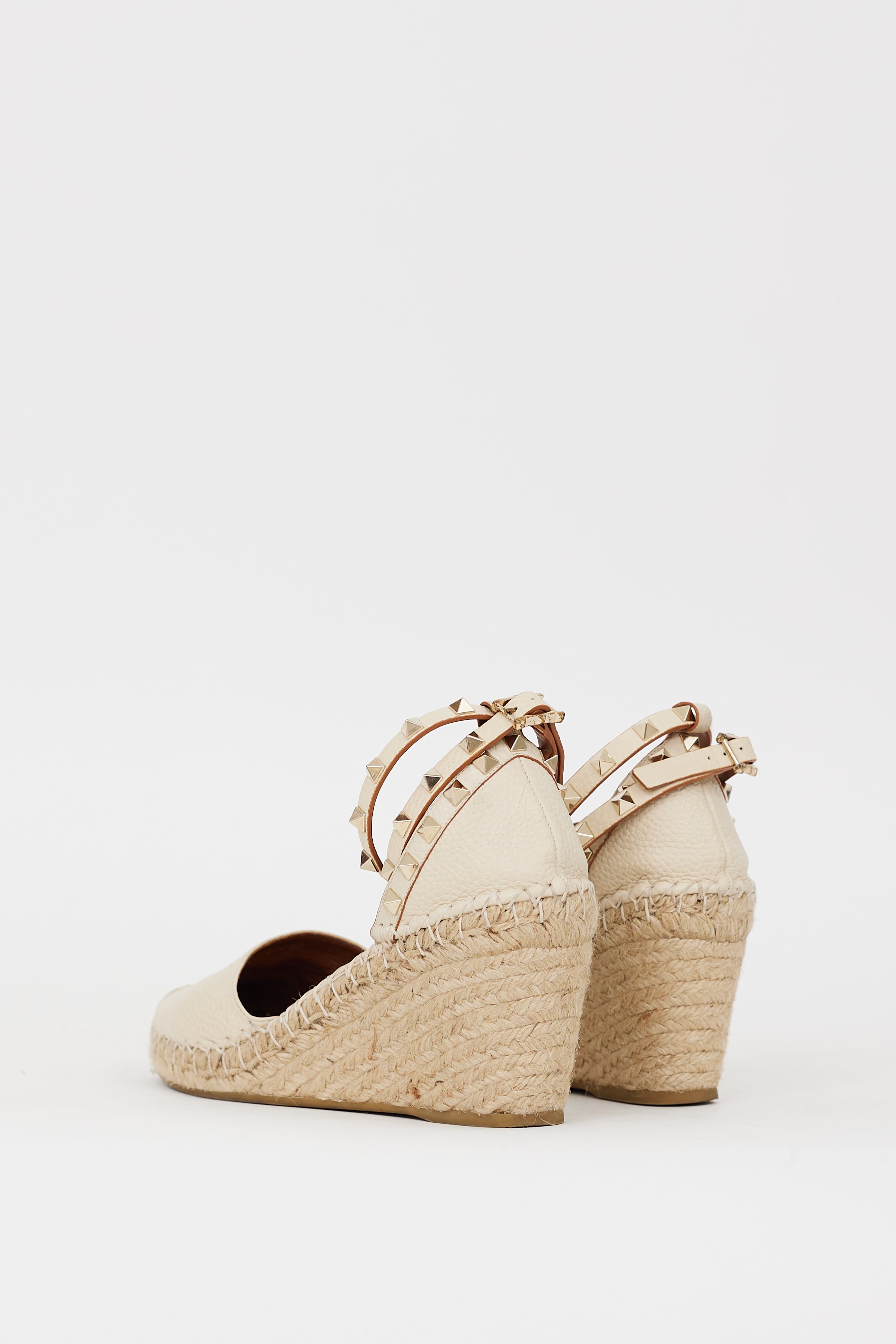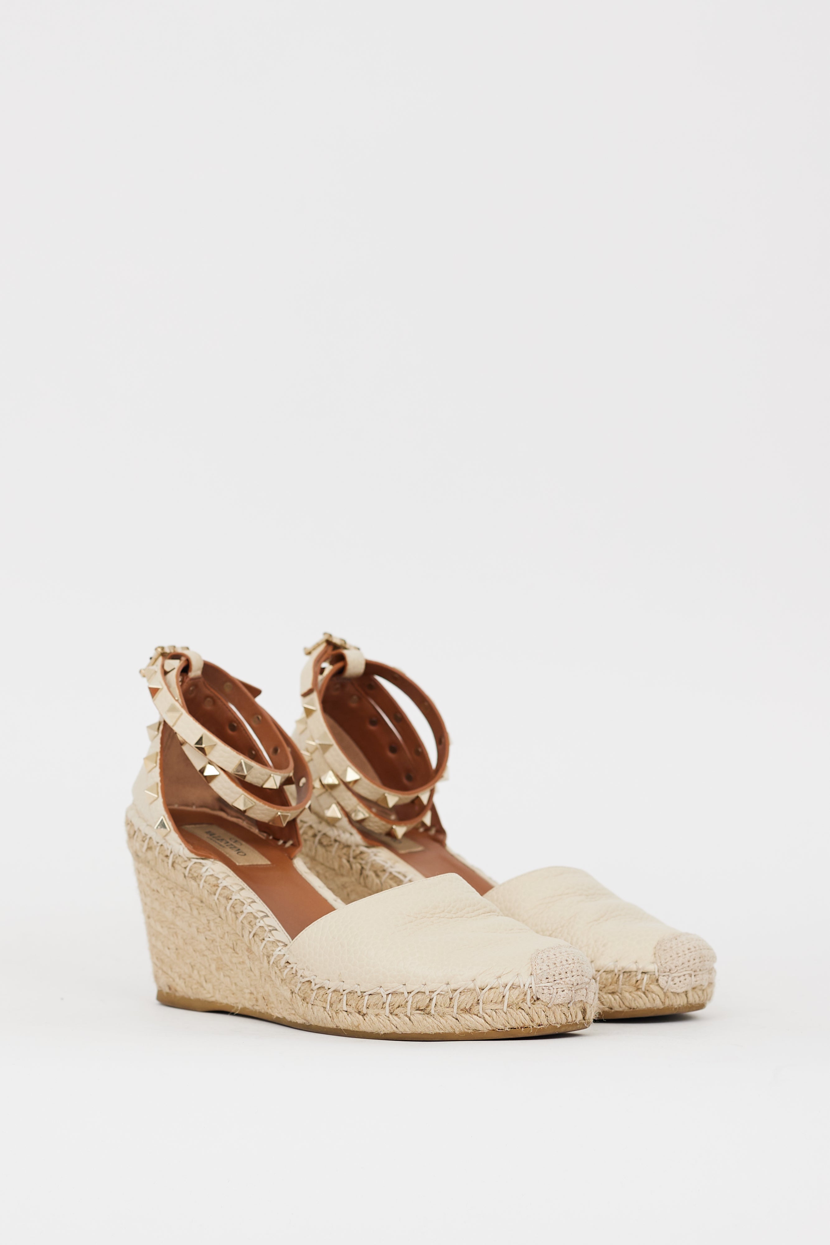 Pre-owned Valentino cream leather espadrille wedges featuring rounded toe with braided toe cap, braided trim at midsole, wrap around ankle strap with gold tone Rockstud embellishment, and jute wedge.