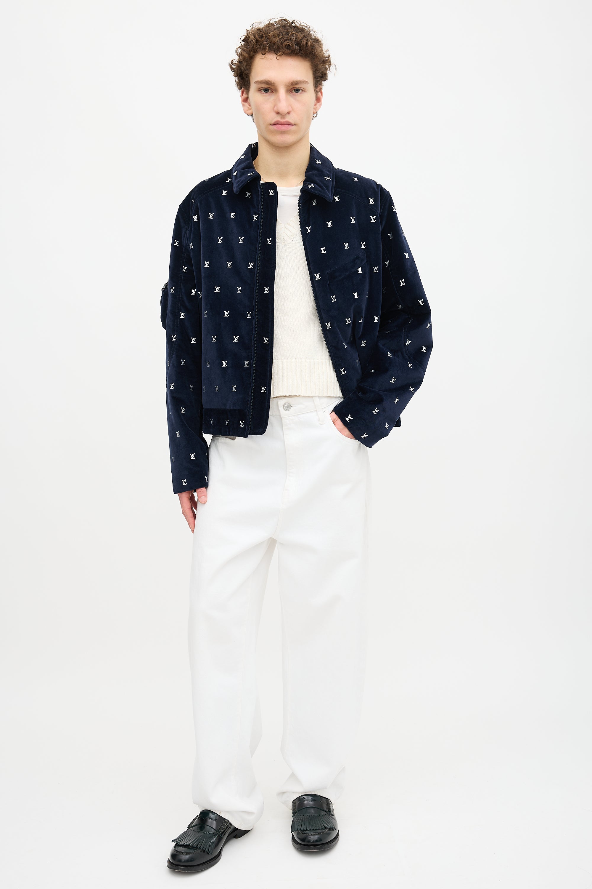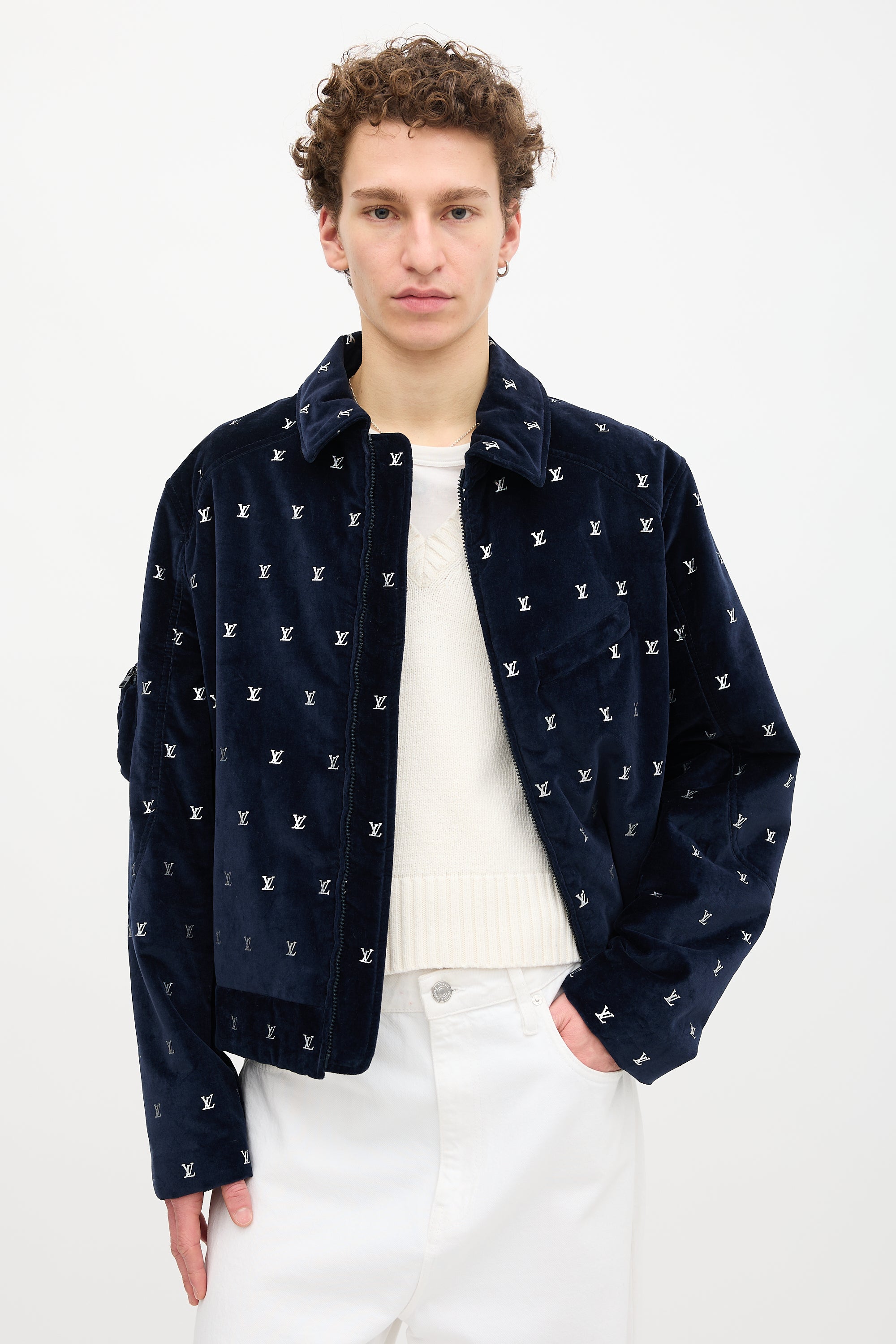 Pre-owned Louis Vuitton Spring/Summer 2023 navy velvet jacket featuring allover silver tone LV logos, straight collar, zip up front, welt pocket at left chest, in seam pockets, two interior pockets, and zip pocket at right arm. Lined.