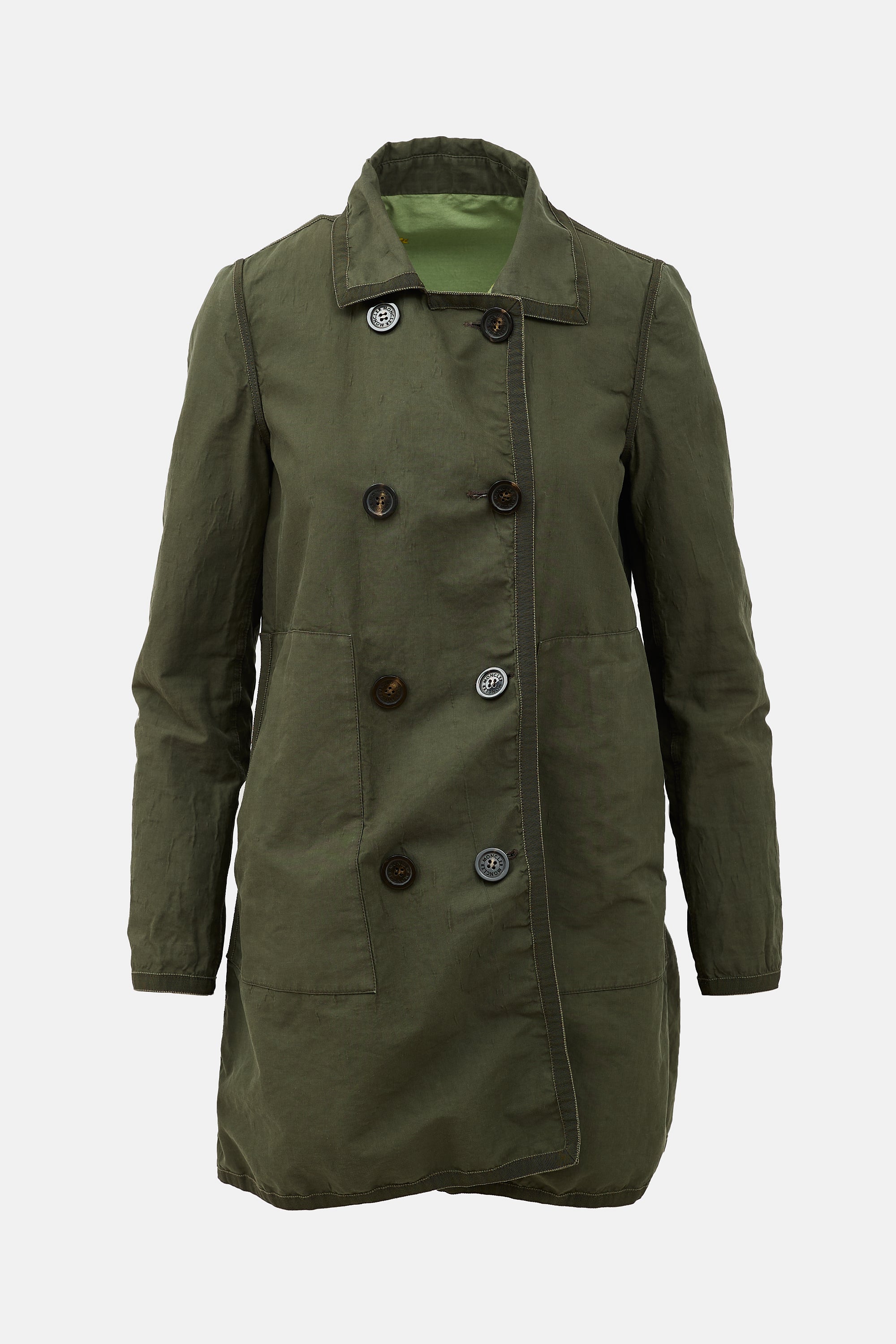 Pre-owned Moncler green canvas jacket featuring a point collar, double breasted button front, multicolour floral print, two welt pockets at hip, grosgrain trims, and a green reverse with two patch pockets.