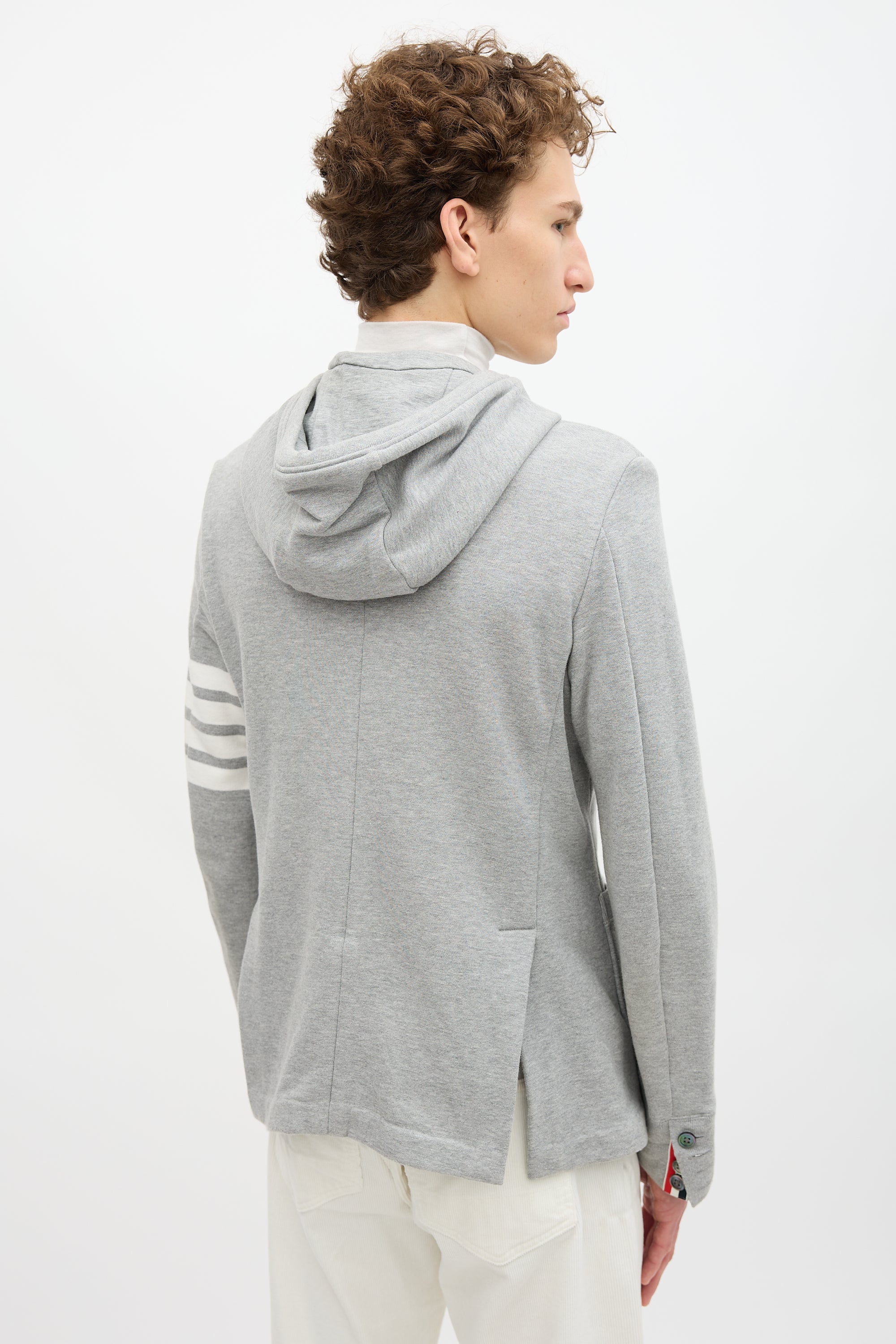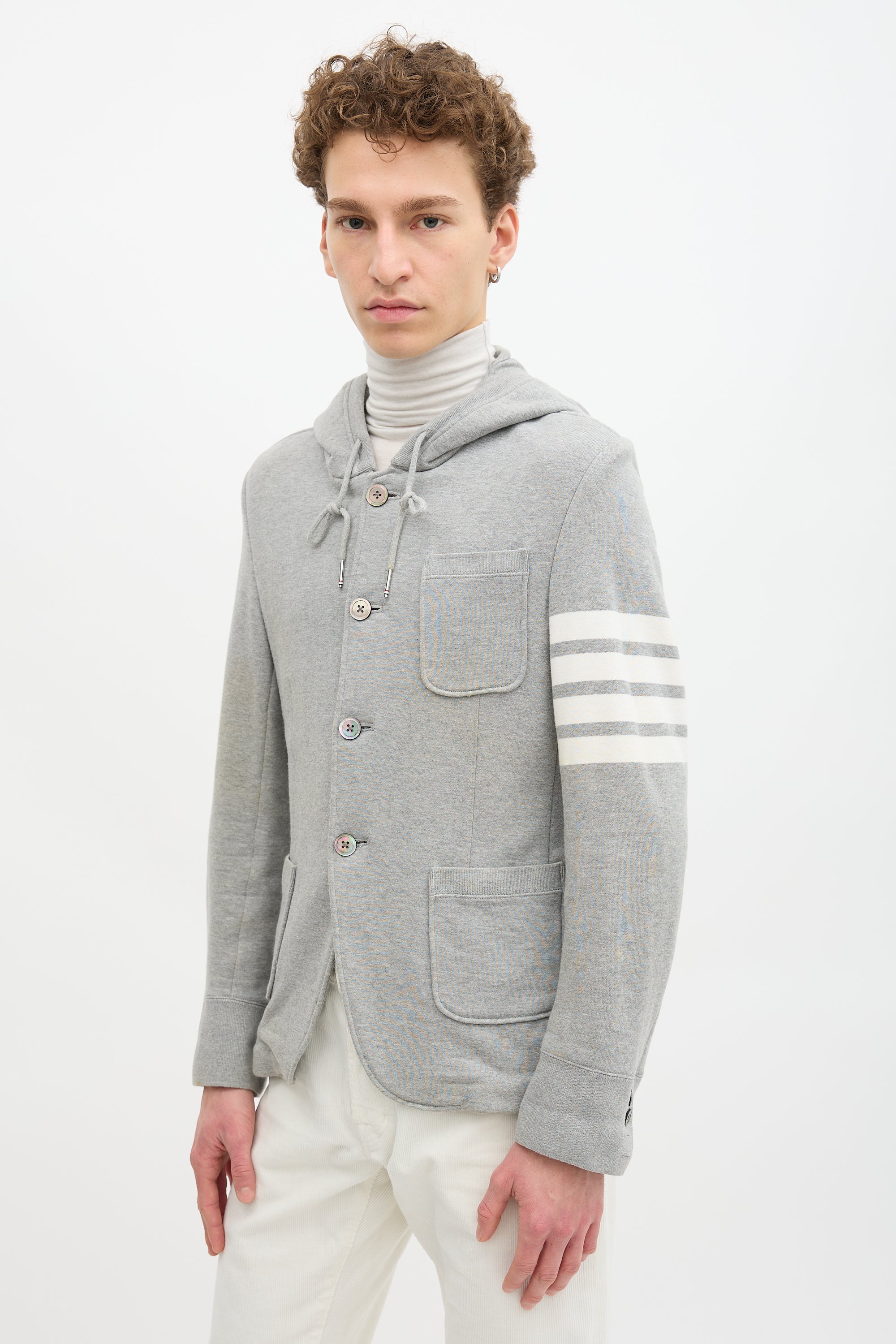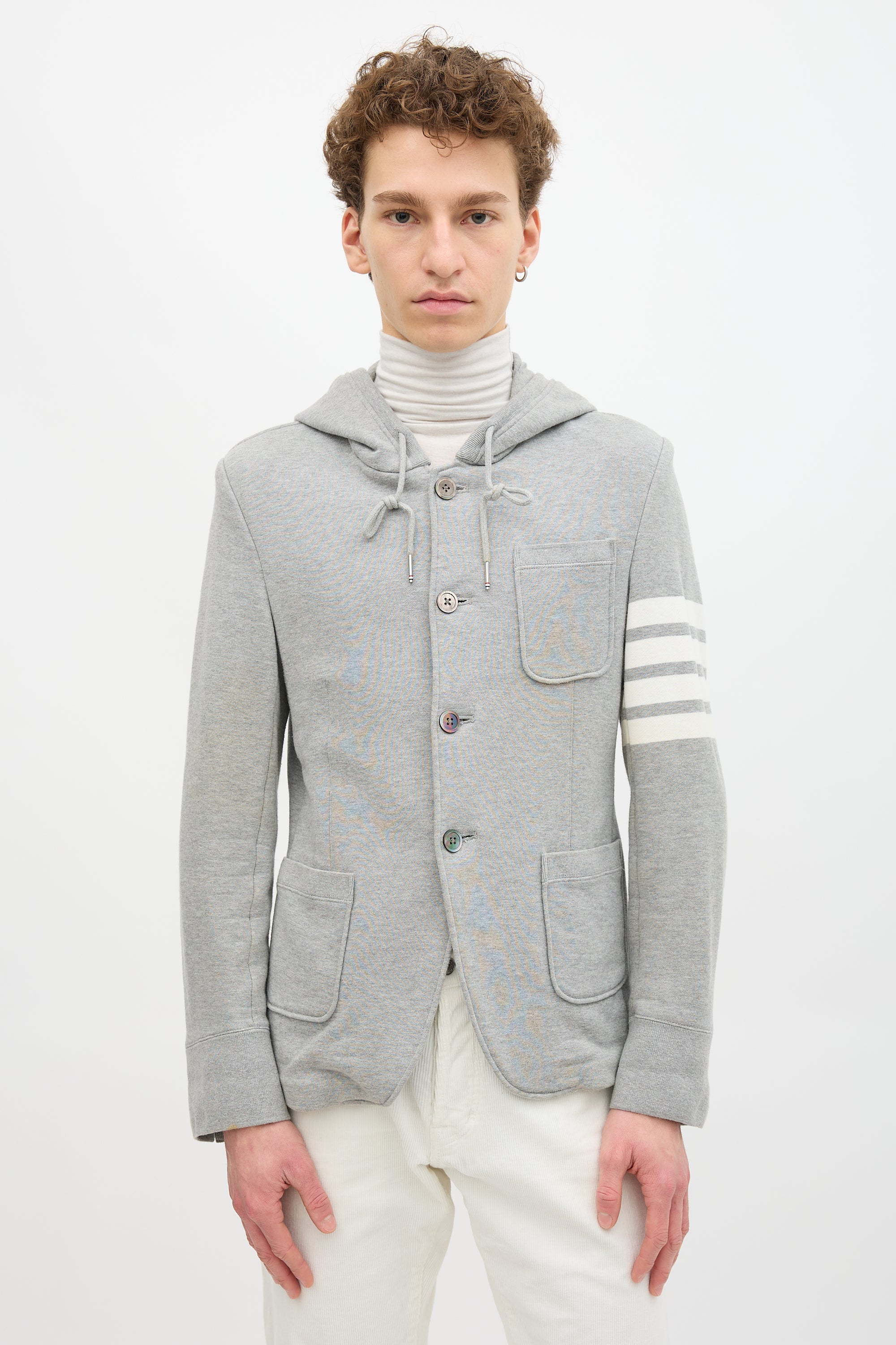 Pre-owned Thom Browne heather grey jacket featuring drawstring hood, button up front, three front patch pockets, signature tricolour grosgrain trim at back neck, back double vent, four bar design at left arm, and buttoned ribbed cuffs.