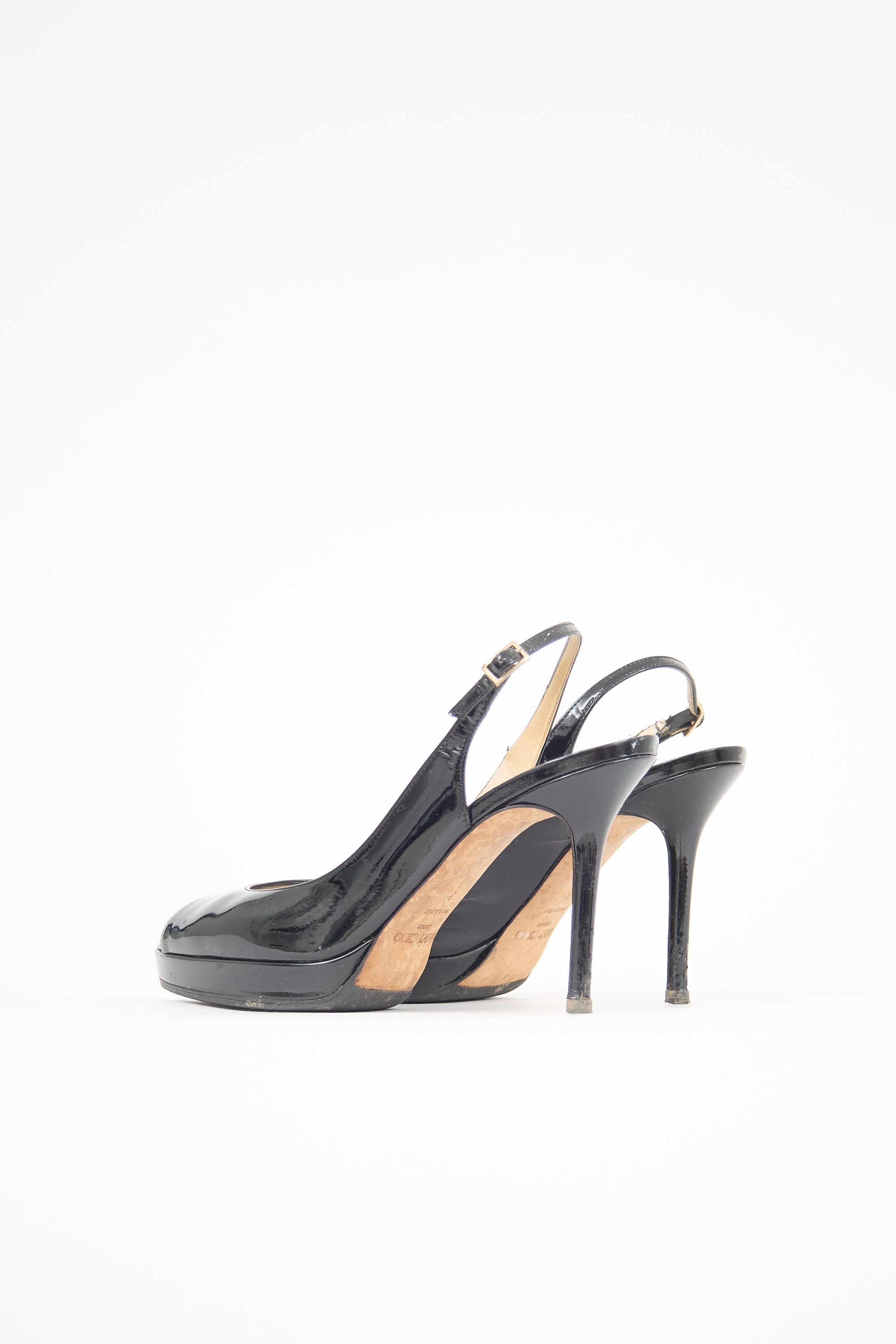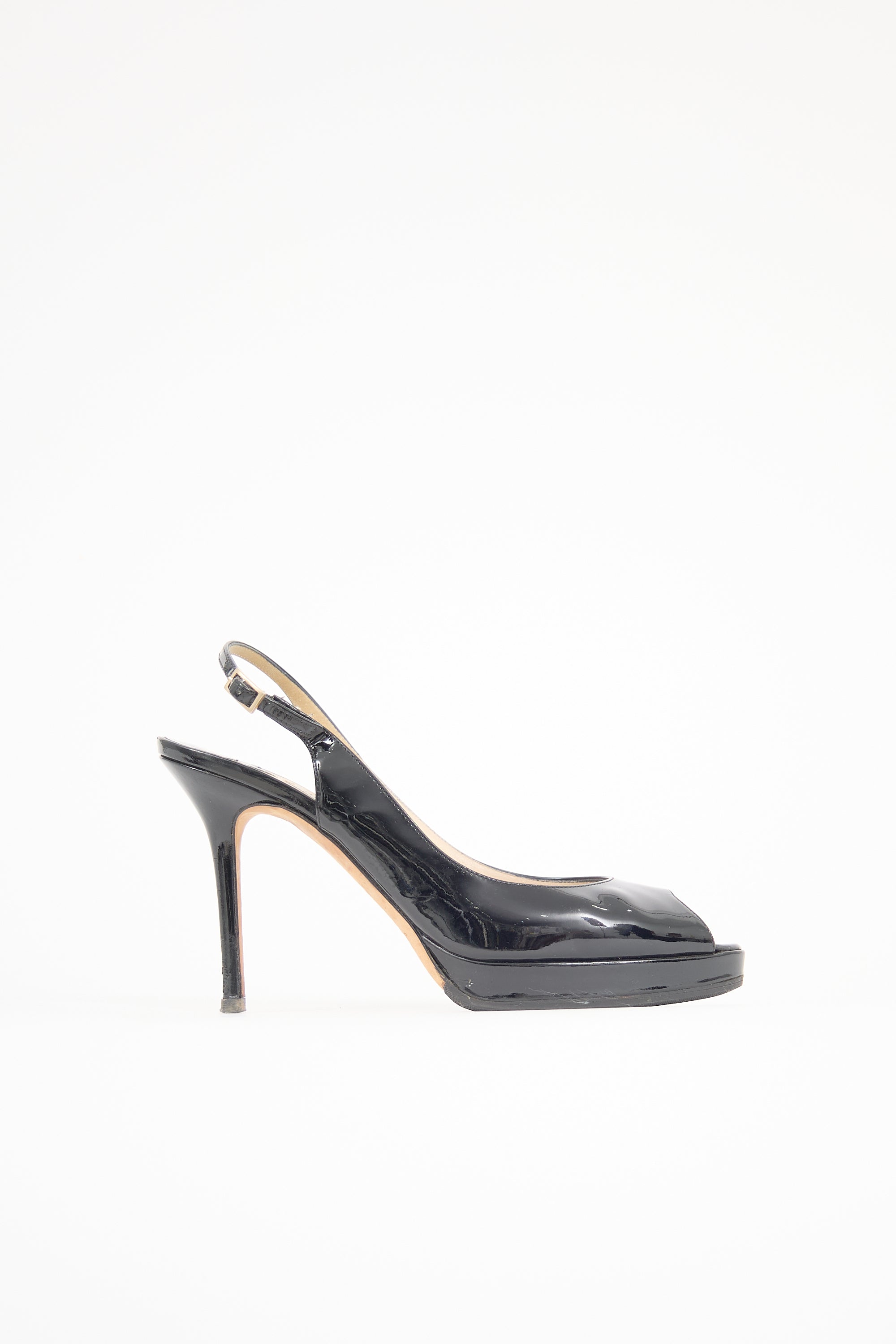 Pre-owned Jimmy Choo black patent leather Nova pumps featuring almond peep toe, adjustable slingback strap, and covered short platform and continental heel.