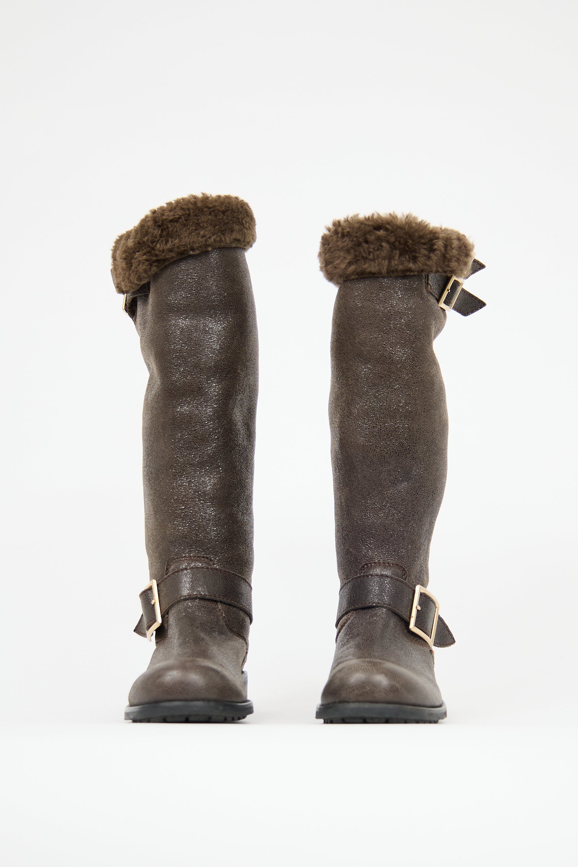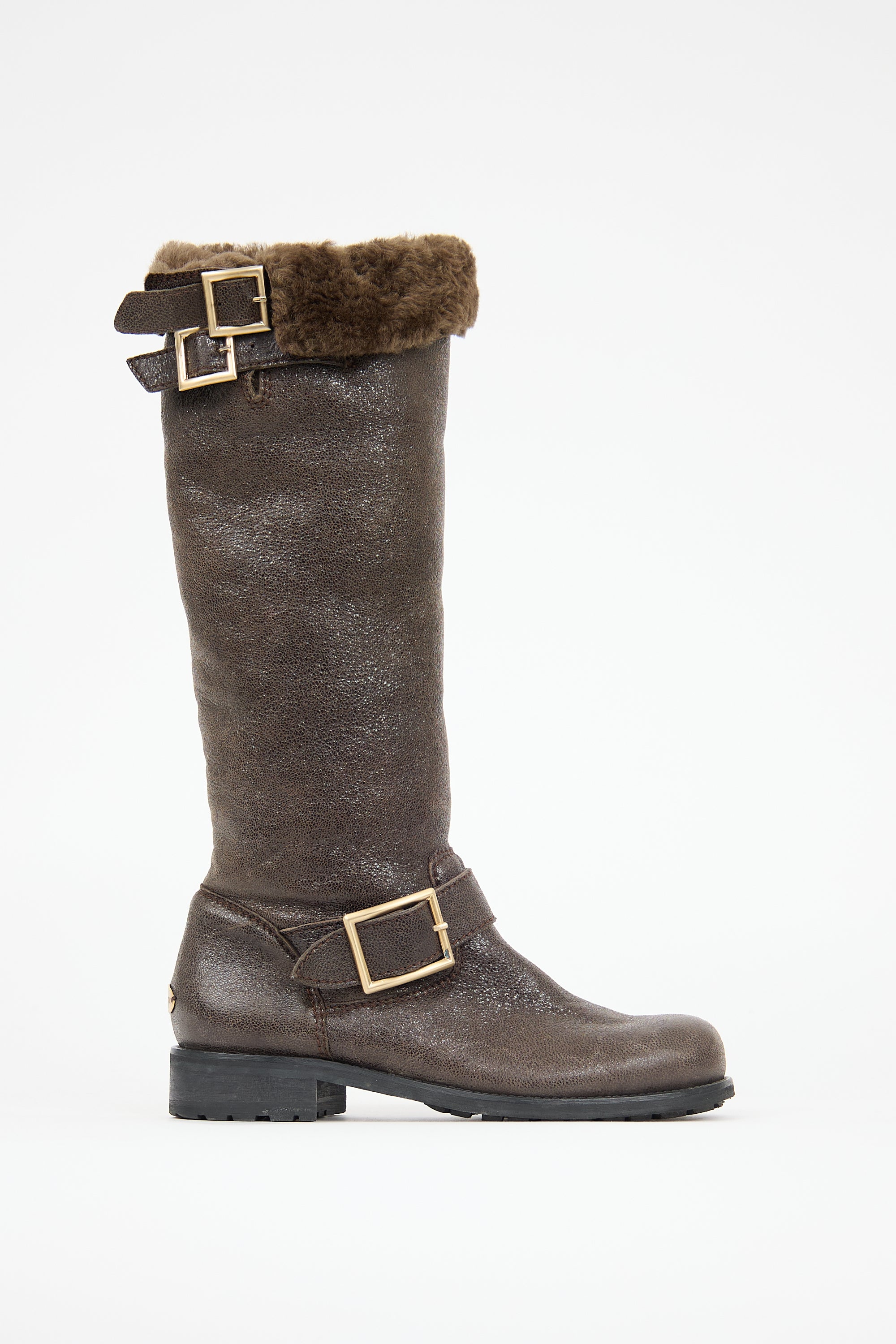 Pre-owned Jimmy Choo brown crackled leather Biker boot featuring a rounded toe, two adjustable straps at collar, brown shearling lining with leather insole, slip on entry, and treaded rubber soles.