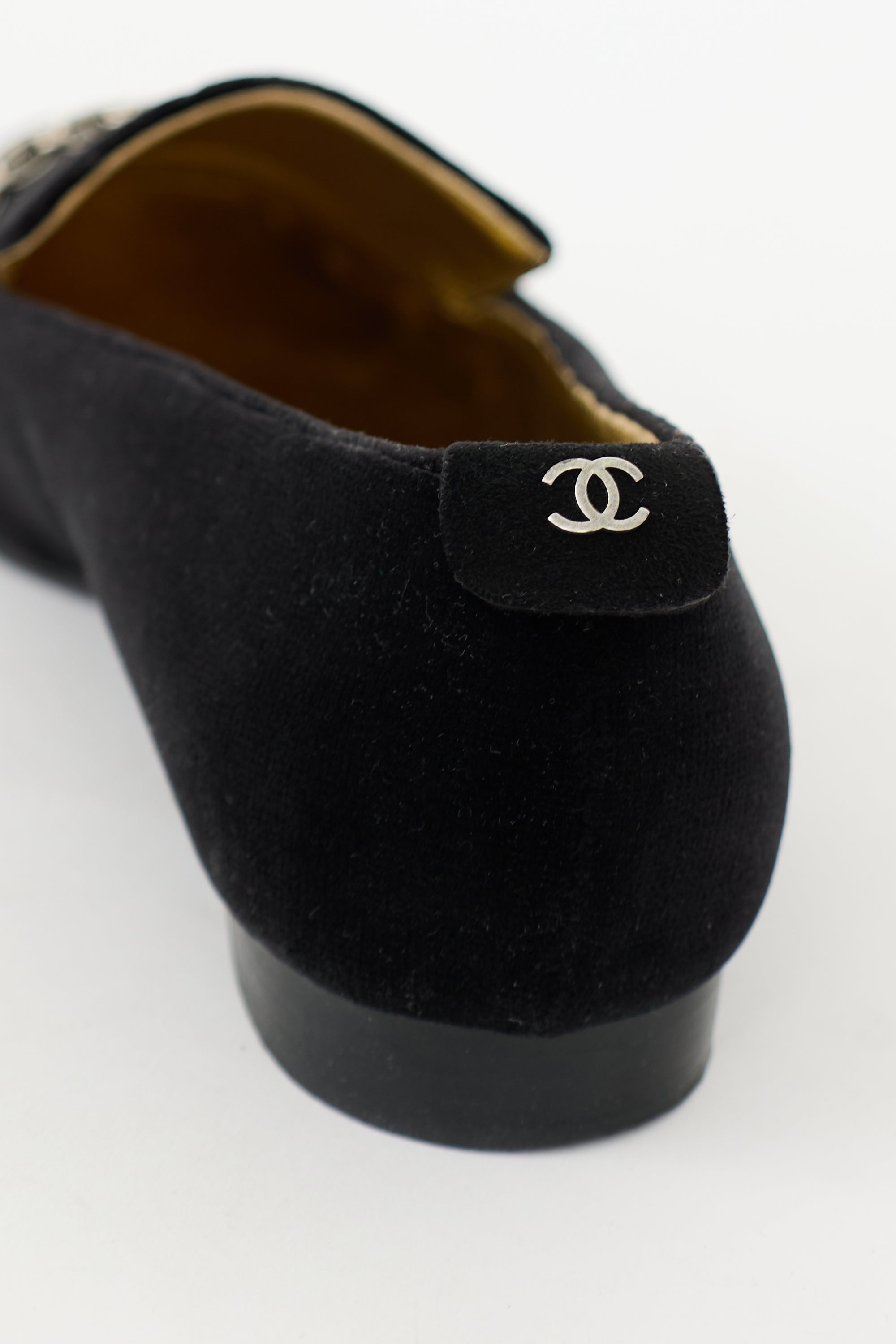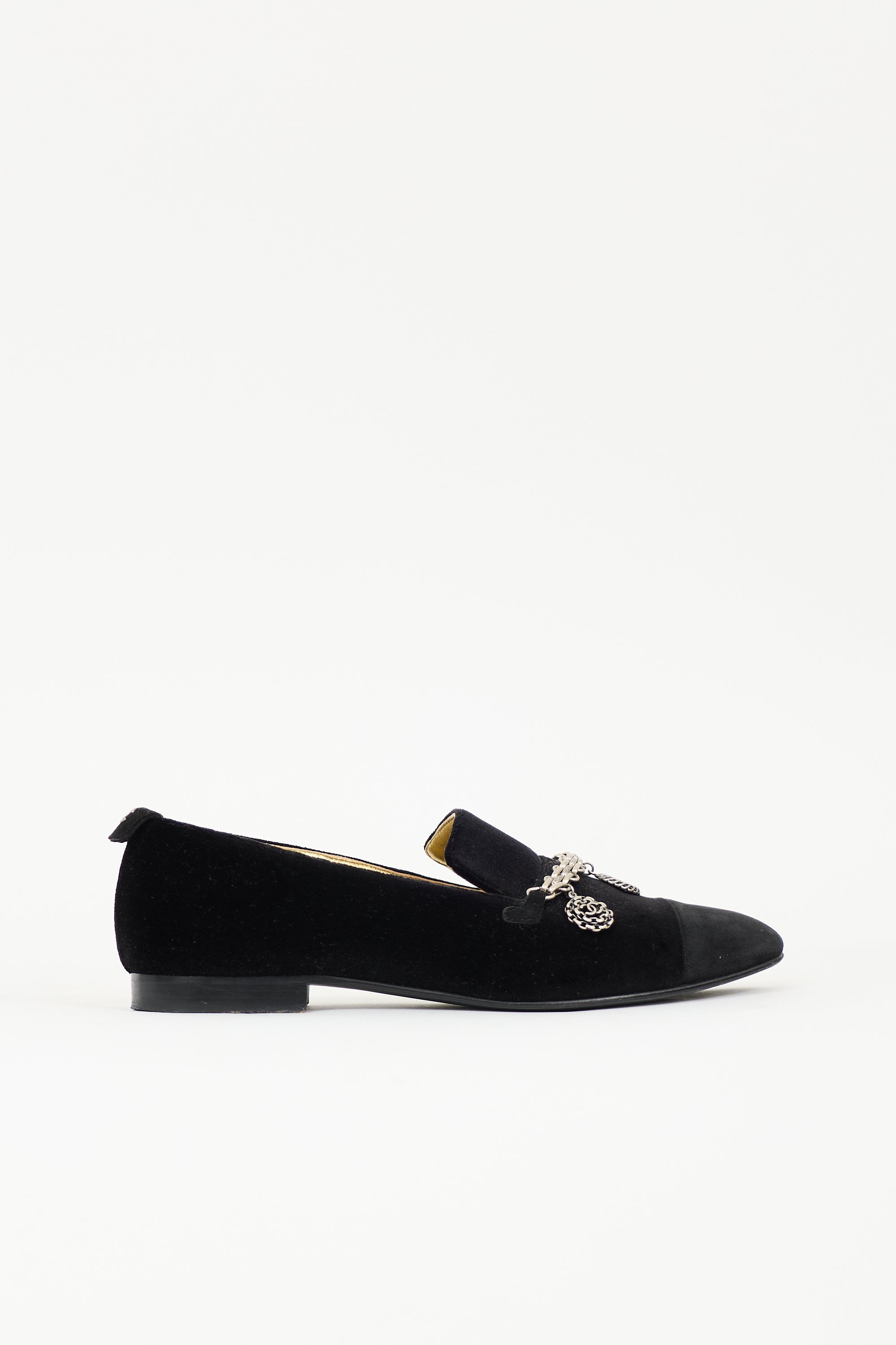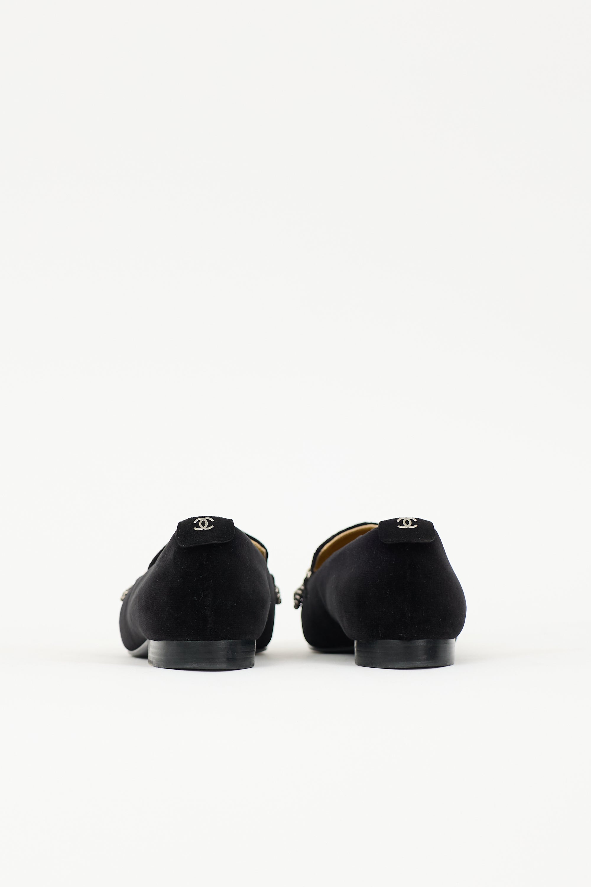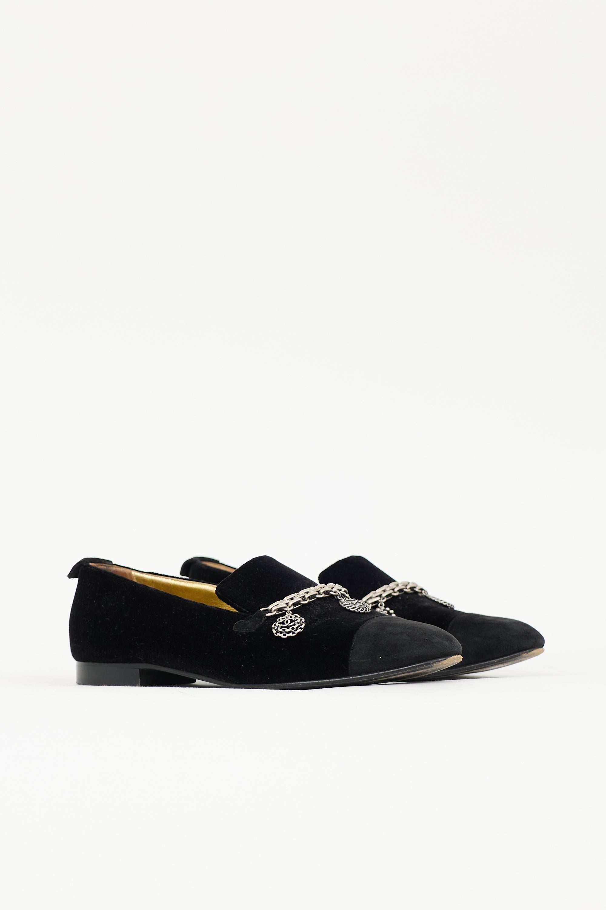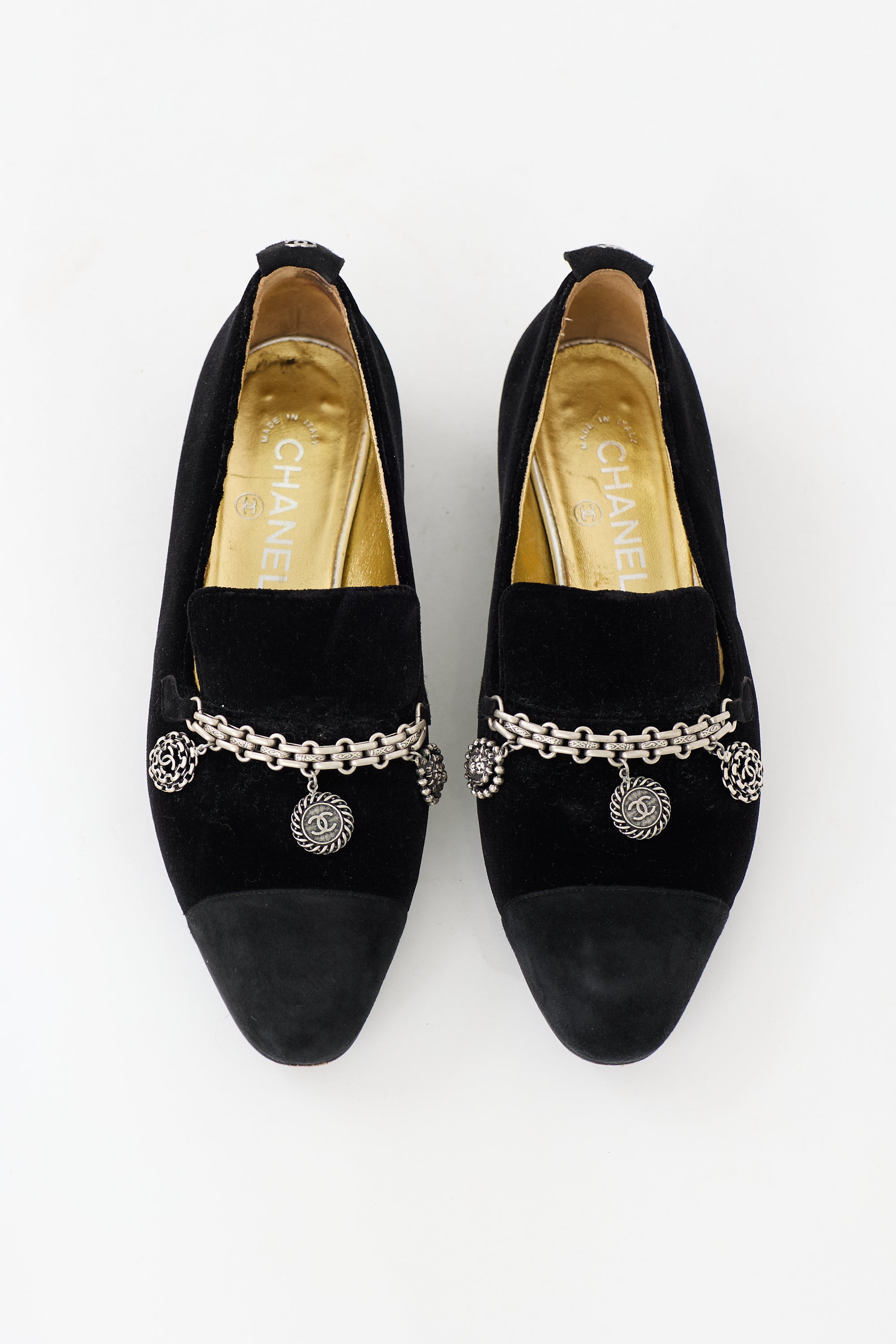 Pre-owned Chanel black velvet loafers featuring suede almond toe, silver tone chain and CC charms at toe, CC logo hardware at heel counter, and short stacked heel. Includes original dust bag.