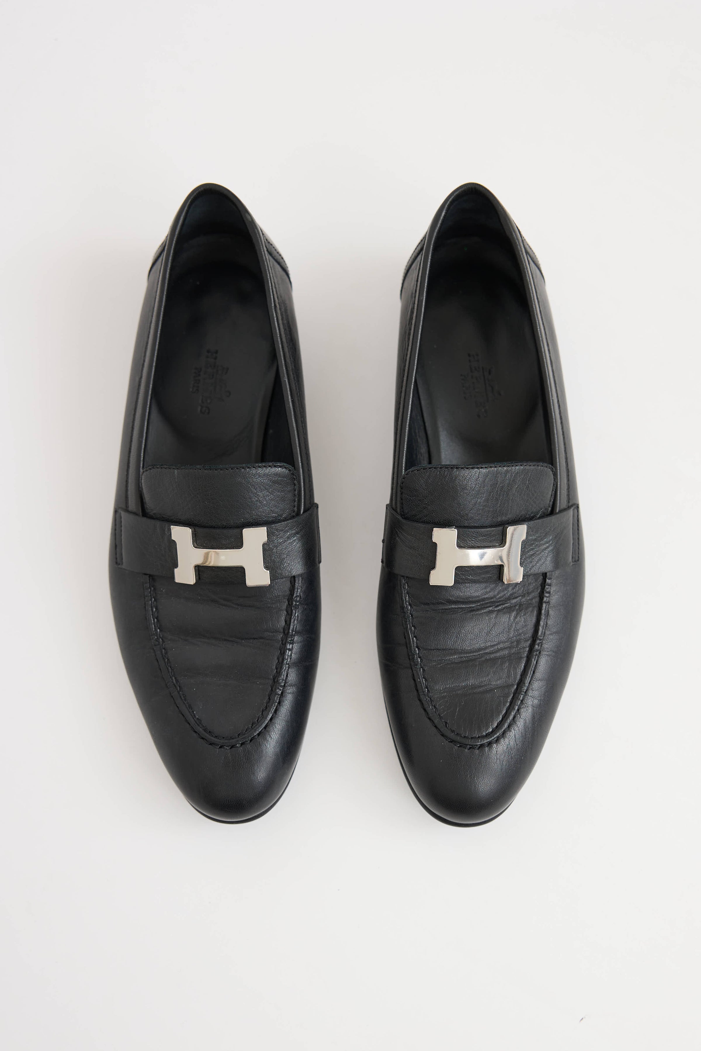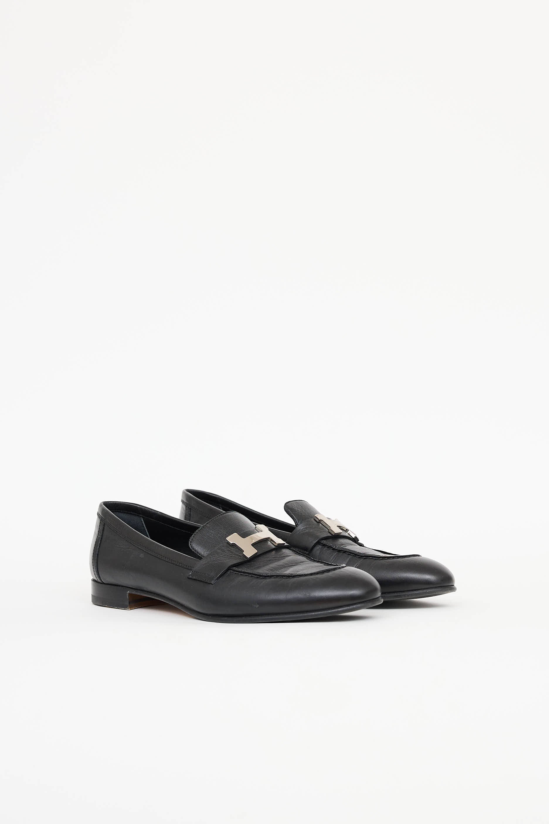 Pre-owned Hermès Noir leather Paris loafers featuring almond toe, silver tone H logo at tongue, leather insole, and stacked heel.