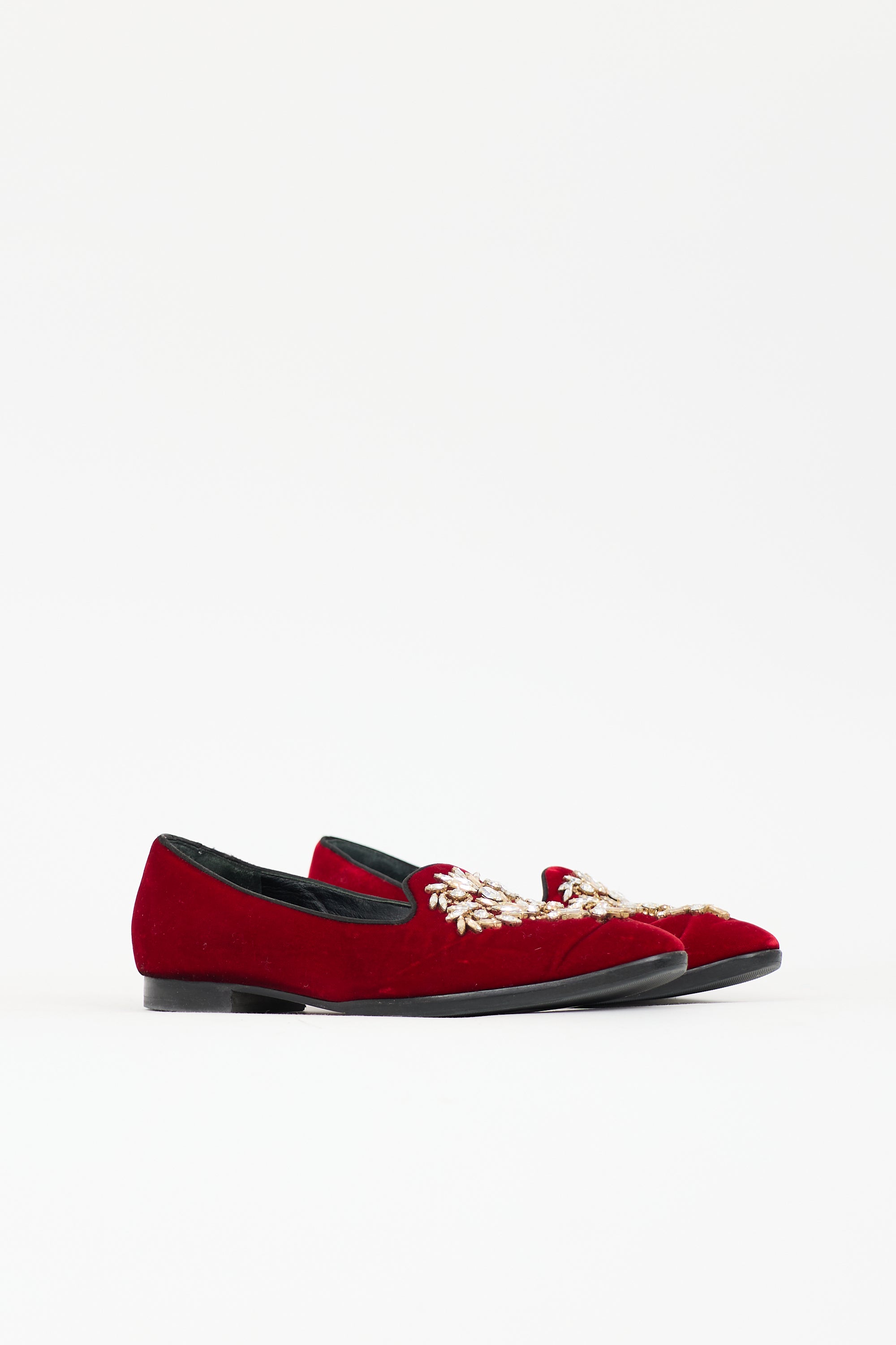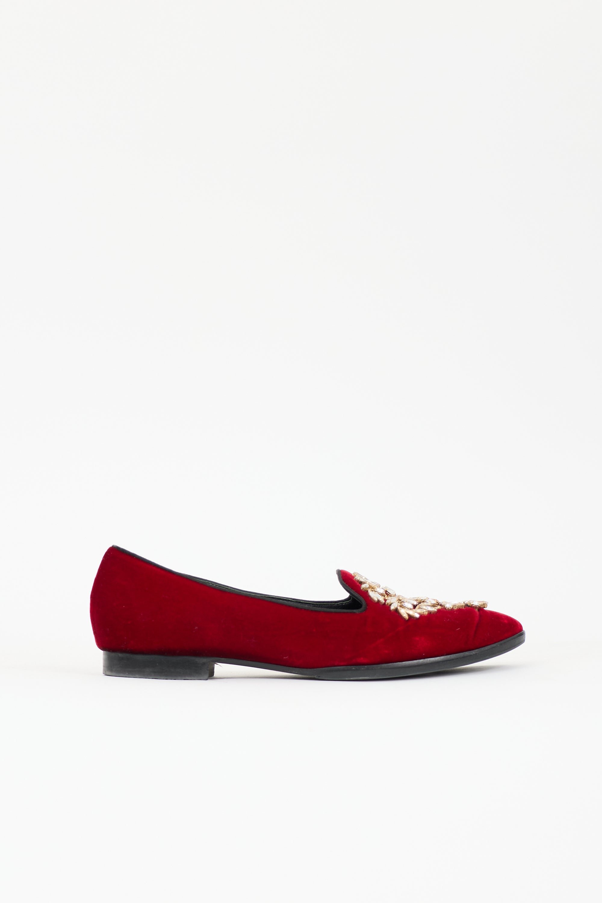 Pre-owned Rene Caovilla red velvet loafers featuring almond toe, crystal embellishment at front, and short block heel.