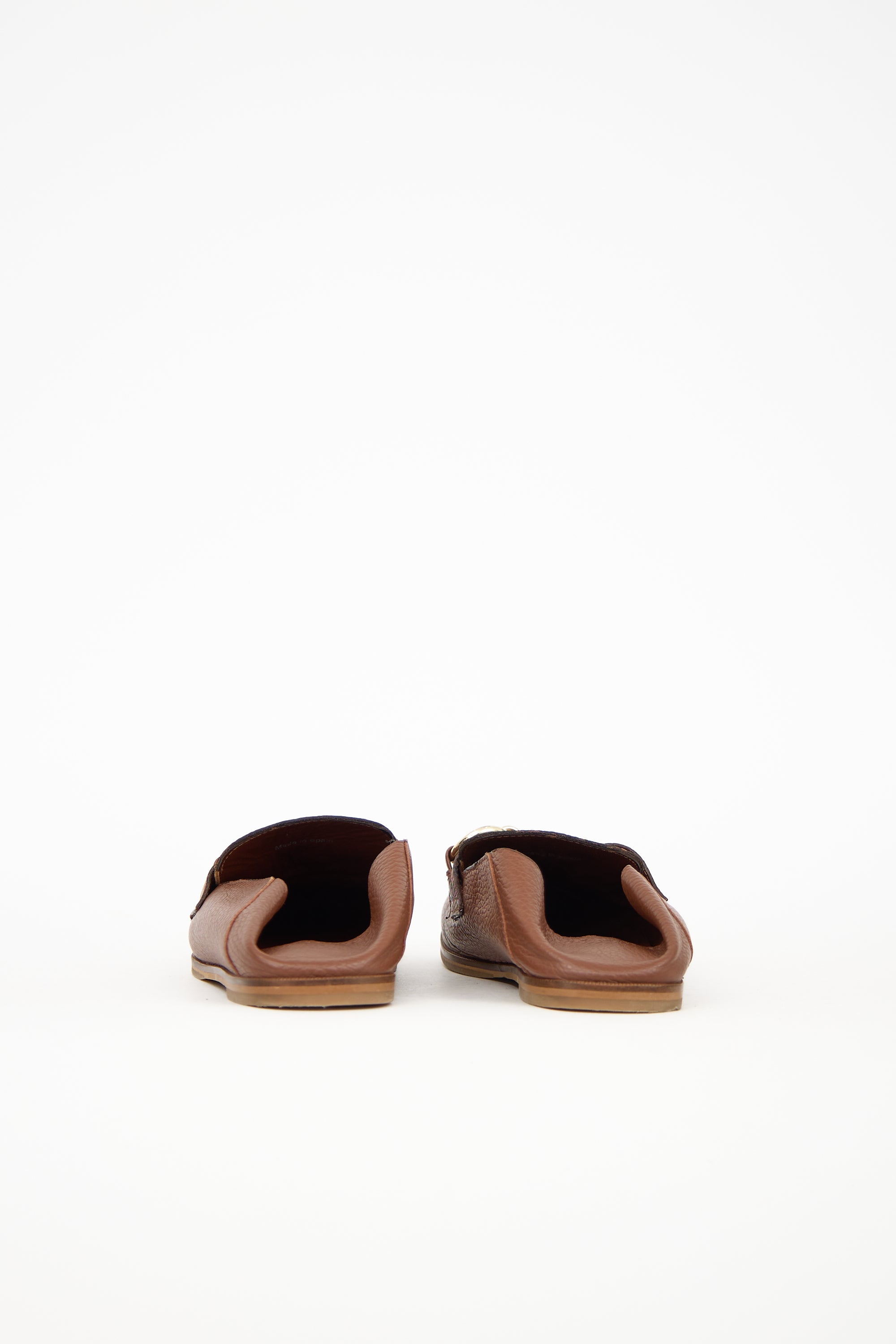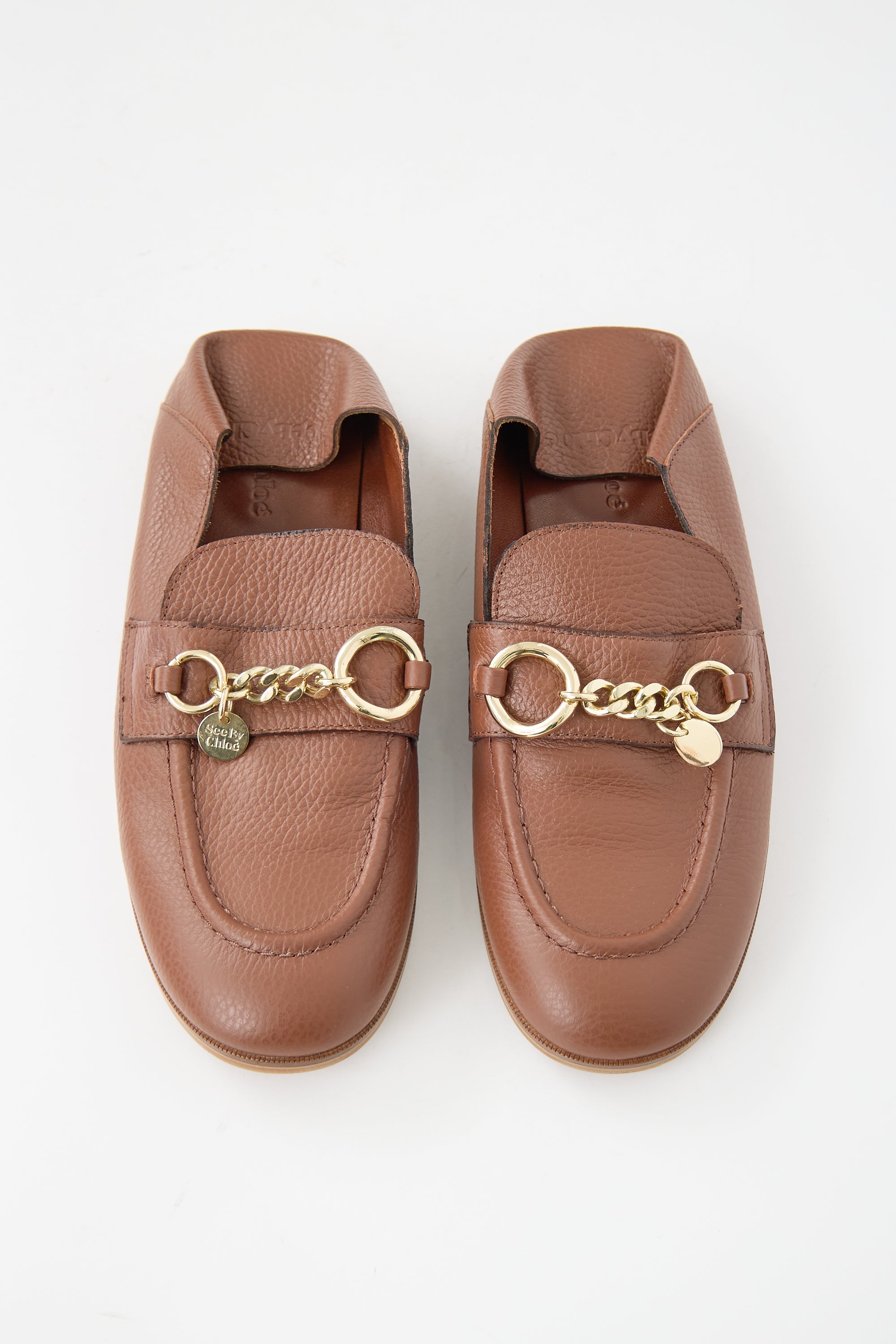 Pre-owned See by Chloé brown leather Aryel loafers featuring rounded toe, gold tone chain with circle logo charm at vamp strap, and collapsible heel with stamped logo.