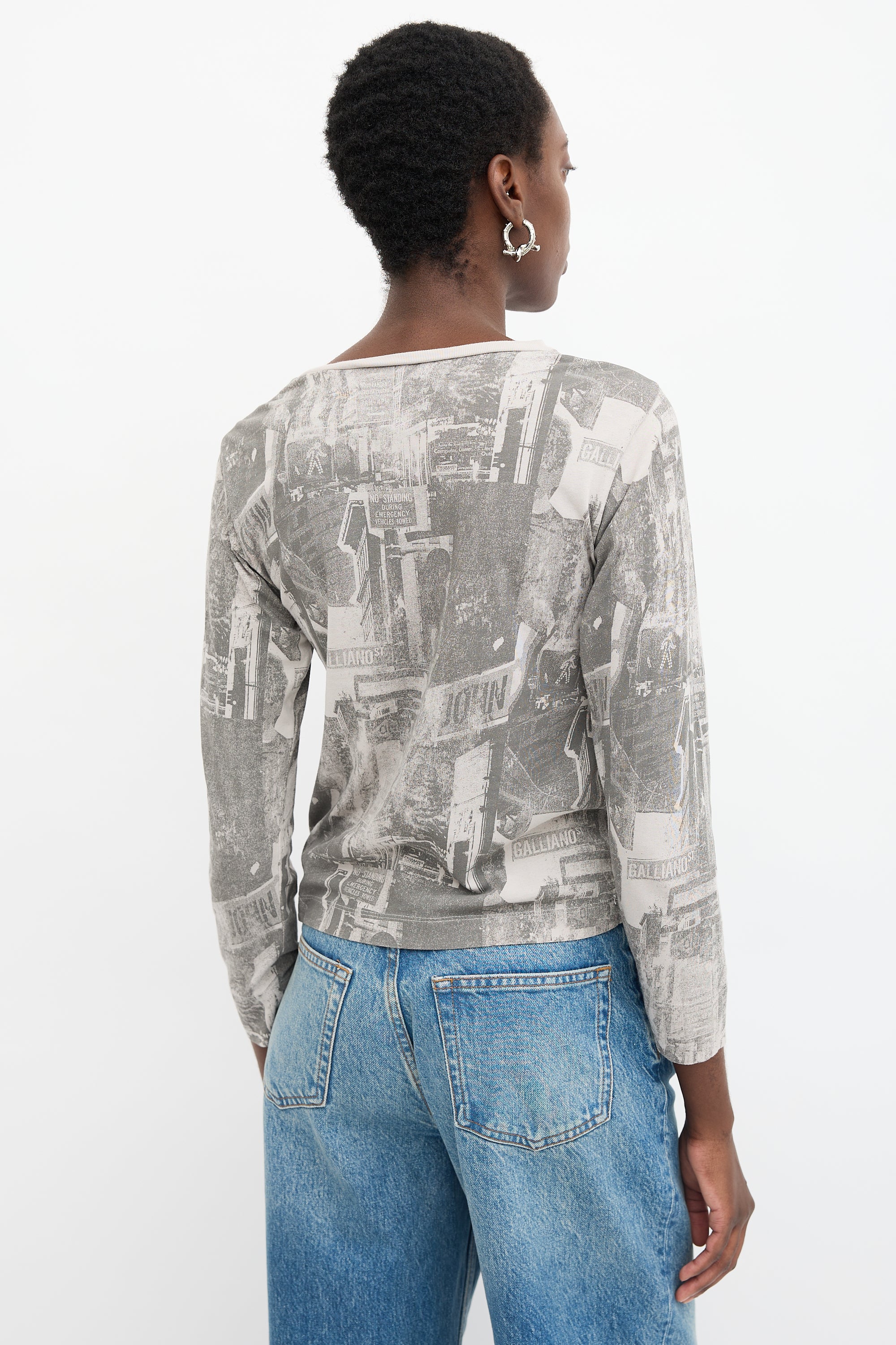 Pre-owned John Galliano grey top featuring tonal London street graphic print, Union Jack guitar print front, and crew neckline.