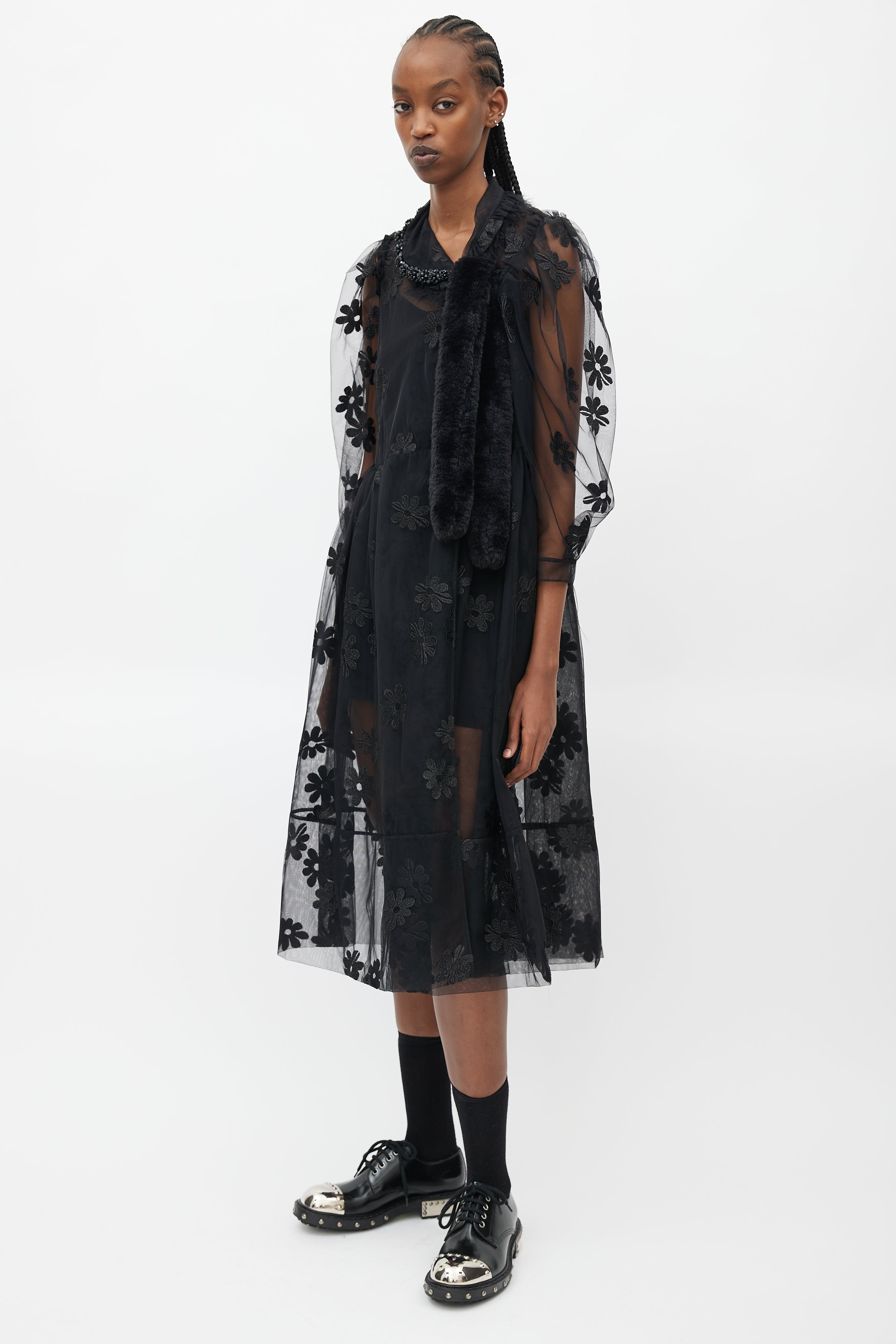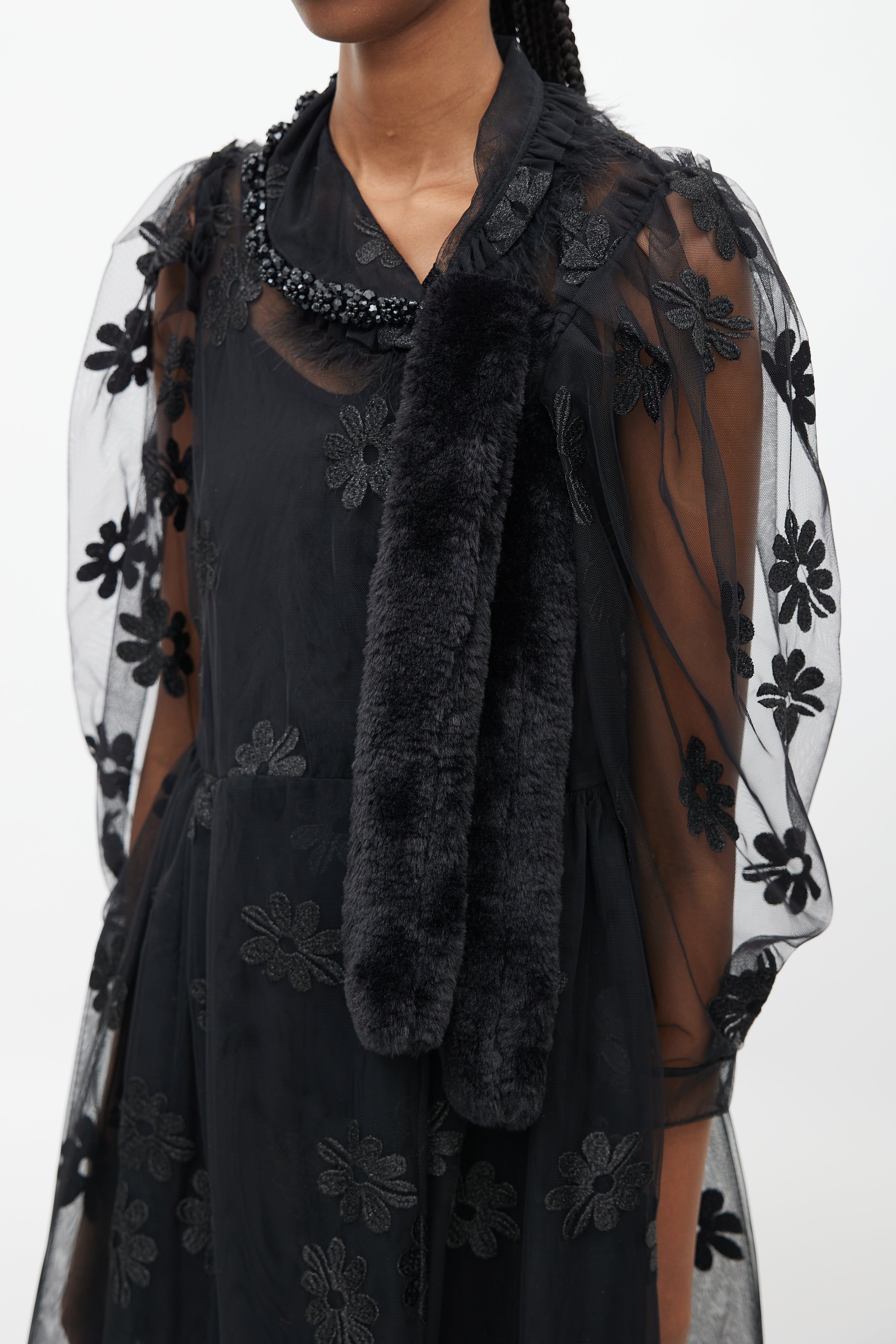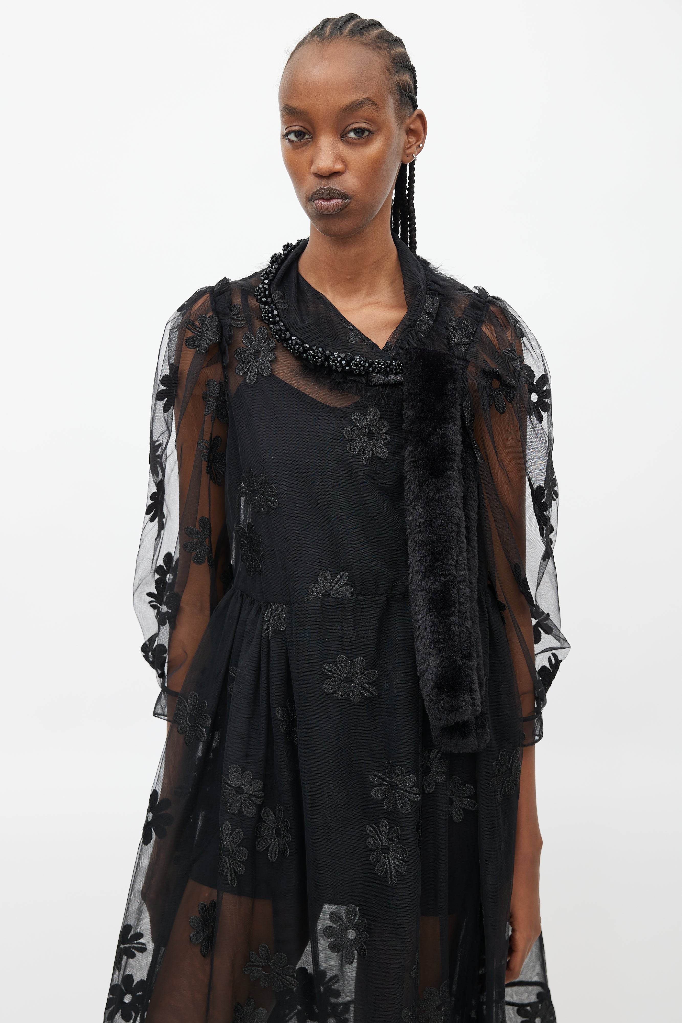 Pre-owned Simone Rocha black lace dress featuring a tonal floral embroidery throughout, shawl collar with jewel and marabou trim, faux fur detail at front, two slip pockets at hip, and wrap front with hook and eye closure. Styled with slip.