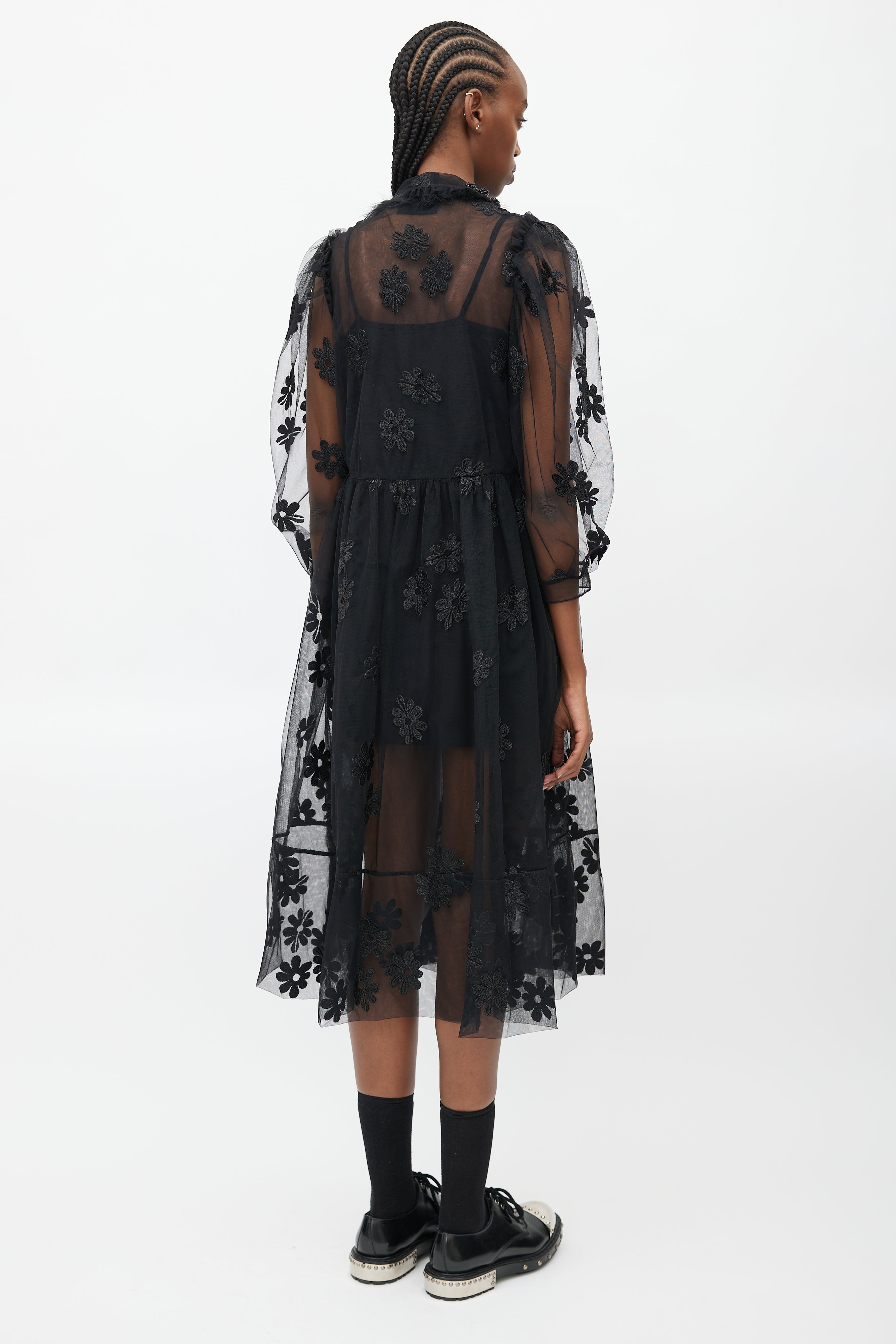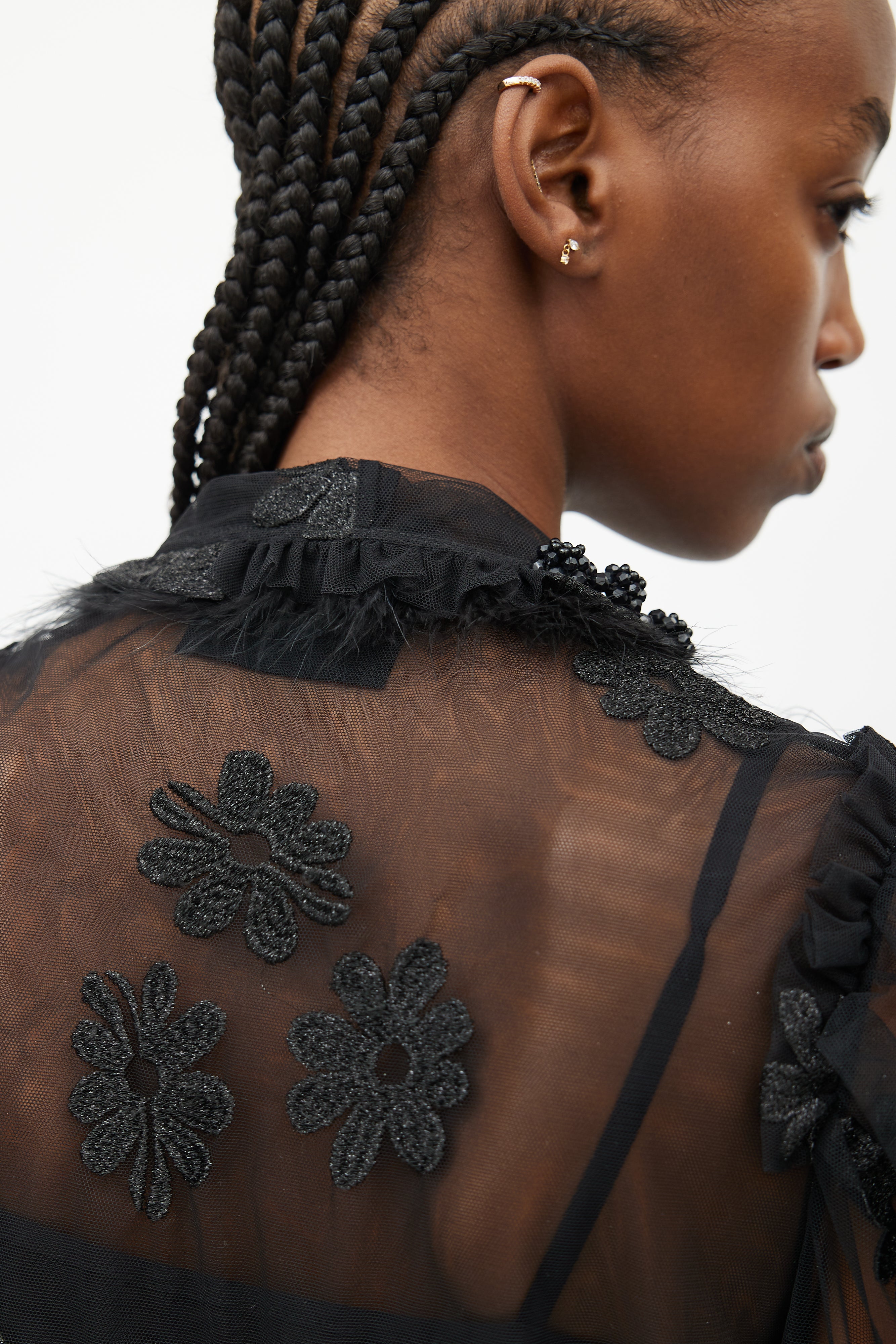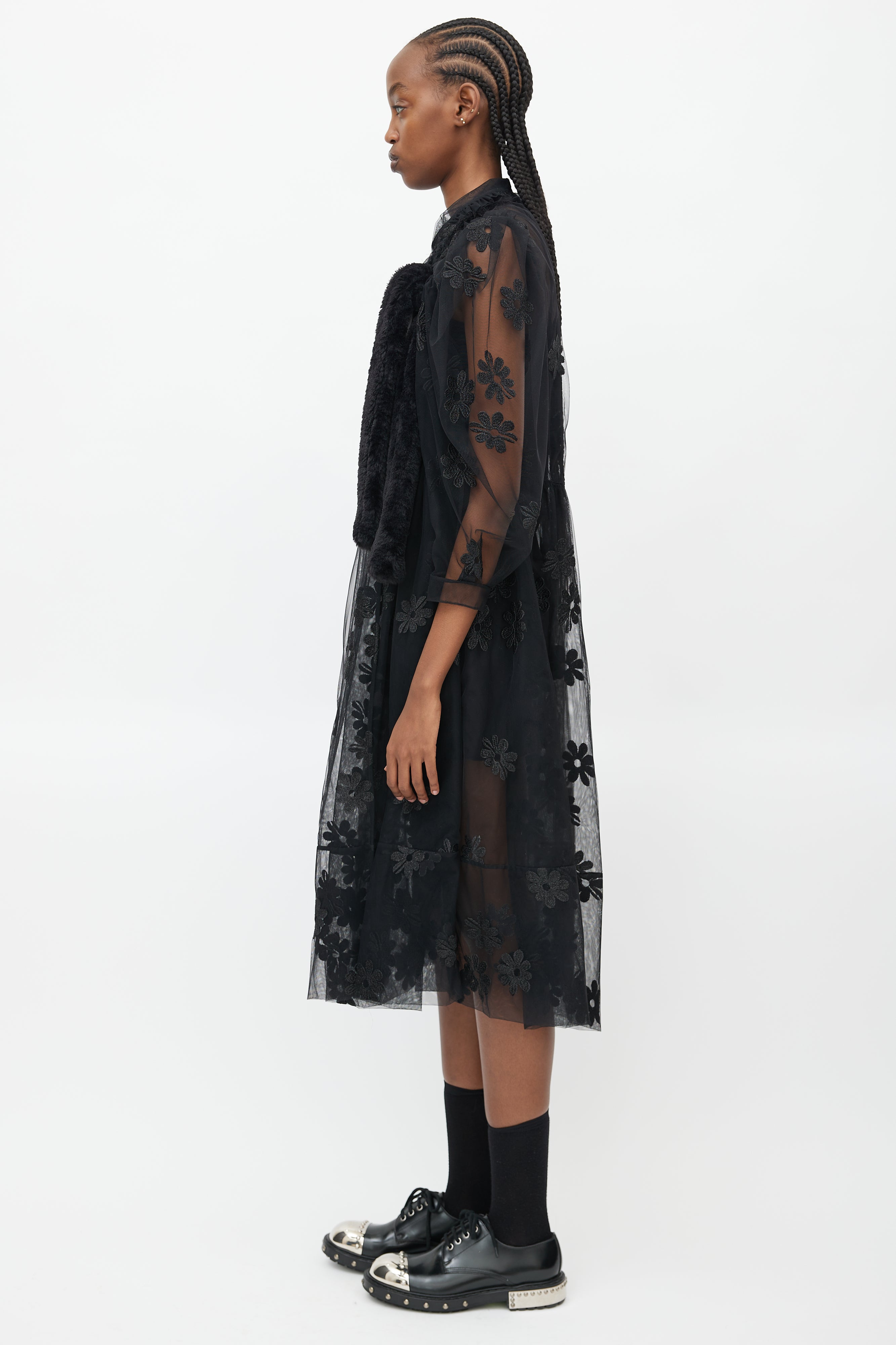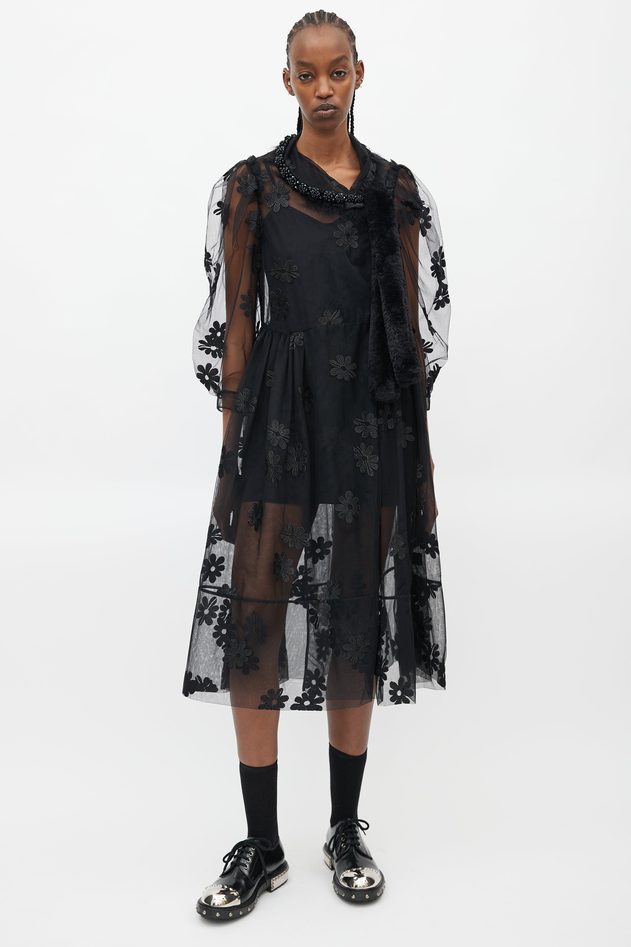 Pre-owned Simone Rocha black lace dress featuring a tonal floral embroidery throughout, shawl collar with jewel and marabou trim, faux fur detail at front, two slip pockets at hip, and wrap front with hook and eye closure. Styled with slip.