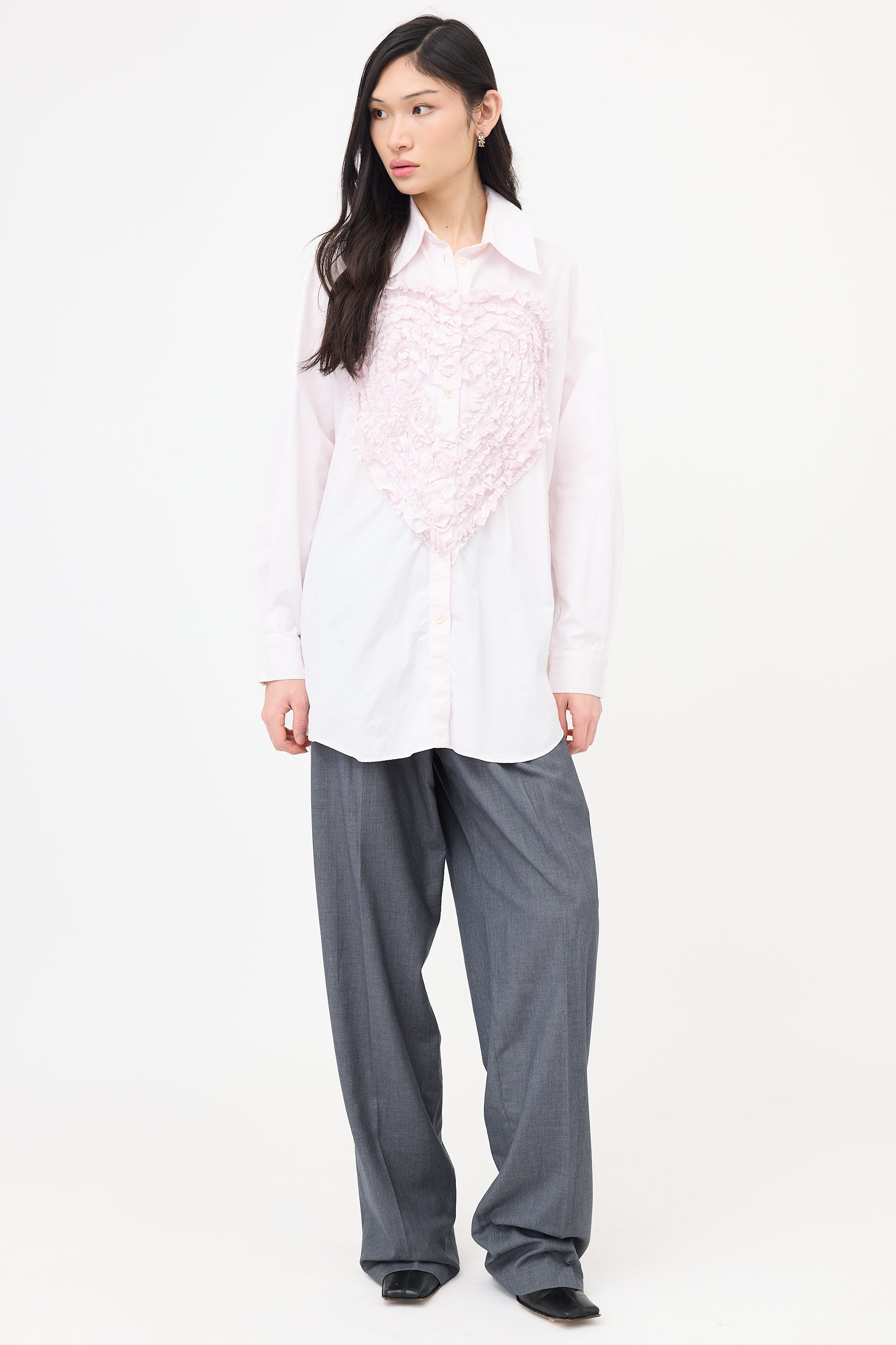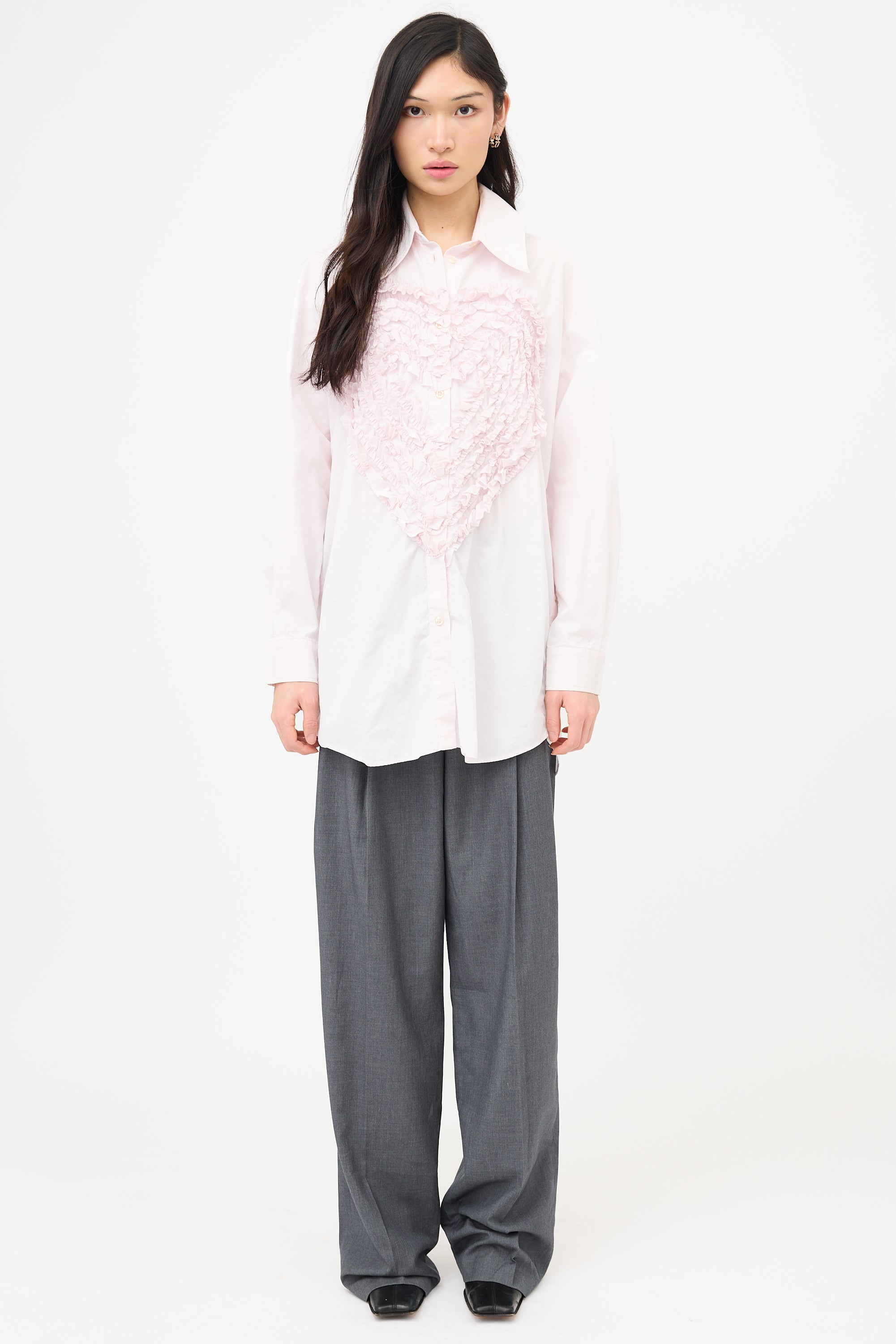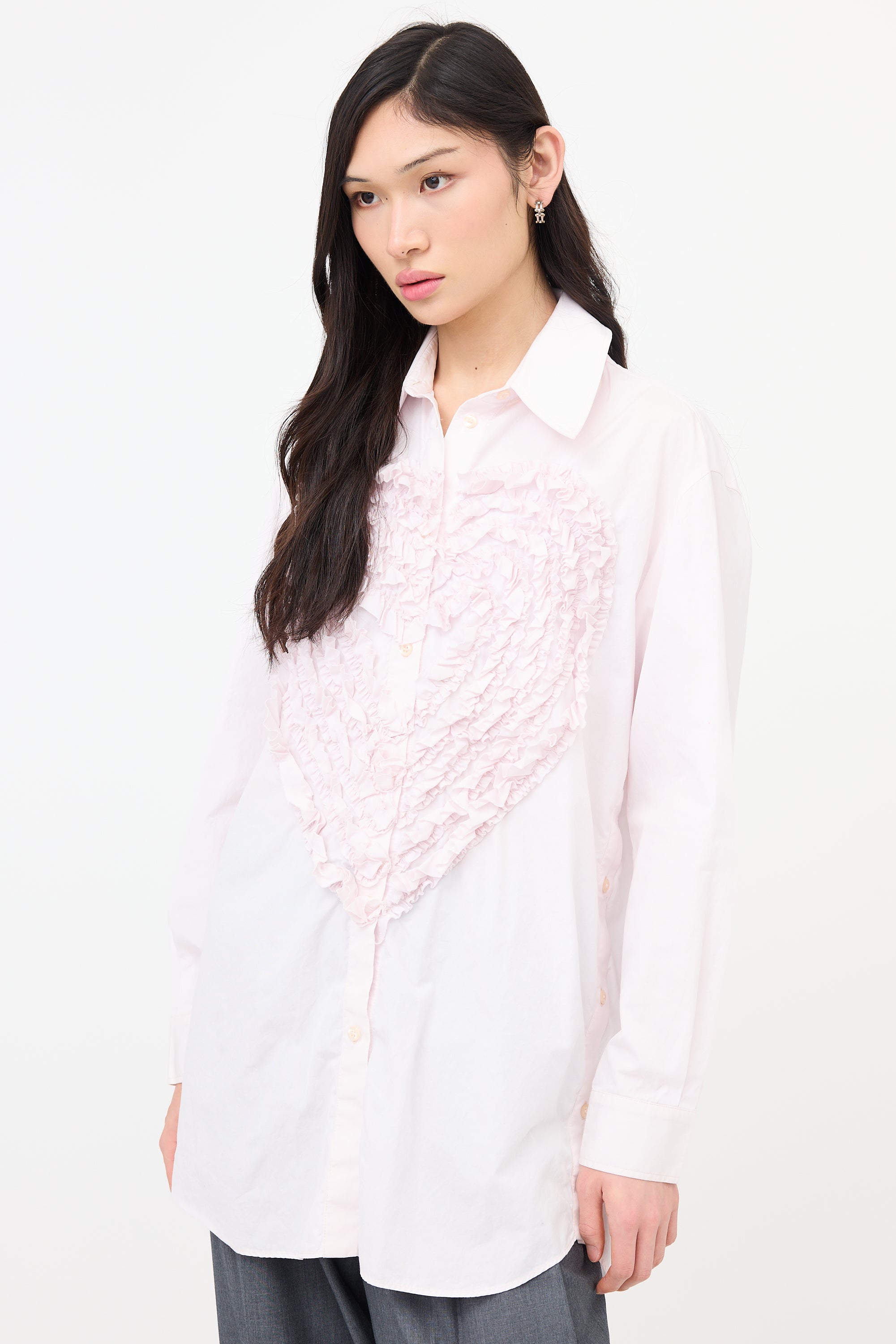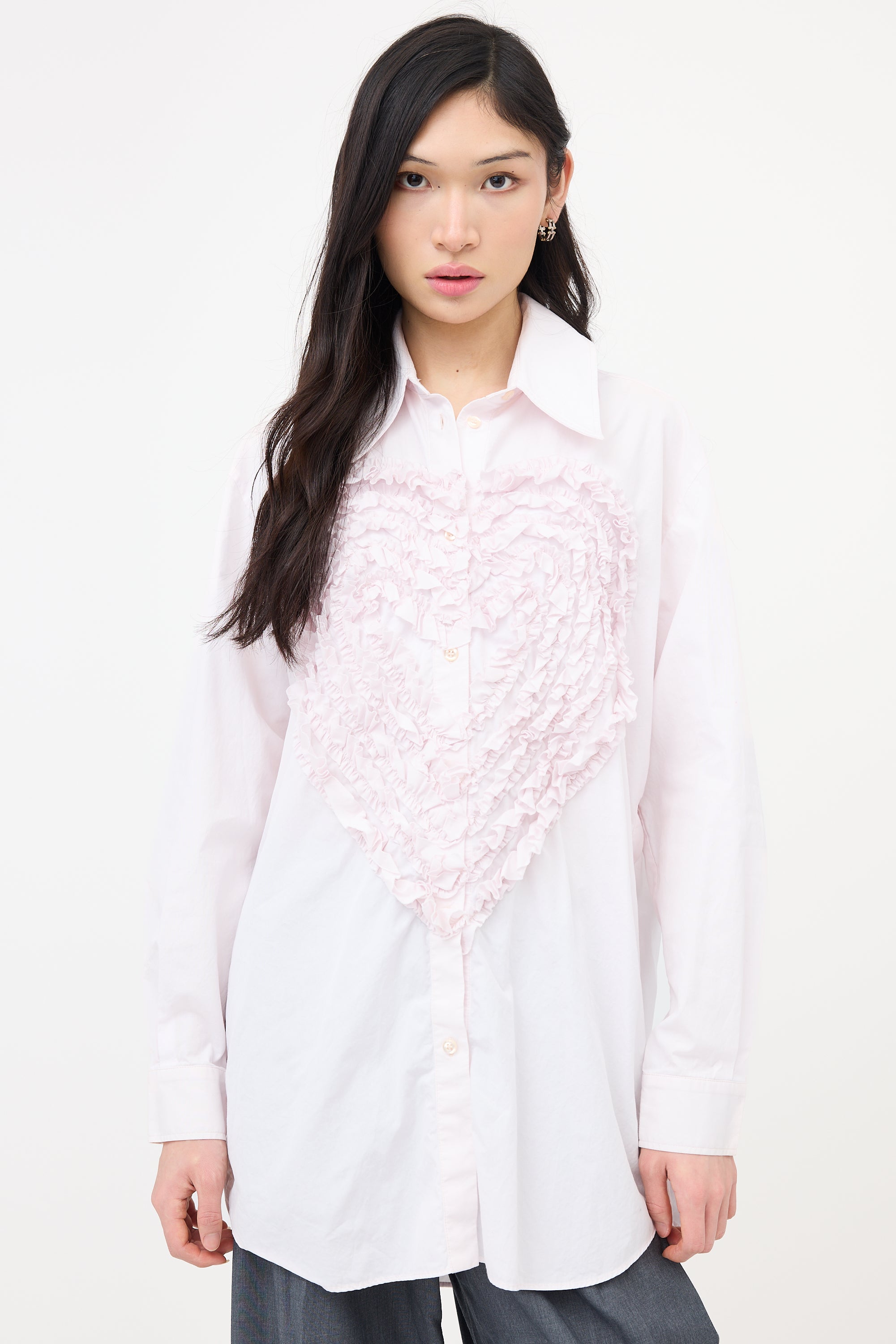 Pre-owned Simone Rocha pink shirt featuring a spread collar, ruffled Heart motif embroidered front, button front and left side, and button cuffs.