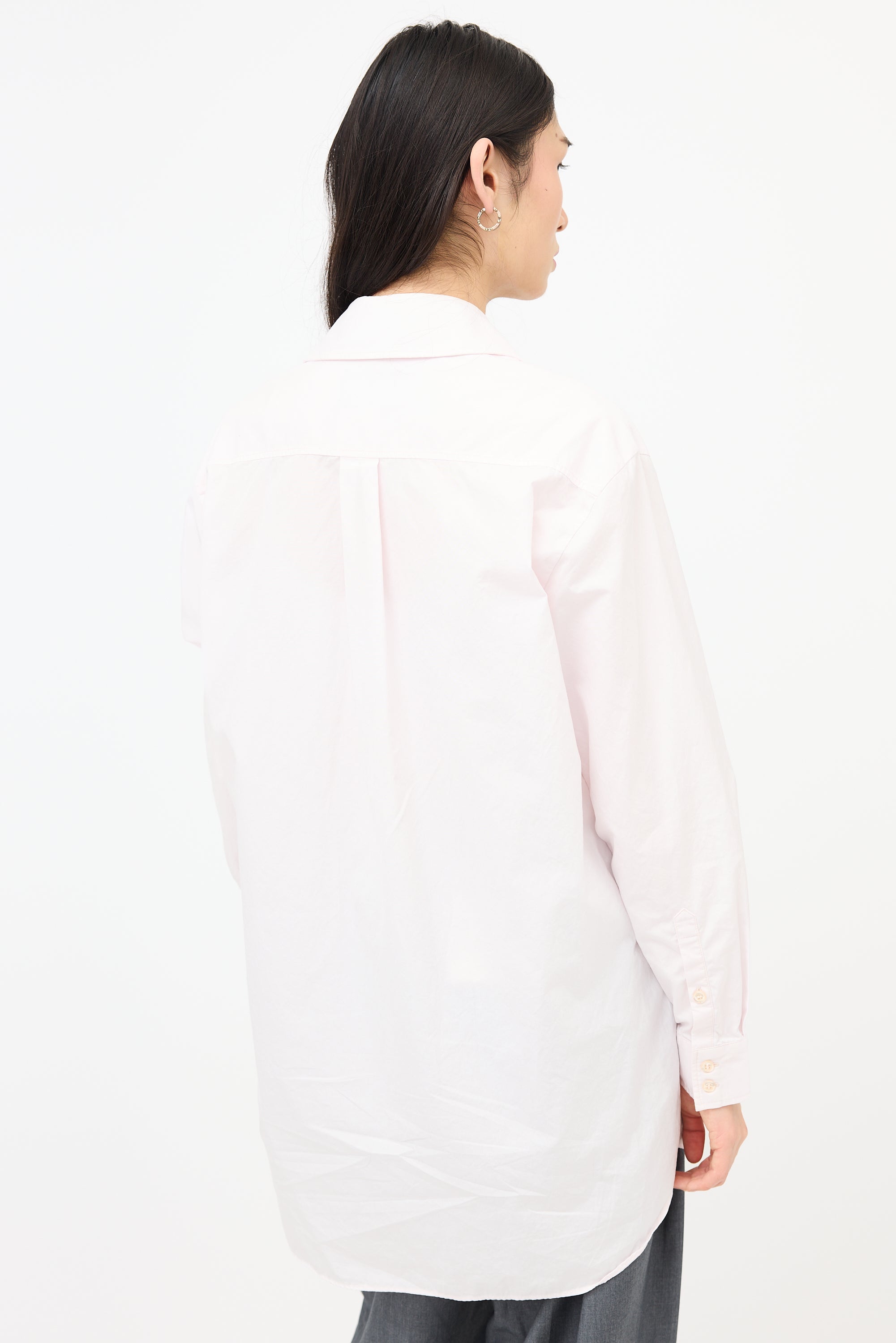 Good Minor signs of wear throughout surface and staining at collar. Puckering at placket.
