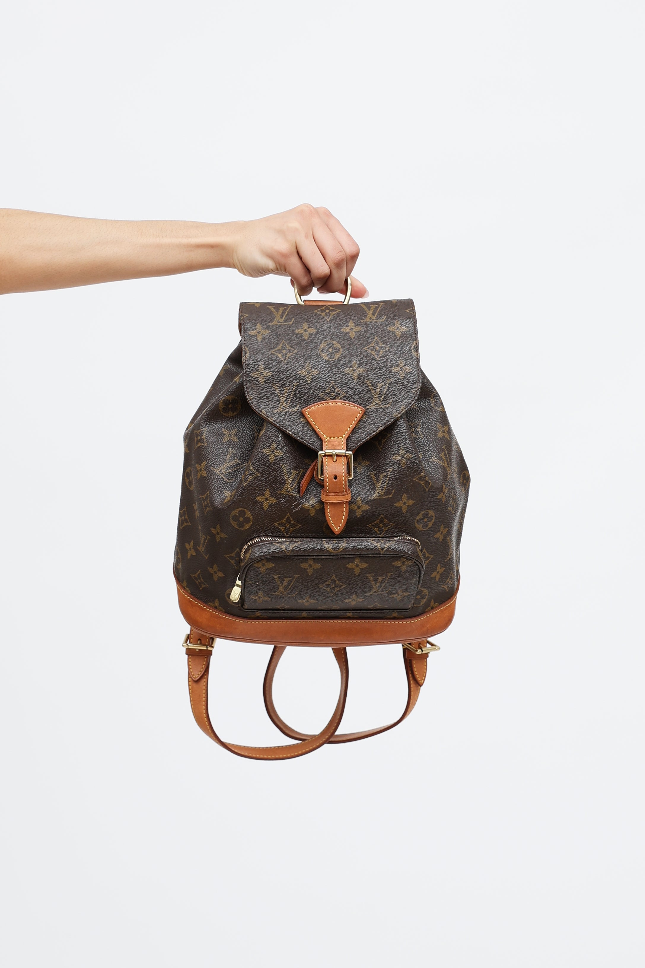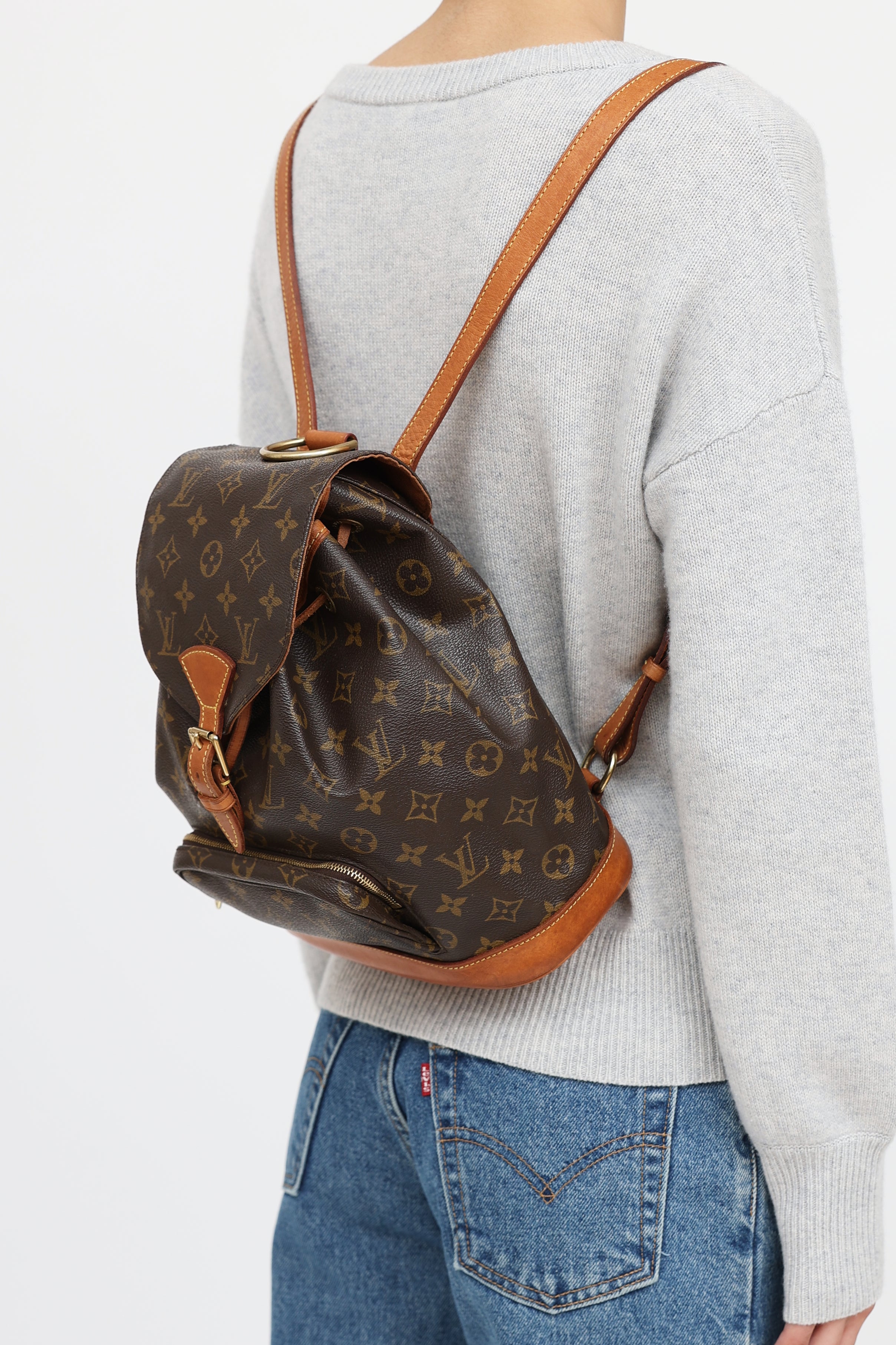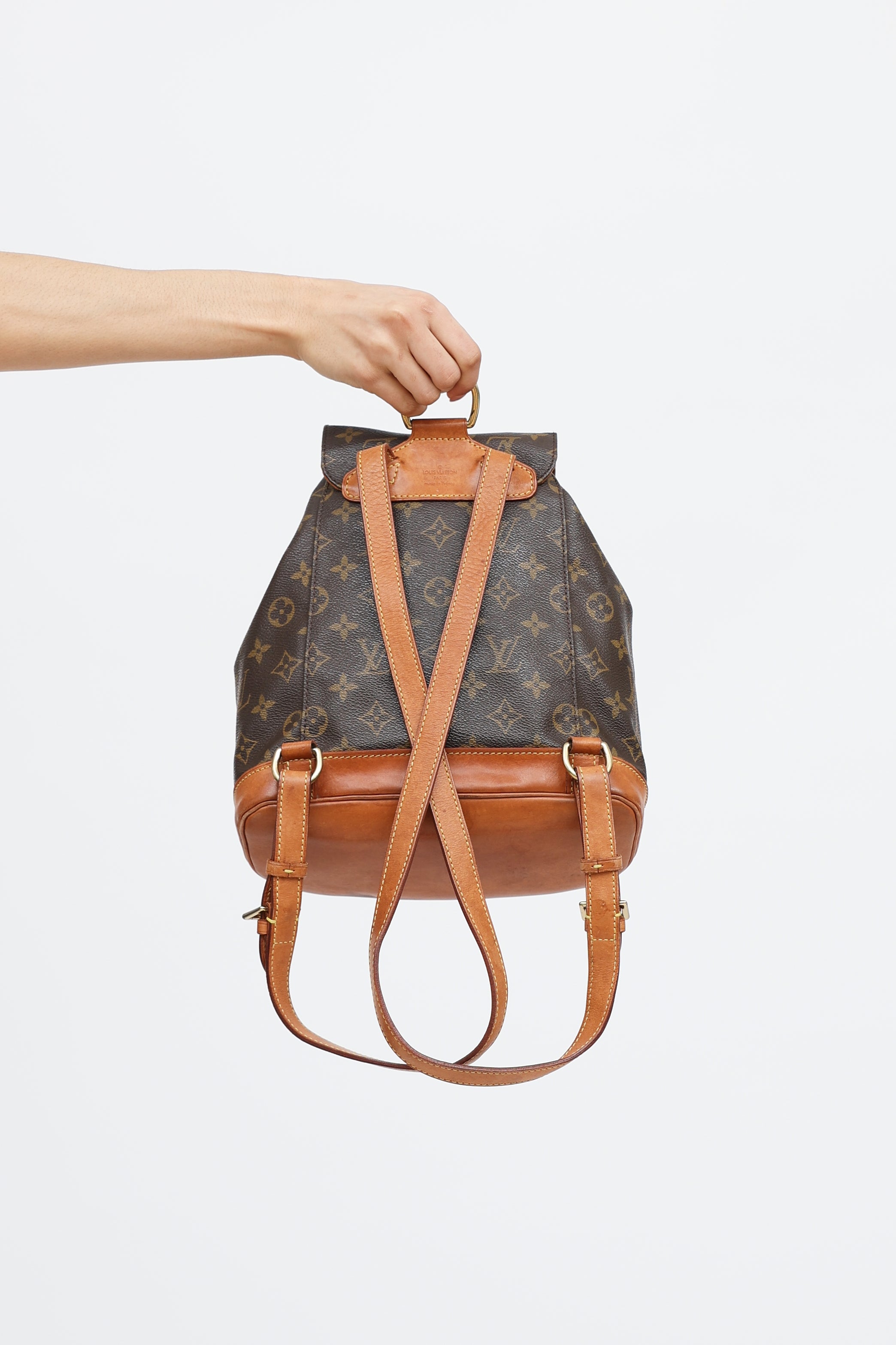 Pre-owned Louis Vuitton Monsouris MM backpack featuring monogram canvas, exterior zip pocket at face, Vachetta leather trim, top flap with strap closure, drawstring fastening at top, gold tone top handle, adjustable shoulder straps, one main compartment, and interior slip pocket.
