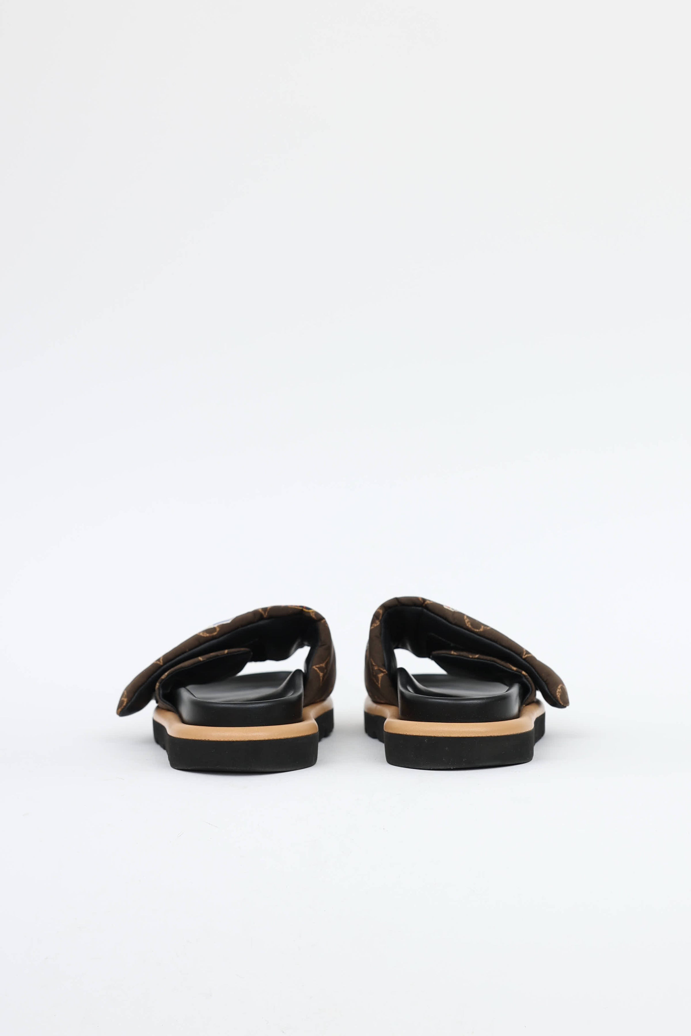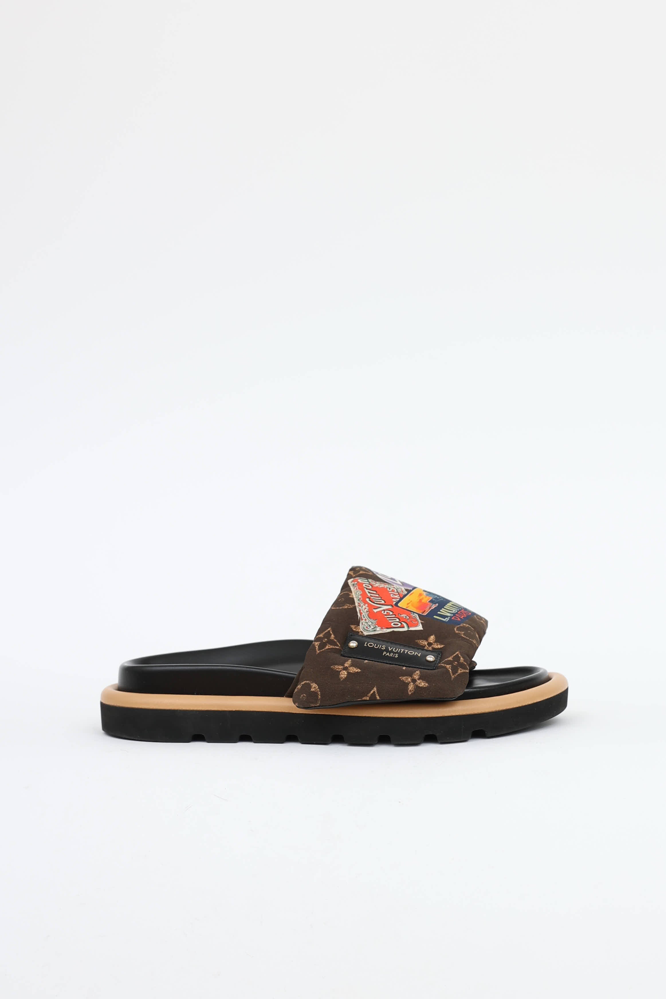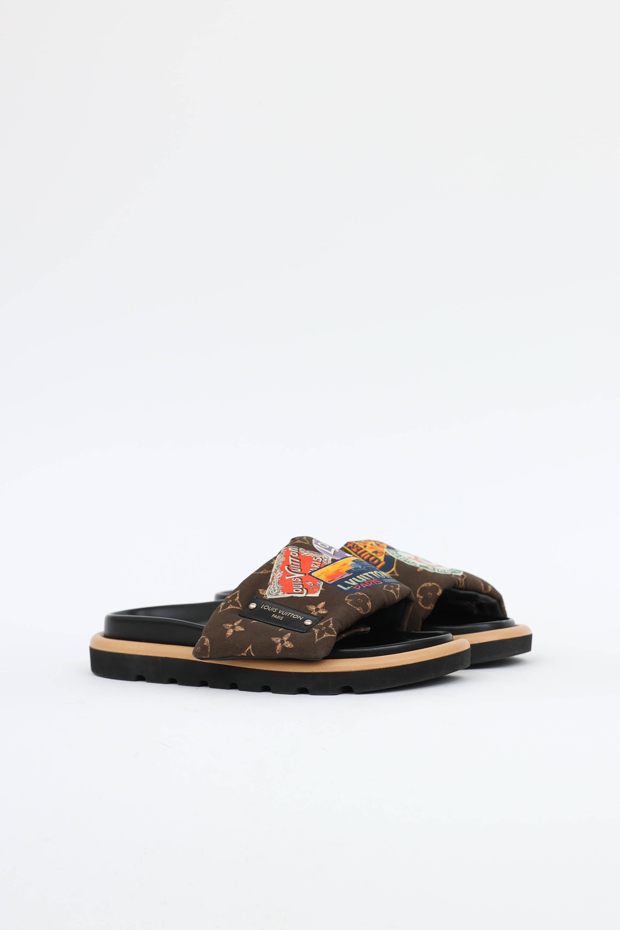 Pre-owned Louis Vuitton brown and multicolour Pillow Voyage slides featuring a rounded open toe, slip on entry, monogram velcro strap at vamp with leather logo patch and travle themed graphics, black leather insole, and treaded outsole.