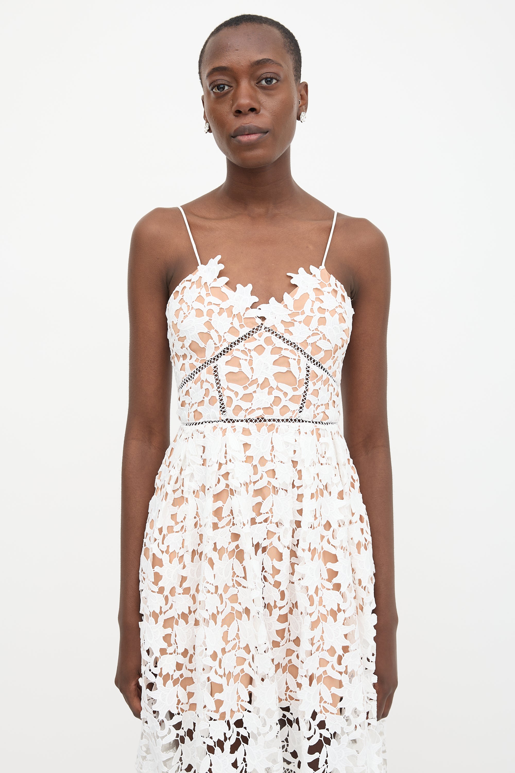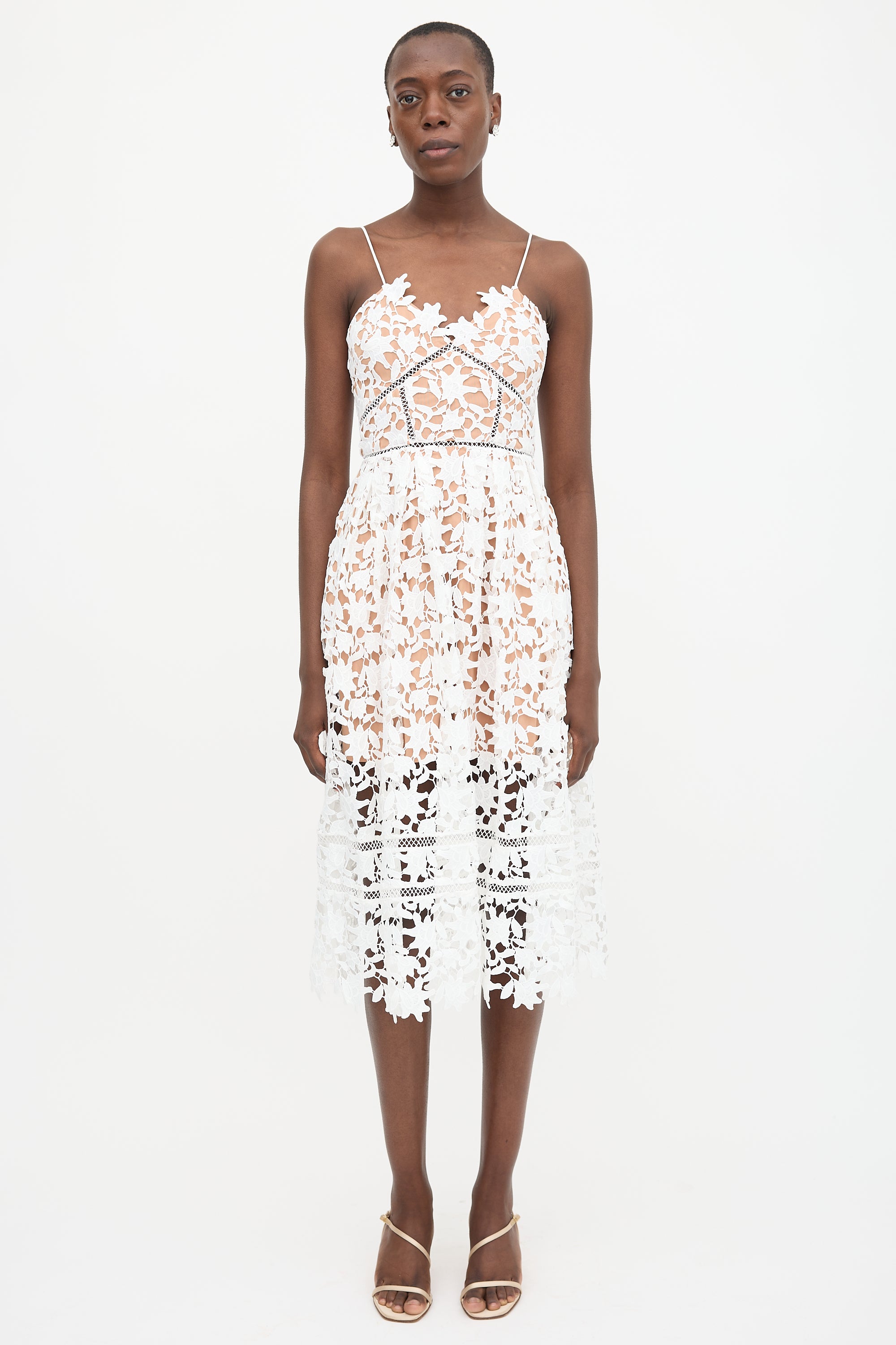 Pre-owned Self-Portrait white guipure lace Azaelea midi dress featuring spaghetti straps, V-neckline, back zip closure, and scalloped hemline. Lined.