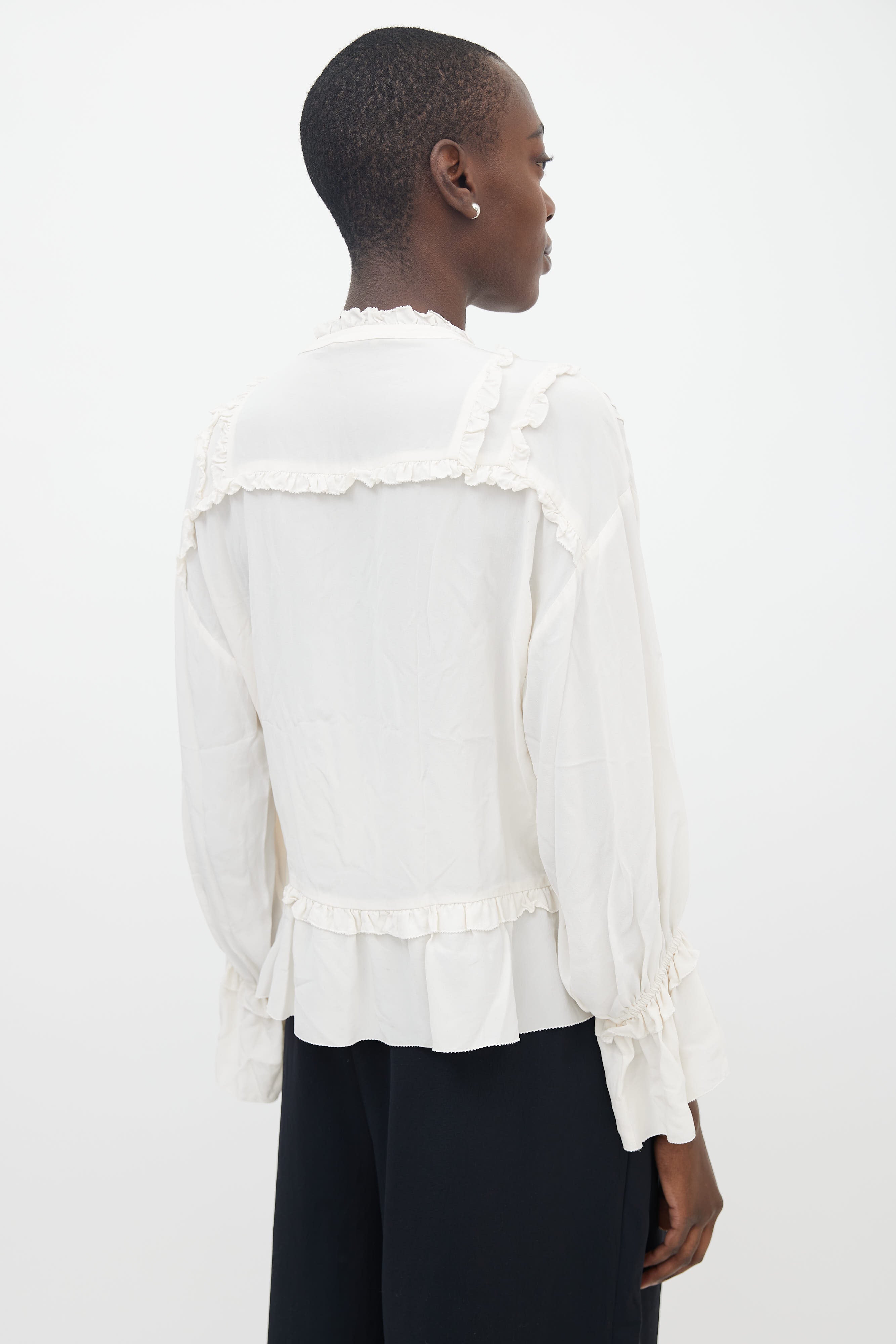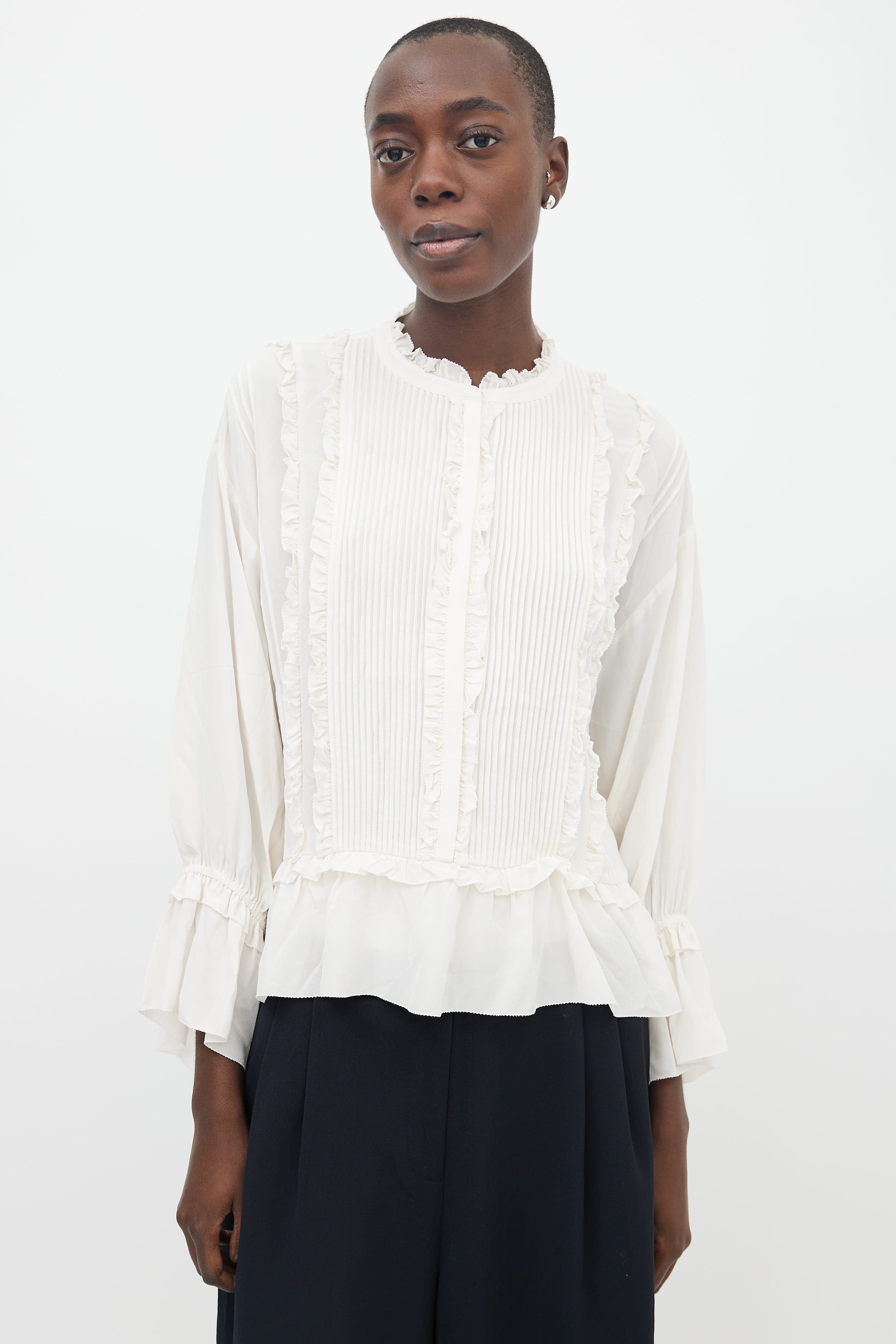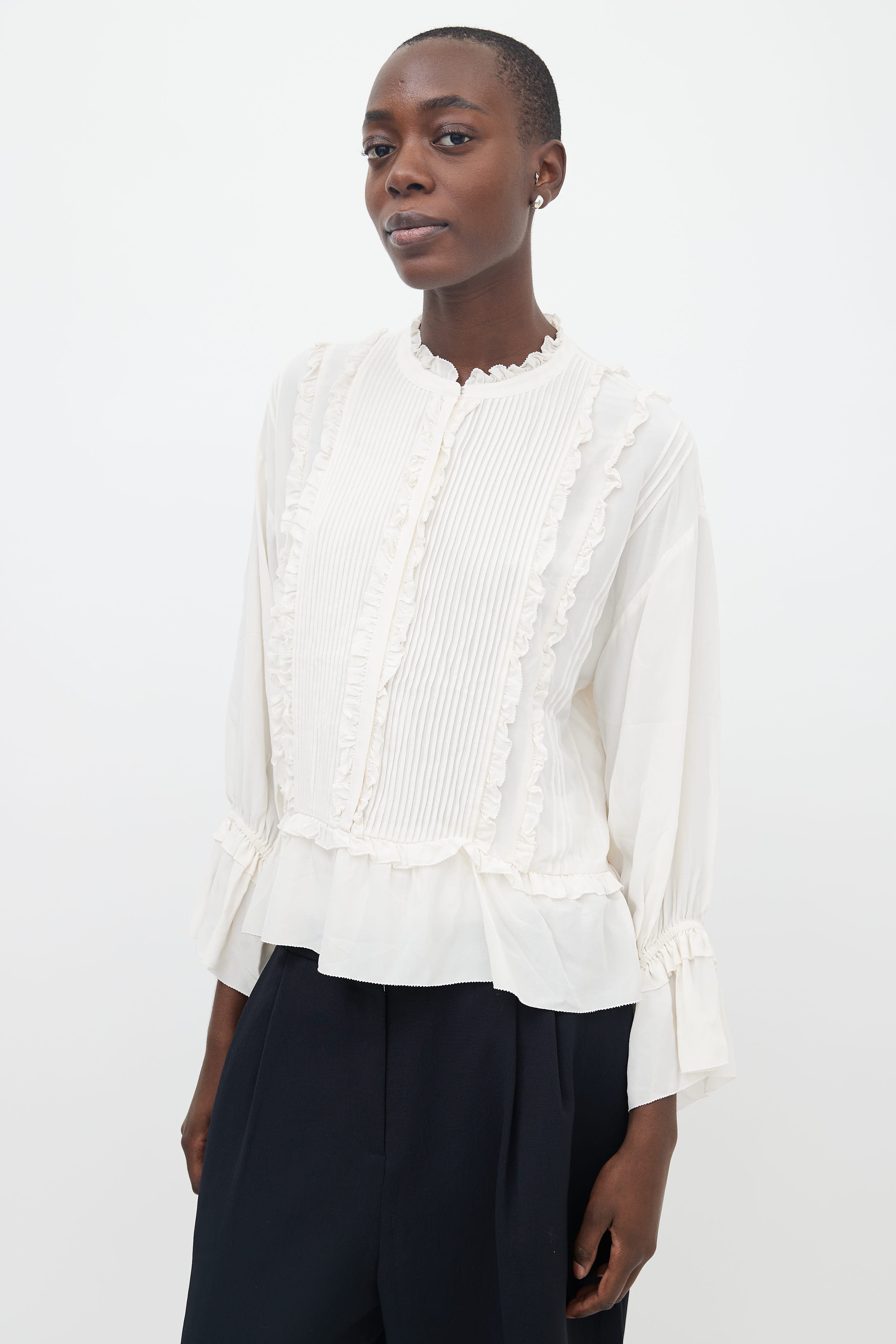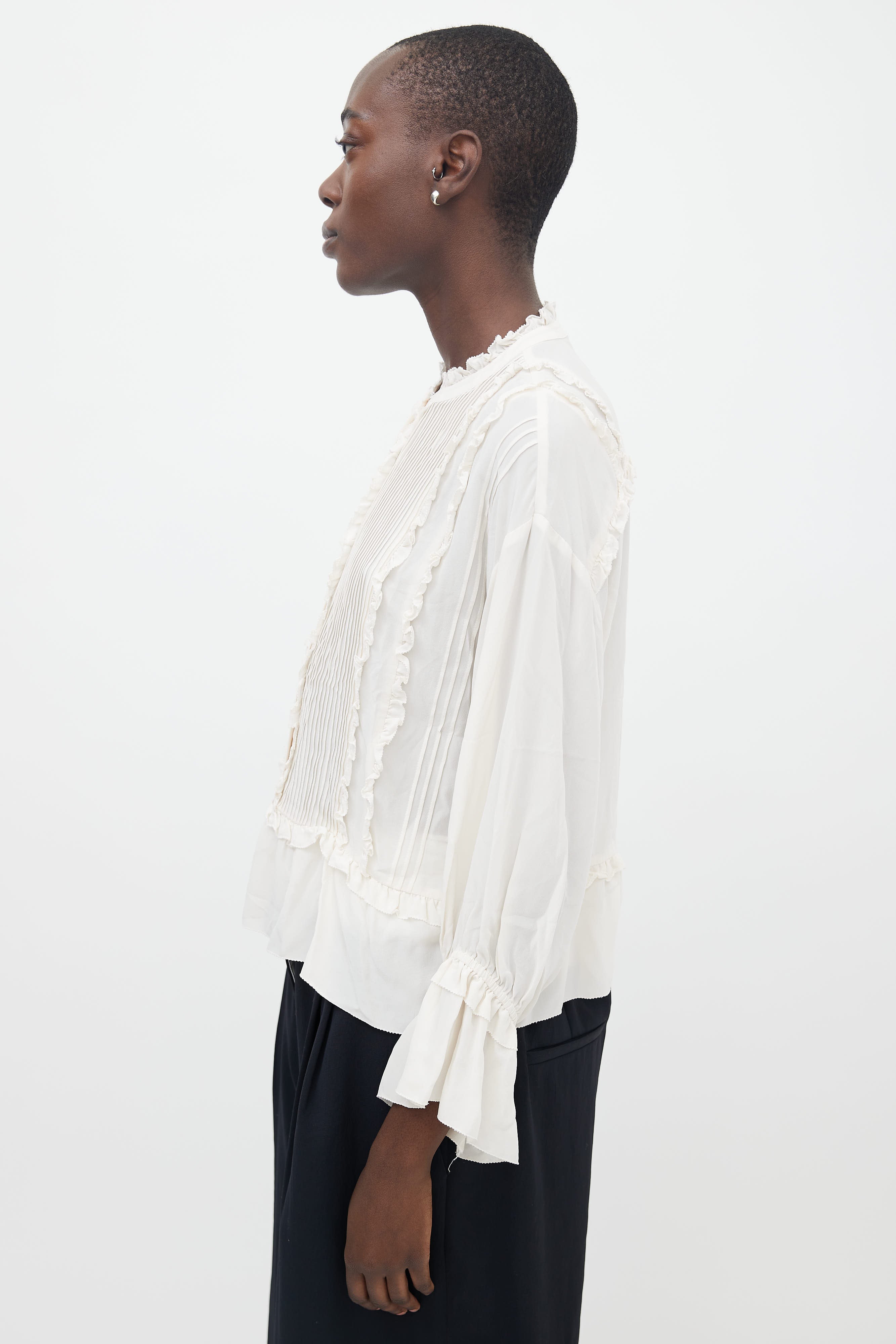 Pre-owned Ulla Johnson blouse in white featuring ruffle and pleated detail throughout, high collar, snap buttons closure at front, and long poet sleeves.