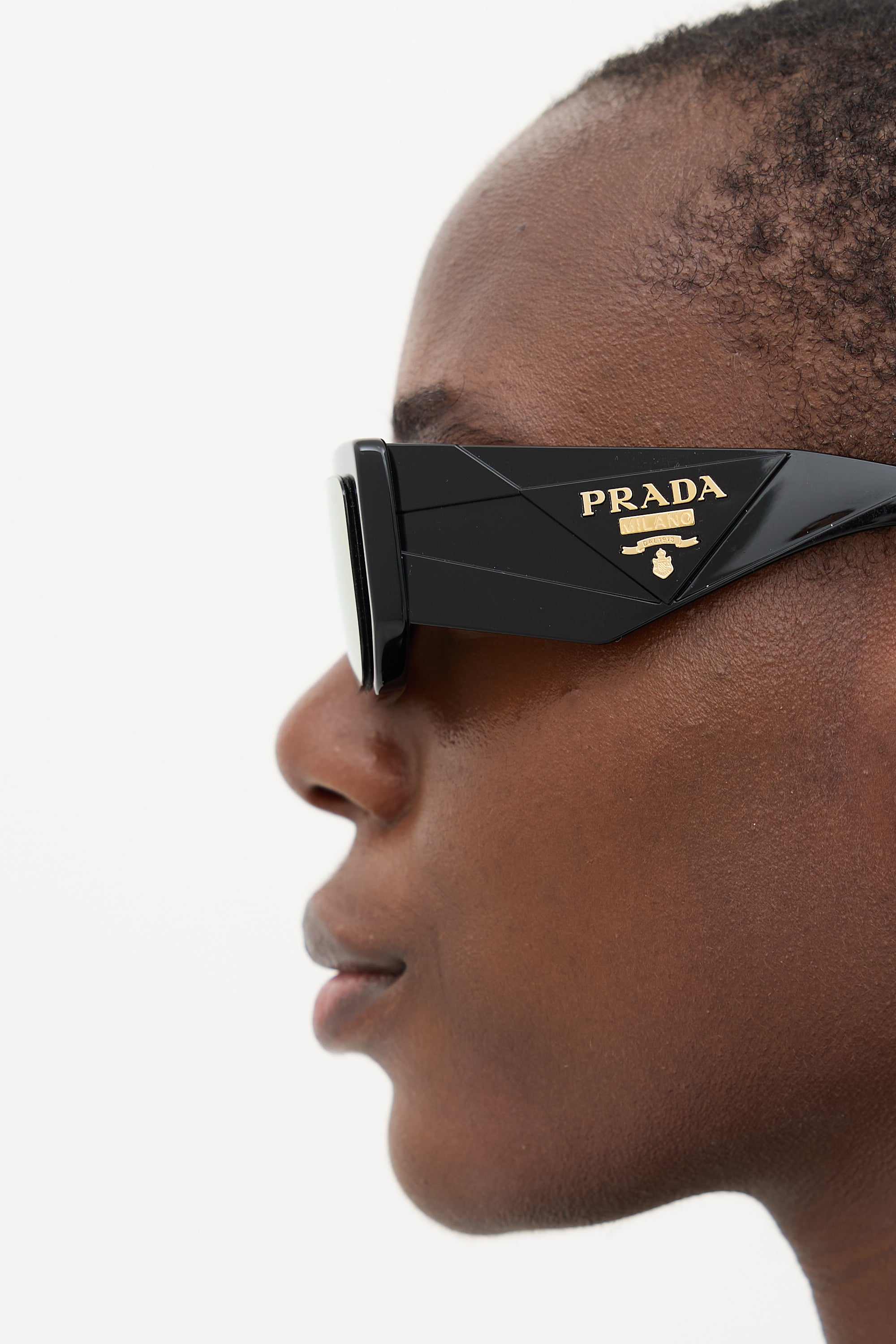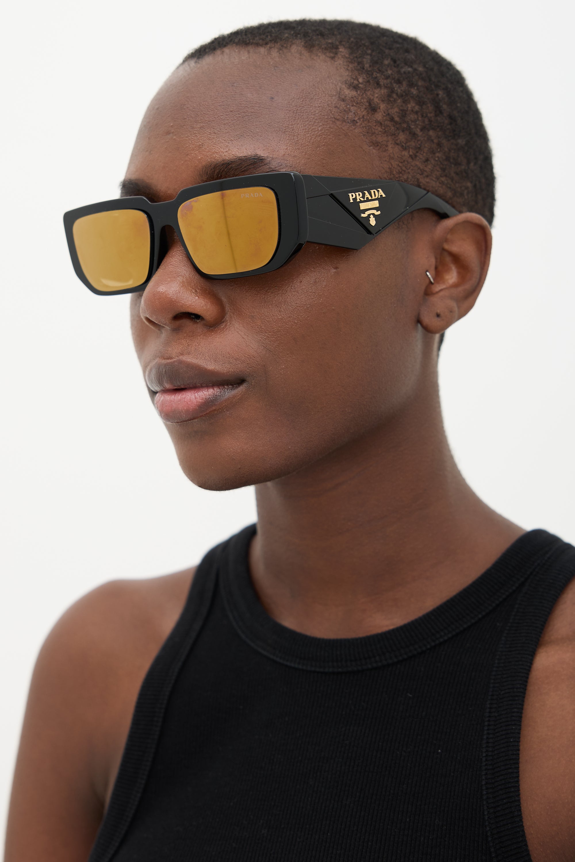 Pre-owned Prada SPR 11Z sunglasses featuring black rectangle frame, yellow tinted reflective lenses, and inset gold tone logo at temples.